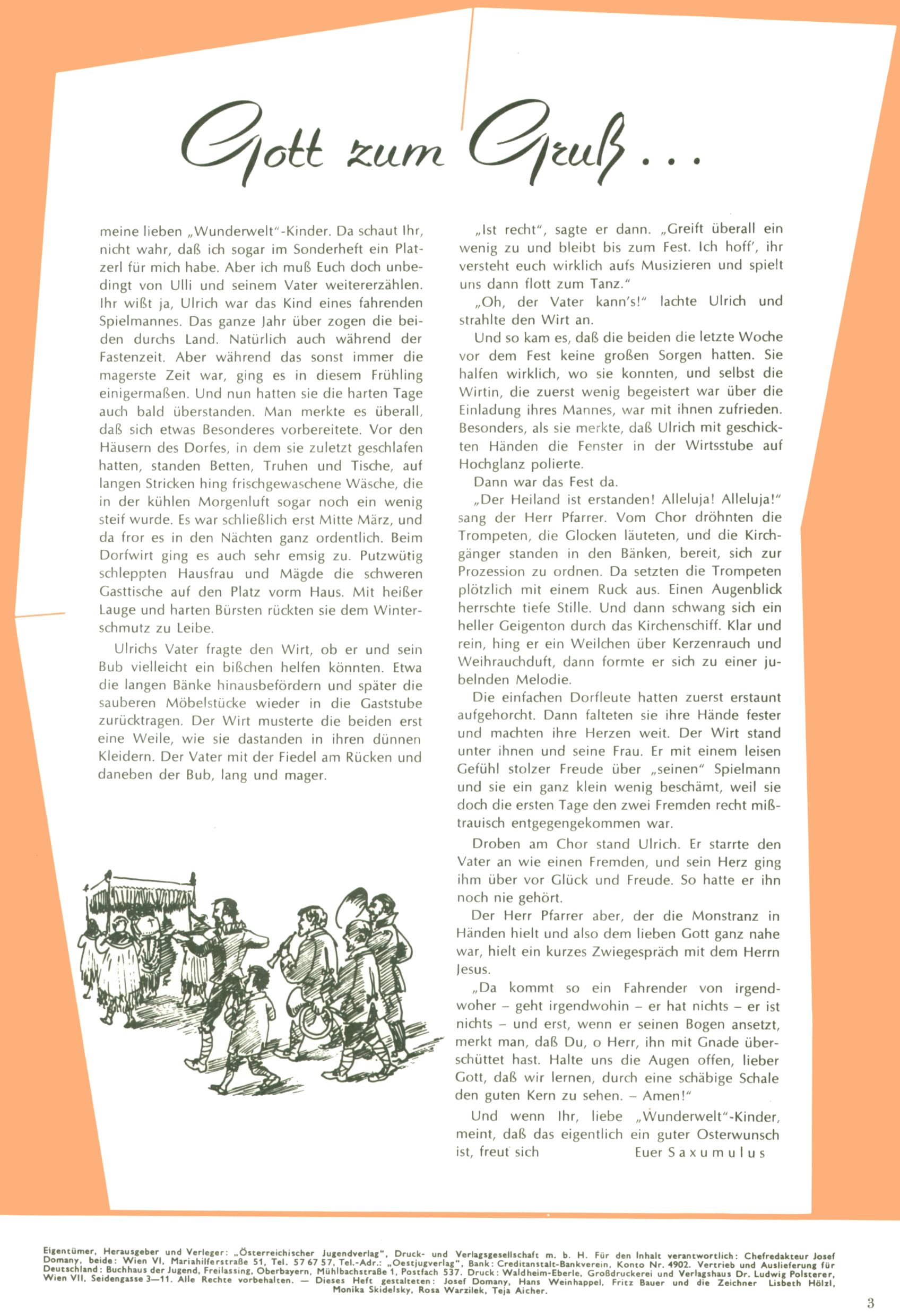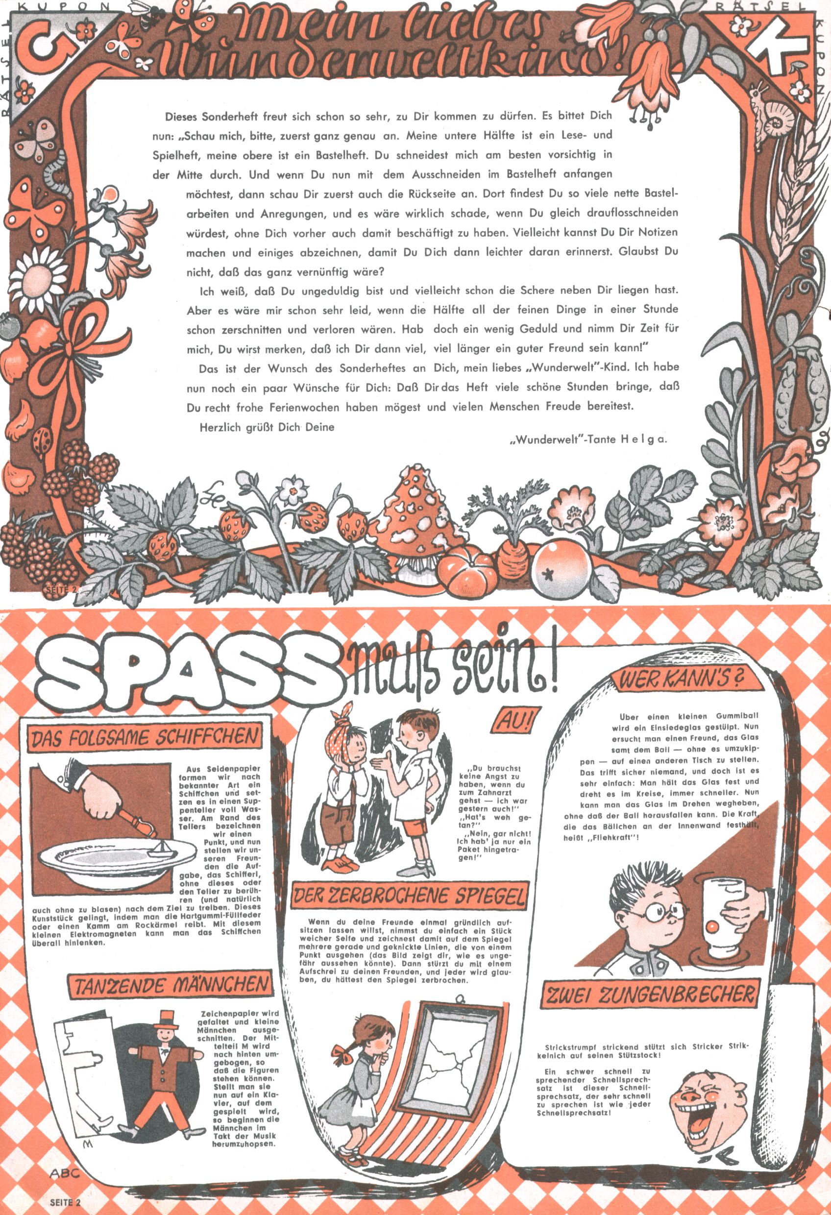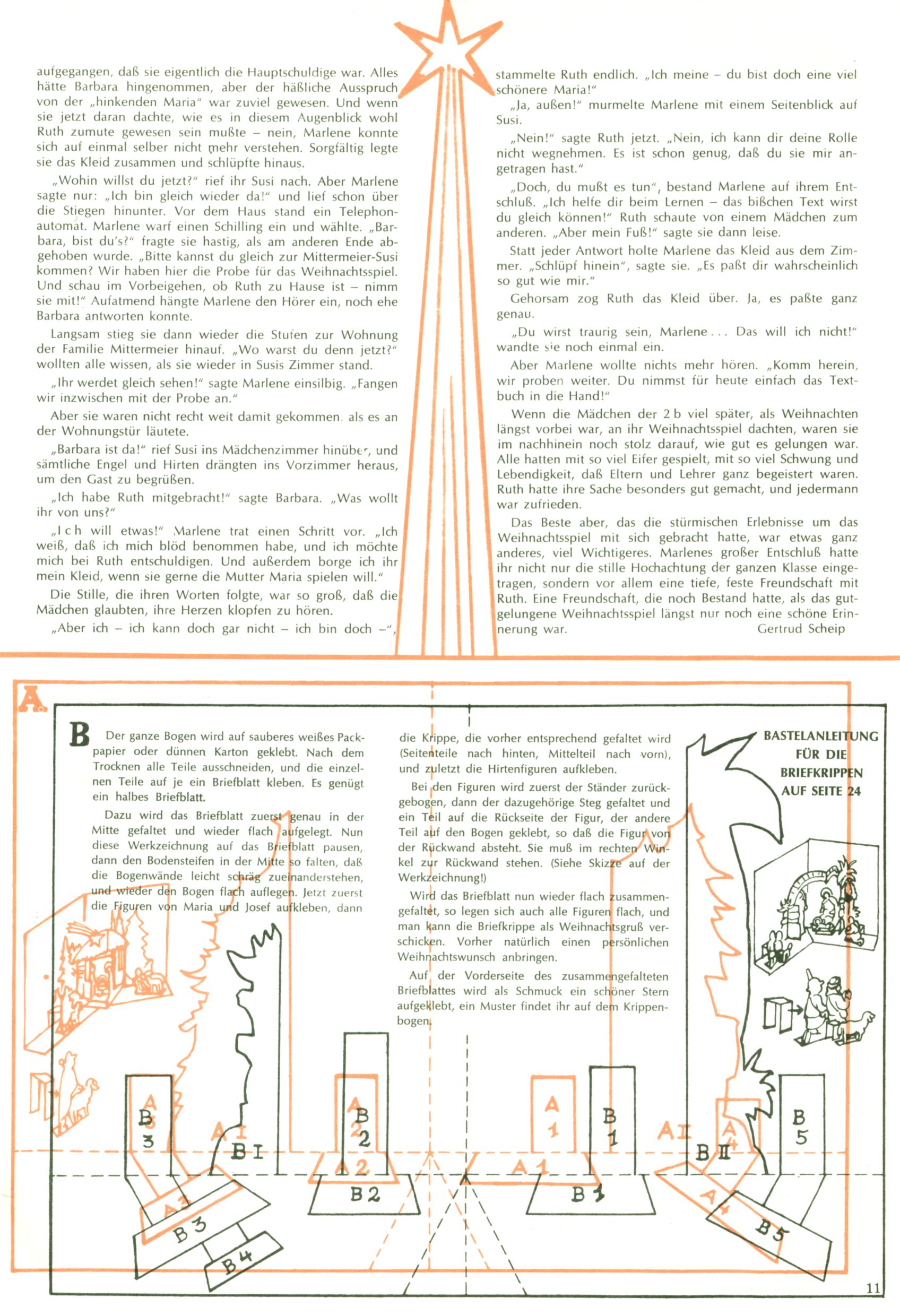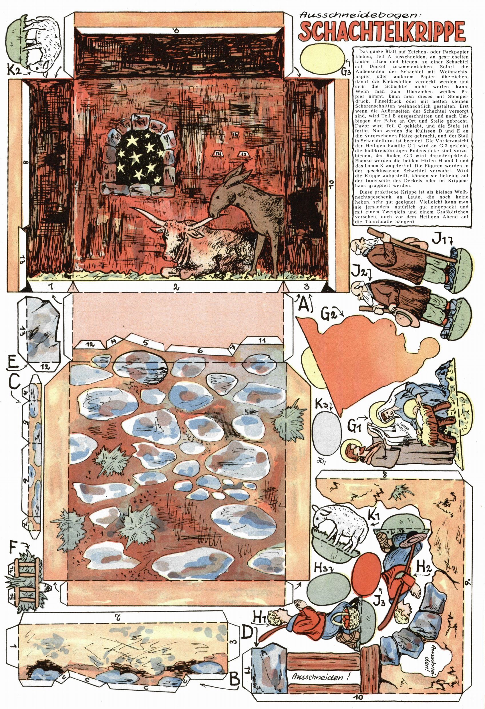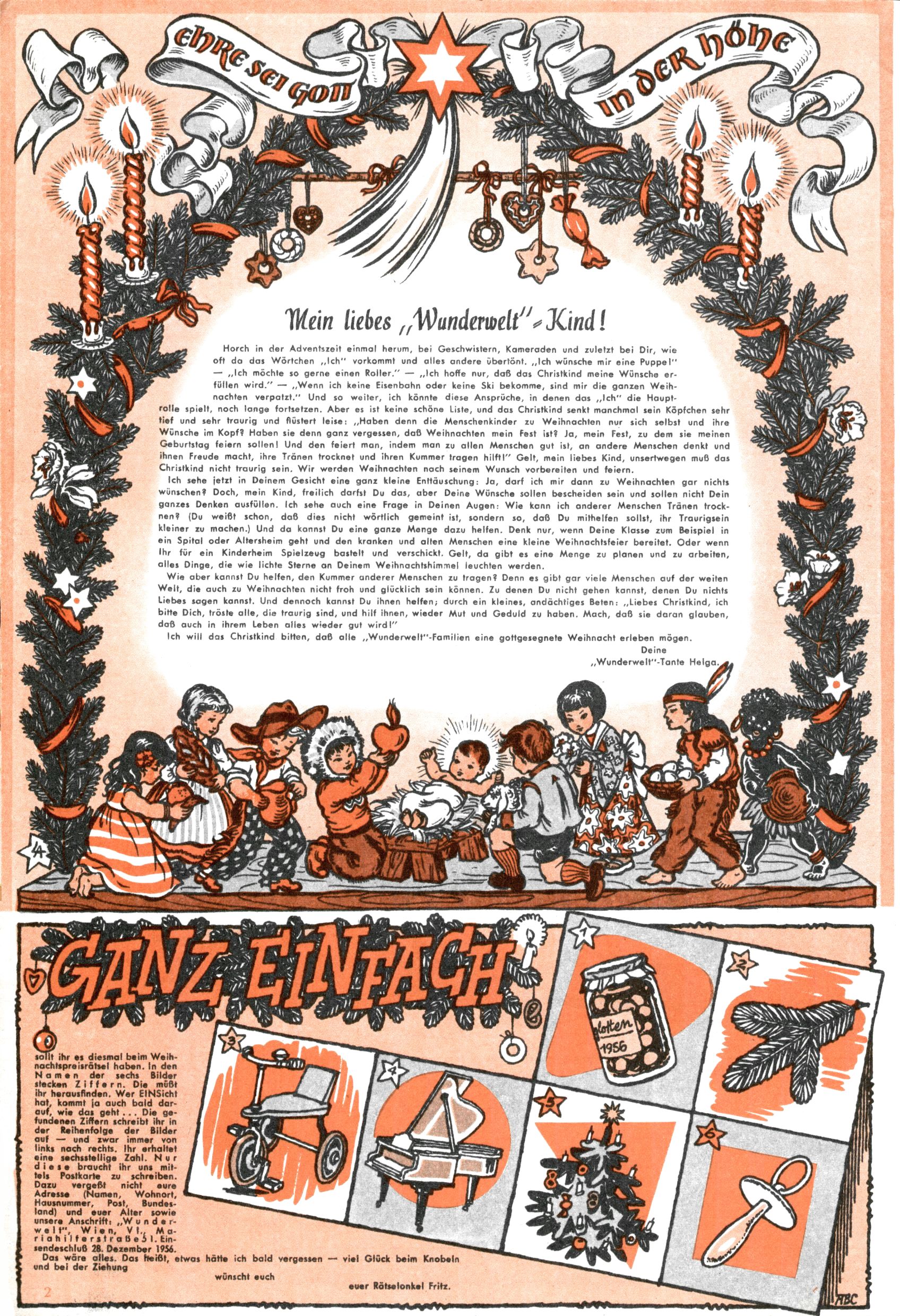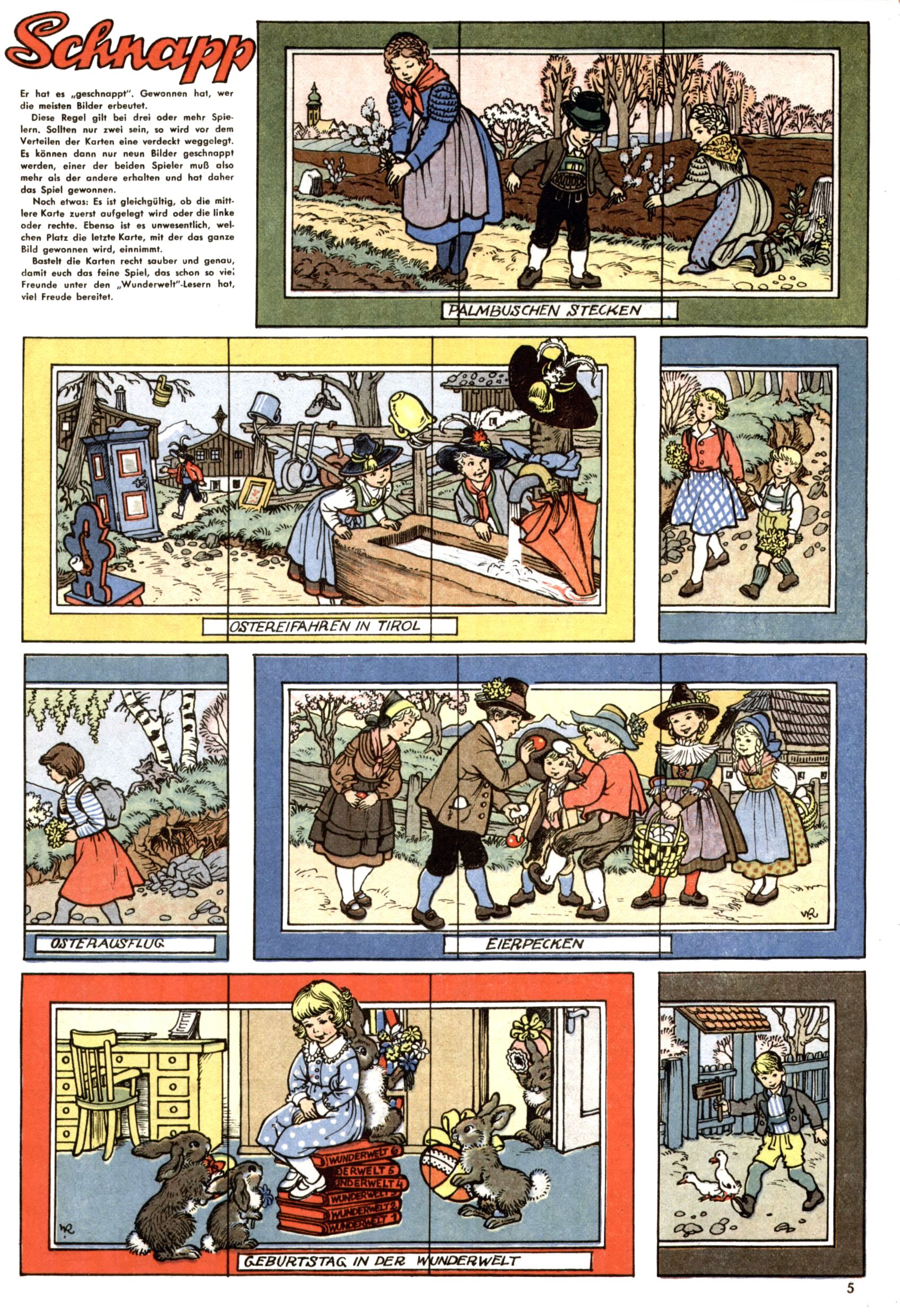 Die Wunderwelt im Festtagsgewand In den Sonderheften präsentierte sich die Wunderwelt wahrhaftig in Feiertagsstimmung. Mit wenigen Ausnahmen gab es pro Jahr drei Sonderhefte - zu Weihnachten bzw. im Advent, zu Ostern und in den Ferien im Sommer. Experimente mit Faschings- und Muttertagsheften hatten sich nicht bewährt. Selbst als es die Einzelhefte in der Krisensituation nach 1967 nicht mehr gab, wurde die Wunderwelt-Zeitung im Layout der Sonderhefte fortgesetzt: Zunächst mit 3 bis 5 und ab 1971 immerhin wieder mit 10-12 Heften pro Jahr. Die Weihnachts-, Oster- und Ferienhefte hatten naturgemäß verschiedene Schwerpunkte. Während im Sommer Spielen und Werken mit Material im Vordergrund stand, waren es zu Weihnachten Krippen und Adventhäuser; zu Ostern dann Erzählungen, Hasenstädte und Oster-Basteleien. Das bessere Papier der Sonderhefte erleichterte das Ausschneiden der insgesamt mehr als 1000 Papiermodelle erheblich. Die Sonderhefte waren vergleichsweise aufwändig gestaltet, aber auch ein wichtiges Zusatzgeschäft für die Zeitung. Die Kinder fieberten dem Erscheinungsdatum der jeweiligen Ausgabe nicht selten richtiggehend entgegen. Mit knapp 100 Seiten pro Jahr machten die Sonderhefte von der Menge her zwar nicht einmal ein Viertel aus, trugen aber zum Erscheinungsbild mindestens genauso viel bei wie die Standardhefte. Im Wesentlichen blieb das Layout der Sonderhefte über die Jahre hin unverändert. Mühselig wurde es, als man den Inhalt der Beiträge vorübergehend auf die Seiten gleichmäßig verteilte und die Kinder ermunterte, die Hefte in der Mitte zu zerschneiden. Die eine Hälfte enthielt dann etwa Erzählungen und Bastelvorschläge, der andere Teil der Zeitung Spielanleitungen. Zur übersichtlichkeit trugen diese Layoutversuche jedenfalls in keiner Weise bei und als besonderen Auswuchs gab es eine Zeitlang auf einer Seite oft mehrere Seitennummern, je nachdem, ob sich diese auf das Gesamtheft oder den herauszunehmenden und zu zerschneidenden Heftteil bezogen. Gegen Ende der 1950er Jahre kehrte man wieder zu einem ganzseitigen Layout zurück und Ideen wie ein Spiel-(Heft-im-)Heft gehörten der Vergangenheit an. In den Sonderheften experimentierte man dann noch ab Mitte der 1960er Jahre, als die Verkaufszahlen stark rückläufig waren, mit grundsätzlich neuen Darstellungsformen - weg vom Niedlich-Kitschigen und engagierte neue Grafikerinnen wie Gundi Groh und Hella Soyka. Den erhofften Erfolg brachte dies jedoch nicht mehr. |