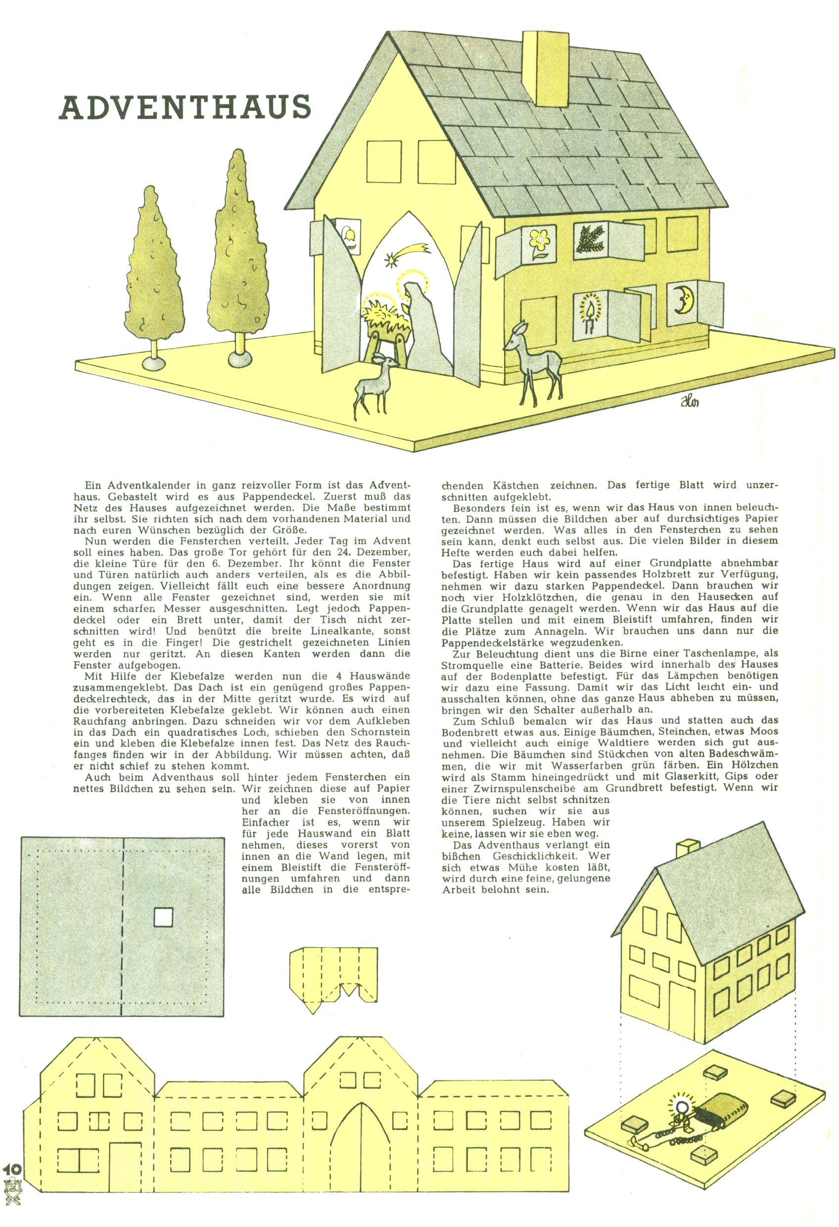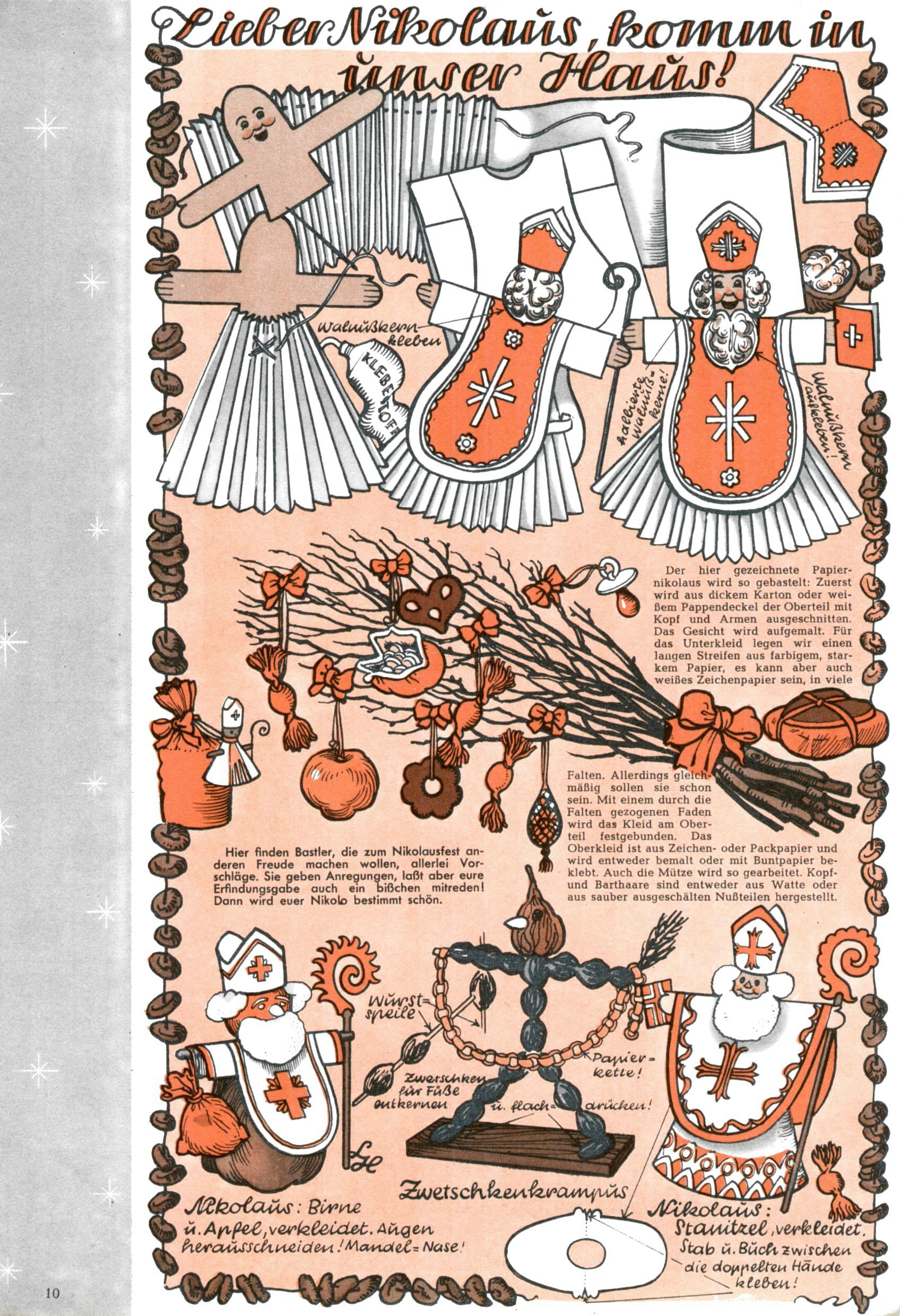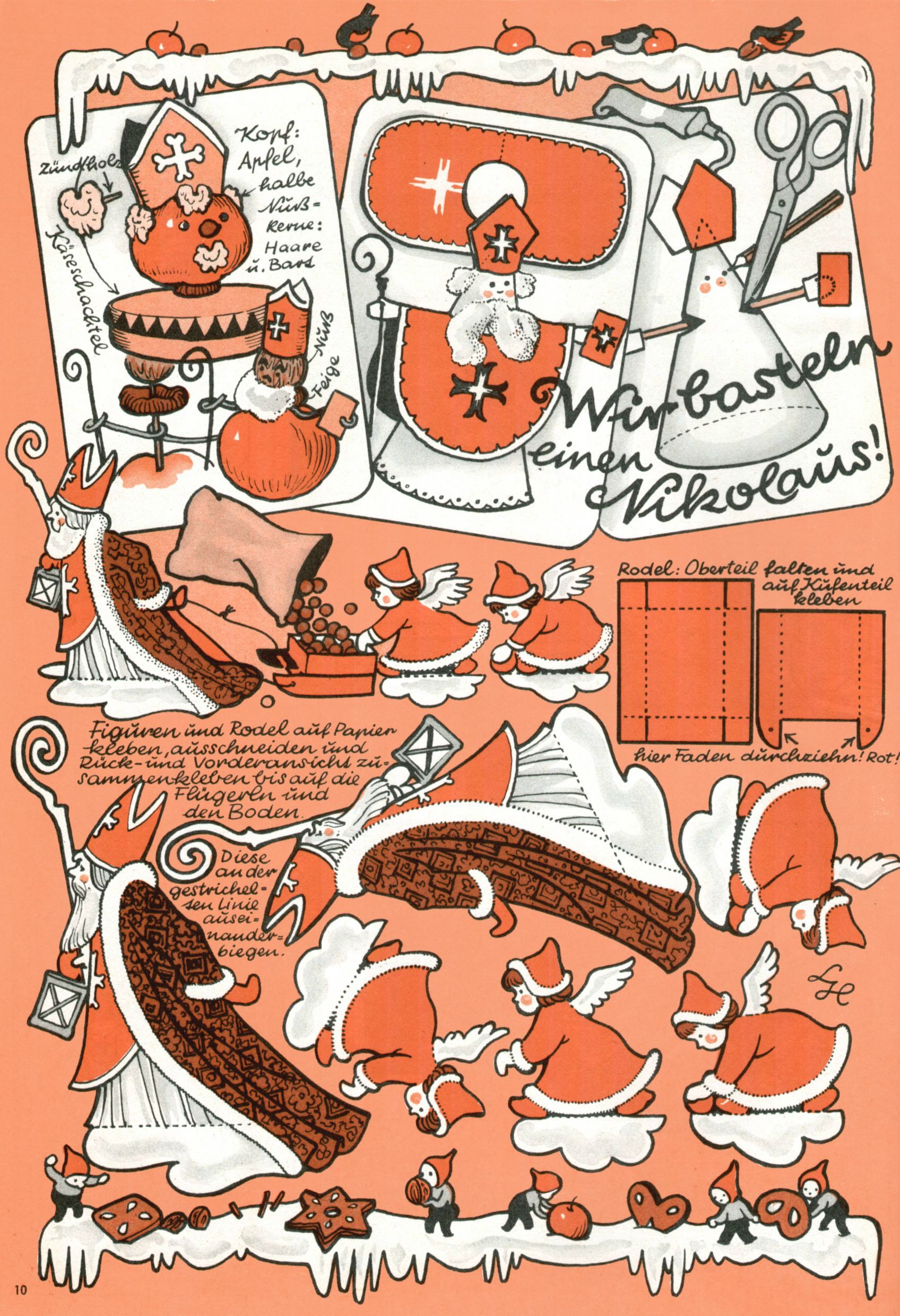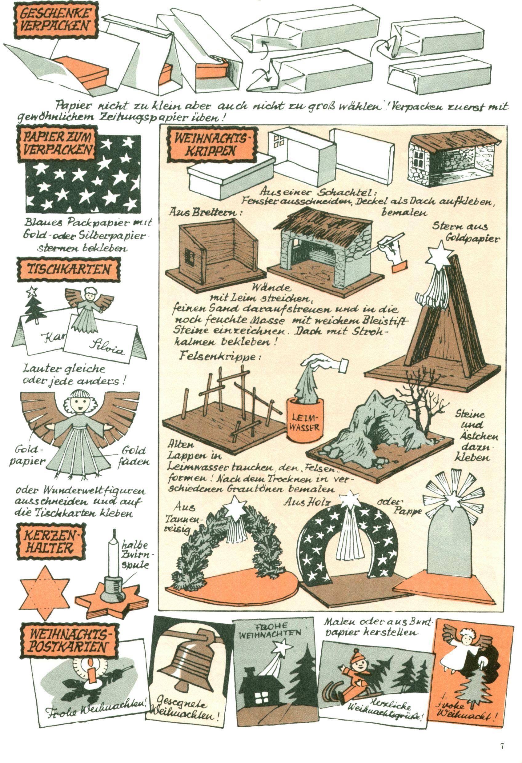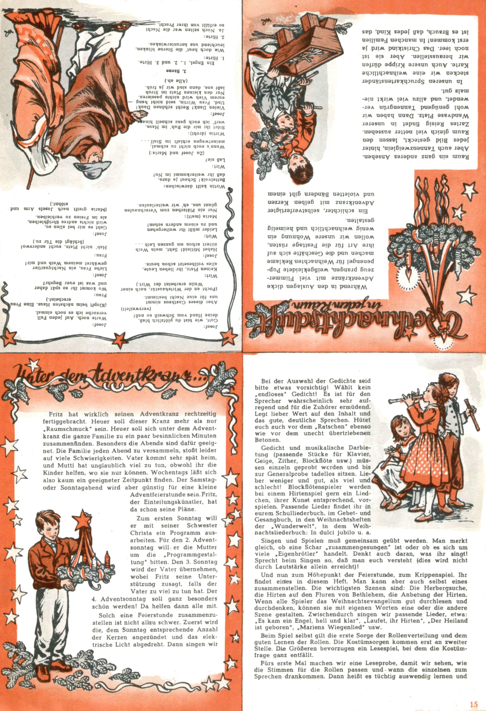 Die Wunderwelt im Festtagsgewand In den Sonderheften präsentierte sich die Wunderwelt wahrhaftig in Feiertagsstimmung. Mit wenigen Ausnahmen gab es pro Jahr drei Sonderhefte - zu Weihnachten bzw. im Advent, zu Ostern und in den Ferien im Sommer. Experimente mit Faschings- und Muttertagsheften hatten sich nicht bewährt. Selbst als es die Einzelhefte in der Krisensituation nach 1967 nicht mehr gab, wurde die Wunderwelt-Zeitung im Layout der Sonderhefte fortgesetzt: Zunächst mit 3 bis 5 und ab 1971 immerhin wieder mit 10-12 Heften pro Jahr. Die Weihnachts-, Oster- und Ferienhefte hatten naturgemäß verschiedene Schwerpunkte. Während im Sommer Spielen und Werken mit Material im Vordergrund stand, waren es zu Weihnachten Krippen und Adventhäuser; zu Ostern dann Erzählungen, Hasenstädte und Oster-Basteleien. Das bessere Papier der Sonderhefte erleichterte das Ausschneiden der insgesamt mehr als 1000 Papiermodelle erheblich. Die Sonderhefte waren vergleichsweise aufwändig gestaltet, aber auch ein wichtiges Zusatzgeschäft für die Zeitung. Die Kinder fieberten dem Erscheinungsdatum der jeweiligen Ausgabe nicht selten richtiggehend entgegen. Mit knapp 100 Seiten pro Jahr machten die Sonderhefte von der Menge her zwar nicht einmal ein Viertel aus, trugen aber zum Erscheinungsbild mindestens genauso viel bei wie die Standardhefte. Im Wesentlichen blieb das Layout der Sonderhefte über die Jahre hin unverändert. Mühselig wurde es, als man den Inhalt der Beiträge vorübergehend auf die Seiten gleichmäßig verteilte und die Kinder ermunterte, die Hefte in der Mitte zu zerschneiden. Die eine Hälfte enthielt dann etwa Erzählungen und Bastelvorschläge, der andere Teil der Zeitung Spielanleitungen. Zur übersichtlichkeit trugen diese Layoutversuche jedenfalls in keiner Weise bei und als besonderen Auswuchs gab es eine Zeitlang auf einer Seite oft mehrere Seitennummern, je nachdem, ob sich diese auf das Gesamtheft oder den herauszunehmenden und zu zerschneidenden Heftteil bezogen. Gegen Ende der 1950er Jahre kehrte man wieder zu einem ganzseitigen Layout zurück und Ideen wie ein Spiel-(Heft-im-)Heft gehörten der Vergangenheit an. In den Sonderheften experimentierte man dann noch ab Mitte der 1960er Jahre, als die Verkaufszahlen stark rückläufig waren, mit grundsätzlich neuen Darstellungsformen - weg vom Niedlich-Kitschigen und engagierte neue Grafikerinnen wie Gundi Groh und Hella Soyka. Den erhofften Erfolg brachte dies jedoch nicht mehr. |