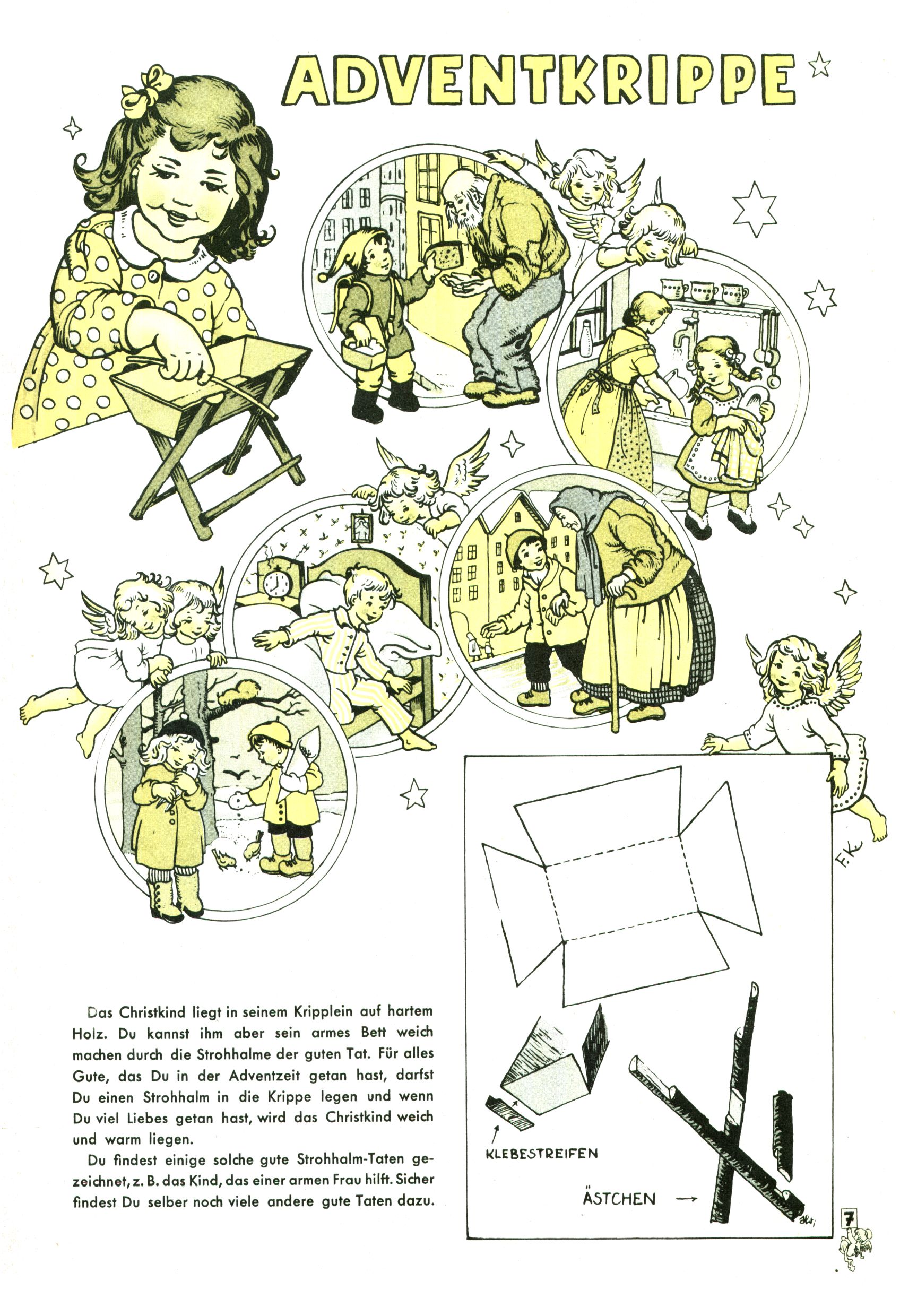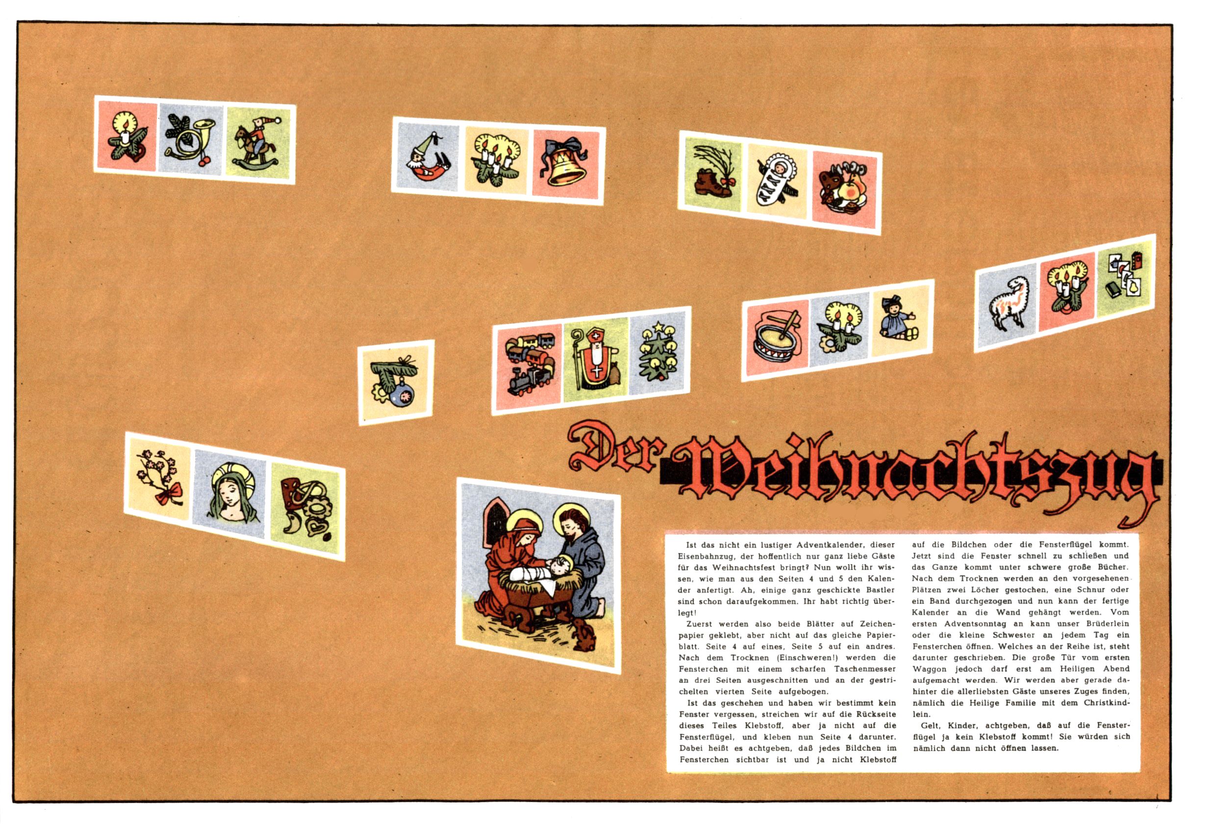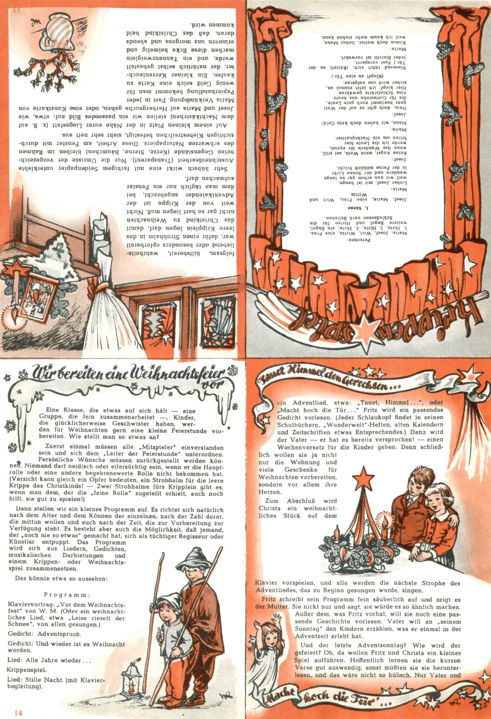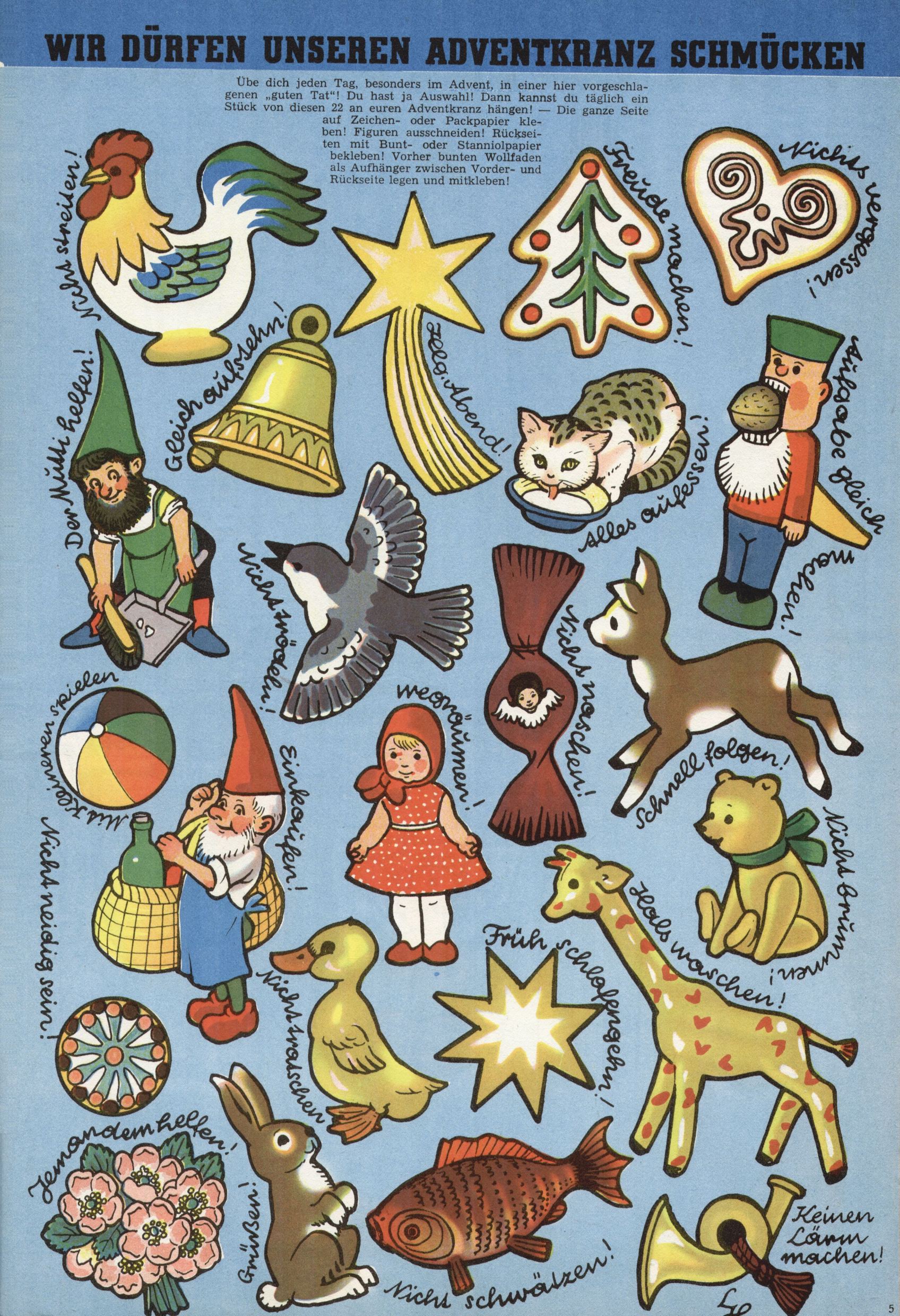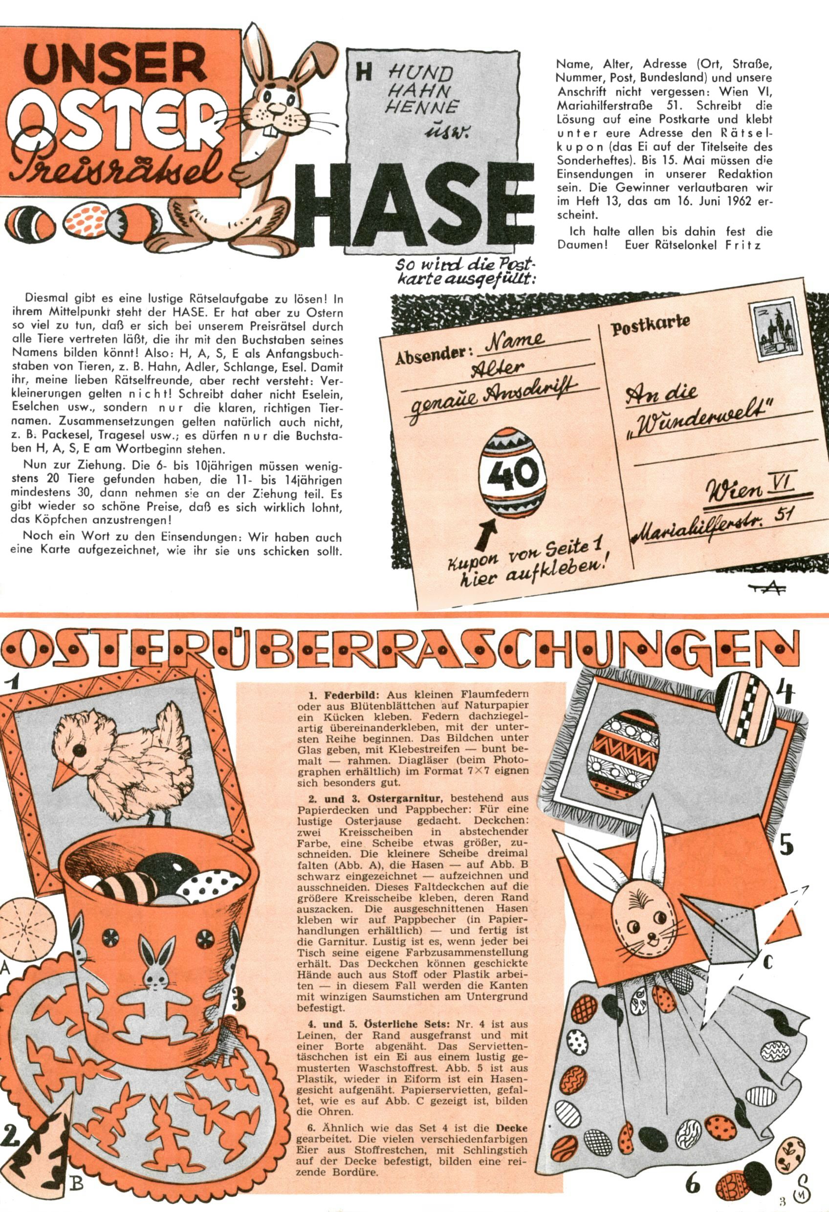 Die Wunderwelt im Festtagsgewand In den Sonderheften präsentierte sich die Wunderwelt wahrhaftig in Feiertagsstimmung. Mit wenigen Ausnahmen gab es pro Jahr drei Sonderhefte - zu Weihnachten bzw. im Advent, zu Ostern und in den Ferien im Sommer. Experimente mit Faschings- und Muttertagsheften hatten sich nicht bewährt. Selbst als es die Einzelhefte in der Krisensituation nach 1967 nicht mehr gab, wurde die Wunderwelt-Zeitung im Layout der Sonderhefte fortgesetzt: Zunächst mit 3 bis 5 und ab 1971 immerhin wieder mit 10-12 Heften pro Jahr. Die Weihnachts-, Oster- und Ferienhefte hatten naturgemäß verschiedene Schwerpunkte. Während im Sommer Spielen und Werken mit Material im Vordergrund stand, waren es zu Weihnachten Krippen und Adventhäuser; zu Ostern dann Erzählungen, Hasenstädte und Oster-Basteleien. Das bessere Papier der Sonderhefte erleichterte das Ausschneiden der insgesamt mehr als 1000 Papiermodelle erheblich. Die Sonderhefte waren vergleichsweise aufwändig gestaltet, aber auch ein wichtiges Zusatzgeschäft für die Zeitung. Die Kinder fieberten dem Erscheinungsdatum der jeweiligen Ausgabe nicht selten richtiggehend entgegen. Mit knapp 100 Seiten pro Jahr machten die Sonderhefte von der Menge her zwar nicht einmal ein Viertel aus, trugen aber zum Erscheinungsbild mindestens genauso viel bei wie die Standardhefte. Im Wesentlichen blieb das Layout der Sonderhefte über die Jahre hin unverändert. Mühselig wurde es, als man den Inhalt der Beiträge vorübergehend auf die Seiten gleichmäßig verteilte und die Kinder ermunterte, die Hefte in der Mitte zu zerschneiden. Die eine Hälfte enthielt dann etwa Erzählungen und Bastelvorschläge, der andere Teil der Zeitung Spielanleitungen. Zur übersichtlichkeit trugen diese Layoutversuche jedenfalls in keiner Weise bei und als besonderen Auswuchs gab es eine Zeitlang auf einer Seite oft mehrere Seitennummern, je nachdem, ob sich diese auf das Gesamtheft oder den herauszunehmenden und zu zerschneidenden Heftteil bezogen. Gegen Ende der 1950er Jahre kehrte man wieder zu einem ganzseitigen Layout zurück und Ideen wie ein Spiel-(Heft-im-)Heft gehörten der Vergangenheit an. In den Sonderheften experimentierte man dann noch ab Mitte der 1960er Jahre, als die Verkaufszahlen stark rückläufig waren, mit grundsätzlich neuen Darstellungsformen - weg vom Niedlich-Kitschigen und engagierte neue Grafikerinnen wie Gundi Groh und Hella Soyka. Den erhofften Erfolg brachte dies jedoch nicht mehr. |