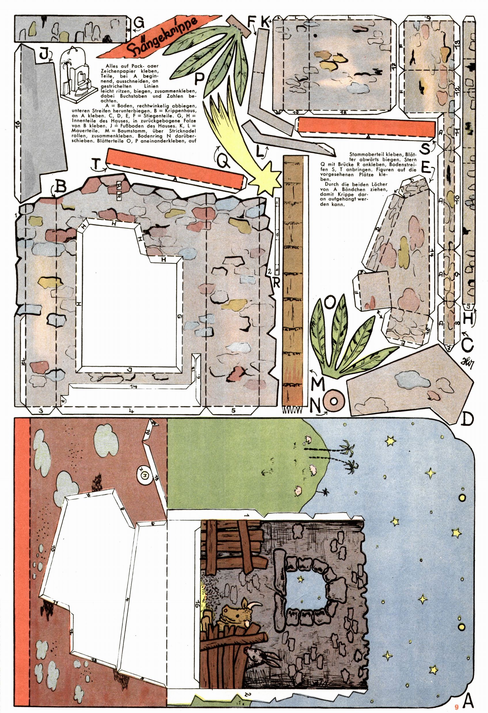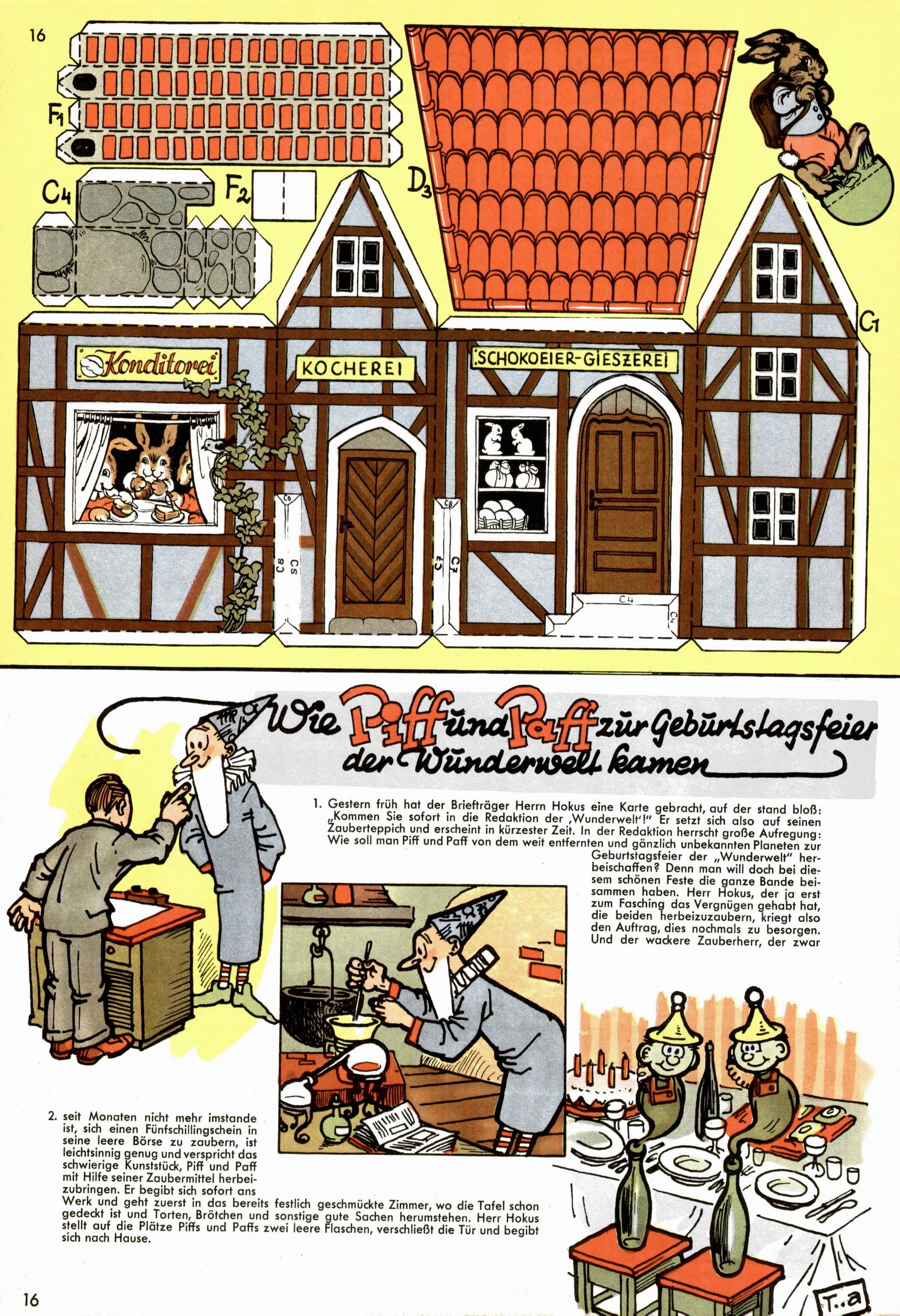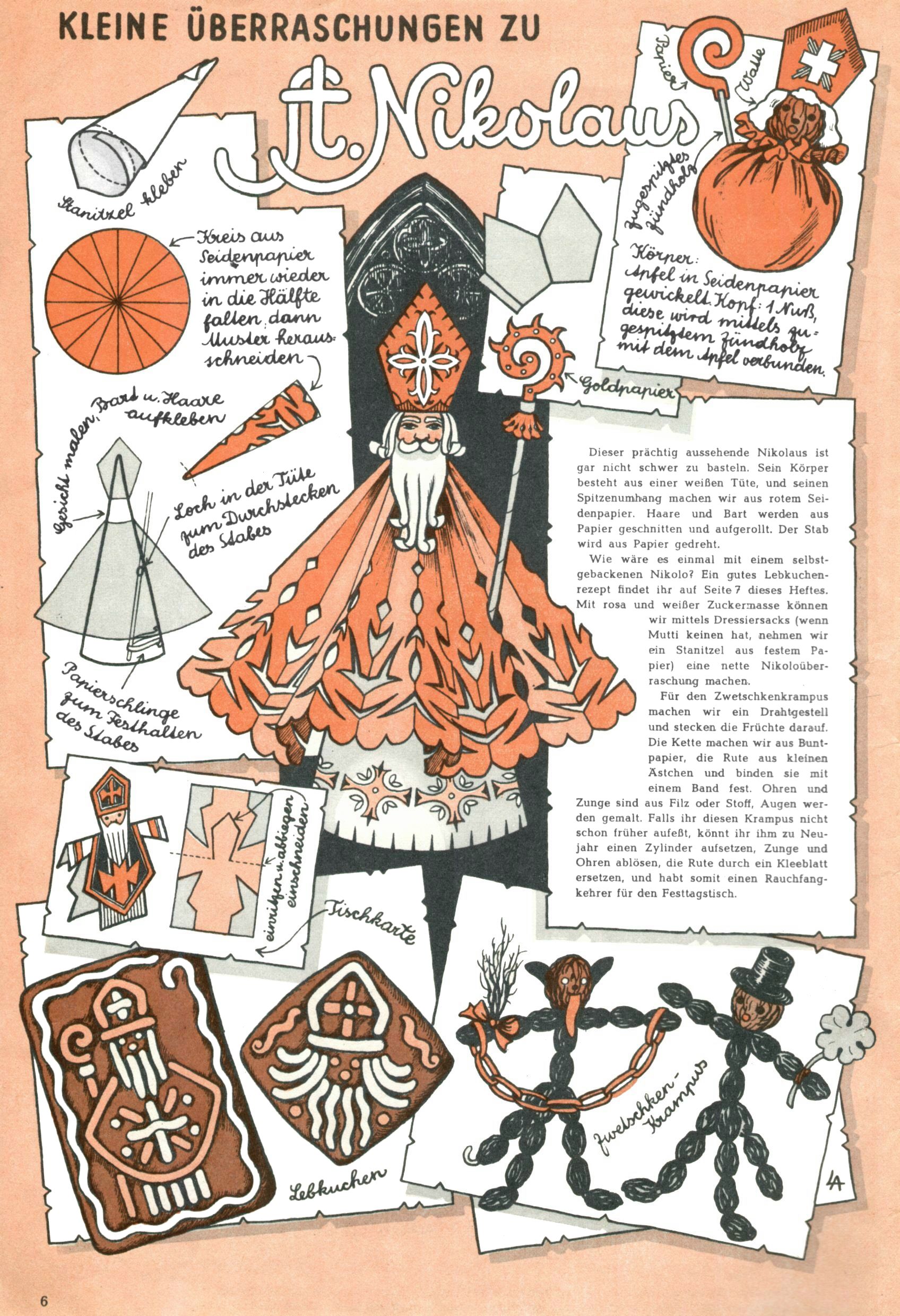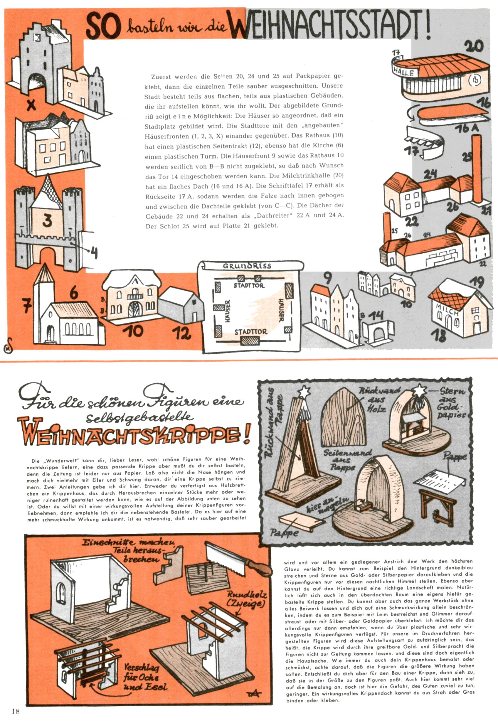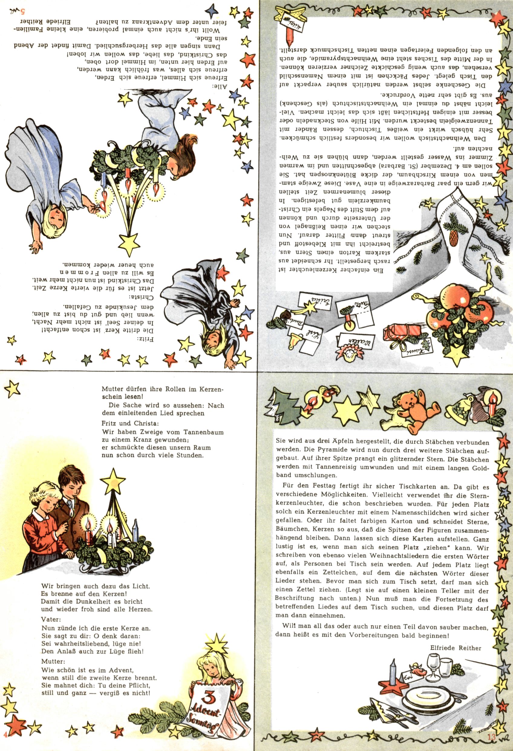 Die Wunderwelt im Festtagsgewand In den Sonderheften präsentierte sich die Wunderwelt wahrhaftig in Feiertagsstimmung. Mit wenigen Ausnahmen gab es pro Jahr drei Sonderhefte - zu Weihnachten bzw. im Advent, zu Ostern und in den Ferien im Sommer. Experimente mit Faschings- und Muttertagsheften hatten sich nicht bewährt. Selbst als es die Einzelhefte in der Krisensituation nach 1967 nicht mehr gab, wurde die Wunderwelt-Zeitung im Layout der Sonderhefte fortgesetzt: Zunächst mit 3 bis 5 und ab 1971 immerhin wieder mit 10-12 Heften pro Jahr. Die Weihnachts-, Oster- und Ferienhefte hatten naturgemäß verschiedene Schwerpunkte. Während im Sommer Spielen und Werken mit Material im Vordergrund stand, waren es zu Weihnachten Krippen und Adventhäuser; zu Ostern dann Erzählungen, Hasenstädte und Oster-Basteleien. Das bessere Papier der Sonderhefte erleichterte das Ausschneiden der insgesamt mehr als 1000 Papiermodelle erheblich. Die Sonderhefte waren vergleichsweise aufwändig gestaltet, aber auch ein wichtiges Zusatzgeschäft für die Zeitung. Die Kinder fieberten dem Erscheinungsdatum der jeweiligen Ausgabe nicht selten richtiggehend entgegen. Mit knapp 100 Seiten pro Jahr machten die Sonderhefte von der Menge her zwar nicht einmal ein Viertel aus, trugen aber zum Erscheinungsbild mindestens genauso viel bei wie die Standardhefte. Im Wesentlichen blieb das Layout der Sonderhefte über die Jahre hin unverändert. Mühselig wurde es, als man den Inhalt der Beiträge vorübergehend auf die Seiten gleichmäßig verteilte und die Kinder ermunterte, die Hefte in der Mitte zu zerschneiden. Die eine Hälfte enthielt dann etwa Erzählungen und Bastelvorschläge, der andere Teil der Zeitung Spielanleitungen. Zur übersichtlichkeit trugen diese Layoutversuche jedenfalls in keiner Weise bei und als besonderen Auswuchs gab es eine Zeitlang auf einer Seite oft mehrere Seitennummern, je nachdem, ob sich diese auf das Gesamtheft oder den herauszunehmenden und zu zerschneidenden Heftteil bezogen. Gegen Ende der 1950er Jahre kehrte man wieder zu einem ganzseitigen Layout zurück und Ideen wie ein Spiel-(Heft-im-)Heft gehörten der Vergangenheit an. In den Sonderheften experimentierte man dann noch ab Mitte der 1960er Jahre, als die Verkaufszahlen stark rückläufig waren, mit grundsätzlich neuen Darstellungsformen - weg vom Niedlich-Kitschigen und engagierte neue Grafikerinnen wie Gundi Groh und Hella Soyka. Den erhofften Erfolg brachte dies jedoch nicht mehr. |
