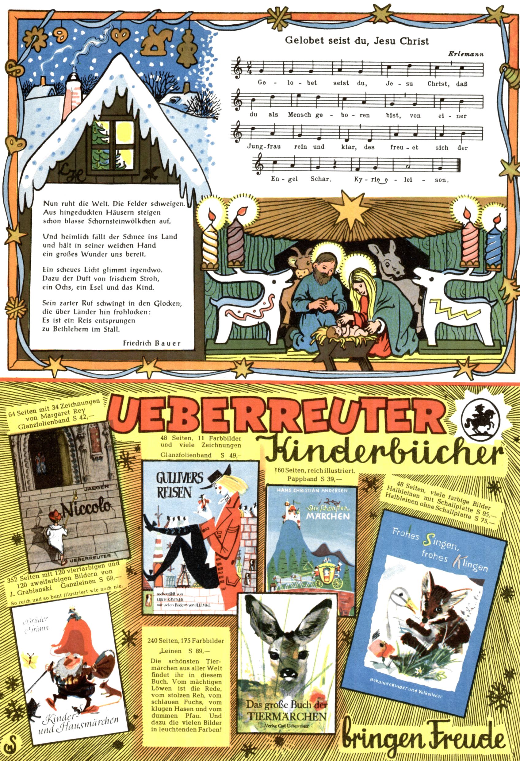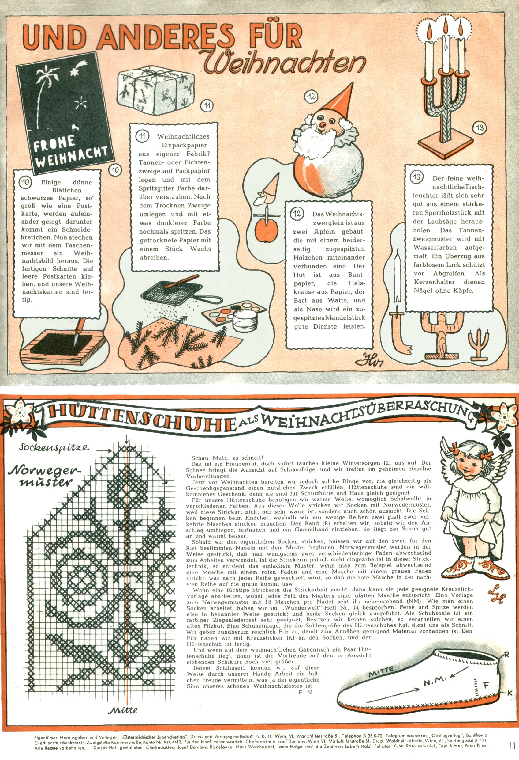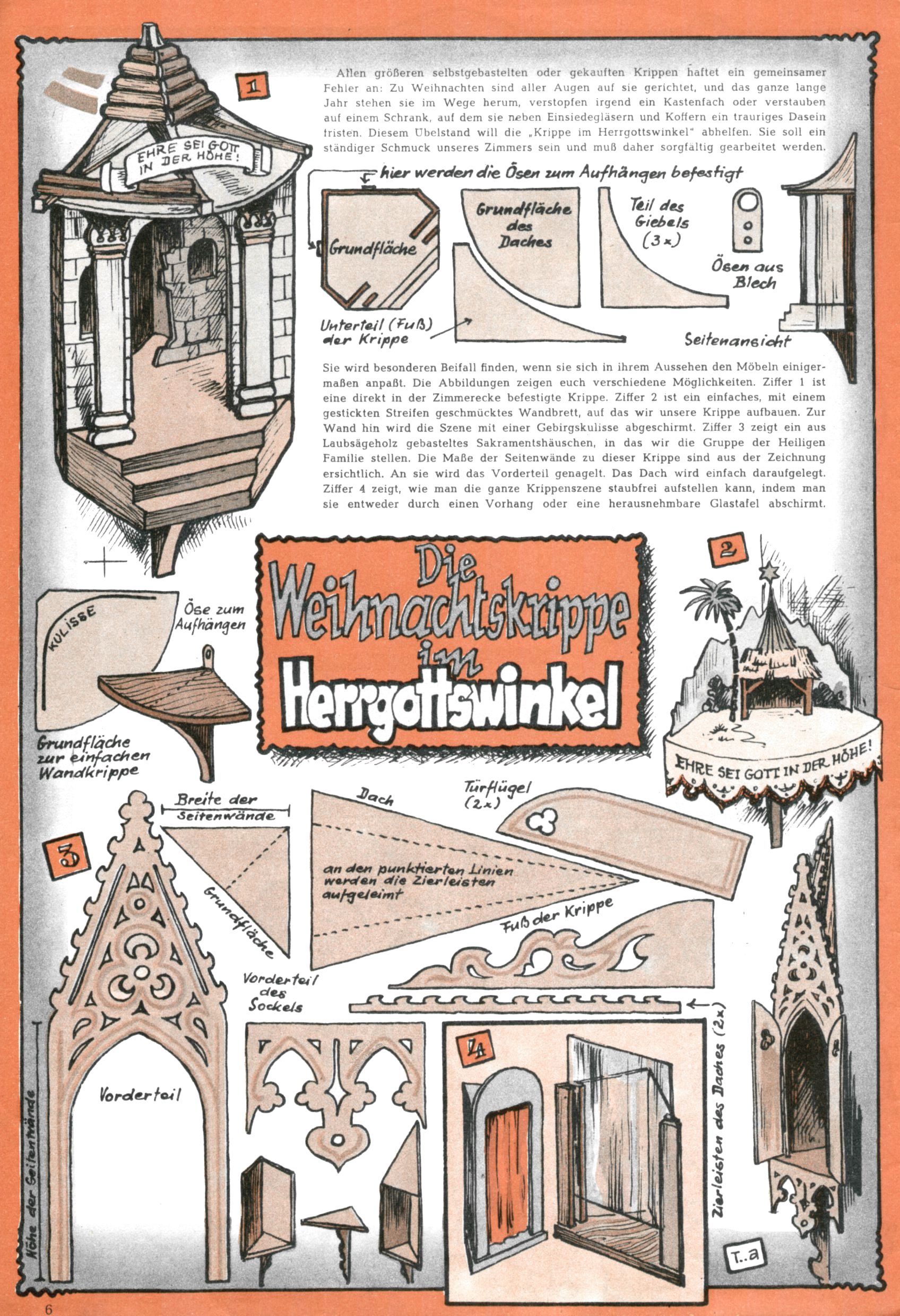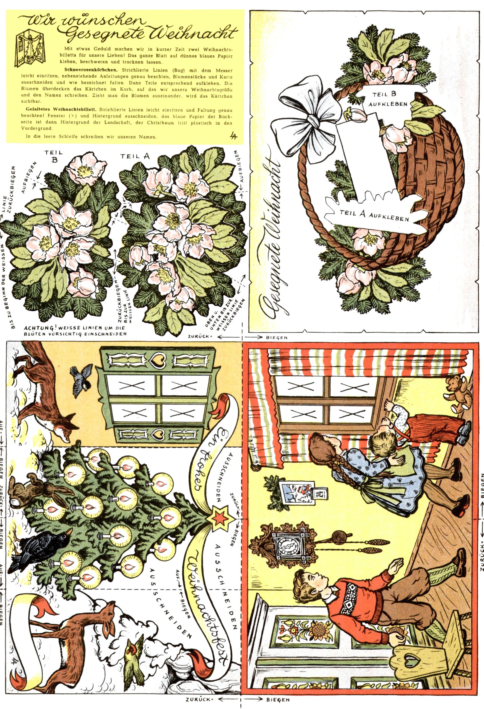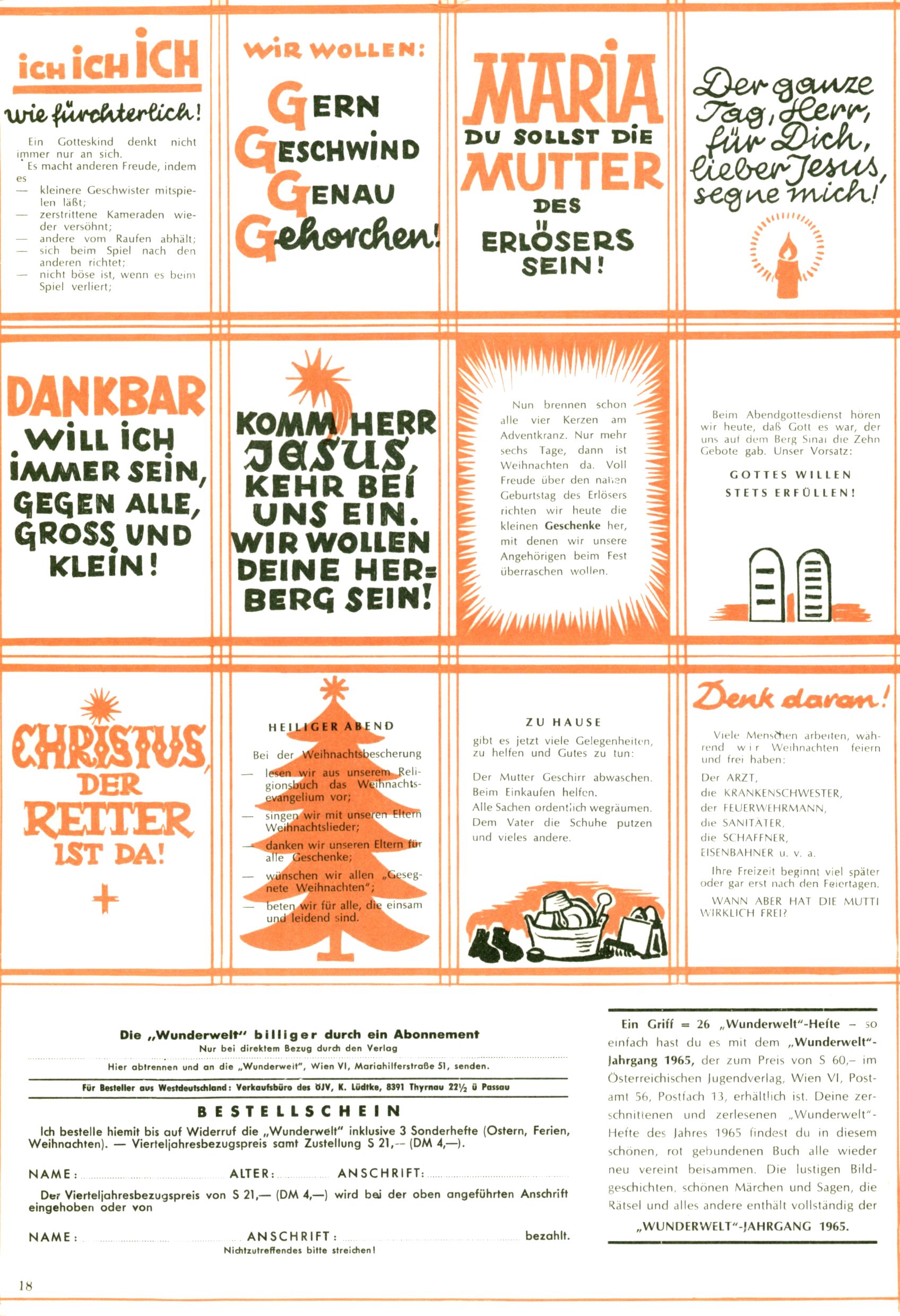 Die Wunderwelt im Festtagsgewand In den Sonderheften präsentierte sich die Wunderwelt wahrhaftig in Feiertagsstimmung. Mit wenigen Ausnahmen gab es pro Jahr drei Sonderhefte - zu Weihnachten bzw. im Advent, zu Ostern und in den Ferien im Sommer. Experimente mit Faschings- und Muttertagsheften hatten sich nicht bewährt. Selbst als es die Einzelhefte in der Krisensituation nach 1967 nicht mehr gab, wurde die Wunderwelt-Zeitung im Layout der Sonderhefte fortgesetzt: Zunächst mit 3 bis 5 und ab 1971 immerhin wieder mit 10-12 Heften pro Jahr. Die Weihnachts-, Oster- und Ferienhefte hatten naturgemäß verschiedene Schwerpunkte. Während im Sommer Spielen und Werken mit Material im Vordergrund stand, waren es zu Weihnachten Krippen und Adventhäuser; zu Ostern dann Erzählungen, Hasenstädte und Oster-Basteleien. Das bessere Papier der Sonderhefte erleichterte das Ausschneiden der insgesamt mehr als 1000 Papiermodelle erheblich. Die Sonderhefte waren vergleichsweise aufwändig gestaltet, aber auch ein wichtiges Zusatzgeschäft für die Zeitung. Die Kinder fieberten dem Erscheinungsdatum der jeweiligen Ausgabe nicht selten richtiggehend entgegen. Mit knapp 100 Seiten pro Jahr machten die Sonderhefte von der Menge her zwar nicht einmal ein Viertel aus, trugen aber zum Erscheinungsbild mindestens genauso viel bei wie die Standardhefte. Im Wesentlichen blieb das Layout der Sonderhefte über die Jahre hin unverändert. Mühselig wurde es, als man den Inhalt der Beiträge vorübergehend auf die Seiten gleichmäßig verteilte und die Kinder ermunterte, die Hefte in der Mitte zu zerschneiden. Die eine Hälfte enthielt dann etwa Erzählungen und Bastelvorschläge, der andere Teil der Zeitung Spielanleitungen. Zur übersichtlichkeit trugen diese Layoutversuche jedenfalls in keiner Weise bei und als besonderen Auswuchs gab es eine Zeitlang auf einer Seite oft mehrere Seitennummern, je nachdem, ob sich diese auf das Gesamtheft oder den herauszunehmenden und zu zerschneidenden Heftteil bezogen. Gegen Ende der 1950er Jahre kehrte man wieder zu einem ganzseitigen Layout zurück und Ideen wie ein Spiel-(Heft-im-)Heft gehörten der Vergangenheit an. In den Sonderheften experimentierte man dann noch ab Mitte der 1960er Jahre, als die Verkaufszahlen stark rückläufig waren, mit grundsätzlich neuen Darstellungsformen - weg vom Niedlich-Kitschigen und engagierte neue Grafikerinnen wie Gundi Groh und Hella Soyka. Den erhofften Erfolg brachte dies jedoch nicht mehr. |
