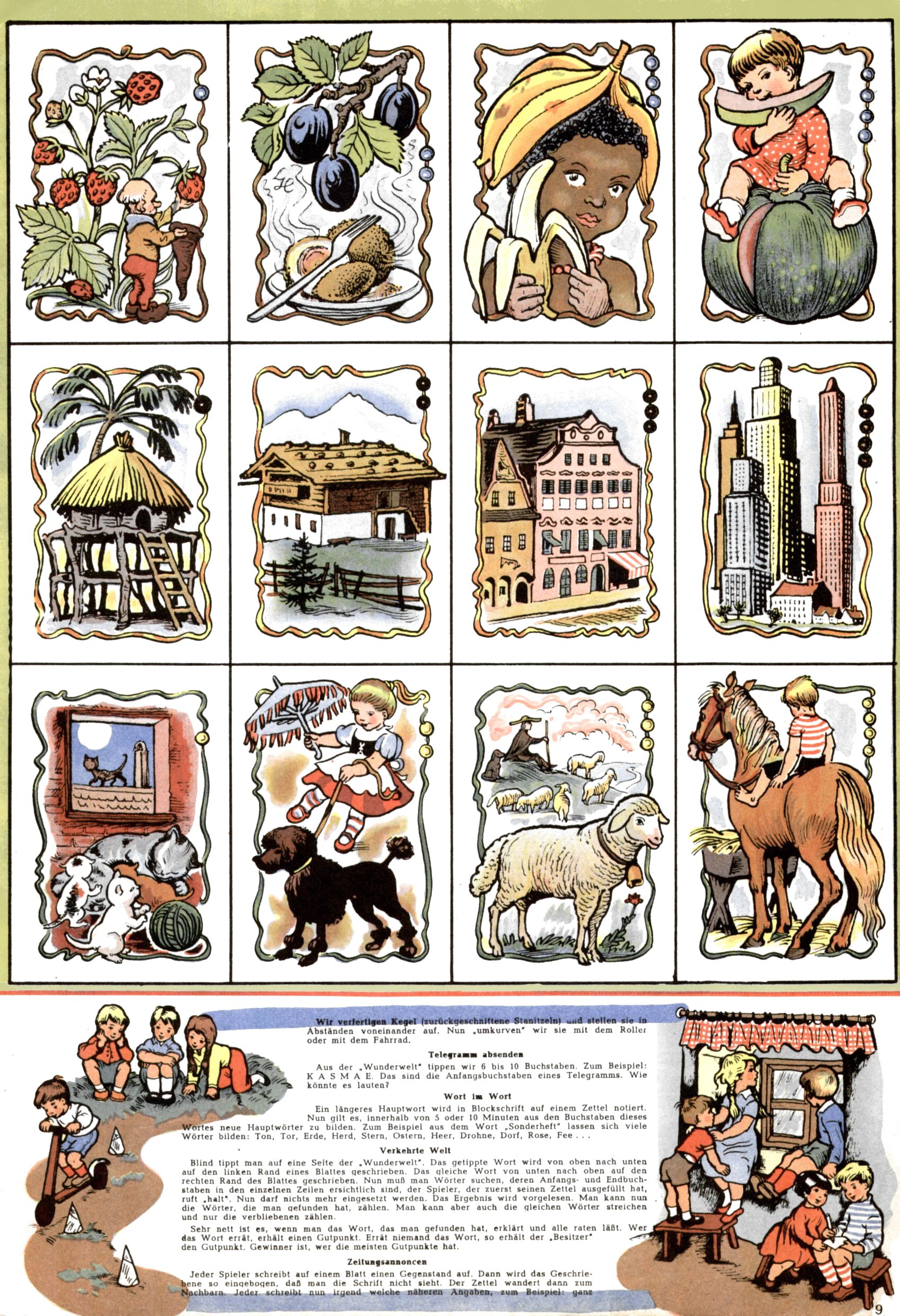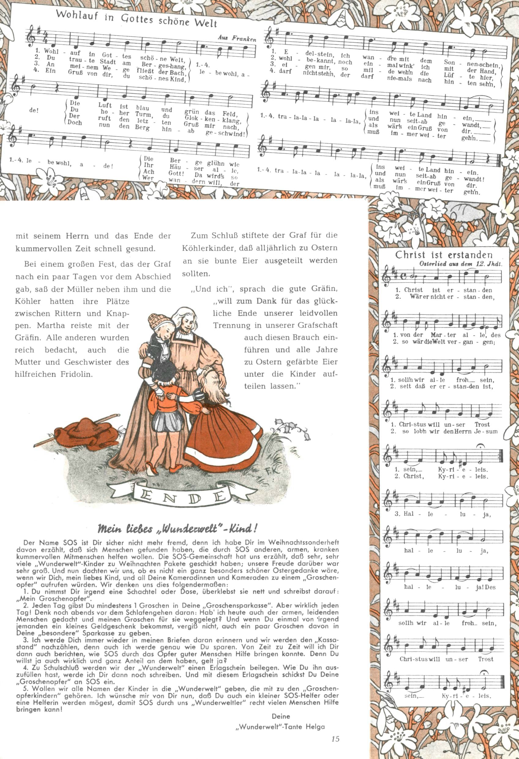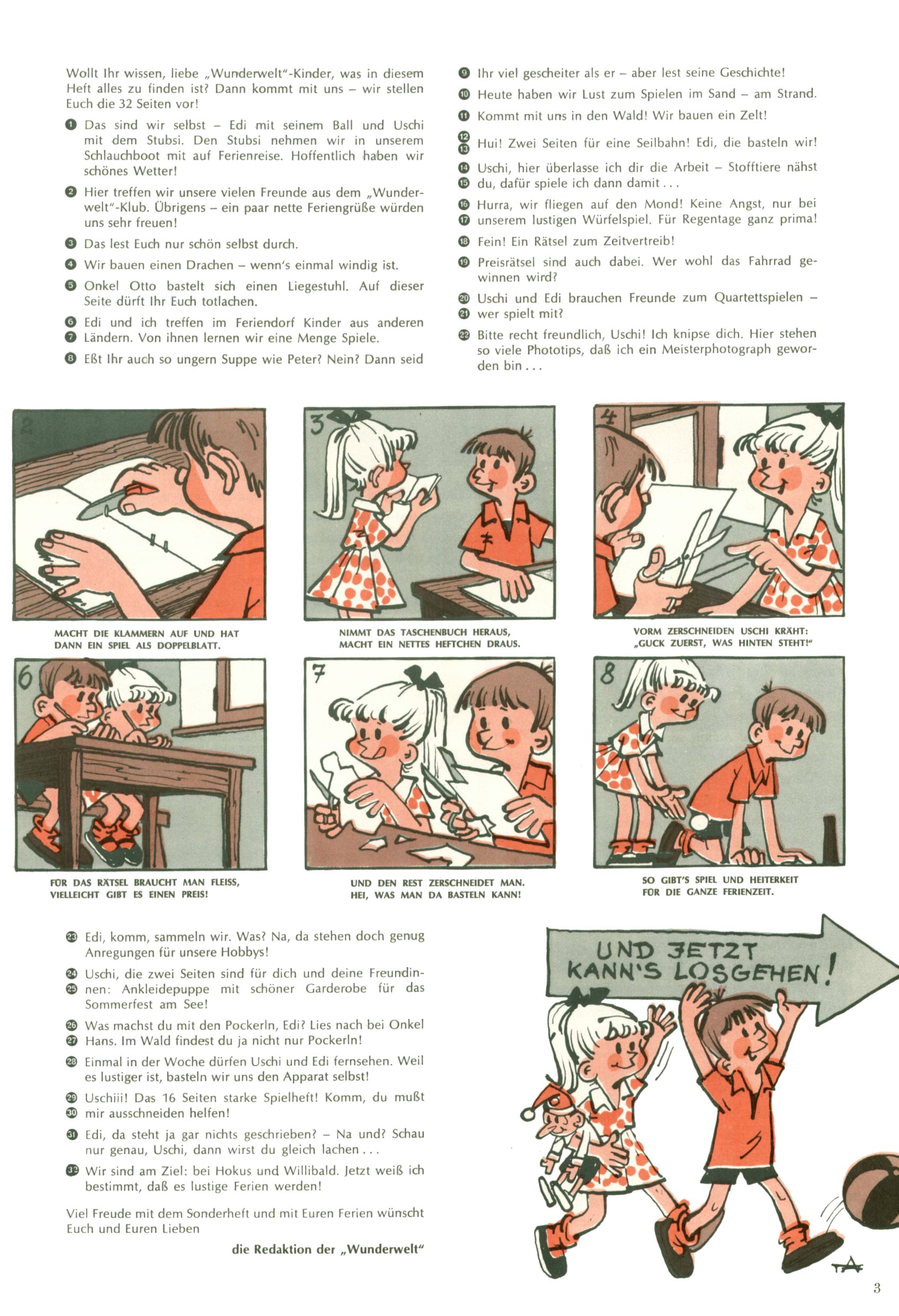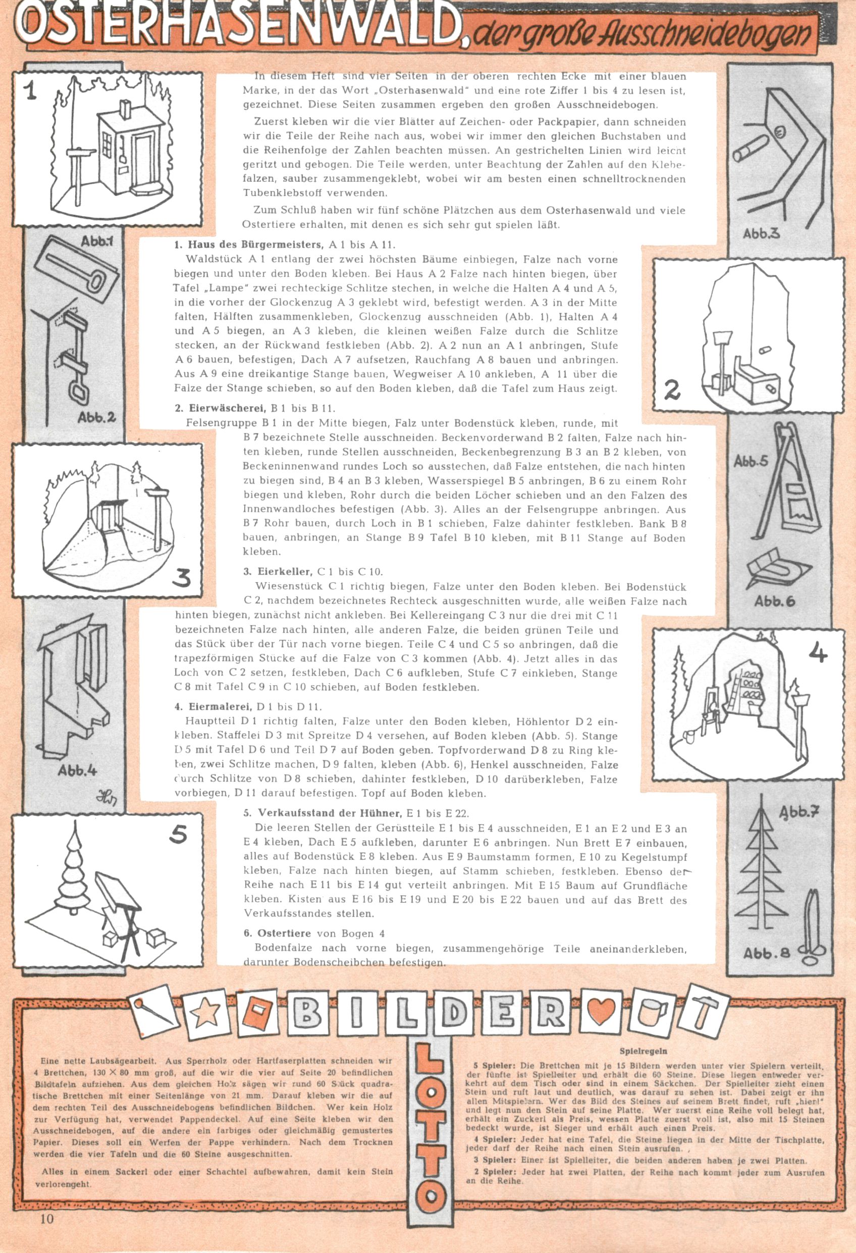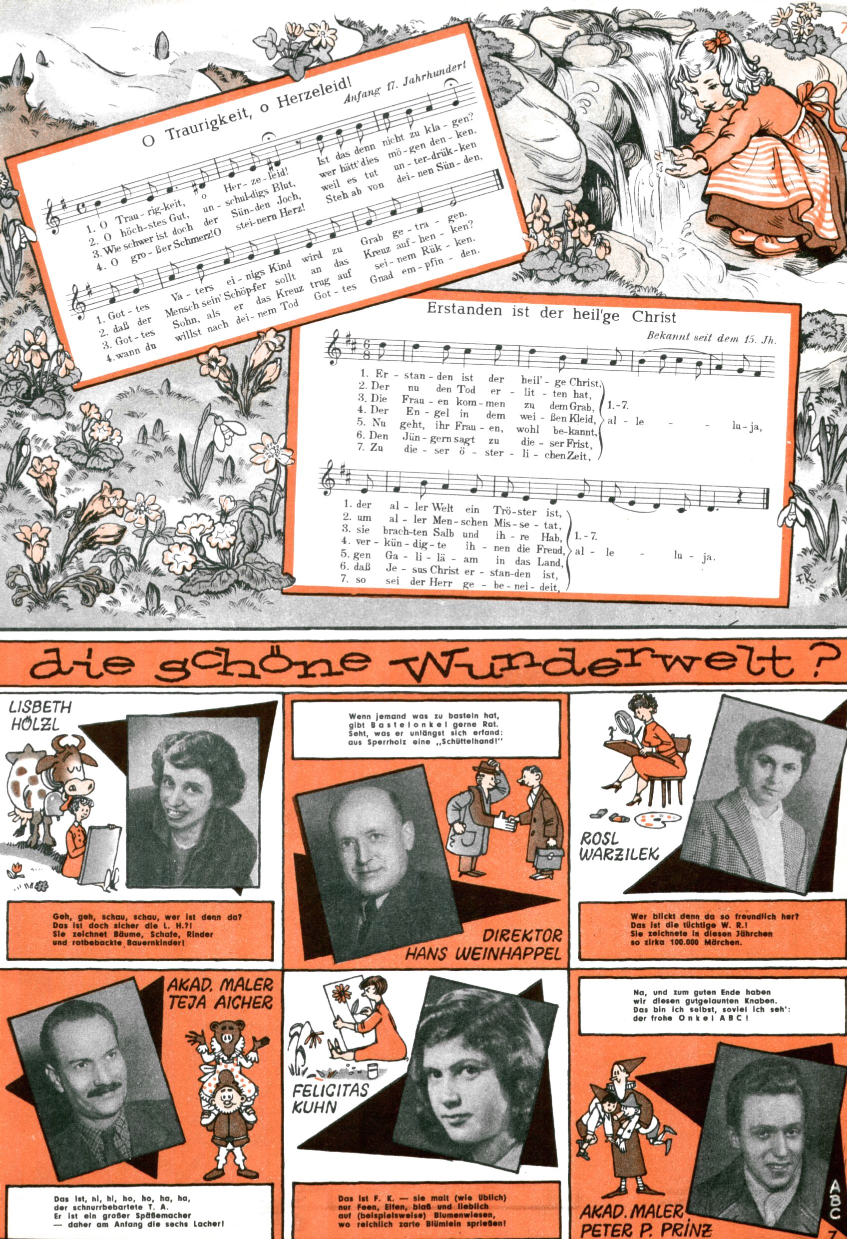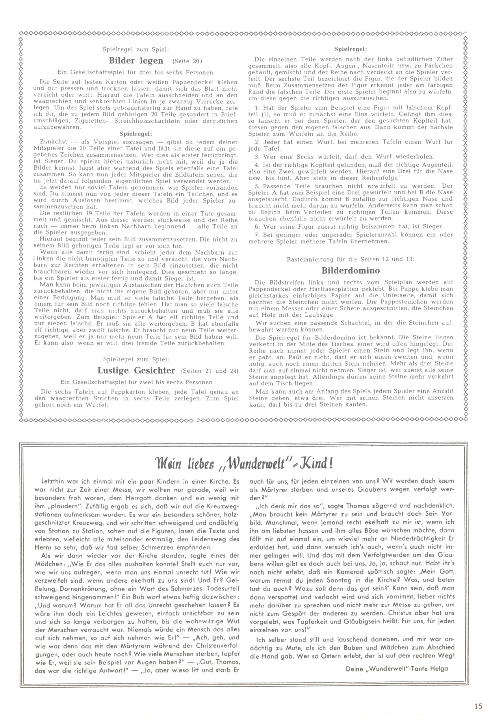 Die Wunderwelt im Festtagsgewand In den Sonderheften präsentierte sich die Wunderwelt wahrhaftig in Feiertagsstimmung. Mit wenigen Ausnahmen gab es pro Jahr drei Sonderhefte - zu Weihnachten bzw. im Advent, zu Ostern und in den Ferien im Sommer. Experimente mit Faschings- und Muttertagsheften hatten sich nicht bewährt. Selbst als es die Einzelhefte in der Krisensituation nach 1967 nicht mehr gab, wurde die Wunderwelt-Zeitung im Layout der Sonderhefte fortgesetzt: Zunächst mit 3 bis 5 und ab 1971 immerhin wieder mit 10-12 Heften pro Jahr. Die Weihnachts-, Oster- und Ferienhefte hatten naturgemäß verschiedene Schwerpunkte. Während im Sommer Spielen und Werken mit Material im Vordergrund stand, waren es zu Weihnachten Krippen und Adventhäuser; zu Ostern dann Erzählungen, Hasenstädte und Oster-Basteleien. Das bessere Papier der Sonderhefte erleichterte das Ausschneiden der insgesamt mehr als 1000 Papiermodelle erheblich. Die Sonderhefte waren vergleichsweise aufwändig gestaltet, aber auch ein wichtiges Zusatzgeschäft für die Zeitung. Die Kinder fieberten dem Erscheinungsdatum der jeweiligen Ausgabe nicht selten richtiggehend entgegen. Mit knapp 100 Seiten pro Jahr machten die Sonderhefte von der Menge her zwar nicht einmal ein Viertel aus, trugen aber zum Erscheinungsbild mindestens genauso viel bei wie die Standardhefte. Im Wesentlichen blieb das Layout der Sonderhefte über die Jahre hin unverändert. Mühselig wurde es, als man den Inhalt der Beiträge vorübergehend auf die Seiten gleichmäßig verteilte und die Kinder ermunterte, die Hefte in der Mitte zu zerschneiden. Die eine Hälfte enthielt dann etwa Erzählungen und Bastelvorschläge, der andere Teil der Zeitung Spielanleitungen. Zur übersichtlichkeit trugen diese Layoutversuche jedenfalls in keiner Weise bei und als besonderen Auswuchs gab es eine Zeitlang auf einer Seite oft mehrere Seitennummern, je nachdem, ob sich diese auf das Gesamtheft oder den herauszunehmenden und zu zerschneidenden Heftteil bezogen. Gegen Ende der 1950er Jahre kehrte man wieder zu einem ganzseitigen Layout zurück und Ideen wie ein Spiel-(Heft-im-)Heft gehörten der Vergangenheit an. In den Sonderheften experimentierte man dann noch ab Mitte der 1960er Jahre, als die Verkaufszahlen stark rückläufig waren, mit grundsätzlich neuen Darstellungsformen - weg vom Niedlich-Kitschigen und engagierte neue Grafikerinnen wie Gundi Groh und Hella Soyka. Den erhofften Erfolg brachte dies jedoch nicht mehr. |