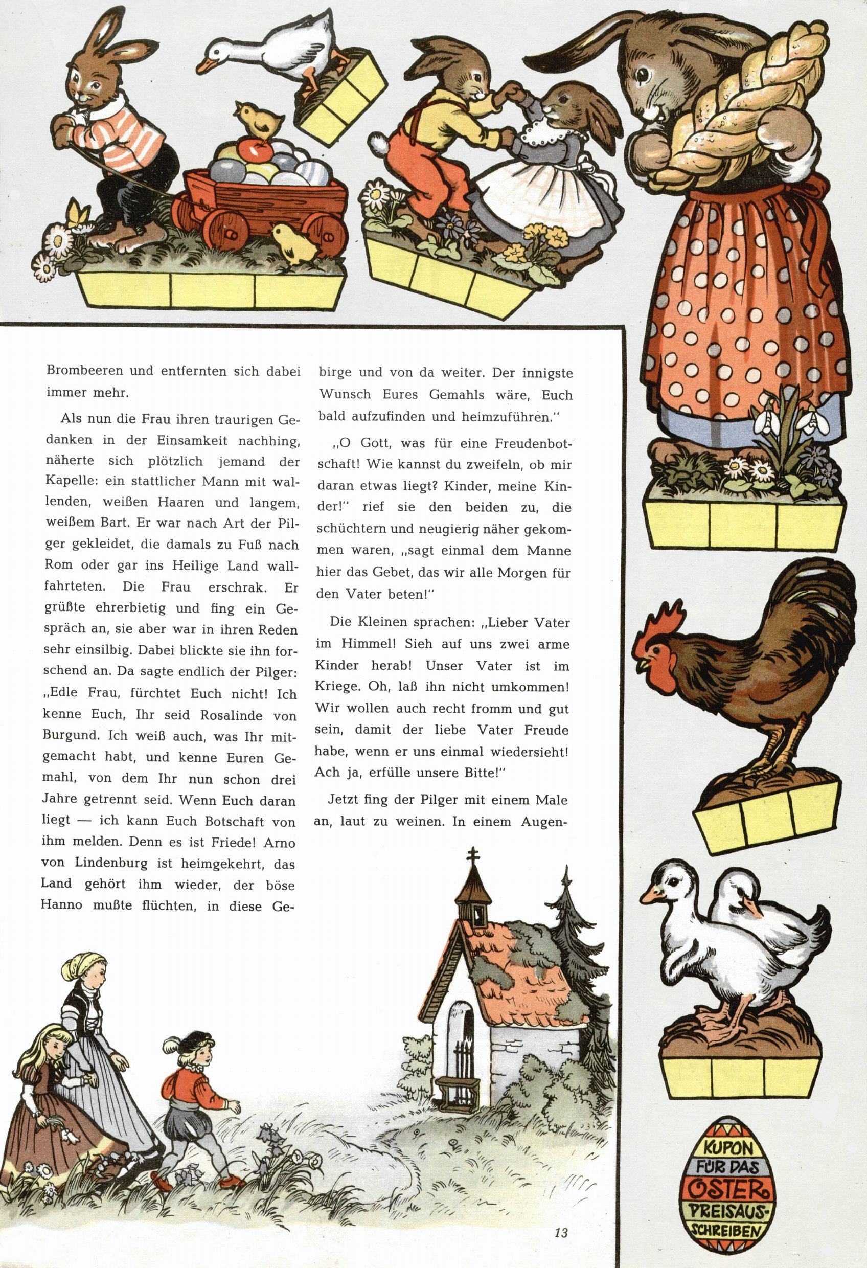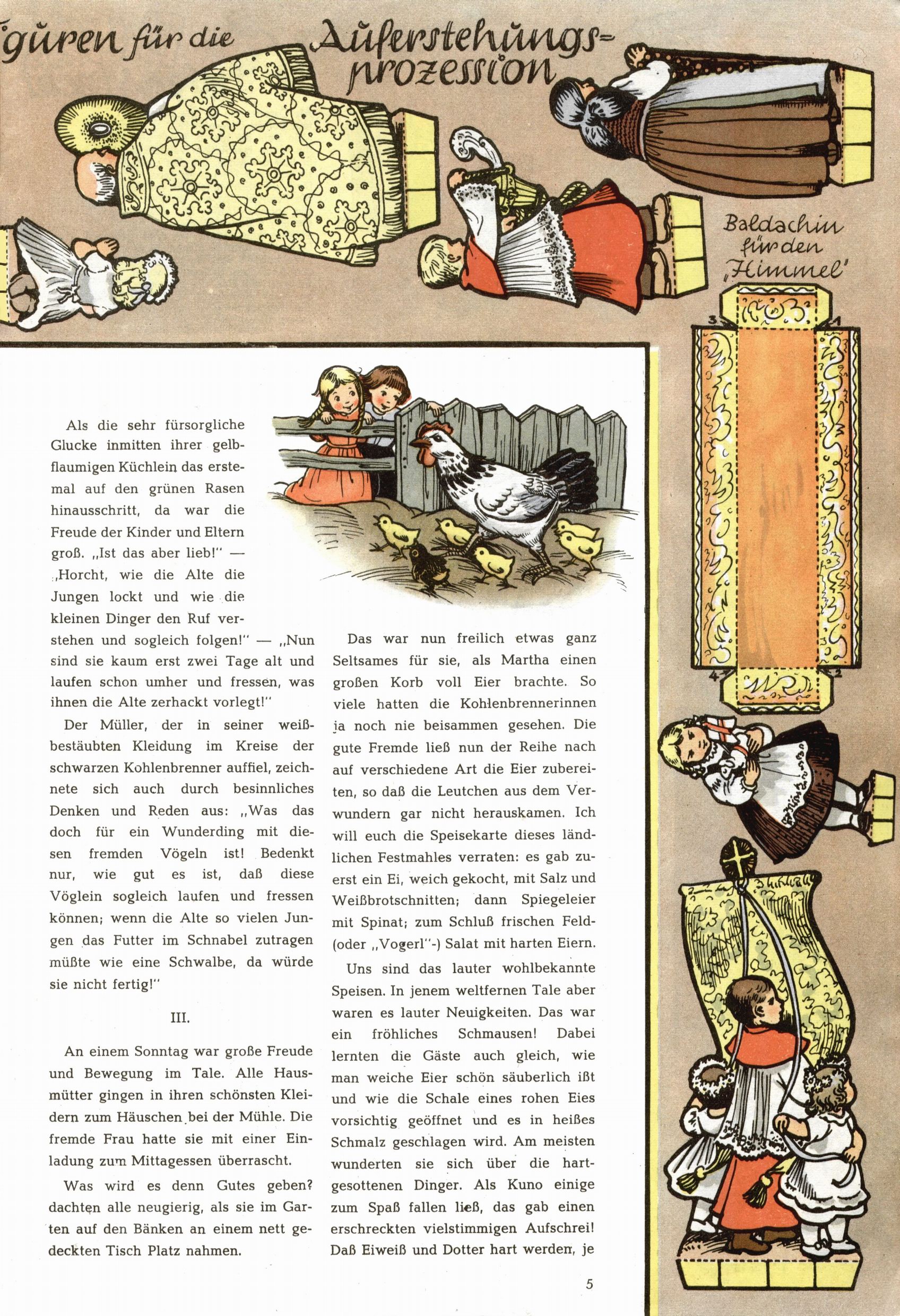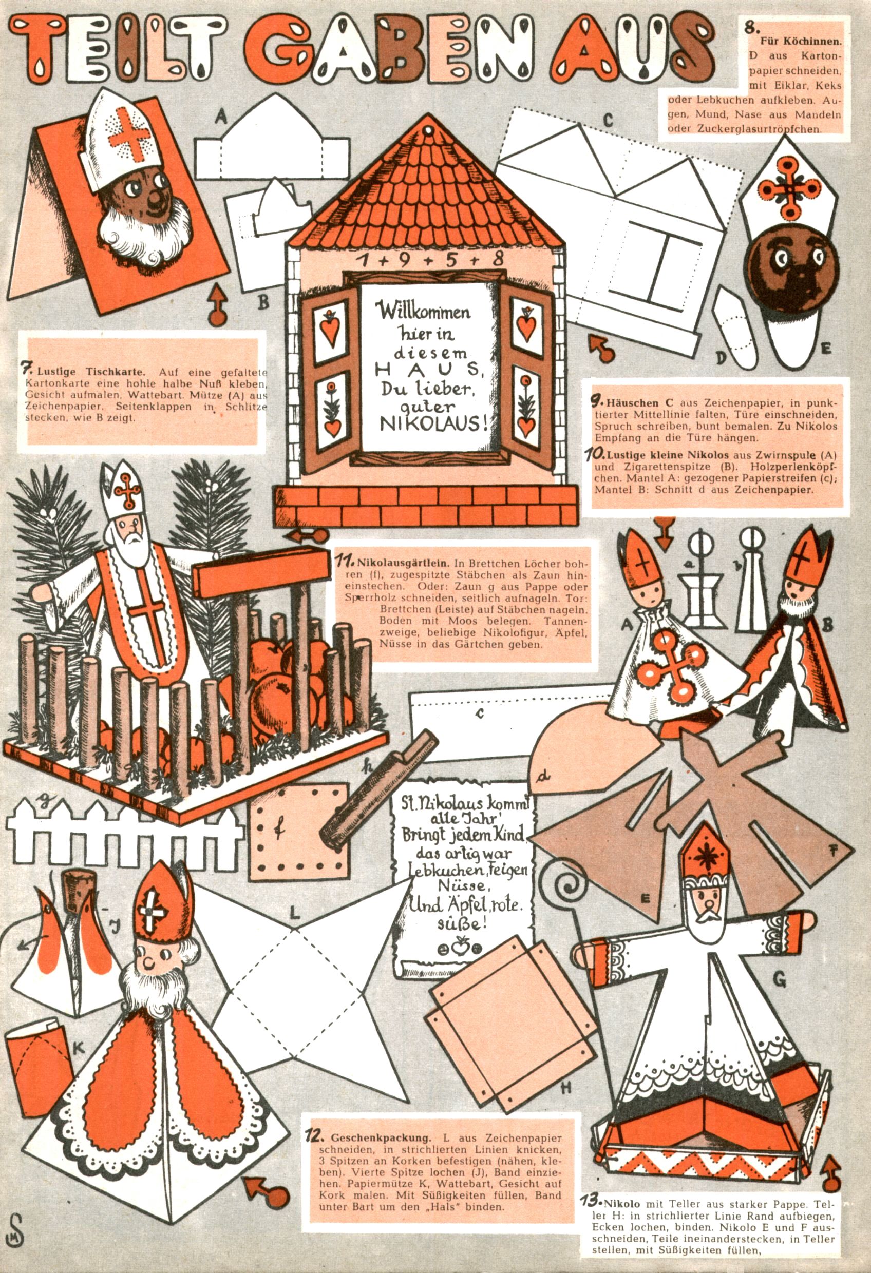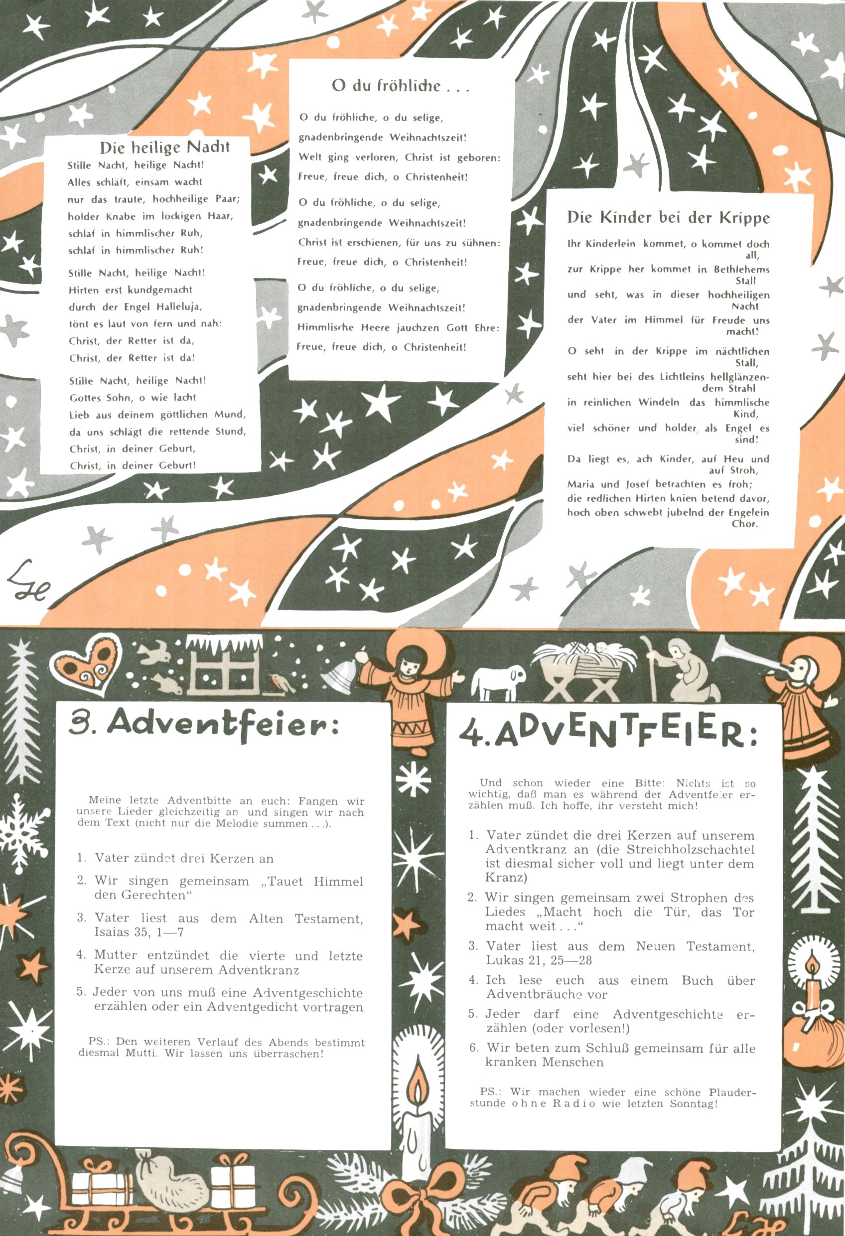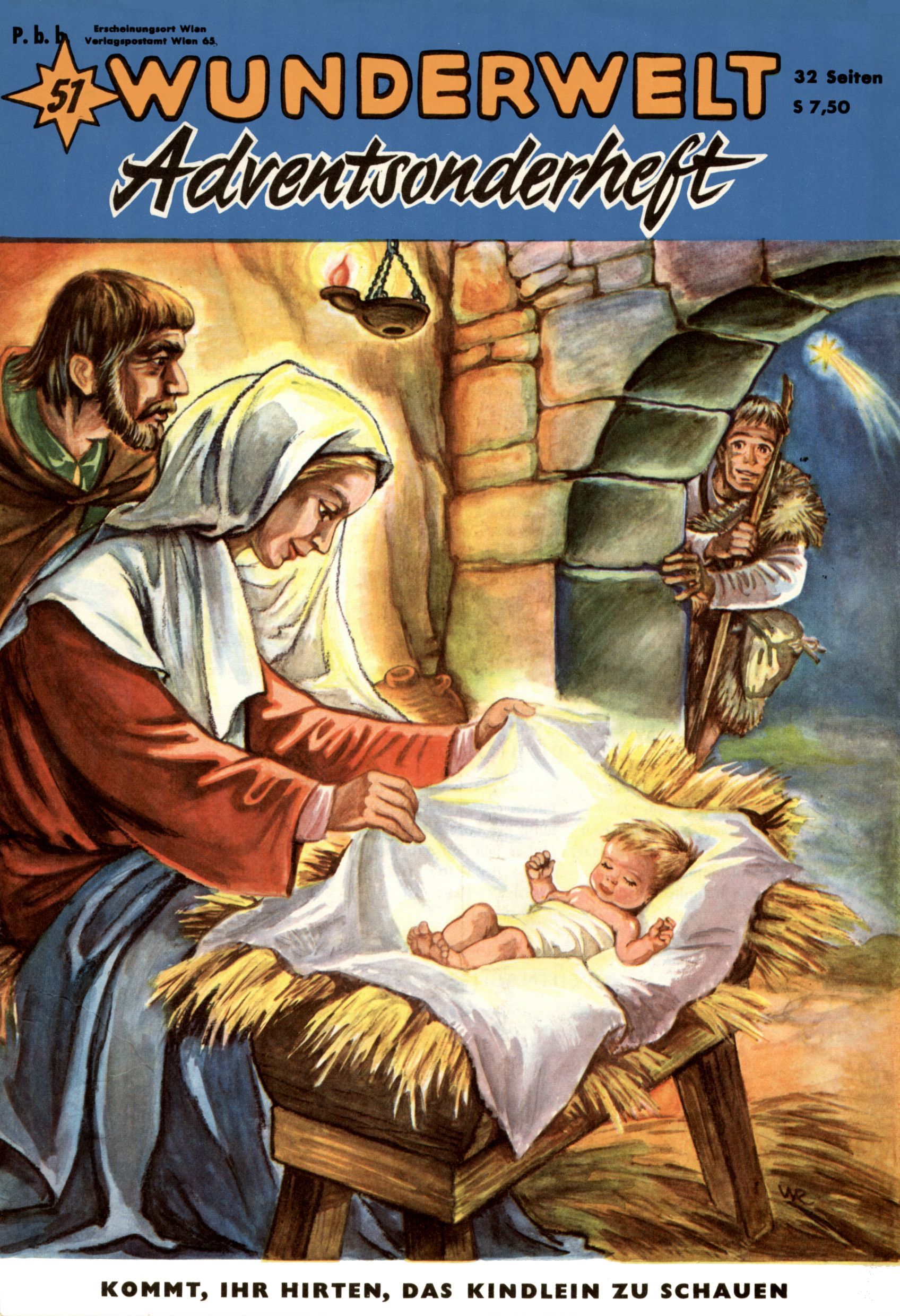 Die Wunderwelt im Festtagsgewand In den Sonderheften präsentierte sich die Wunderwelt wahrhaftig in Feiertagsstimmung. Mit wenigen Ausnahmen gab es pro Jahr drei Sonderhefte - zu Weihnachten bzw. im Advent, zu Ostern und in den Ferien im Sommer. Experimente mit Faschings- und Muttertagsheften hatten sich nicht bewährt. Selbst als es die Einzelhefte in der Krisensituation nach 1967 nicht mehr gab, wurde die Wunderwelt-Zeitung im Layout der Sonderhefte fortgesetzt: Zunächst mit 3 bis 5 und ab 1971 immerhin wieder mit 10-12 Heften pro Jahr. Die Weihnachts-, Oster- und Ferienhefte hatten naturgemäß verschiedene Schwerpunkte. Während im Sommer Spielen und Werken mit Material im Vordergrund stand, waren es zu Weihnachten Krippen und Adventhäuser; zu Ostern dann Erzählungen, Hasenstädte und Oster-Basteleien. Das bessere Papier der Sonderhefte erleichterte das Ausschneiden der insgesamt mehr als 1000 Papiermodelle erheblich. Die Sonderhefte waren vergleichsweise aufwändig gestaltet, aber auch ein wichtiges Zusatzgeschäft für die Zeitung. Die Kinder fieberten dem Erscheinungsdatum der jeweiligen Ausgabe nicht selten richtiggehend entgegen. Mit knapp 100 Seiten pro Jahr machten die Sonderhefte von der Menge her zwar nicht einmal ein Viertel aus, trugen aber zum Erscheinungsbild mindestens genauso viel bei wie die Standardhefte. Im Wesentlichen blieb das Layout der Sonderhefte über die Jahre hin unverändert. Mühselig wurde es, als man den Inhalt der Beiträge vorübergehend auf die Seiten gleichmäßig verteilte und die Kinder ermunterte, die Hefte in der Mitte zu zerschneiden. Die eine Hälfte enthielt dann etwa Erzählungen und Bastelvorschläge, der andere Teil der Zeitung Spielanleitungen. Zur übersichtlichkeit trugen diese Layoutversuche jedenfalls in keiner Weise bei und als besonderen Auswuchs gab es eine Zeitlang auf einer Seite oft mehrere Seitennummern, je nachdem, ob sich diese auf das Gesamtheft oder den herauszunehmenden und zu zerschneidenden Heftteil bezogen. Gegen Ende der 1950er Jahre kehrte man wieder zu einem ganzseitigen Layout zurück und Ideen wie ein Spiel-(Heft-im-)Heft gehörten der Vergangenheit an. In den Sonderheften experimentierte man dann noch ab Mitte der 1960er Jahre, als die Verkaufszahlen stark rückläufig waren, mit grundsätzlich neuen Darstellungsformen - weg vom Niedlich-Kitschigen und engagierte neue Grafikerinnen wie Gundi Groh und Hella Soyka. Den erhofften Erfolg brachte dies jedoch nicht mehr. |