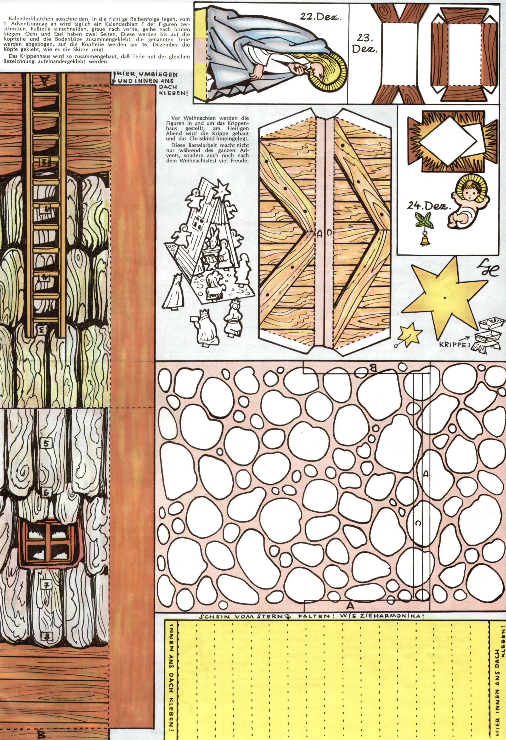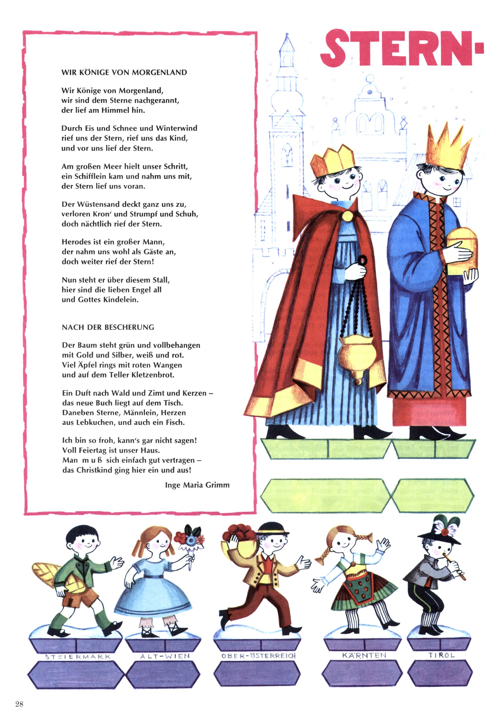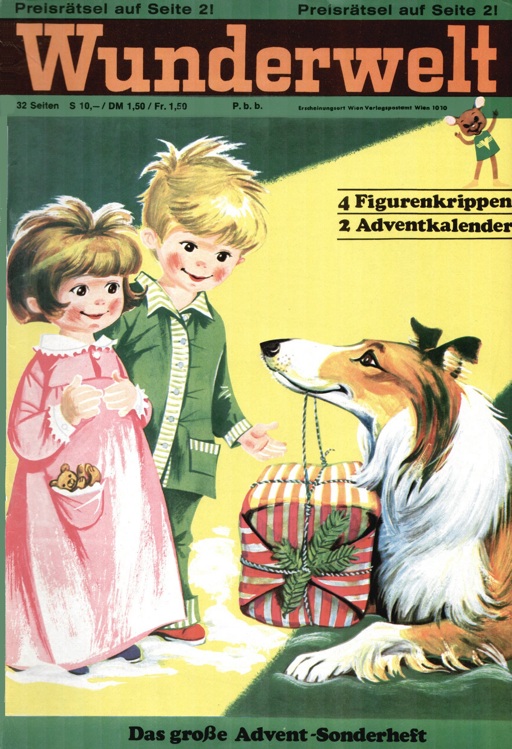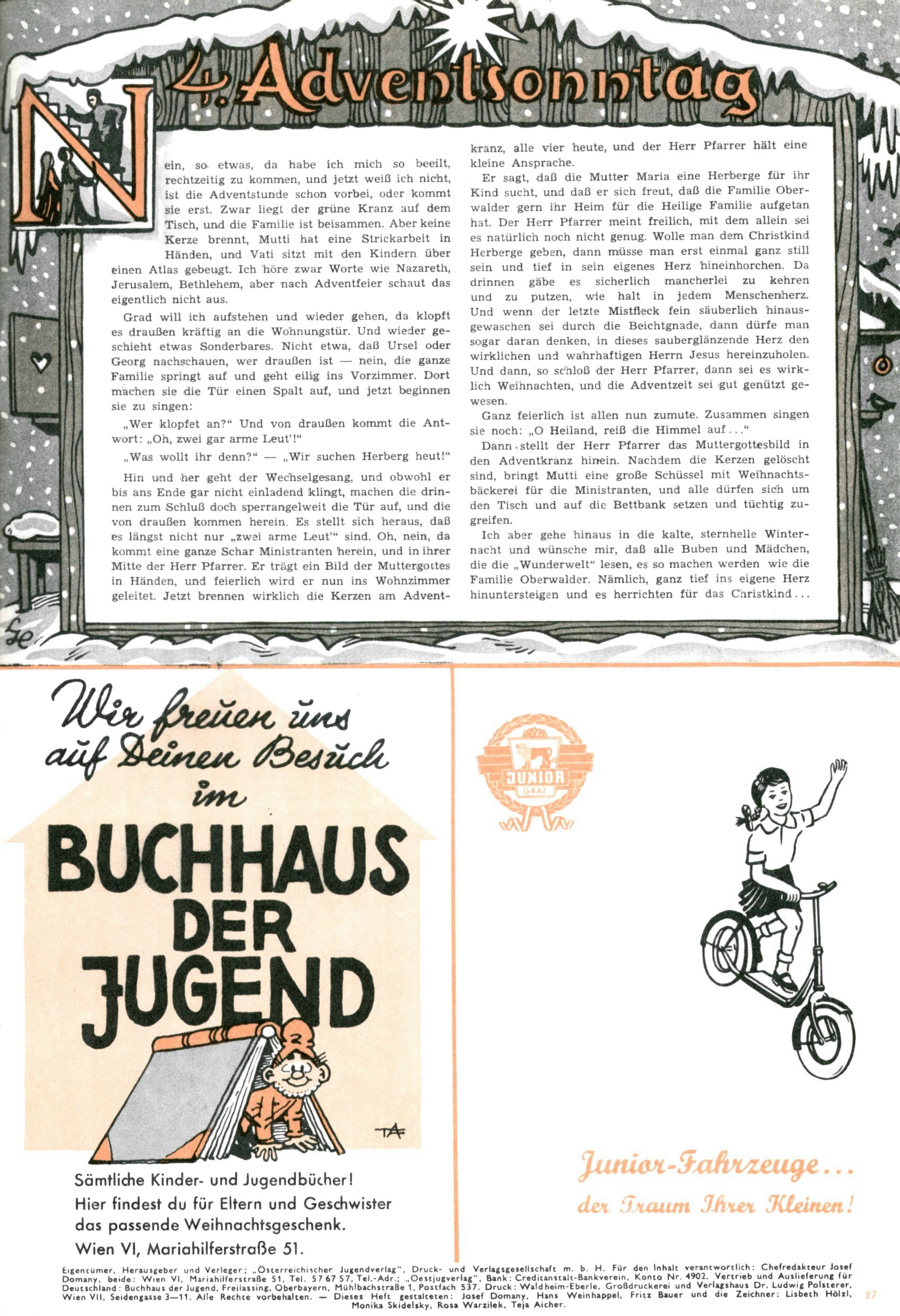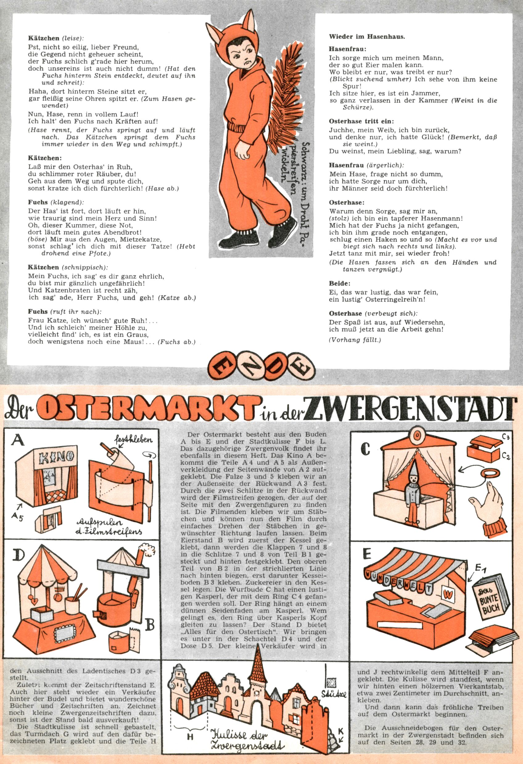 Die Wunderwelt im Festtagsgewand In den Sonderheften präsentierte sich die Wunderwelt wahrhaftig in Feiertagsstimmung. Mit wenigen Ausnahmen gab es pro Jahr drei Sonderhefte - zu Weihnachten bzw. im Advent, zu Ostern und in den Ferien im Sommer. Experimente mit Faschings- und Muttertagsheften hatten sich nicht bewährt. Selbst als es die Einzelhefte in der Krisensituation nach 1967 nicht mehr gab, wurde die Wunderwelt-Zeitung im Layout der Sonderhefte fortgesetzt: Zunächst mit 3 bis 5 und ab 1971 immerhin wieder mit 10-12 Heften pro Jahr. Die Weihnachts-, Oster- und Ferienhefte hatten naturgemäß verschiedene Schwerpunkte. Während im Sommer Spielen und Werken mit Material im Vordergrund stand, waren es zu Weihnachten Krippen und Adventhäuser; zu Ostern dann Erzählungen, Hasenstädte und Oster-Basteleien. Das bessere Papier der Sonderhefte erleichterte das Ausschneiden der insgesamt mehr als 1000 Papiermodelle erheblich. Die Sonderhefte waren vergleichsweise aufwändig gestaltet, aber auch ein wichtiges Zusatzgeschäft für die Zeitung. Die Kinder fieberten dem Erscheinungsdatum der jeweiligen Ausgabe nicht selten richtiggehend entgegen. Mit knapp 100 Seiten pro Jahr machten die Sonderhefte von der Menge her zwar nicht einmal ein Viertel aus, trugen aber zum Erscheinungsbild mindestens genauso viel bei wie die Standardhefte. Im Wesentlichen blieb das Layout der Sonderhefte über die Jahre hin unverändert. Mühselig wurde es, als man den Inhalt der Beiträge vorübergehend auf die Seiten gleichmäßig verteilte und die Kinder ermunterte, die Hefte in der Mitte zu zerschneiden. Die eine Hälfte enthielt dann etwa Erzählungen und Bastelvorschläge, der andere Teil der Zeitung Spielanleitungen. Zur übersichtlichkeit trugen diese Layoutversuche jedenfalls in keiner Weise bei und als besonderen Auswuchs gab es eine Zeitlang auf einer Seite oft mehrere Seitennummern, je nachdem, ob sich diese auf das Gesamtheft oder den herauszunehmenden und zu zerschneidenden Heftteil bezogen. Gegen Ende der 1950er Jahre kehrte man wieder zu einem ganzseitigen Layout zurück und Ideen wie ein Spiel-(Heft-im-)Heft gehörten der Vergangenheit an. In den Sonderheften experimentierte man dann noch ab Mitte der 1960er Jahre, als die Verkaufszahlen stark rückläufig waren, mit grundsätzlich neuen Darstellungsformen - weg vom Niedlich-Kitschigen und engagierte neue Grafikerinnen wie Gundi Groh und Hella Soyka. Den erhofften Erfolg brachte dies jedoch nicht mehr. |