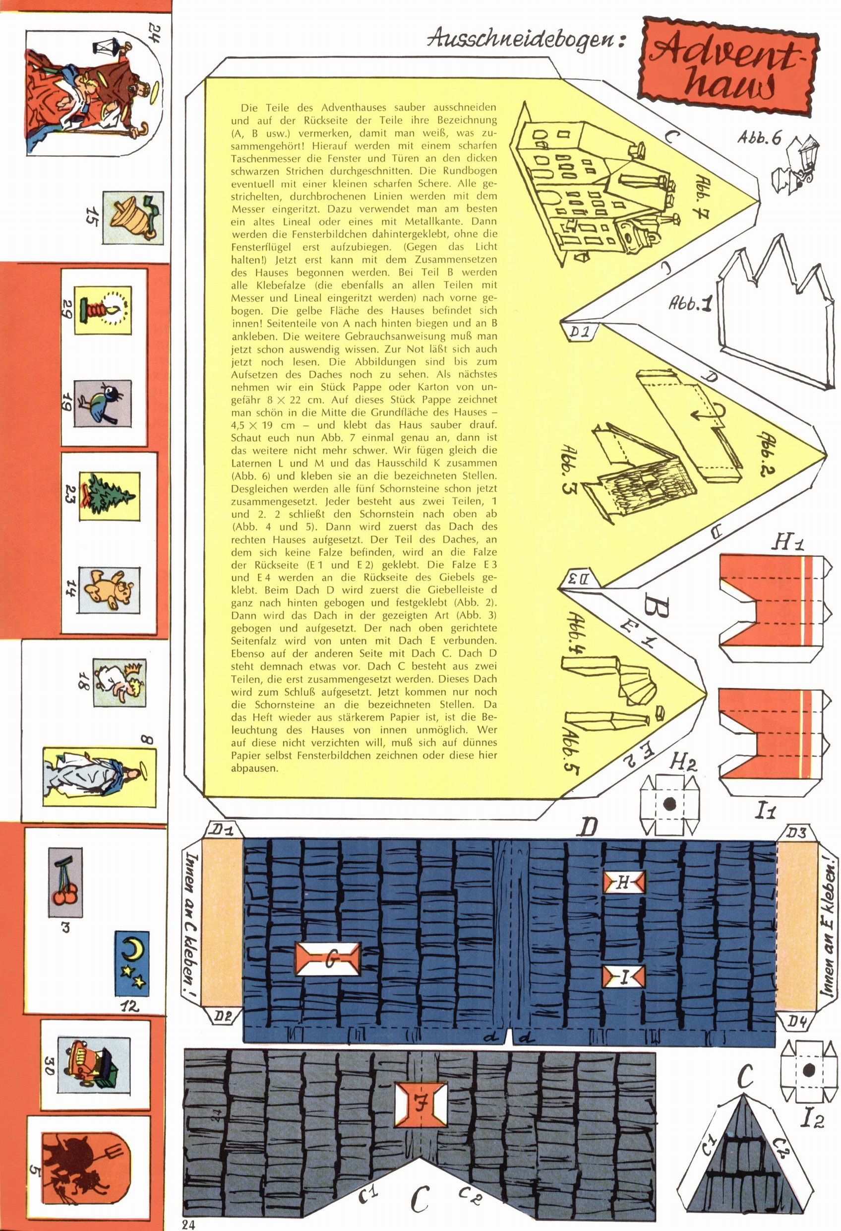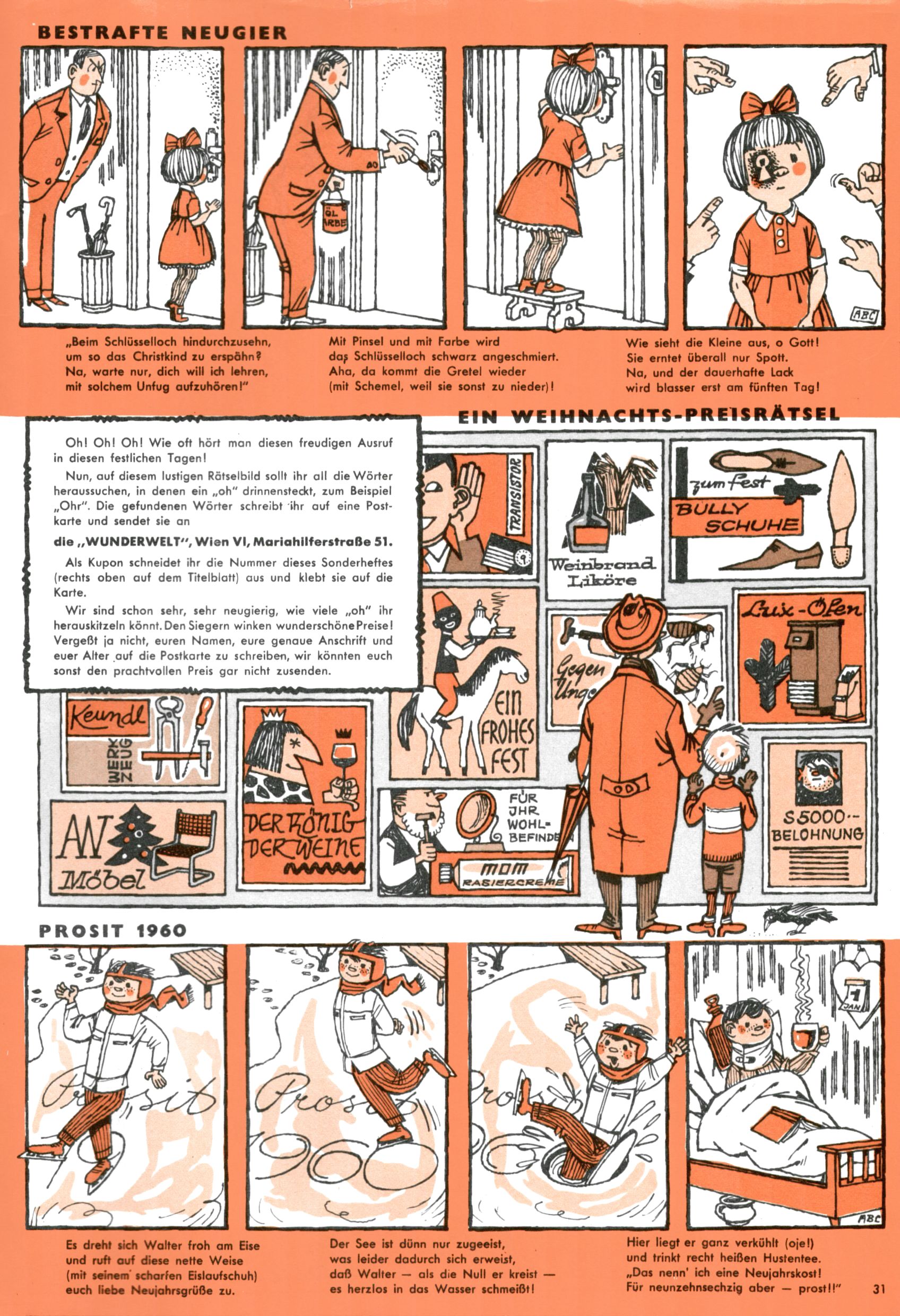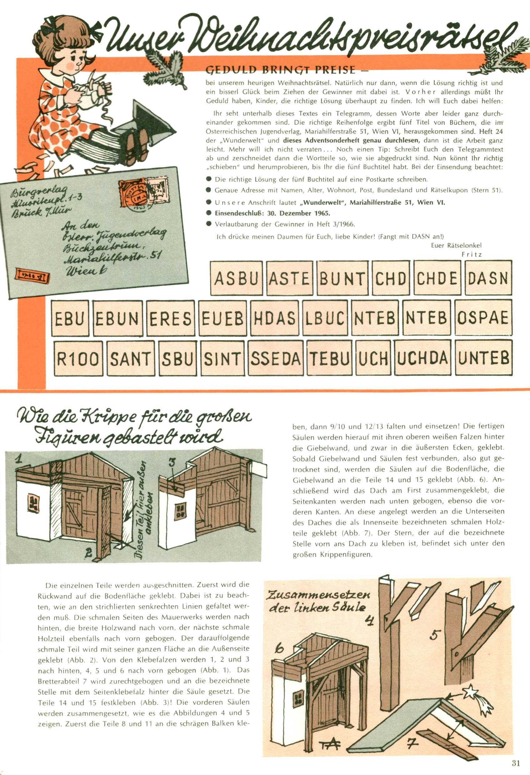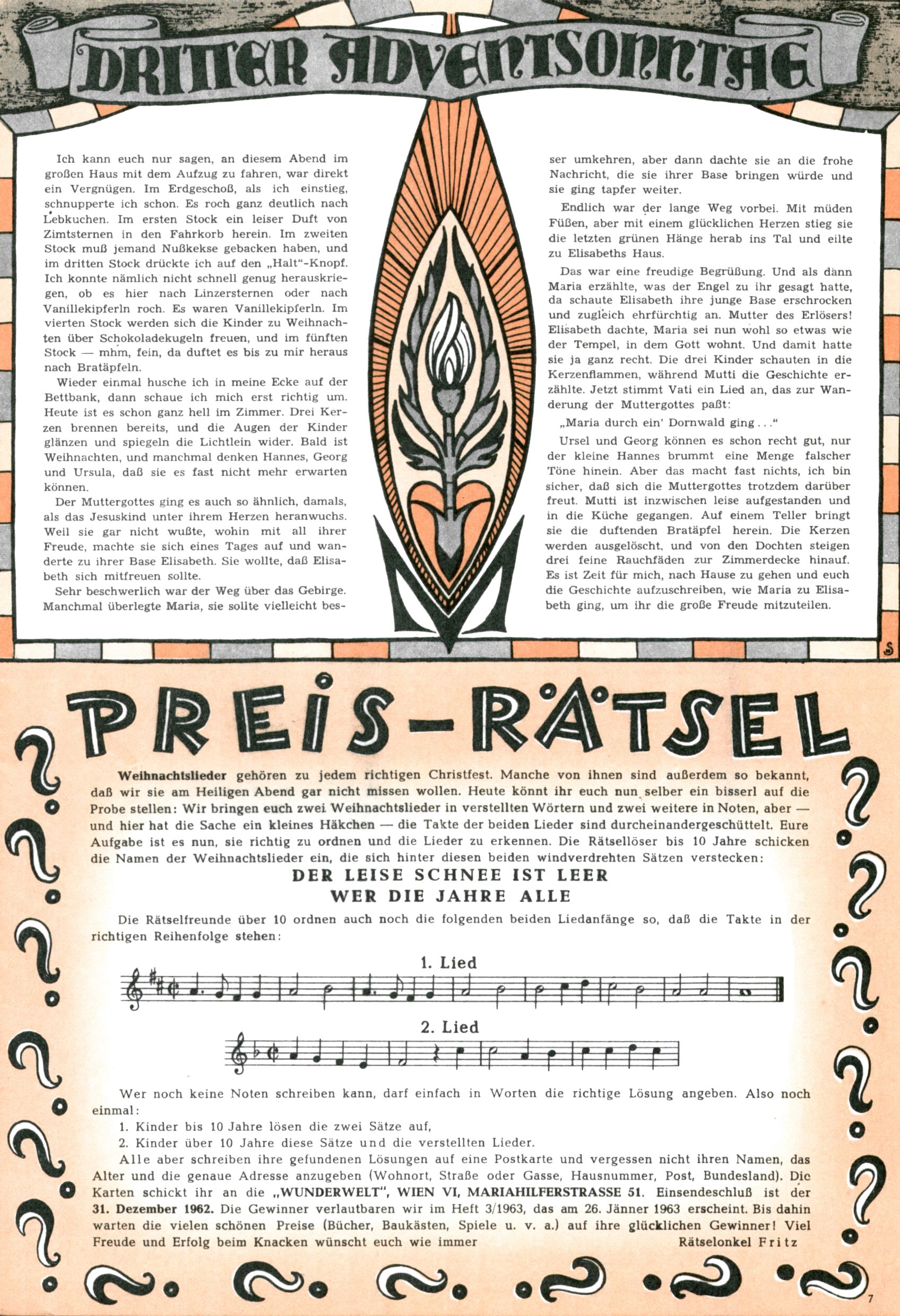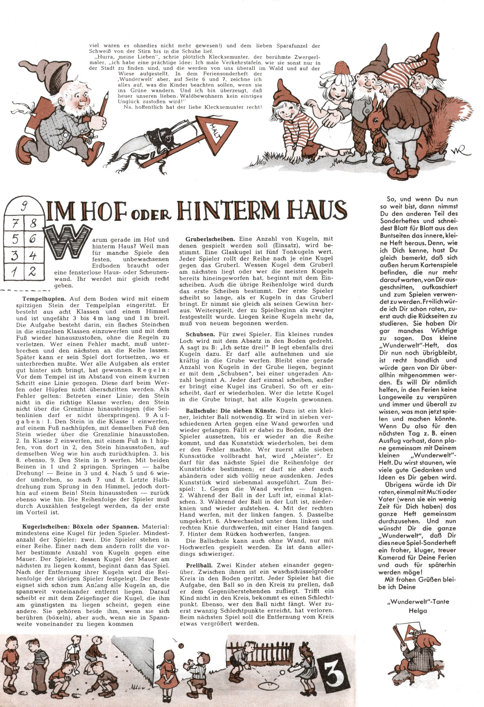 Die Wunderwelt im Festtagsgewand In den Sonderheften präsentierte sich die Wunderwelt wahrhaftig in Feiertagsstimmung. Mit wenigen Ausnahmen gab es pro Jahr drei Sonderhefte - zu Weihnachten bzw. im Advent, zu Ostern und in den Ferien im Sommer. Experimente mit Faschings- und Muttertagsheften hatten sich nicht bewährt. Selbst als es die Einzelhefte in der Krisensituation nach 1967 nicht mehr gab, wurde die Wunderwelt-Zeitung im Layout der Sonderhefte fortgesetzt: Zunächst mit 3 bis 5 und ab 1971 immerhin wieder mit 10-12 Heften pro Jahr. Die Weihnachts-, Oster- und Ferienhefte hatten naturgemäß verschiedene Schwerpunkte. Während im Sommer Spielen und Werken mit Material im Vordergrund stand, waren es zu Weihnachten Krippen und Adventhäuser; zu Ostern dann Erzählungen, Hasenstädte und Oster-Basteleien. Das bessere Papier der Sonderhefte erleichterte das Ausschneiden der insgesamt mehr als 1000 Papiermodelle erheblich. Die Sonderhefte waren vergleichsweise aufwändig gestaltet, aber auch ein wichtiges Zusatzgeschäft für die Zeitung. Die Kinder fieberten dem Erscheinungsdatum der jeweiligen Ausgabe nicht selten richtiggehend entgegen. Mit knapp 100 Seiten pro Jahr machten die Sonderhefte von der Menge her zwar nicht einmal ein Viertel aus, trugen aber zum Erscheinungsbild mindestens genauso viel bei wie die Standardhefte. Im Wesentlichen blieb das Layout der Sonderhefte über die Jahre hin unverändert. Mühselig wurde es, als man den Inhalt der Beiträge vorübergehend auf die Seiten gleichmäßig verteilte und die Kinder ermunterte, die Hefte in der Mitte zu zerschneiden. Die eine Hälfte enthielt dann etwa Erzählungen und Bastelvorschläge, der andere Teil der Zeitung Spielanleitungen. Zur übersichtlichkeit trugen diese Layoutversuche jedenfalls in keiner Weise bei und als besonderen Auswuchs gab es eine Zeitlang auf einer Seite oft mehrere Seitennummern, je nachdem, ob sich diese auf das Gesamtheft oder den herauszunehmenden und zu zerschneidenden Heftteil bezogen. Gegen Ende der 1950er Jahre kehrte man wieder zu einem ganzseitigen Layout zurück und Ideen wie ein Spiel-(Heft-im-)Heft gehörten der Vergangenheit an. In den Sonderheften experimentierte man dann noch ab Mitte der 1960er Jahre, als die Verkaufszahlen stark rückläufig waren, mit grundsätzlich neuen Darstellungsformen - weg vom Niedlich-Kitschigen und engagierte neue Grafikerinnen wie Gundi Groh und Hella Soyka. Den erhofften Erfolg brachte dies jedoch nicht mehr. |