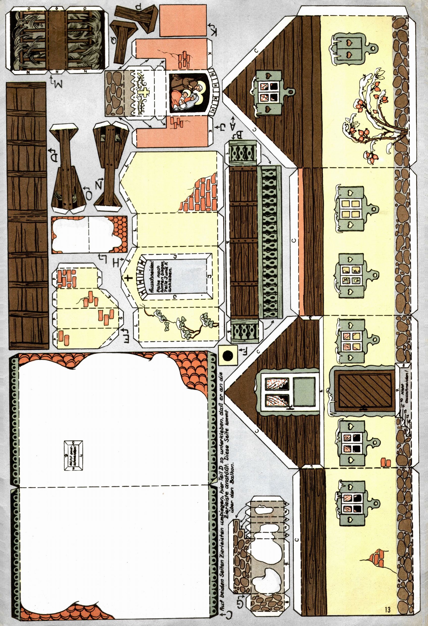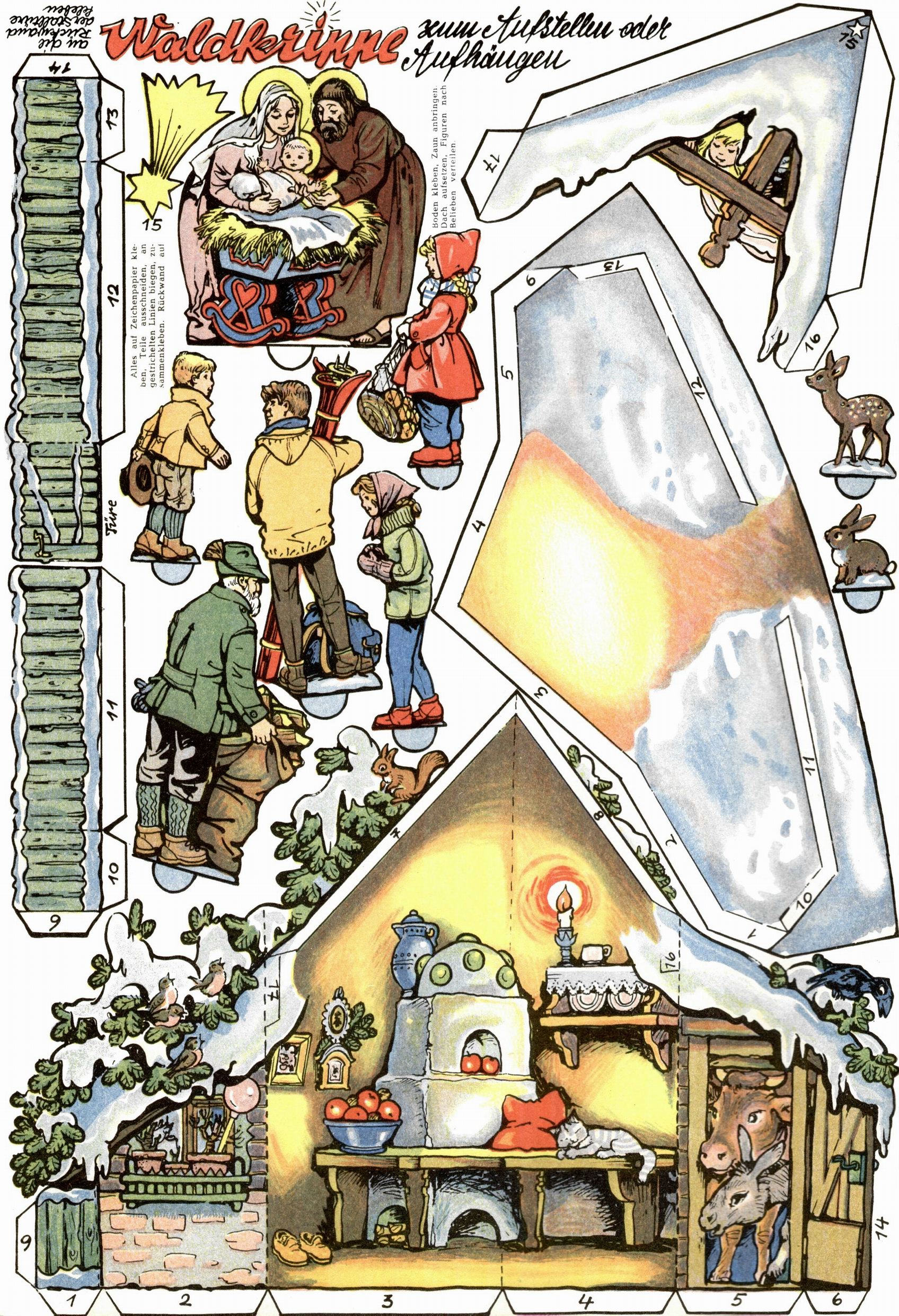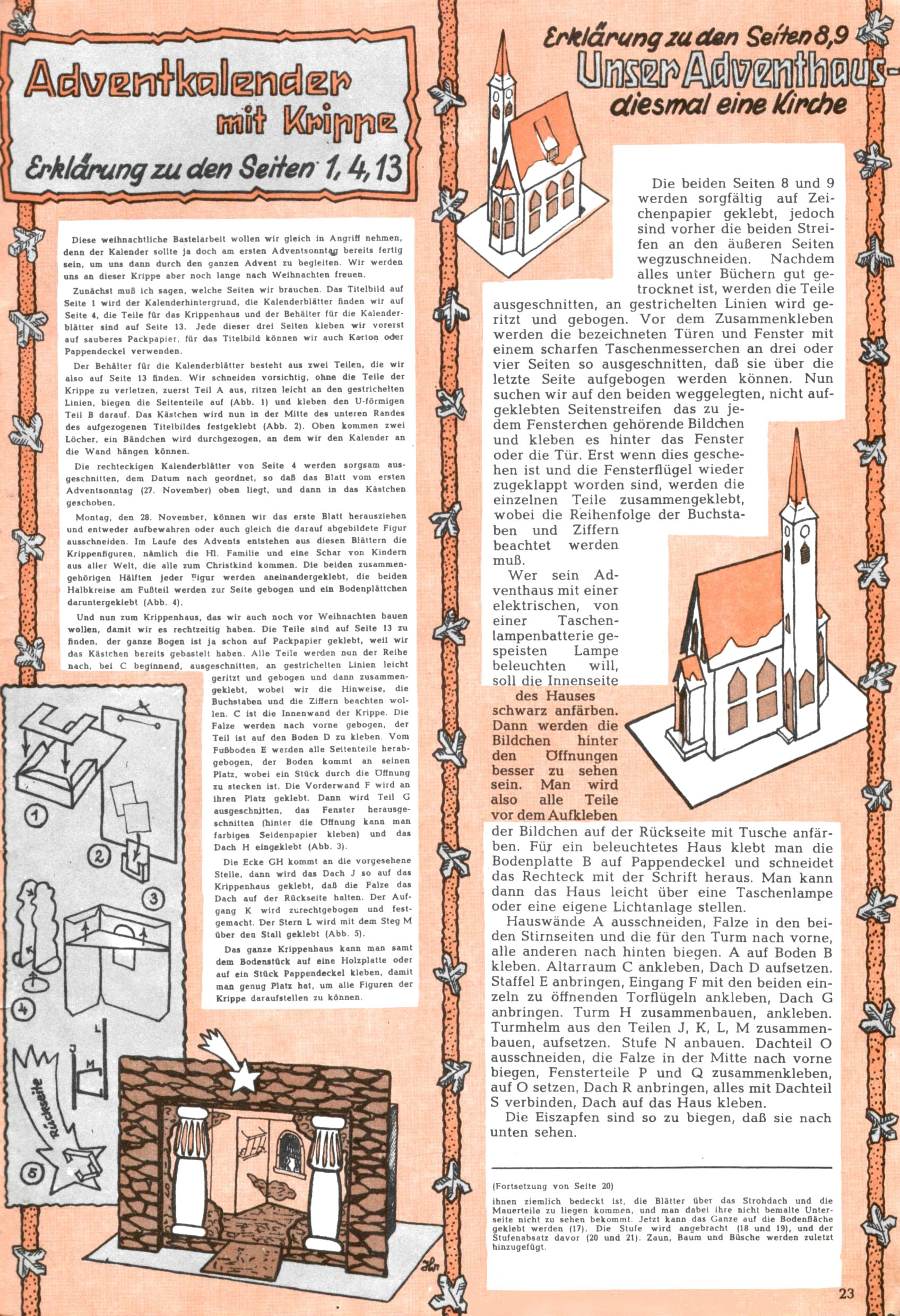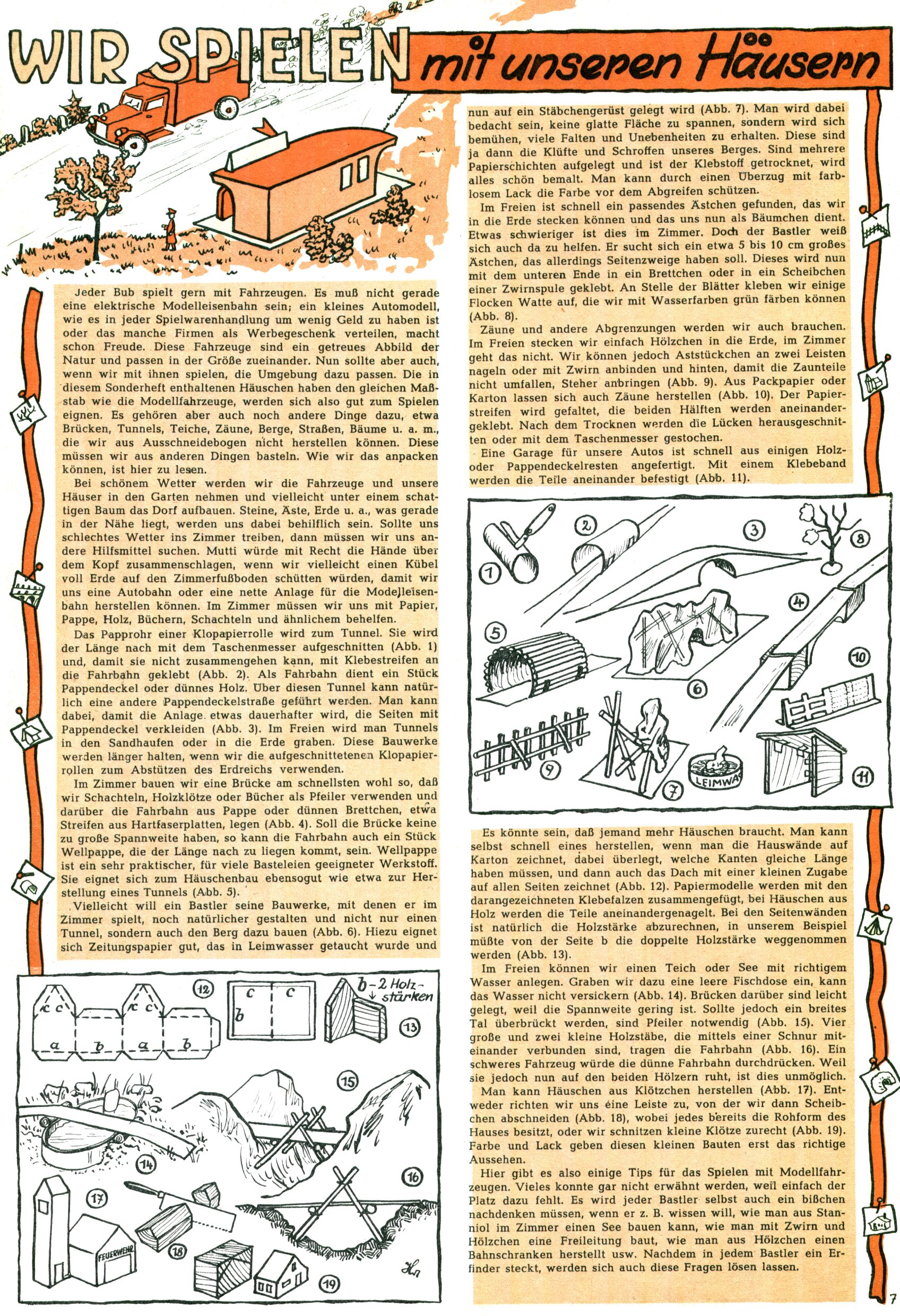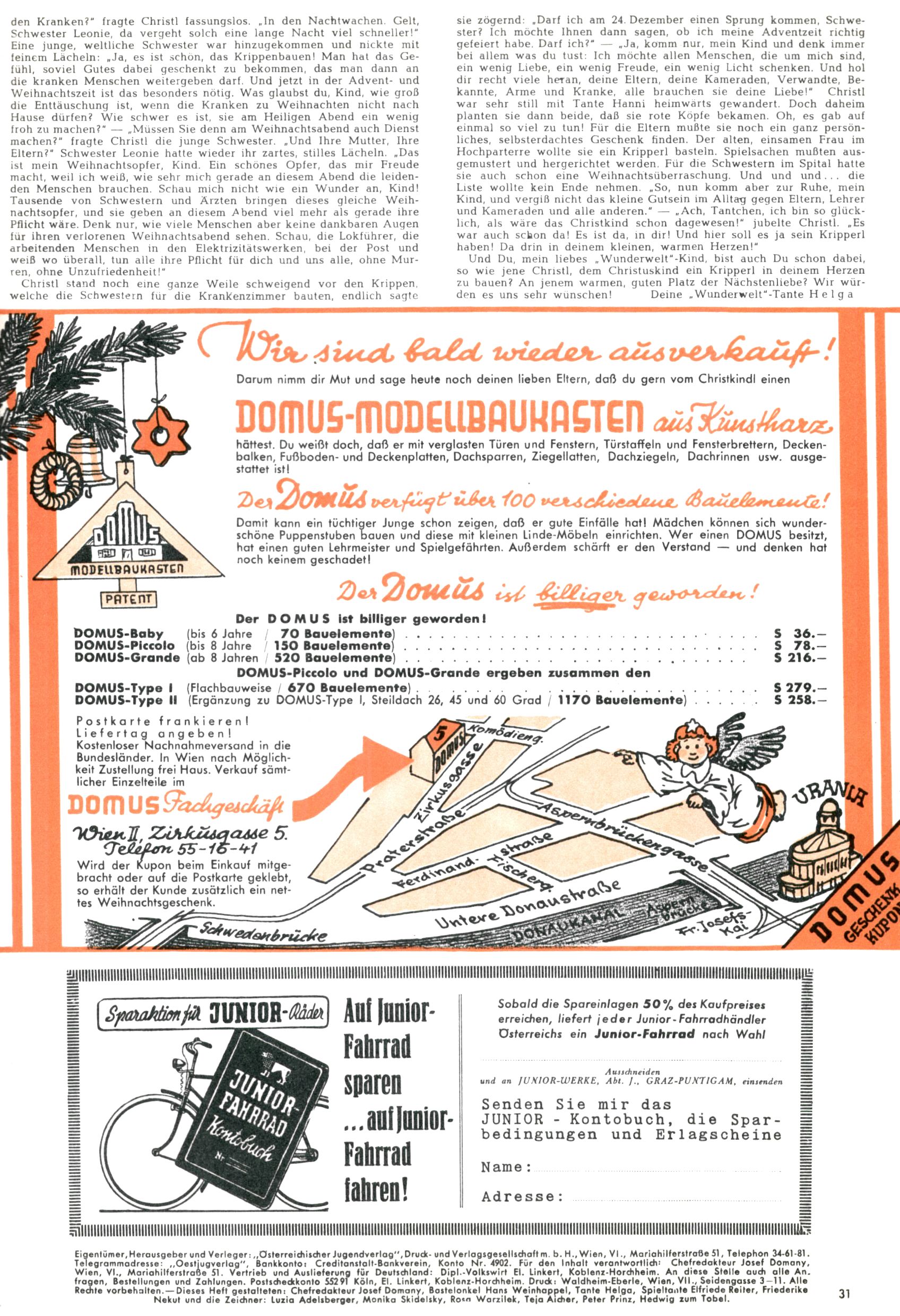 Die Wunderwelt im Festtagsgewand In den Sonderheften präsentierte sich die Wunderwelt wahrhaftig in Feiertagsstimmung. Mit wenigen Ausnahmen gab es pro Jahr drei Sonderhefte - zu Weihnachten bzw. im Advent, zu Ostern und in den Ferien im Sommer. Experimente mit Faschings- und Muttertagsheften hatten sich nicht bewährt. Selbst als es die Einzelhefte in der Krisensituation nach 1967 nicht mehr gab, wurde die Wunderwelt-Zeitung im Layout der Sonderhefte fortgesetzt: Zunächst mit 3 bis 5 und ab 1971 immerhin wieder mit 10-12 Heften pro Jahr. Die Weihnachts-, Oster- und Ferienhefte hatten naturgemäß verschiedene Schwerpunkte. Während im Sommer Spielen und Werken mit Material im Vordergrund stand, waren es zu Weihnachten Krippen und Adventhäuser; zu Ostern dann Erzählungen, Hasenstädte und Oster-Basteleien. Das bessere Papier der Sonderhefte erleichterte das Ausschneiden der insgesamt mehr als 1000 Papiermodelle erheblich. Die Sonderhefte waren vergleichsweise aufwändig gestaltet, aber auch ein wichtiges Zusatzgeschäft für die Zeitung. Die Kinder fieberten dem Erscheinungsdatum der jeweiligen Ausgabe nicht selten richtiggehend entgegen. Mit knapp 100 Seiten pro Jahr machten die Sonderhefte von der Menge her zwar nicht einmal ein Viertel aus, trugen aber zum Erscheinungsbild mindestens genauso viel bei wie die Standardhefte. Im Wesentlichen blieb das Layout der Sonderhefte über die Jahre hin unverändert. Mühselig wurde es, als man den Inhalt der Beiträge vorübergehend auf die Seiten gleichmäßig verteilte und die Kinder ermunterte, die Hefte in der Mitte zu zerschneiden. Die eine Hälfte enthielt dann etwa Erzählungen und Bastelvorschläge, der andere Teil der Zeitung Spielanleitungen. Zur übersichtlichkeit trugen diese Layoutversuche jedenfalls in keiner Weise bei und als besonderen Auswuchs gab es eine Zeitlang auf einer Seite oft mehrere Seitennummern, je nachdem, ob sich diese auf das Gesamtheft oder den herauszunehmenden und zu zerschneidenden Heftteil bezogen. Gegen Ende der 1950er Jahre kehrte man wieder zu einem ganzseitigen Layout zurück und Ideen wie ein Spiel-(Heft-im-)Heft gehörten der Vergangenheit an. In den Sonderheften experimentierte man dann noch ab Mitte der 1960er Jahre, als die Verkaufszahlen stark rückläufig waren, mit grundsätzlich neuen Darstellungsformen - weg vom Niedlich-Kitschigen und engagierte neue Grafikerinnen wie Gundi Groh und Hella Soyka. Den erhofften Erfolg brachte dies jedoch nicht mehr. |