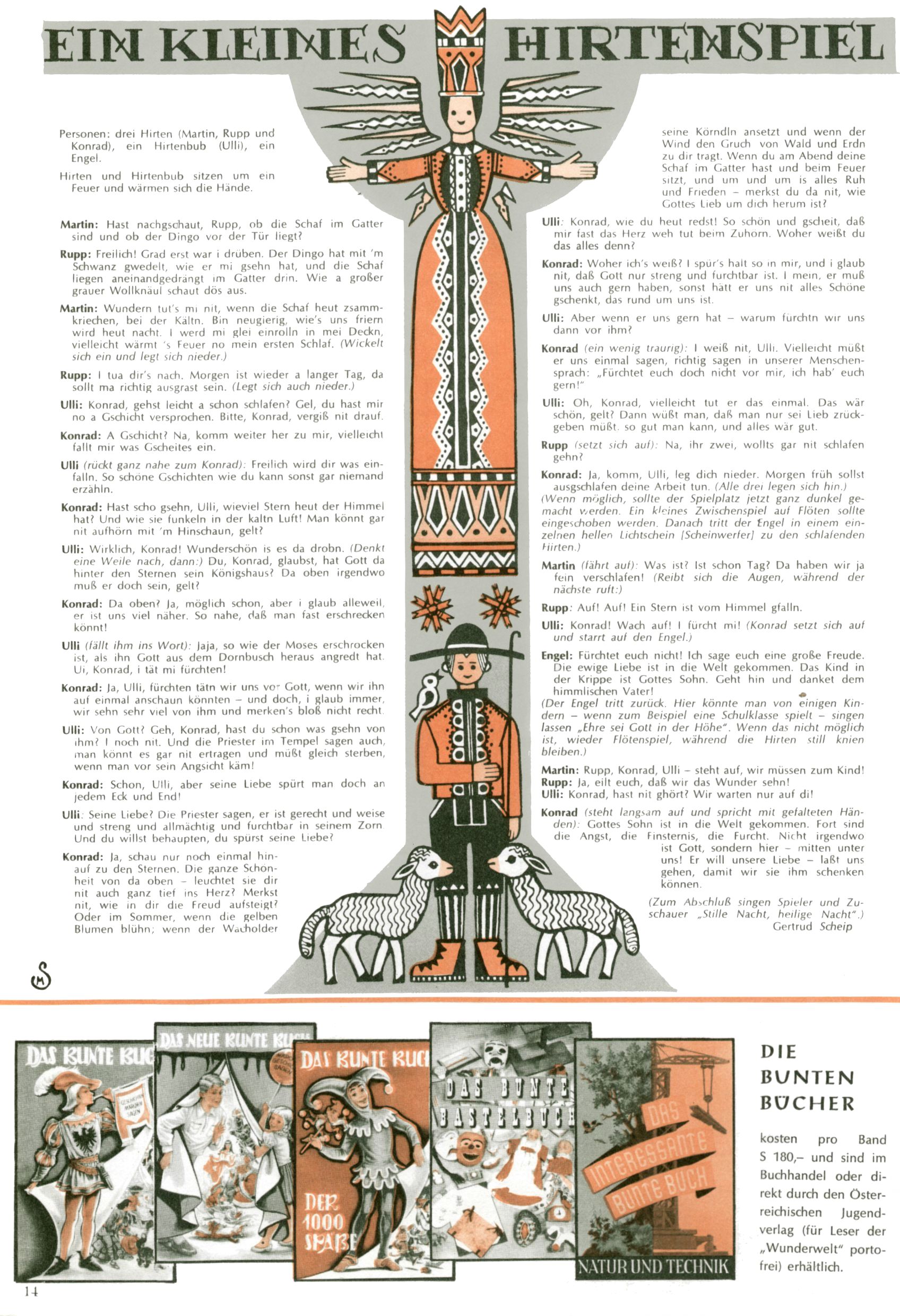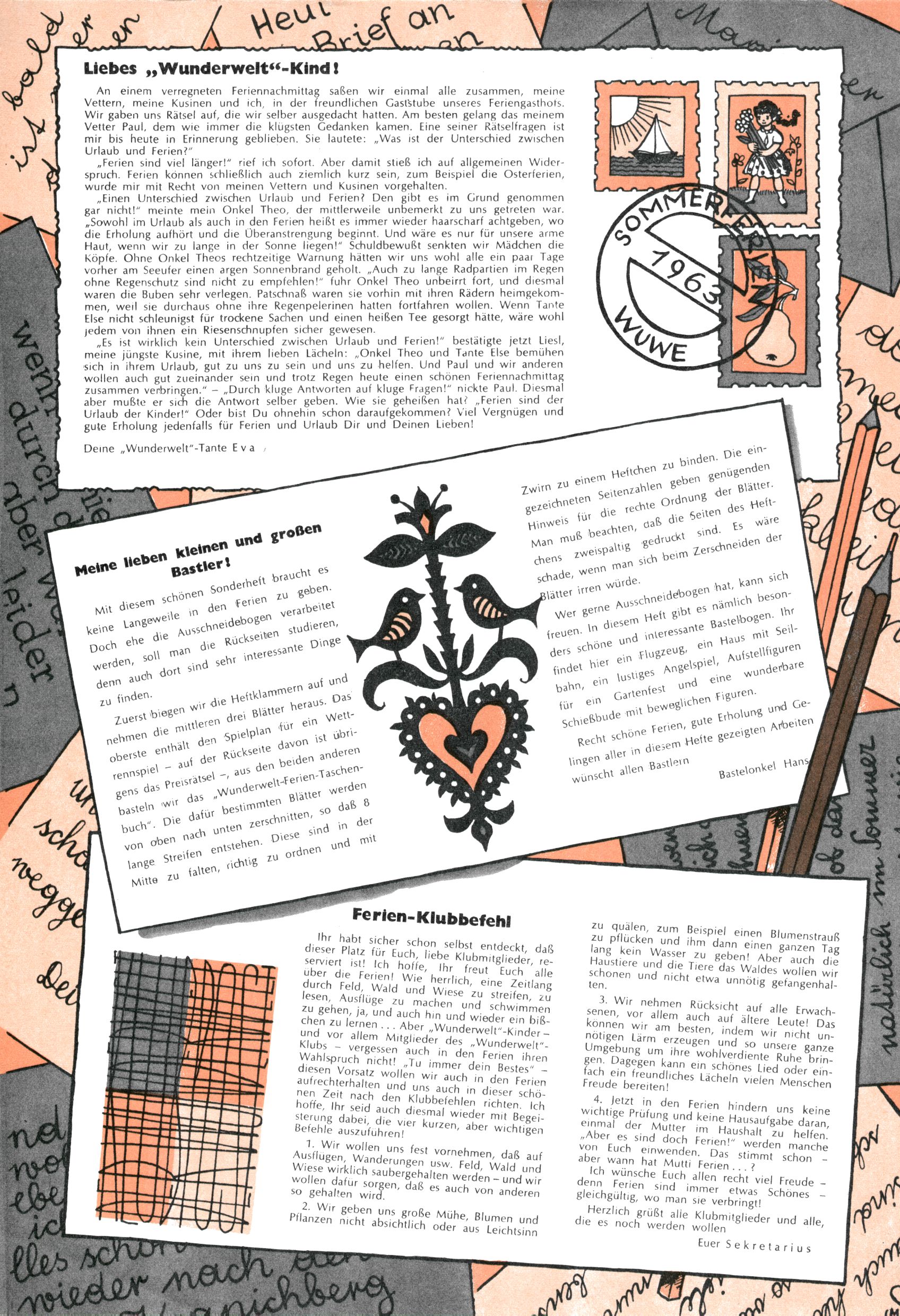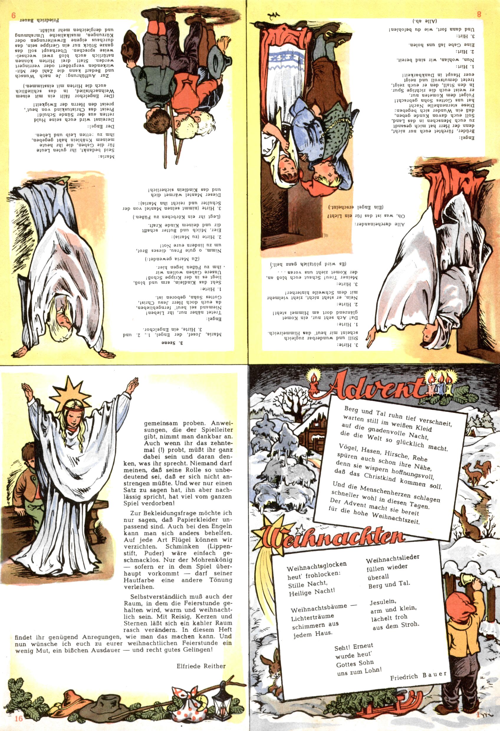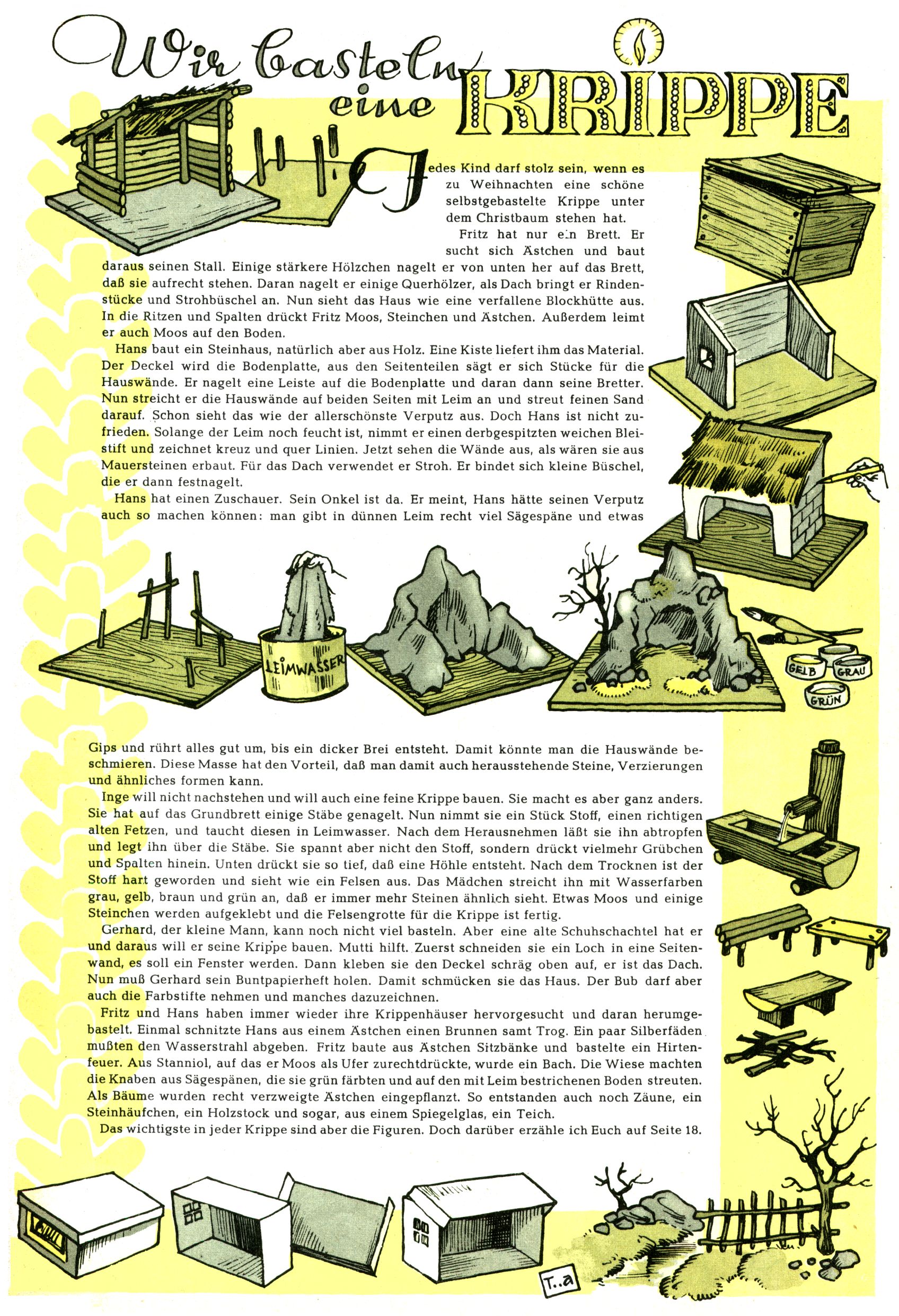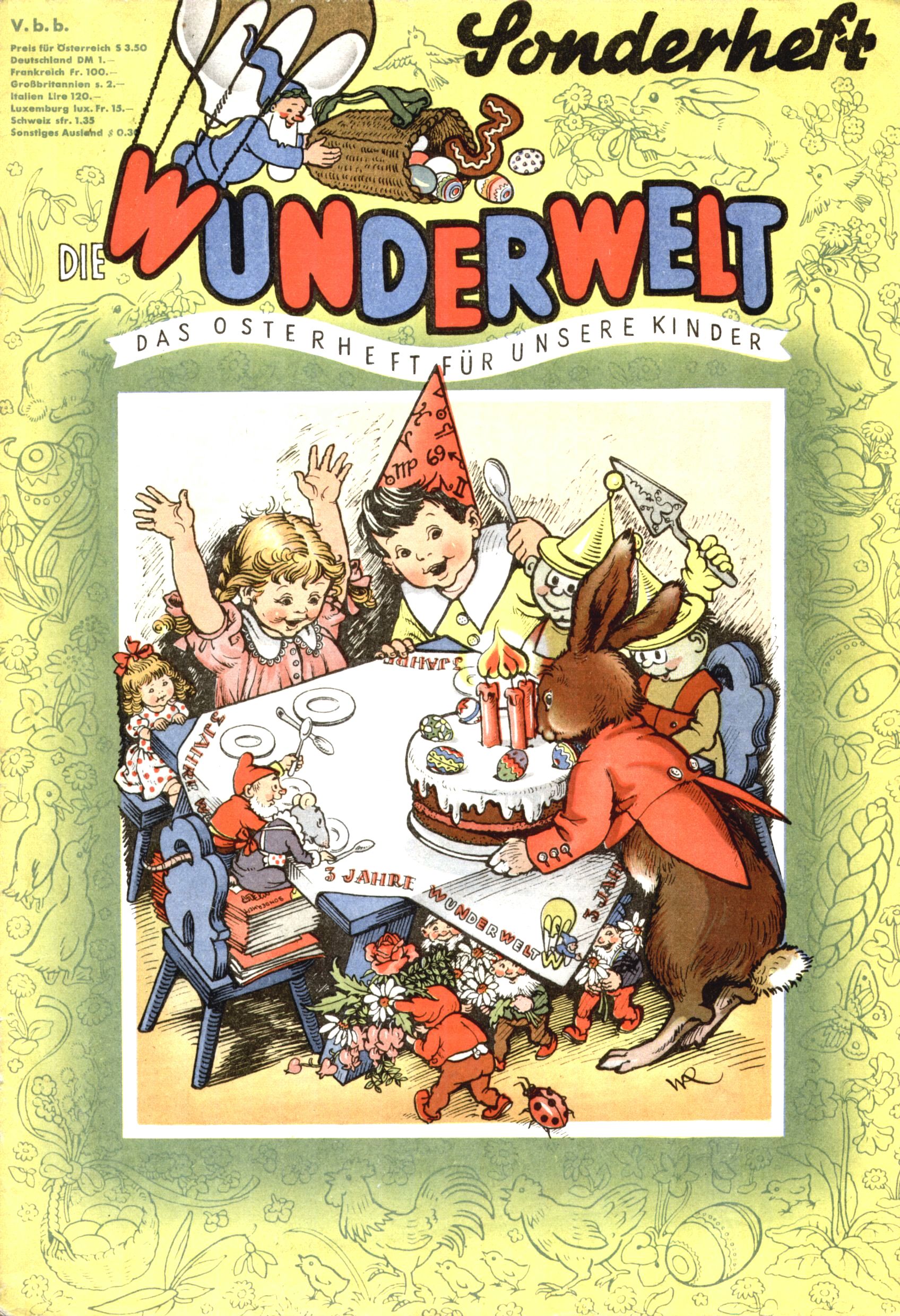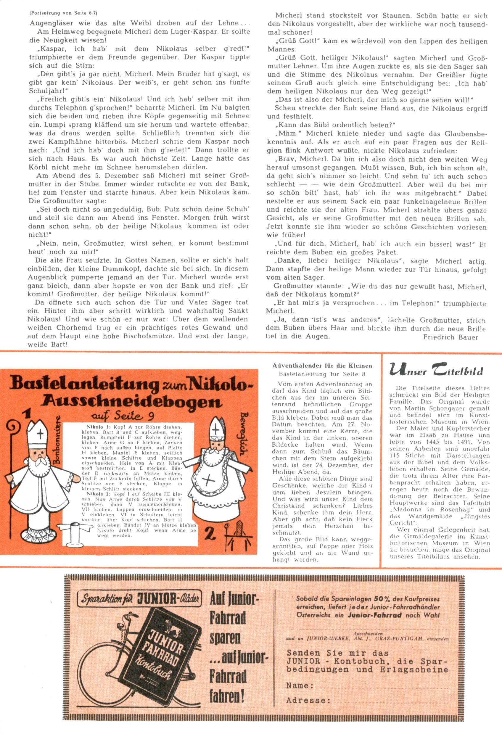 Die Wunderwelt im Festtagsgewand In den Sonderheften präsentierte sich die Wunderwelt wahrhaftig in Feiertagsstimmung. Mit wenigen Ausnahmen gab es pro Jahr drei Sonderhefte - zu Weihnachten bzw. im Advent, zu Ostern und in den Ferien im Sommer. Experimente mit Faschings- und Muttertagsheften hatten sich nicht bewährt. Selbst als es die Einzelhefte in der Krisensituation nach 1967 nicht mehr gab, wurde die Wunderwelt-Zeitung im Layout der Sonderhefte fortgesetzt: Zunächst mit 3 bis 5 und ab 1971 immerhin wieder mit 10-12 Heften pro Jahr. Die Weihnachts-, Oster- und Ferienhefte hatten naturgemäß verschiedene Schwerpunkte. Während im Sommer Spielen und Werken mit Material im Vordergrund stand, waren es zu Weihnachten Krippen und Adventhäuser; zu Ostern dann Erzählungen, Hasenstädte und Oster-Basteleien. Das bessere Papier der Sonderhefte erleichterte das Ausschneiden der insgesamt mehr als 1000 Papiermodelle erheblich. Die Sonderhefte waren vergleichsweise aufwändig gestaltet, aber auch ein wichtiges Zusatzgeschäft für die Zeitung. Die Kinder fieberten dem Erscheinungsdatum der jeweiligen Ausgabe nicht selten richtiggehend entgegen. Mit knapp 100 Seiten pro Jahr machten die Sonderhefte von der Menge her zwar nicht einmal ein Viertel aus, trugen aber zum Erscheinungsbild mindestens genauso viel bei wie die Standardhefte. Im Wesentlichen blieb das Layout der Sonderhefte über die Jahre hin unverändert. Mühselig wurde es, als man den Inhalt der Beiträge vorübergehend auf die Seiten gleichmäßig verteilte und die Kinder ermunterte, die Hefte in der Mitte zu zerschneiden. Die eine Hälfte enthielt dann etwa Erzählungen und Bastelvorschläge, der andere Teil der Zeitung Spielanleitungen. Zur übersichtlichkeit trugen diese Layoutversuche jedenfalls in keiner Weise bei und als besonderen Auswuchs gab es eine Zeitlang auf einer Seite oft mehrere Seitennummern, je nachdem, ob sich diese auf das Gesamtheft oder den herauszunehmenden und zu zerschneidenden Heftteil bezogen. Gegen Ende der 1950er Jahre kehrte man wieder zu einem ganzseitigen Layout zurück und Ideen wie ein Spiel-(Heft-im-)Heft gehörten der Vergangenheit an. In den Sonderheften experimentierte man dann noch ab Mitte der 1960er Jahre, als die Verkaufszahlen stark rückläufig waren, mit grundsätzlich neuen Darstellungsformen - weg vom Niedlich-Kitschigen und engagierte neue Grafikerinnen wie Gundi Groh und Hella Soyka. Den erhofften Erfolg brachte dies jedoch nicht mehr. |
