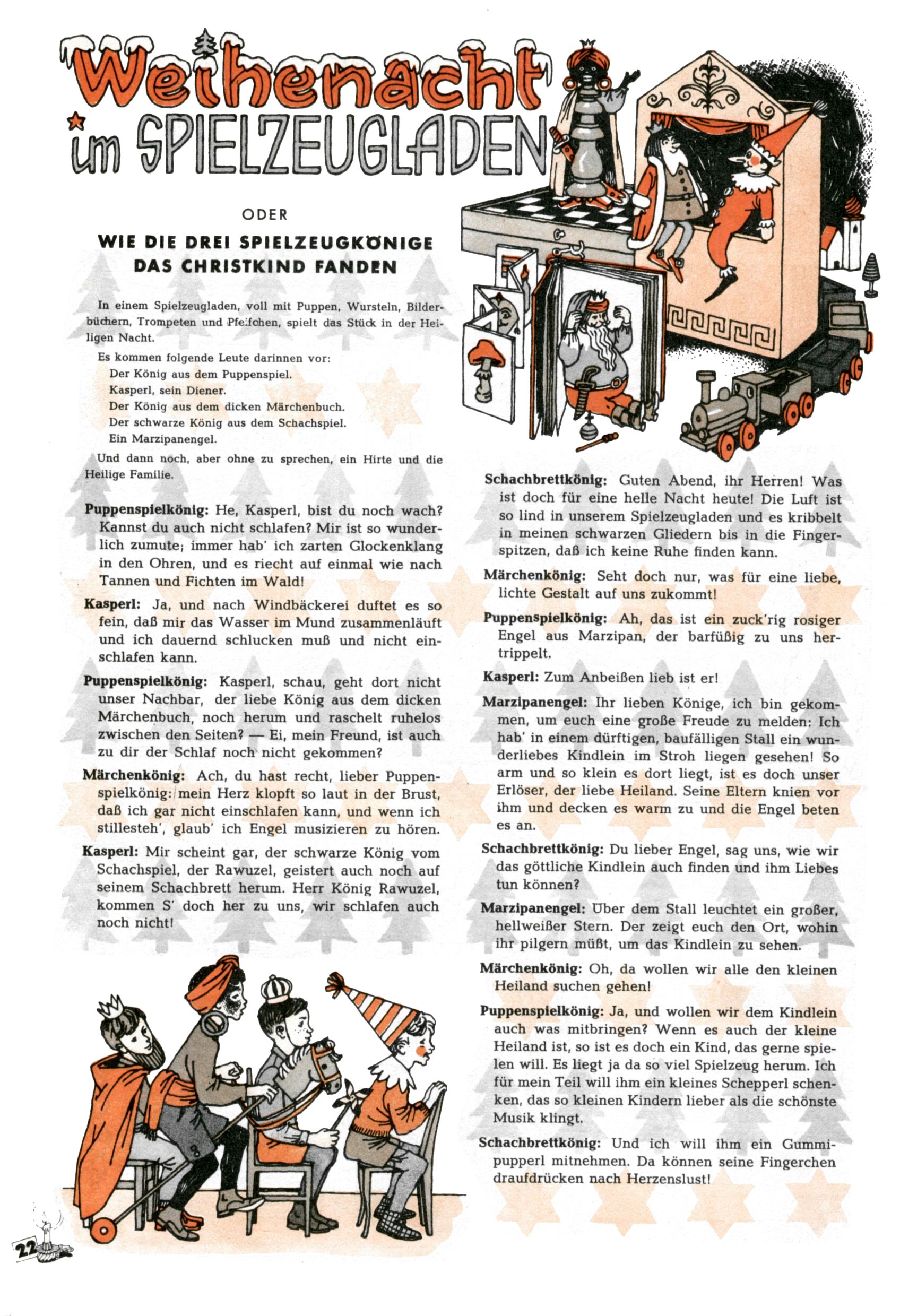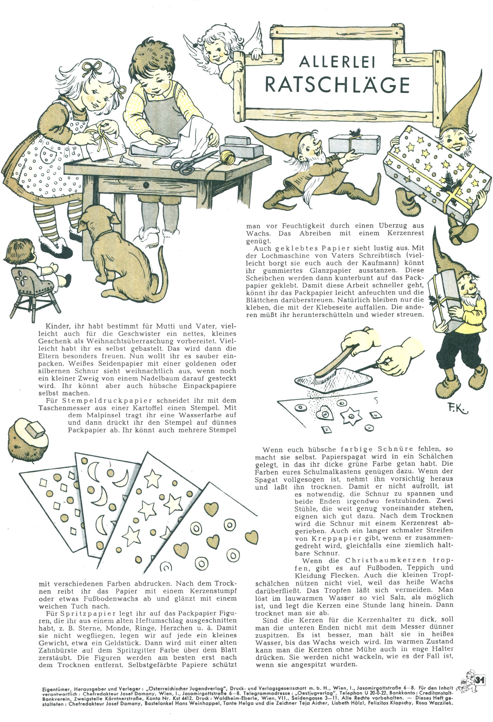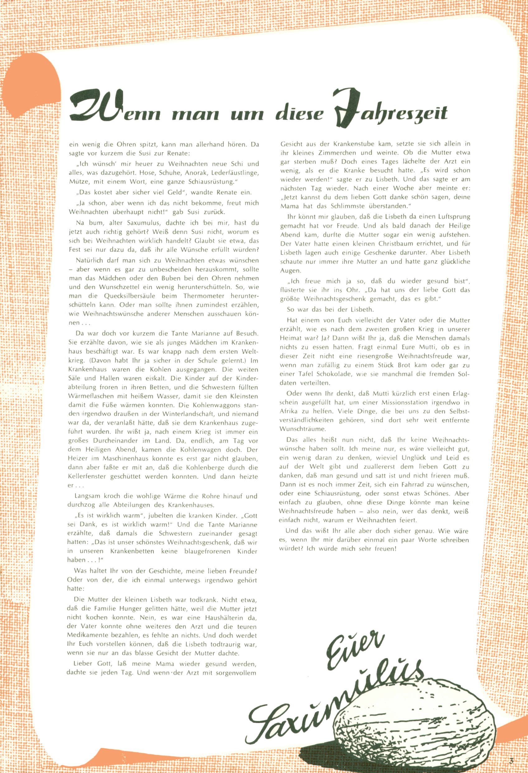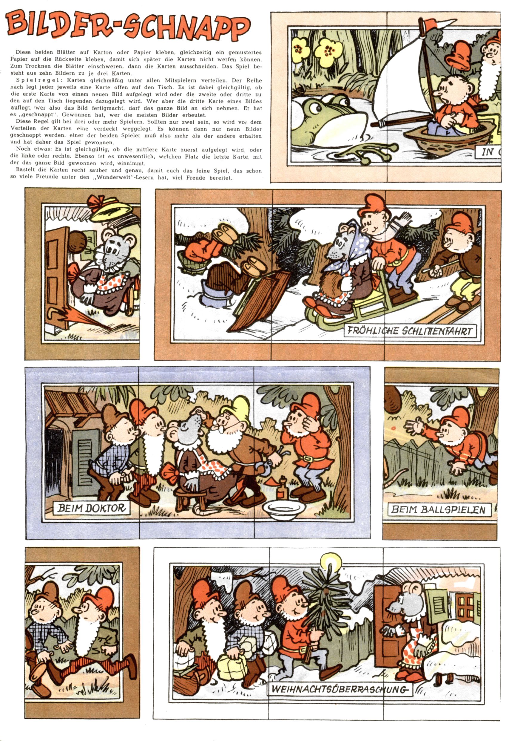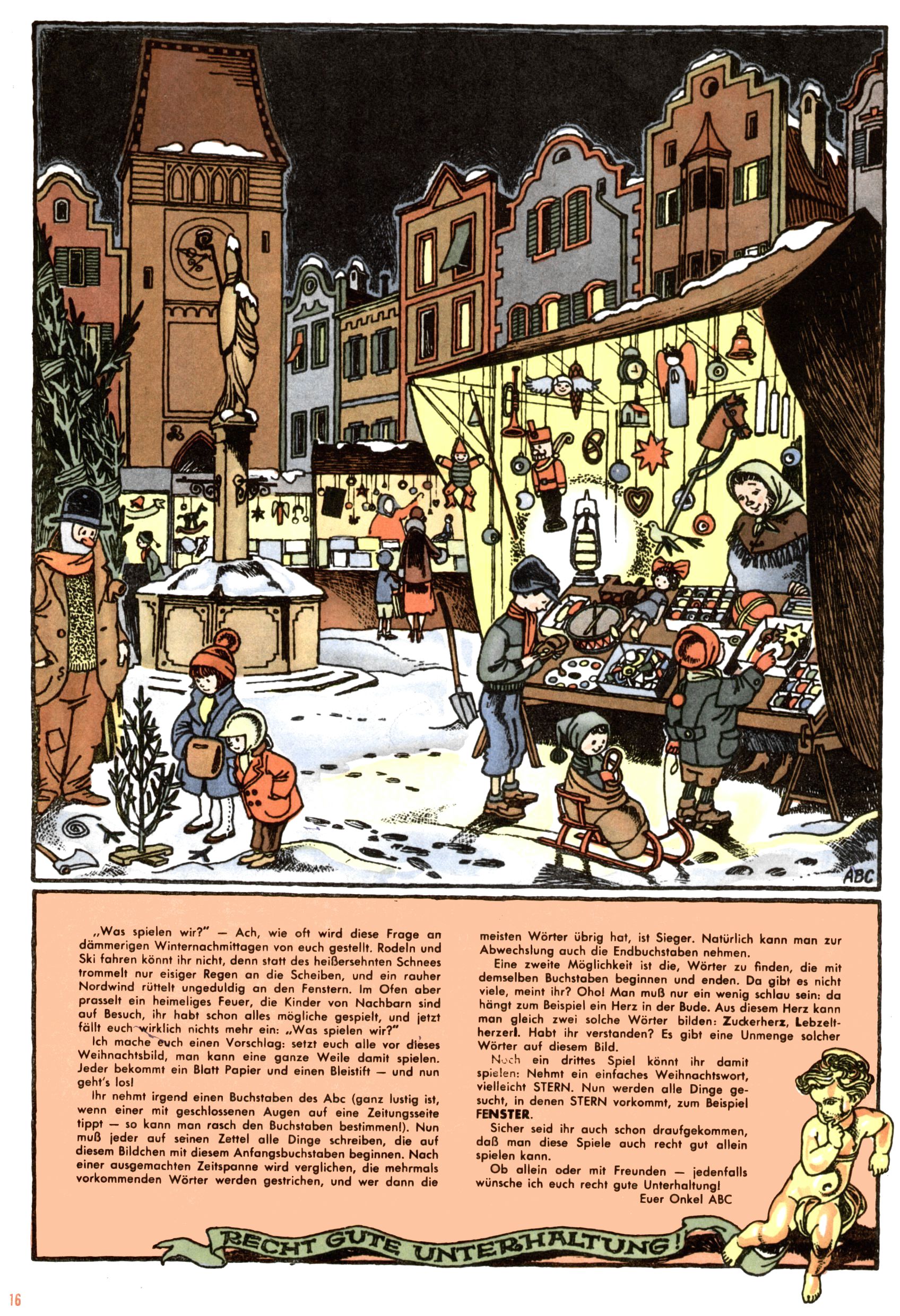 Die Wunderwelt im Festtagsgewand In den Sonderheften präsentierte sich die Wunderwelt wahrhaftig in Feiertagsstimmung. Mit wenigen Ausnahmen gab es pro Jahr drei Sonderhefte - zu Weihnachten bzw. im Advent, zu Ostern und in den Ferien im Sommer. Experimente mit Faschings- und Muttertagsheften hatten sich nicht bewährt. Selbst als es die Einzelhefte in der Krisensituation nach 1967 nicht mehr gab, wurde die Wunderwelt-Zeitung im Layout der Sonderhefte fortgesetzt: Zunächst mit 3 bis 5 und ab 1971 immerhin wieder mit 10-12 Heften pro Jahr. Die Weihnachts-, Oster- und Ferienhefte hatten naturgemäß verschiedene Schwerpunkte. Während im Sommer Spielen und Werken mit Material im Vordergrund stand, waren es zu Weihnachten Krippen und Adventhäuser; zu Ostern dann Erzählungen, Hasenstädte und Oster-Basteleien. Das bessere Papier der Sonderhefte erleichterte das Ausschneiden der insgesamt mehr als 1000 Papiermodelle erheblich. Die Sonderhefte waren vergleichsweise aufwändig gestaltet, aber auch ein wichtiges Zusatzgeschäft für die Zeitung. Die Kinder fieberten dem Erscheinungsdatum der jeweiligen Ausgabe nicht selten richtiggehend entgegen. Mit knapp 100 Seiten pro Jahr machten die Sonderhefte von der Menge her zwar nicht einmal ein Viertel aus, trugen aber zum Erscheinungsbild mindestens genauso viel bei wie die Standardhefte. Im Wesentlichen blieb das Layout der Sonderhefte über die Jahre hin unverändert. Mühselig wurde es, als man den Inhalt der Beiträge vorübergehend auf die Seiten gleichmäßig verteilte und die Kinder ermunterte, die Hefte in der Mitte zu zerschneiden. Die eine Hälfte enthielt dann etwa Erzählungen und Bastelvorschläge, der andere Teil der Zeitung Spielanleitungen. Zur übersichtlichkeit trugen diese Layoutversuche jedenfalls in keiner Weise bei und als besonderen Auswuchs gab es eine Zeitlang auf einer Seite oft mehrere Seitennummern, je nachdem, ob sich diese auf das Gesamtheft oder den herauszunehmenden und zu zerschneidenden Heftteil bezogen. Gegen Ende der 1950er Jahre kehrte man wieder zu einem ganzseitigen Layout zurück und Ideen wie ein Spiel-(Heft-im-)Heft gehörten der Vergangenheit an. In den Sonderheften experimentierte man dann noch ab Mitte der 1960er Jahre, als die Verkaufszahlen stark rückläufig waren, mit grundsätzlich neuen Darstellungsformen - weg vom Niedlich-Kitschigen und engagierte neue Grafikerinnen wie Gundi Groh und Hella Soyka. Den erhofften Erfolg brachte dies jedoch nicht mehr. |