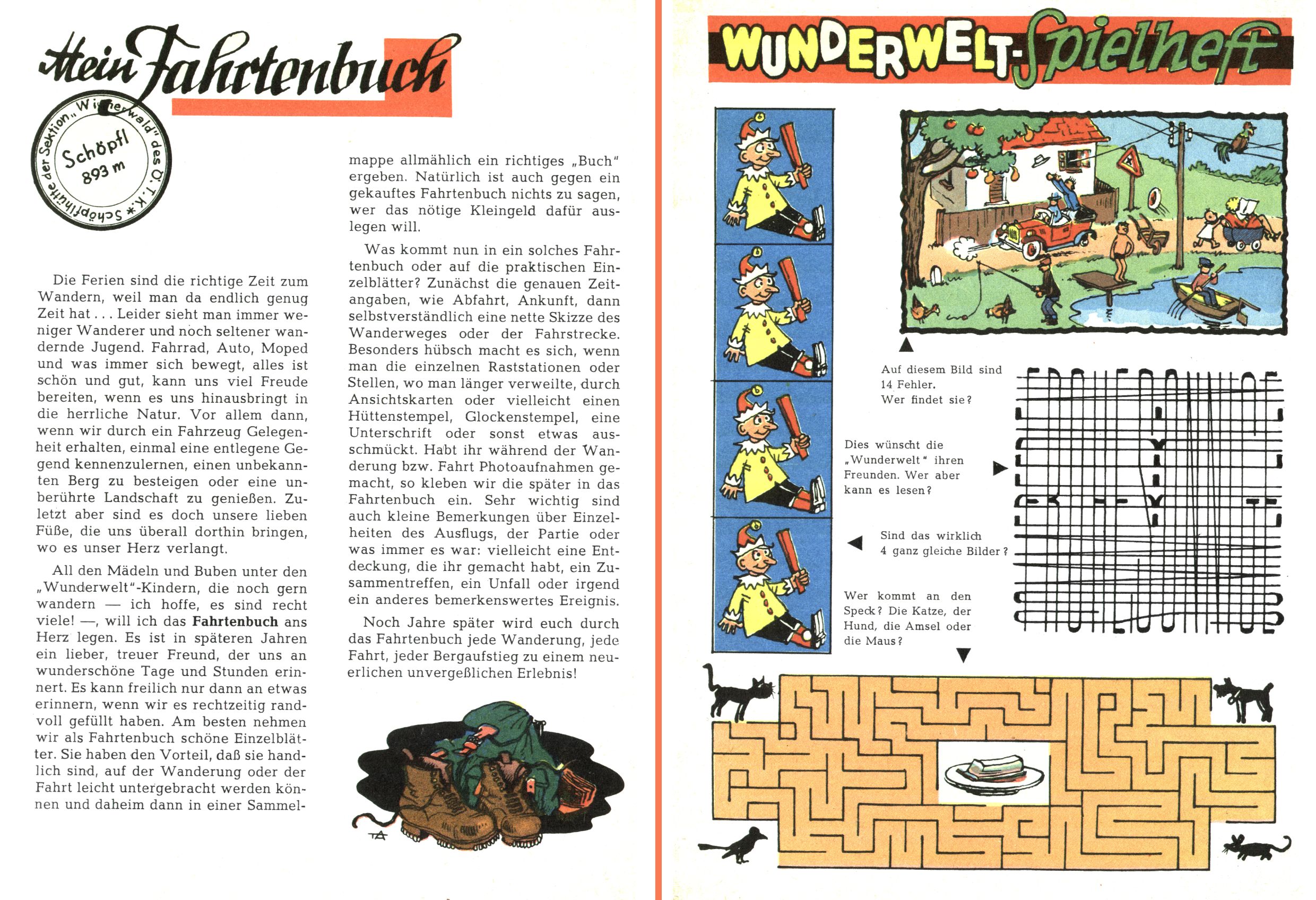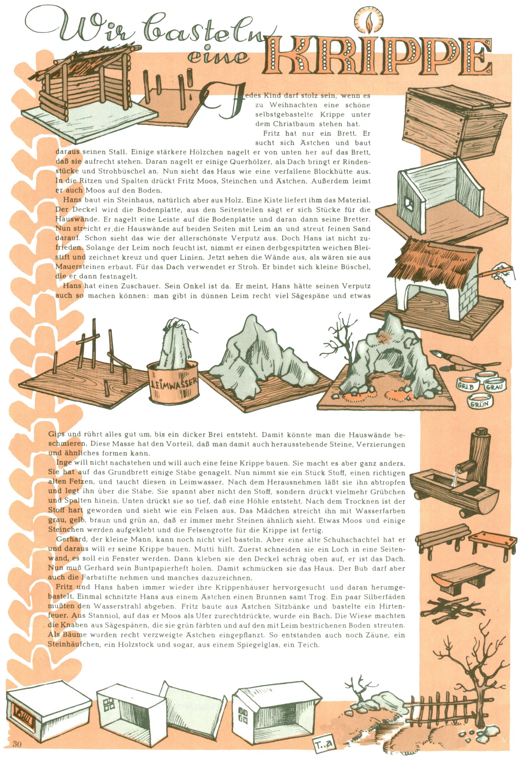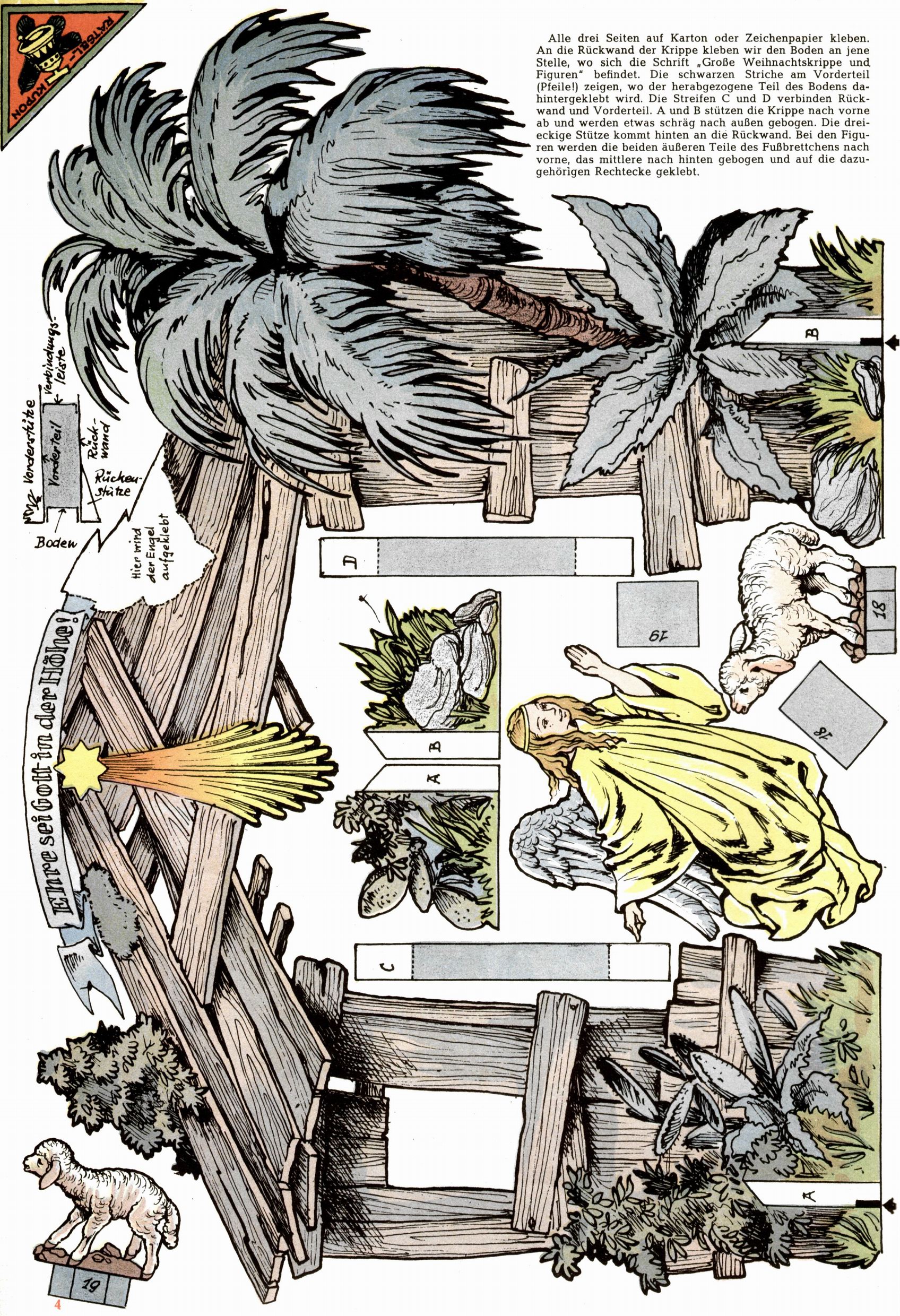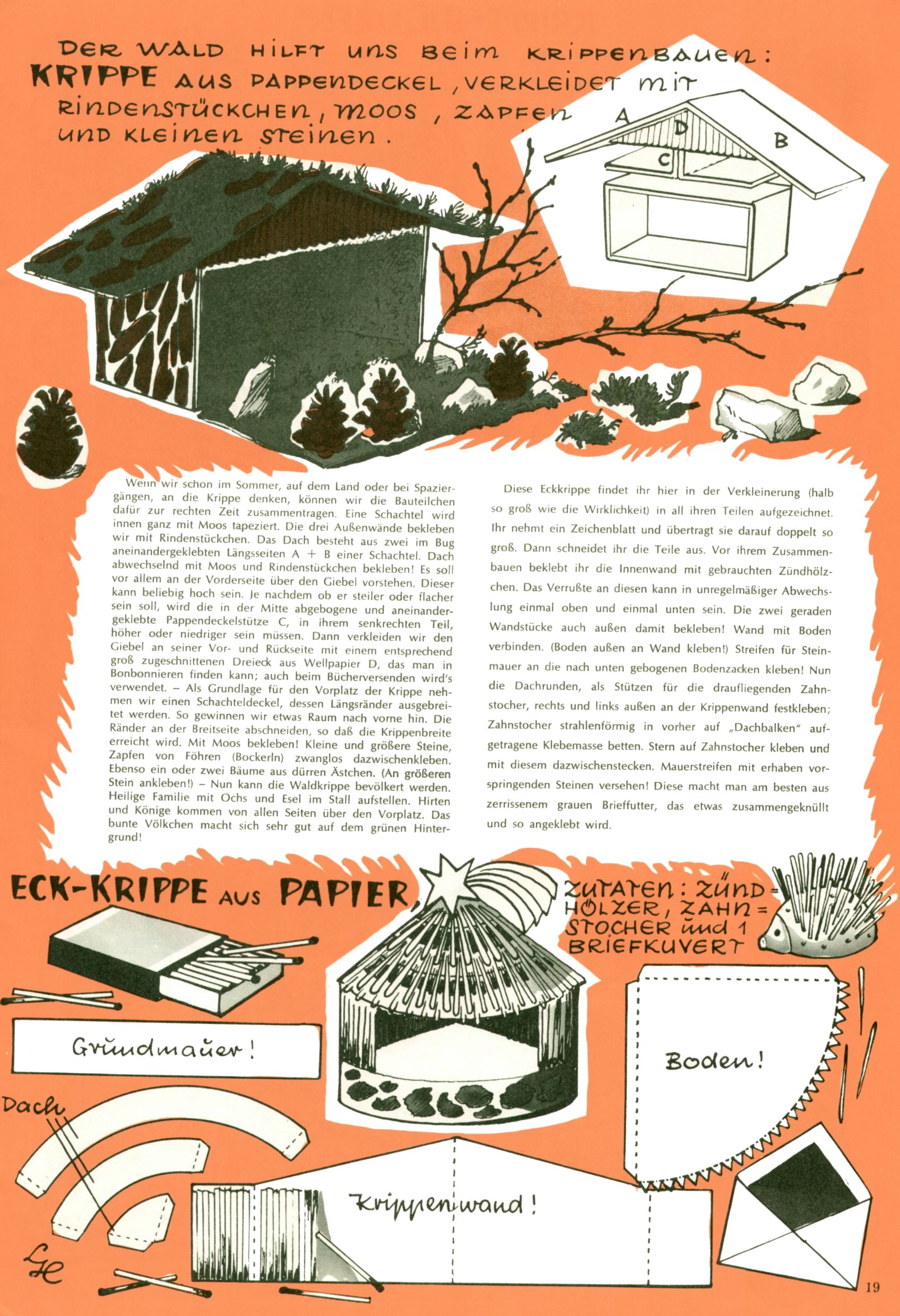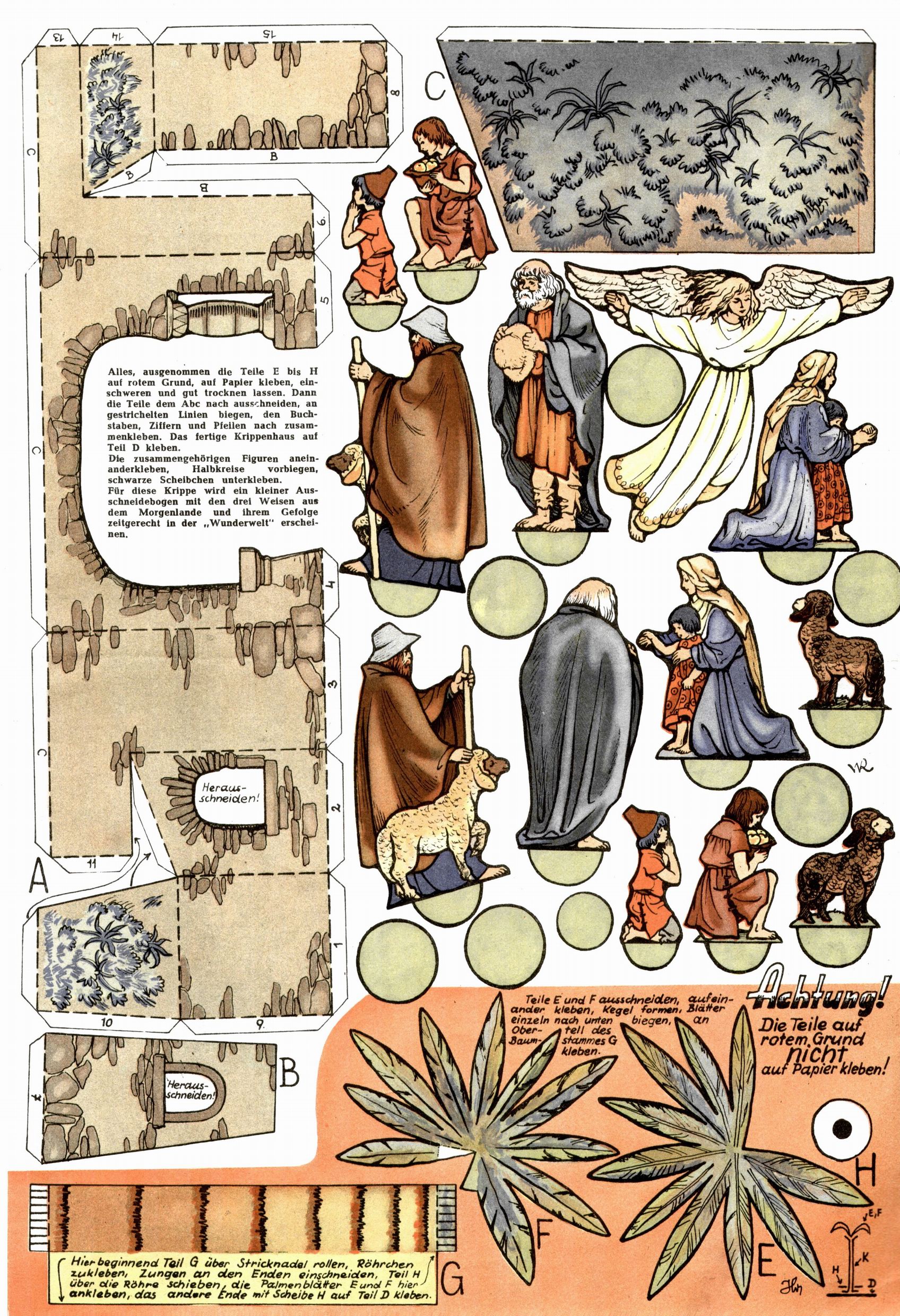 Die Wunderwelt im Festtagsgewand In den Sonderheften präsentierte sich die Wunderwelt wahrhaftig in Feiertagsstimmung. Mit wenigen Ausnahmen gab es pro Jahr drei Sonderhefte - zu Weihnachten bzw. im Advent, zu Ostern und in den Ferien im Sommer. Experimente mit Faschings- und Muttertagsheften hatten sich nicht bewährt. Selbst als es die Einzelhefte in der Krisensituation nach 1967 nicht mehr gab, wurde die Wunderwelt-Zeitung im Layout der Sonderhefte fortgesetzt: Zunächst mit 3 bis 5 und ab 1971 immerhin wieder mit 10-12 Heften pro Jahr. Die Weihnachts-, Oster- und Ferienhefte hatten naturgemäß verschiedene Schwerpunkte. Während im Sommer Spielen und Werken mit Material im Vordergrund stand, waren es zu Weihnachten Krippen und Adventhäuser; zu Ostern dann Erzählungen, Hasenstädte und Oster-Basteleien. Das bessere Papier der Sonderhefte erleichterte das Ausschneiden der insgesamt mehr als 1000 Papiermodelle erheblich. Die Sonderhefte waren vergleichsweise aufwändig gestaltet, aber auch ein wichtiges Zusatzgeschäft für die Zeitung. Die Kinder fieberten dem Erscheinungsdatum der jeweiligen Ausgabe nicht selten richtiggehend entgegen. Mit knapp 100 Seiten pro Jahr machten die Sonderhefte von der Menge her zwar nicht einmal ein Viertel aus, trugen aber zum Erscheinungsbild mindestens genauso viel bei wie die Standardhefte. Im Wesentlichen blieb das Layout der Sonderhefte über die Jahre hin unverändert. Mühselig wurde es, als man den Inhalt der Beiträge vorübergehend auf die Seiten gleichmäßig verteilte und die Kinder ermunterte, die Hefte in der Mitte zu zerschneiden. Die eine Hälfte enthielt dann etwa Erzählungen und Bastelvorschläge, der andere Teil der Zeitung Spielanleitungen. Zur übersichtlichkeit trugen diese Layoutversuche jedenfalls in keiner Weise bei und als besonderen Auswuchs gab es eine Zeitlang auf einer Seite oft mehrere Seitennummern, je nachdem, ob sich diese auf das Gesamtheft oder den herauszunehmenden und zu zerschneidenden Heftteil bezogen. Gegen Ende der 1950er Jahre kehrte man wieder zu einem ganzseitigen Layout zurück und Ideen wie ein Spiel-(Heft-im-)Heft gehörten der Vergangenheit an. In den Sonderheften experimentierte man dann noch ab Mitte der 1960er Jahre, als die Verkaufszahlen stark rückläufig waren, mit grundsätzlich neuen Darstellungsformen - weg vom Niedlich-Kitschigen und engagierte neue Grafikerinnen wie Gundi Groh und Hella Soyka. Den erhofften Erfolg brachte dies jedoch nicht mehr. |