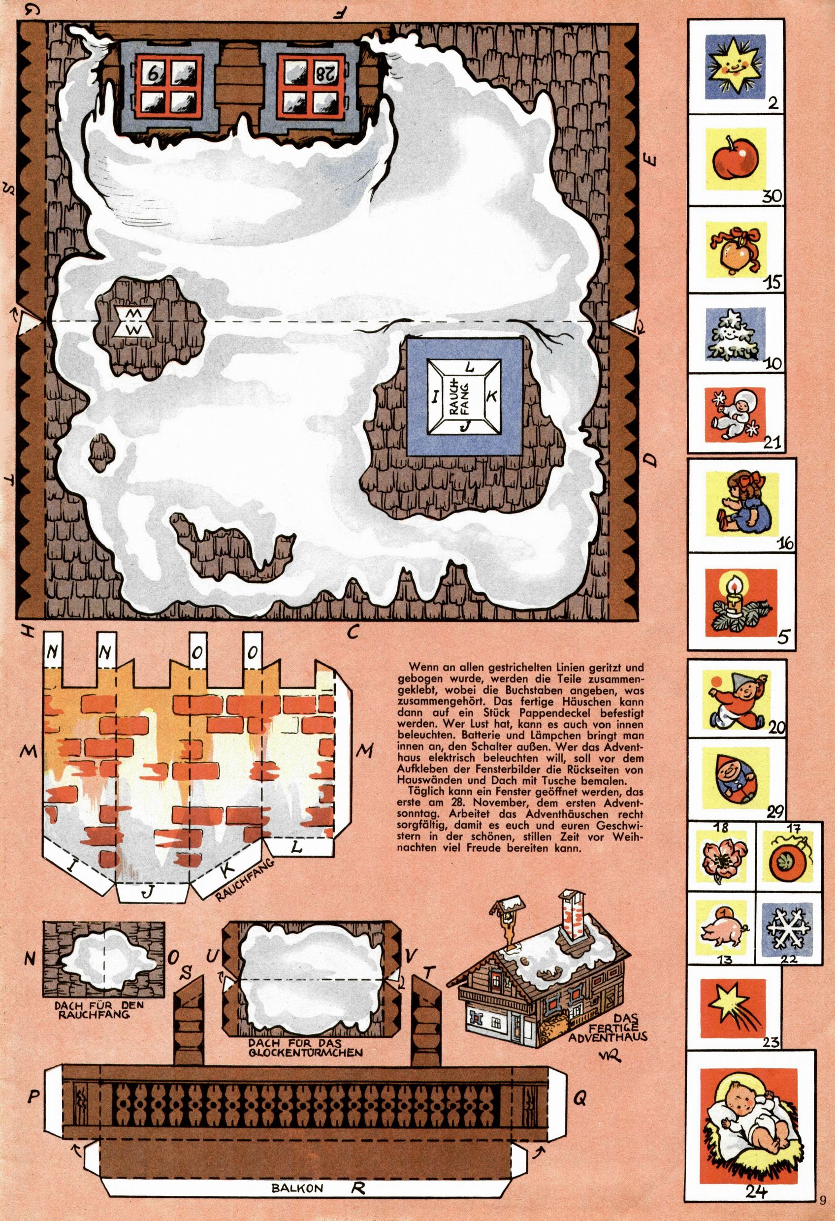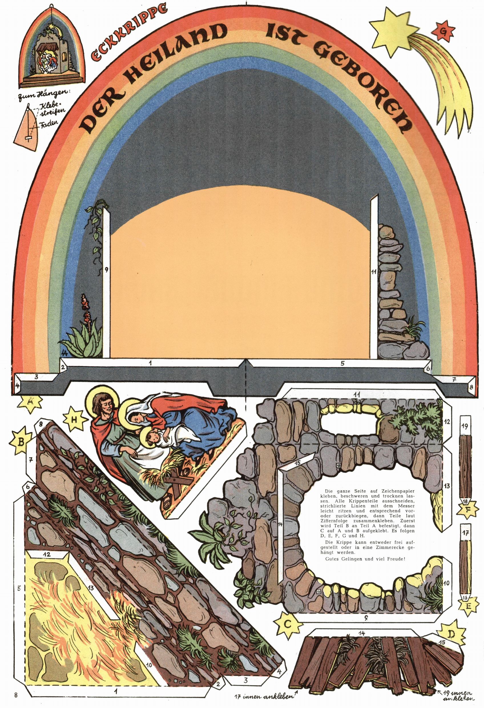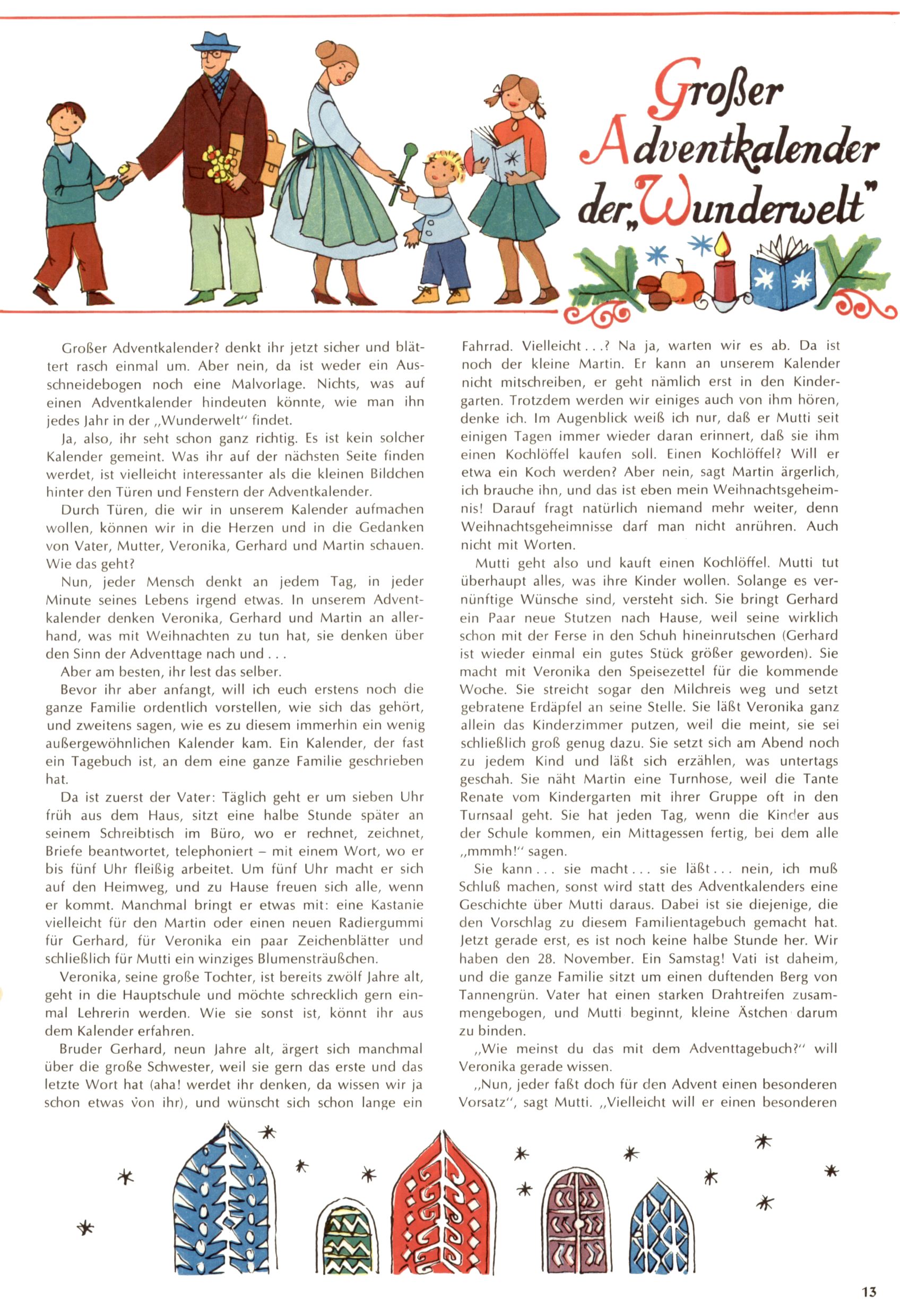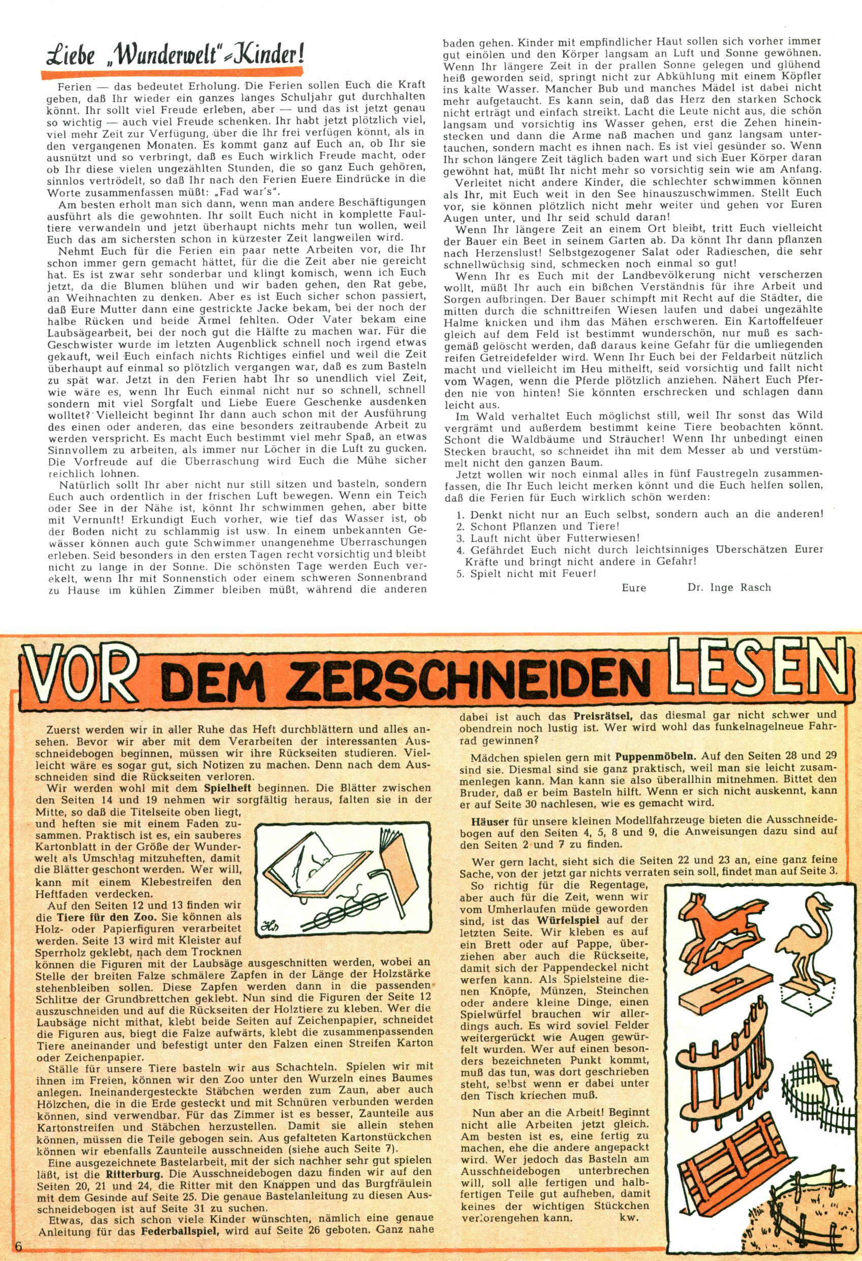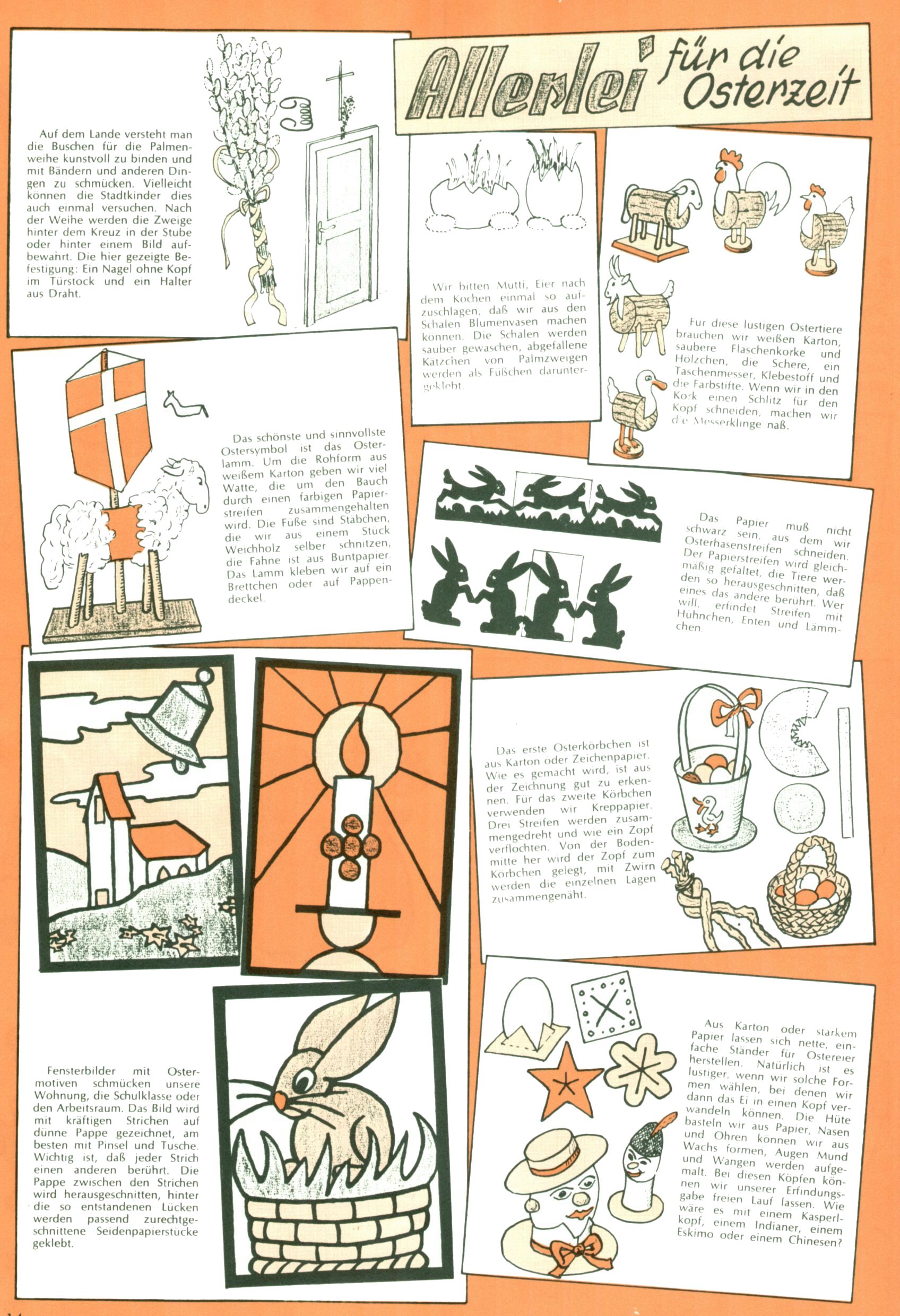 Die Wunderwelt im Festtagsgewand In den Sonderheften präsentierte sich die Wunderwelt wahrhaftig in Feiertagsstimmung. Mit wenigen Ausnahmen gab es pro Jahr drei Sonderhefte - zu Weihnachten bzw. im Advent, zu Ostern und in den Ferien im Sommer. Experimente mit Faschings- und Muttertagsheften hatten sich nicht bewährt. Selbst als es die Einzelhefte in der Krisensituation nach 1967 nicht mehr gab, wurde die Wunderwelt-Zeitung im Layout der Sonderhefte fortgesetzt: Zunächst mit 3 bis 5 und ab 1971 immerhin wieder mit 10-12 Heften pro Jahr. Die Weihnachts-, Oster- und Ferienhefte hatten naturgemäß verschiedene Schwerpunkte. Während im Sommer Spielen und Werken mit Material im Vordergrund stand, waren es zu Weihnachten Krippen und Adventhäuser; zu Ostern dann Erzählungen, Hasenstädte und Oster-Basteleien. Das bessere Papier der Sonderhefte erleichterte das Ausschneiden der insgesamt mehr als 1000 Papiermodelle erheblich. Die Sonderhefte waren vergleichsweise aufwändig gestaltet, aber auch ein wichtiges Zusatzgeschäft für die Zeitung. Die Kinder fieberten dem Erscheinungsdatum der jeweiligen Ausgabe nicht selten richtiggehend entgegen. Mit knapp 100 Seiten pro Jahr machten die Sonderhefte von der Menge her zwar nicht einmal ein Viertel aus, trugen aber zum Erscheinungsbild mindestens genauso viel bei wie die Standardhefte. Im Wesentlichen blieb das Layout der Sonderhefte über die Jahre hin unverändert. Mühselig wurde es, als man den Inhalt der Beiträge vorübergehend auf die Seiten gleichmäßig verteilte und die Kinder ermunterte, die Hefte in der Mitte zu zerschneiden. Die eine Hälfte enthielt dann etwa Erzählungen und Bastelvorschläge, der andere Teil der Zeitung Spielanleitungen. Zur übersichtlichkeit trugen diese Layoutversuche jedenfalls in keiner Weise bei und als besonderen Auswuchs gab es eine Zeitlang auf einer Seite oft mehrere Seitennummern, je nachdem, ob sich diese auf das Gesamtheft oder den herauszunehmenden und zu zerschneidenden Heftteil bezogen. Gegen Ende der 1950er Jahre kehrte man wieder zu einem ganzseitigen Layout zurück und Ideen wie ein Spiel-(Heft-im-)Heft gehörten der Vergangenheit an. In den Sonderheften experimentierte man dann noch ab Mitte der 1960er Jahre, als die Verkaufszahlen stark rückläufig waren, mit grundsätzlich neuen Darstellungsformen - weg vom Niedlich-Kitschigen und engagierte neue Grafikerinnen wie Gundi Groh und Hella Soyka. Den erhofften Erfolg brachte dies jedoch nicht mehr. |