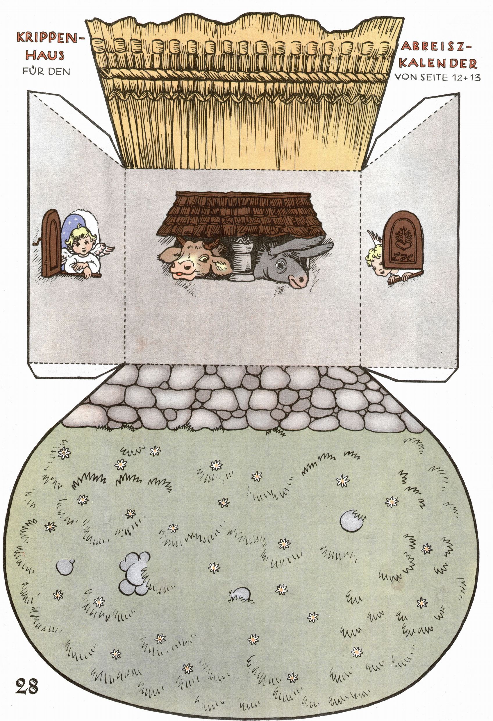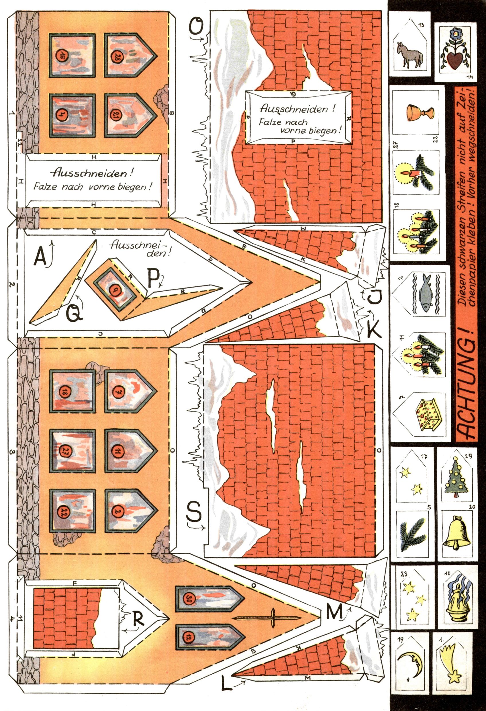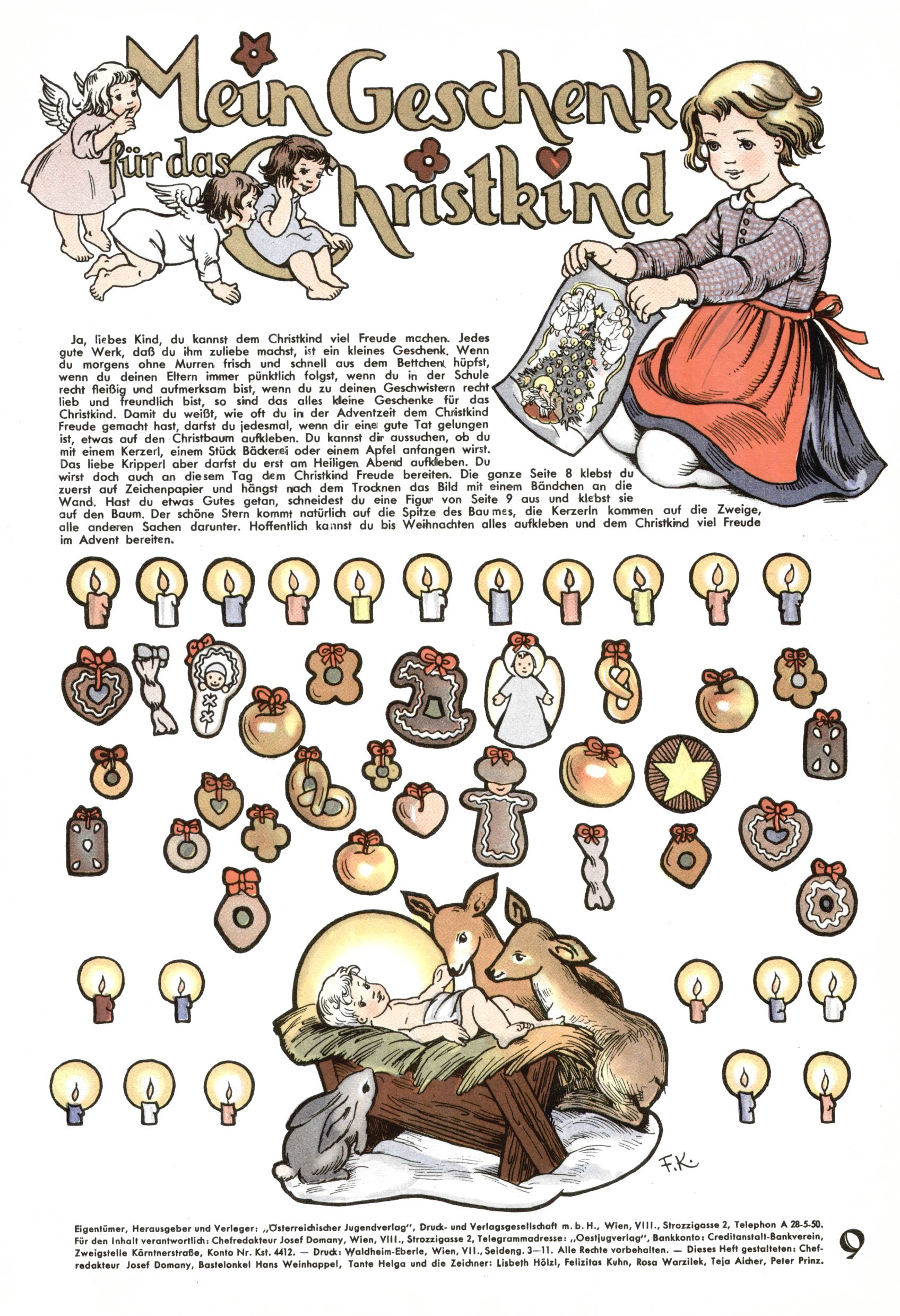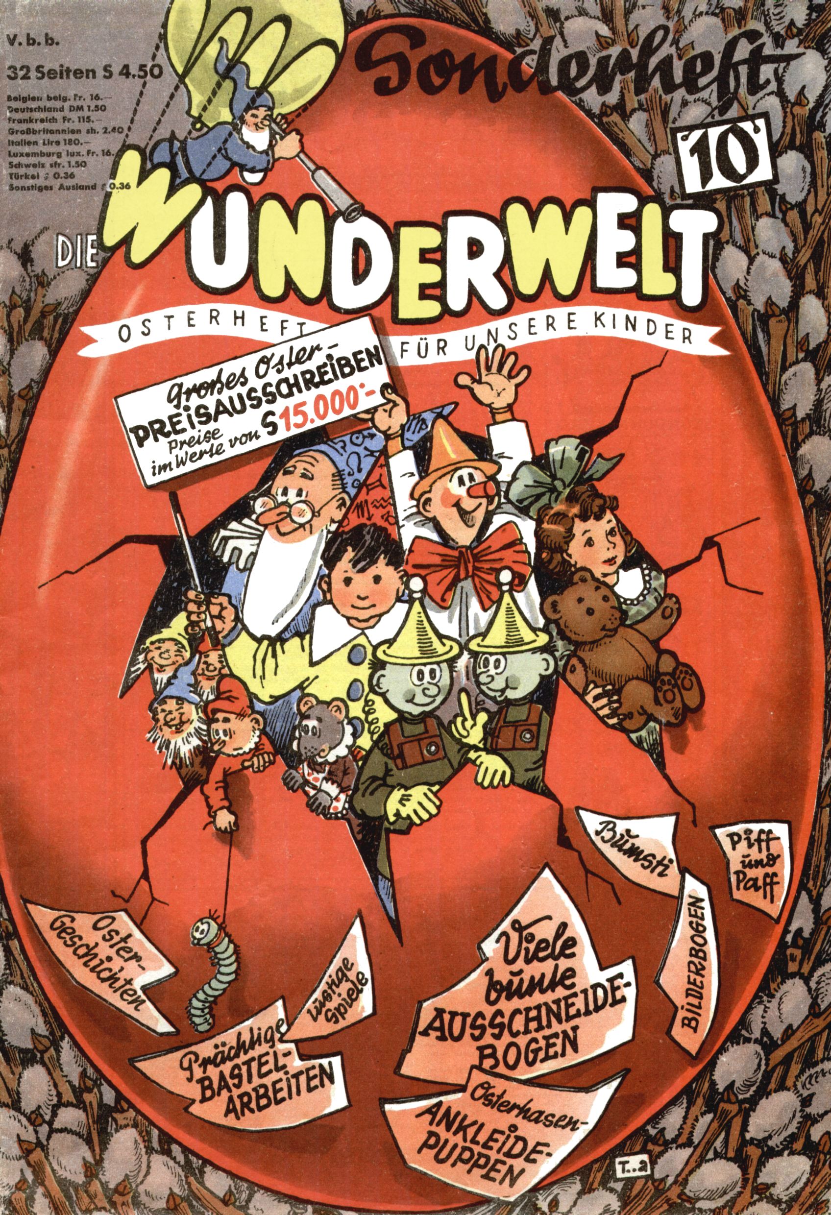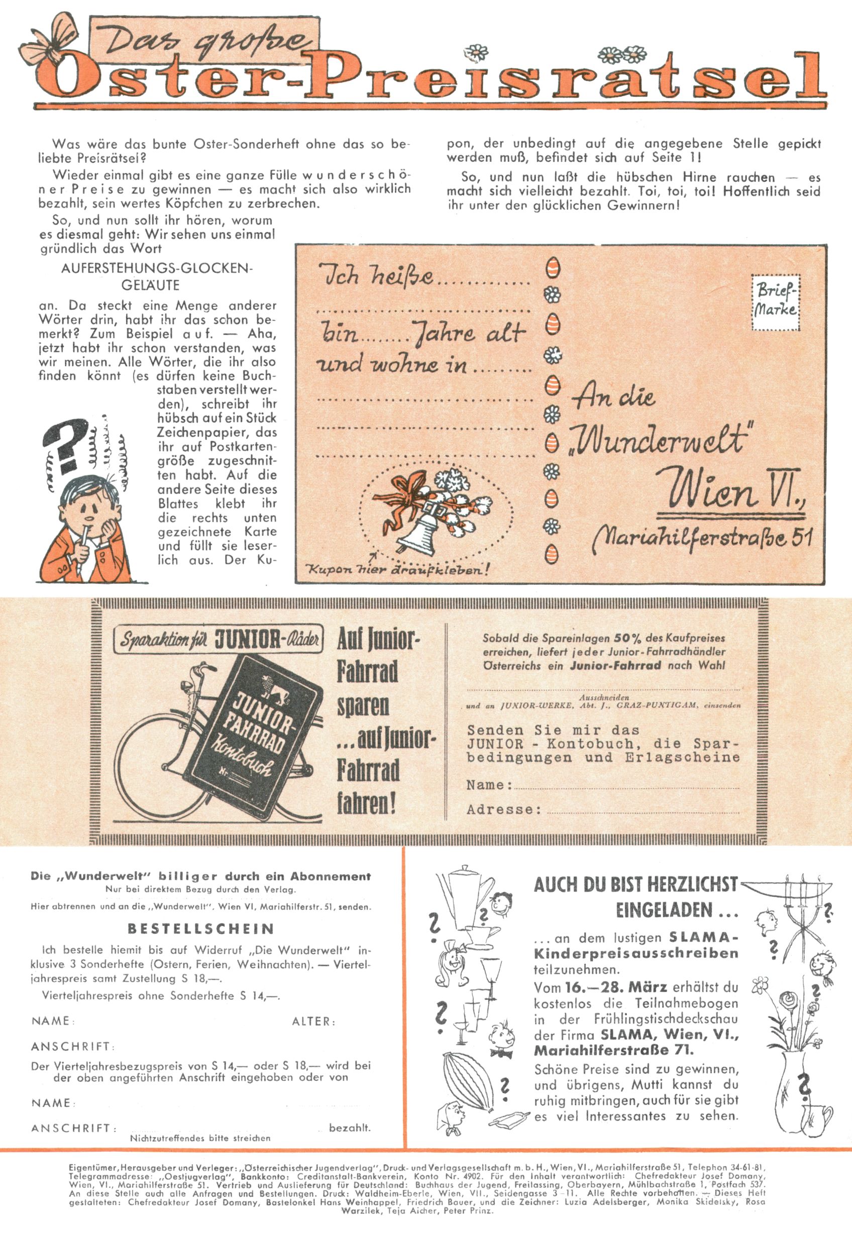 Die Wunderwelt im Festtagsgewand In den Sonderheften präsentierte sich die Wunderwelt wahrhaftig in Feiertagsstimmung. Mit wenigen Ausnahmen gab es pro Jahr drei Sonderhefte - zu Weihnachten bzw. im Advent, zu Ostern und in den Ferien im Sommer. Experimente mit Faschings- und Muttertagsheften hatten sich nicht bewährt. Selbst als es die Einzelhefte in der Krisensituation nach 1967 nicht mehr gab, wurde die Wunderwelt-Zeitung im Layout der Sonderhefte fortgesetzt: Zunächst mit 3 bis 5 und ab 1971 immerhin wieder mit 10-12 Heften pro Jahr. Die Weihnachts-, Oster- und Ferienhefte hatten naturgemäß verschiedene Schwerpunkte. Während im Sommer Spielen und Werken mit Material im Vordergrund stand, waren es zu Weihnachten Krippen und Adventhäuser; zu Ostern dann Erzählungen, Hasenstädte und Oster-Basteleien. Das bessere Papier der Sonderhefte erleichterte das Ausschneiden der insgesamt mehr als 1000 Papiermodelle erheblich. Die Sonderhefte waren vergleichsweise aufwändig gestaltet, aber auch ein wichtiges Zusatzgeschäft für die Zeitung. Die Kinder fieberten dem Erscheinungsdatum der jeweiligen Ausgabe nicht selten richtiggehend entgegen. Mit knapp 100 Seiten pro Jahr machten die Sonderhefte von der Menge her zwar nicht einmal ein Viertel aus, trugen aber zum Erscheinungsbild mindestens genauso viel bei wie die Standardhefte. Im Wesentlichen blieb das Layout der Sonderhefte über die Jahre hin unverändert. Mühselig wurde es, als man den Inhalt der Beiträge vorübergehend auf die Seiten gleichmäßig verteilte und die Kinder ermunterte, die Hefte in der Mitte zu zerschneiden. Die eine Hälfte enthielt dann etwa Erzählungen und Bastelvorschläge, der andere Teil der Zeitung Spielanleitungen. Zur übersichtlichkeit trugen diese Layoutversuche jedenfalls in keiner Weise bei und als besonderen Auswuchs gab es eine Zeitlang auf einer Seite oft mehrere Seitennummern, je nachdem, ob sich diese auf das Gesamtheft oder den herauszunehmenden und zu zerschneidenden Heftteil bezogen. Gegen Ende der 1950er Jahre kehrte man wieder zu einem ganzseitigen Layout zurück und Ideen wie ein Spiel-(Heft-im-)Heft gehörten der Vergangenheit an. In den Sonderheften experimentierte man dann noch ab Mitte der 1960er Jahre, als die Verkaufszahlen stark rückläufig waren, mit grundsätzlich neuen Darstellungsformen - weg vom Niedlich-Kitschigen und engagierte neue Grafikerinnen wie Gundi Groh und Hella Soyka. Den erhofften Erfolg brachte dies jedoch nicht mehr. |