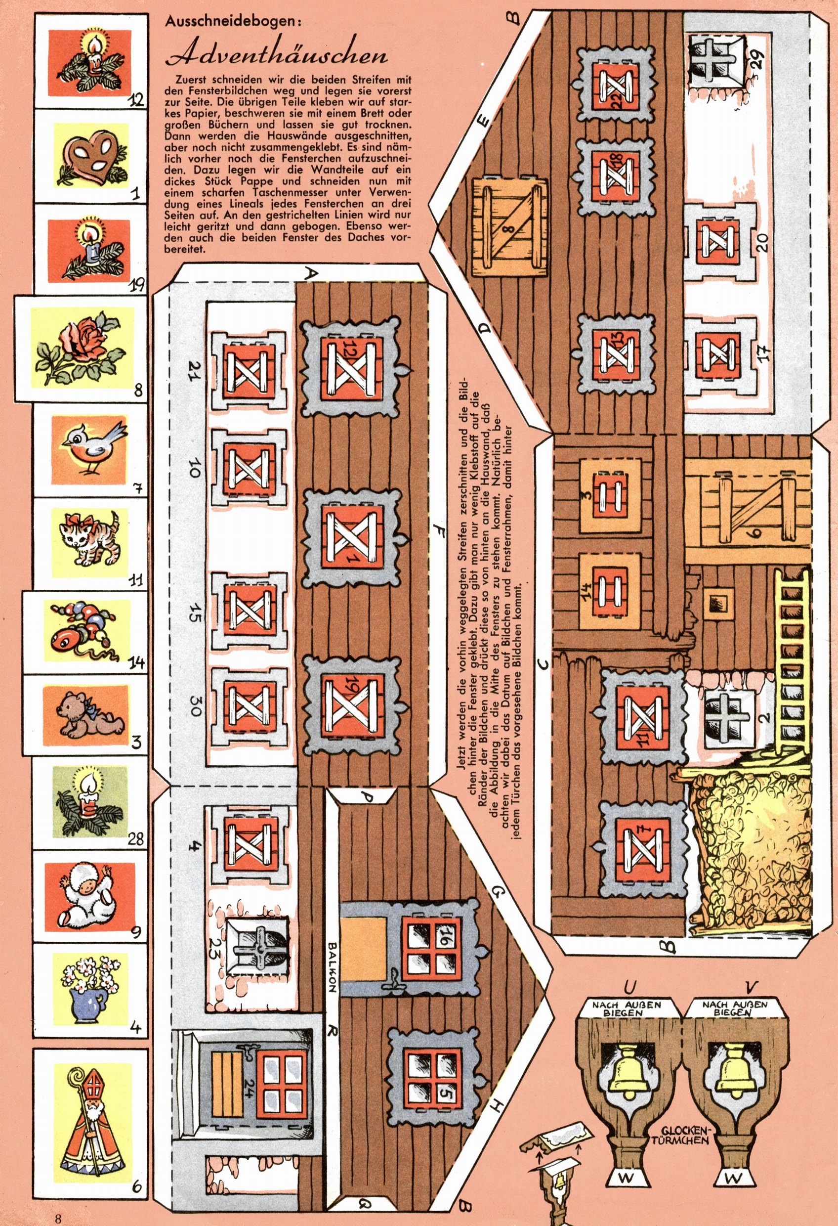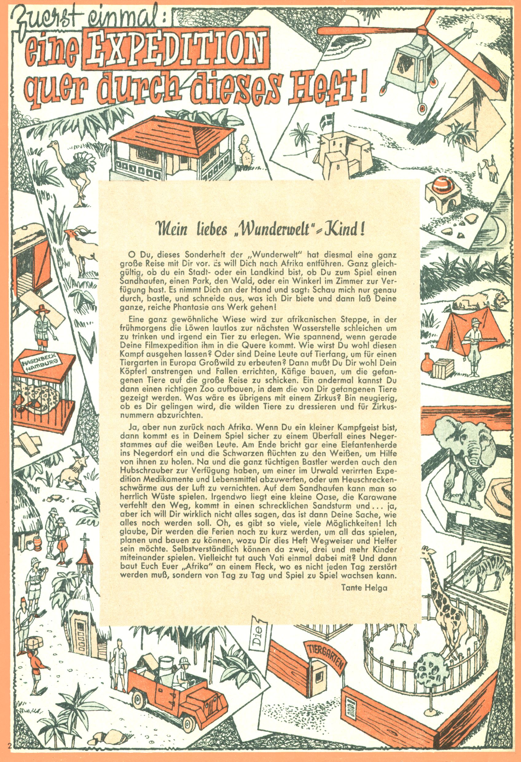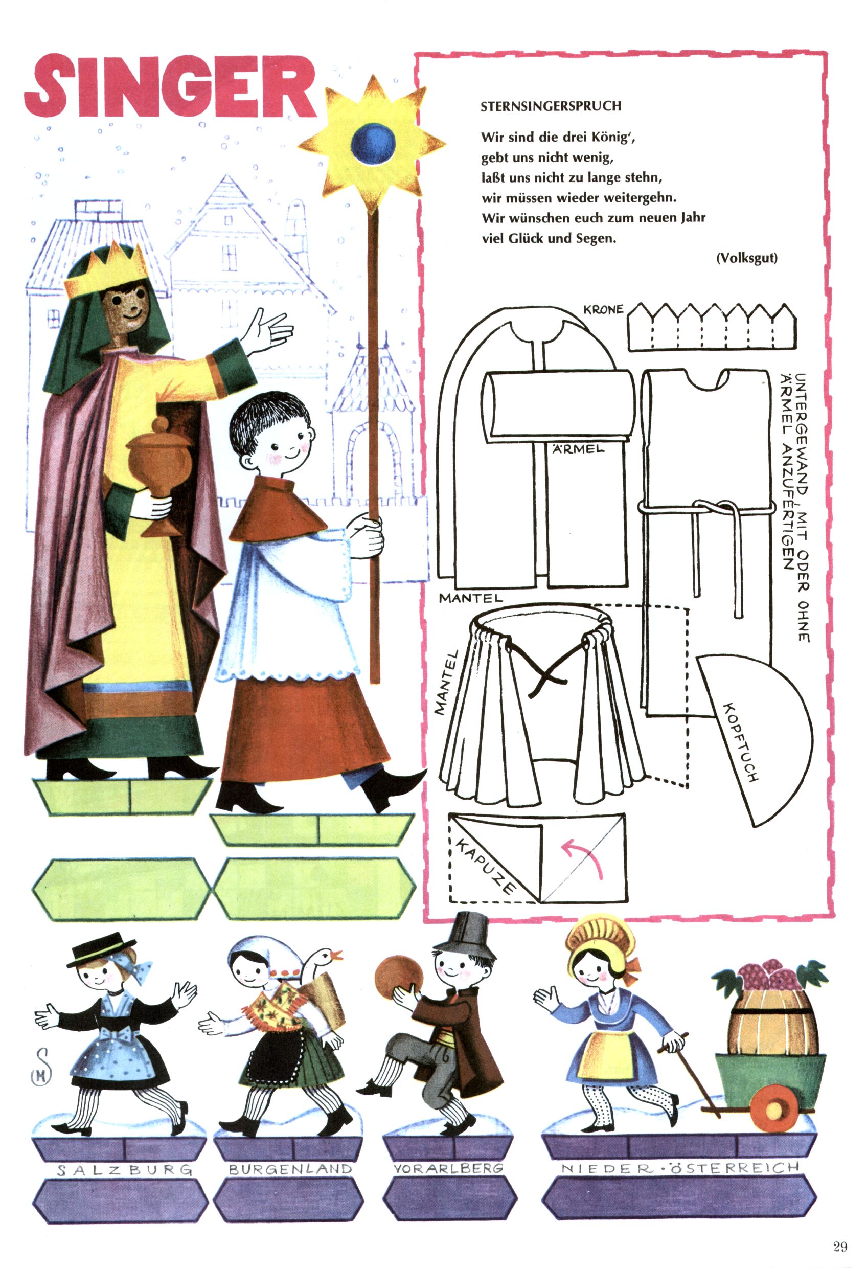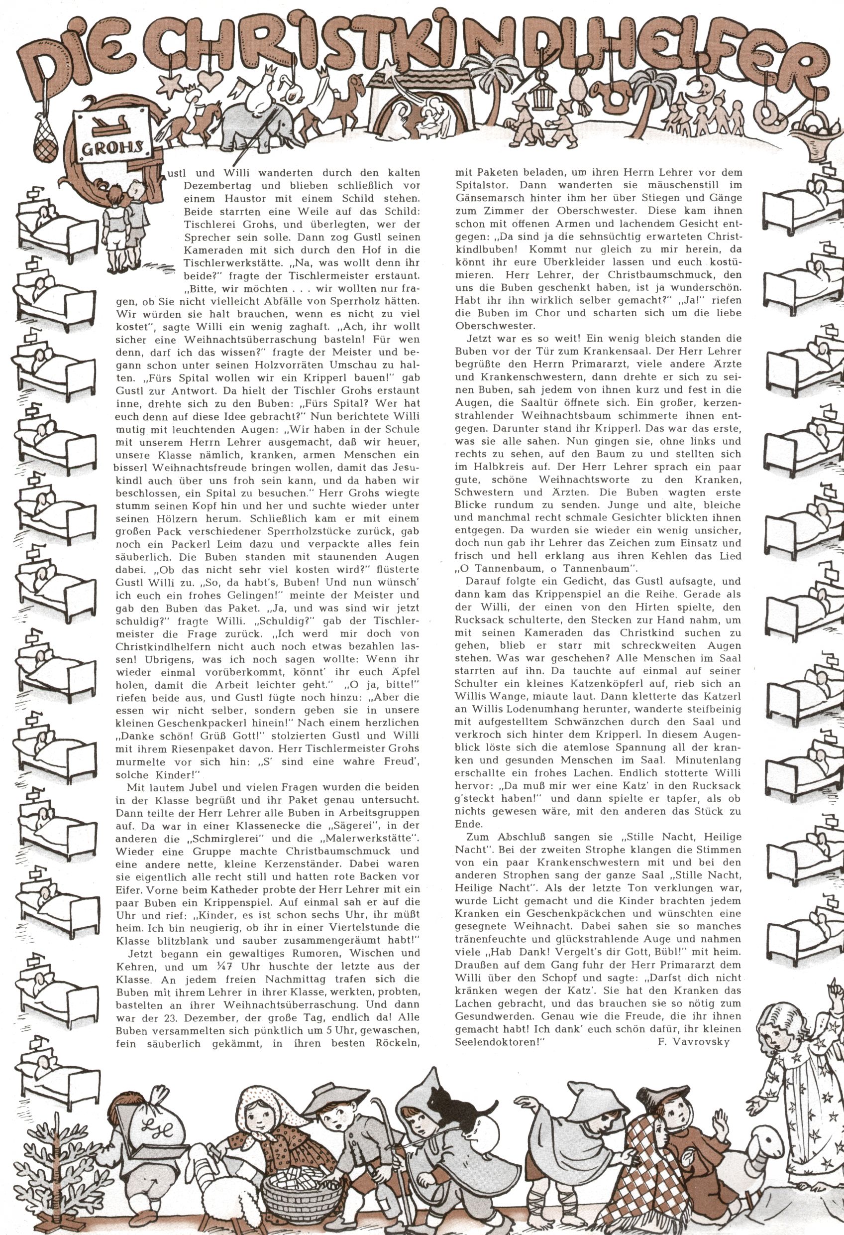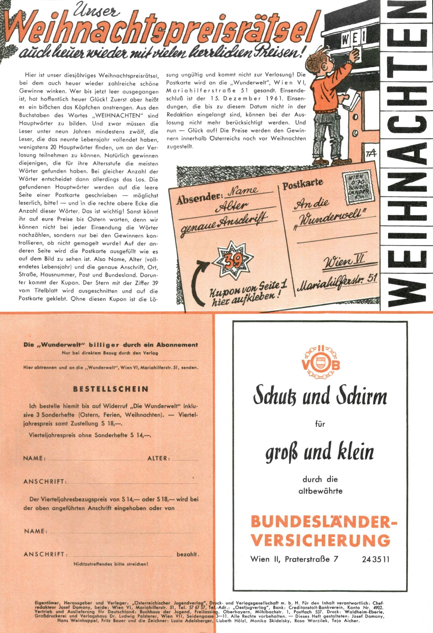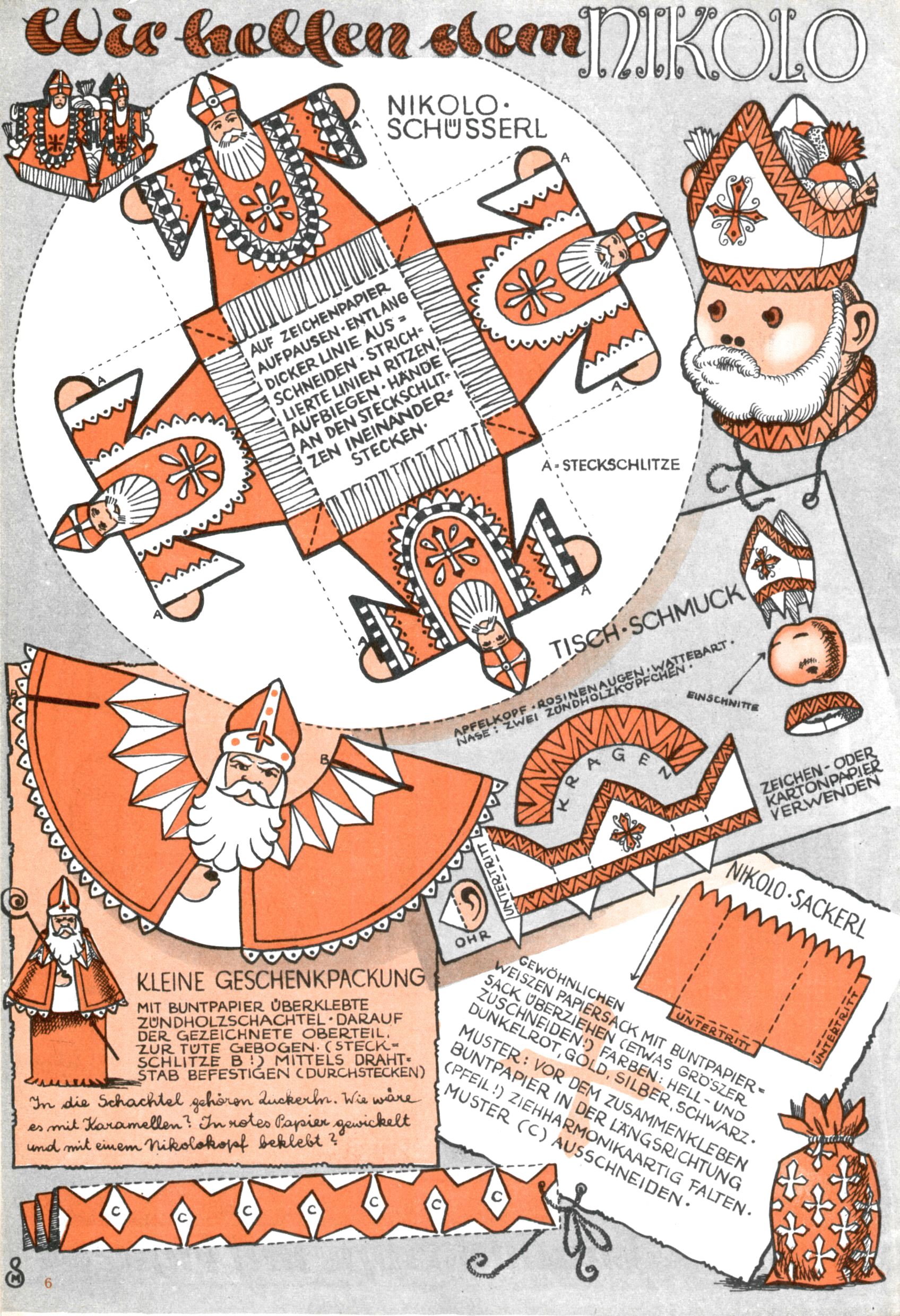Die Wunderwelt im Festtagsgewand In den Sonderheften präsentierte sich die Wunderwelt wahrhaftig in Feiertagsstimmung. Mit wenigen Ausnahmen gab es pro Jahr drei Sonderhefte - zu Weihnachten bzw. im Advent, zu Ostern und in den Ferien im Sommer. Experimente mit Faschings- und Muttertagsheften hatten sich nicht bewährt. Selbst als es die Einzelhefte in der Krisensituation nach 1967 nicht mehr gab, wurde die Wunderwelt-Zeitung im Layout der Sonderhefte fortgesetzt: Zunächst mit 3 bis 5 und ab 1971 immerhin wieder mit 10-12 Heften pro Jahr. Die Weihnachts-, Oster- und Ferienhefte hatten naturgemäß verschiedene Schwerpunkte. Während im Sommer Spielen und Werken mit Material im Vordergrund stand, waren es zu Weihnachten Krippen und Adventhäuser; zu Ostern dann Erzählungen, Hasenstädte und Oster-Basteleien. Das bessere Papier der Sonderhefte erleichterte das Ausschneiden der insgesamt mehr als 1000 Papiermodelle erheblich. Die Sonderhefte waren vergleichsweise aufwändig gestaltet, aber auch ein wichtiges Zusatzgeschäft für die Zeitung. Die Kinder fieberten dem Erscheinungsdatum der jeweiligen Ausgabe nicht selten richtiggehend entgegen. Mit knapp 100 Seiten pro Jahr machten die Sonderhefte von der Menge her zwar nicht einmal ein Viertel aus, trugen aber zum Erscheinungsbild mindestens genauso viel bei wie die Standardhefte. Im Wesentlichen blieb das Layout der Sonderhefte über die Jahre hin unverändert. Mühselig wurde es, als man den Inhalt der Beiträge vorübergehend auf die Seiten gleichmäßig verteilte und die Kinder ermunterte, die Hefte in der Mitte zu zerschneiden. Die eine Hälfte enthielt dann etwa Erzählungen und Bastelvorschläge, der andere Teil der Zeitung Spielanleitungen. Zur übersichtlichkeit trugen diese Layoutversuche jedenfalls in keiner Weise bei und als besonderen Auswuchs gab es eine Zeitlang auf einer Seite oft mehrere Seitennummern, je nachdem, ob sich diese auf das Gesamtheft oder den herauszunehmenden und zu zerschneidenden Heftteil bezogen. Gegen Ende der 1950er Jahre kehrte man wieder zu einem ganzseitigen Layout zurück und Ideen wie ein Spiel-(Heft-im-)Heft gehörten der Vergangenheit an. In den Sonderheften experimentierte man dann noch ab Mitte der 1960er Jahre, als die Verkaufszahlen stark rückläufig waren, mit grundsätzlich neuen Darstellungsformen - weg vom Niedlich-Kitschigen und engagierte neue Grafikerinnen wie Gundi Groh und Hella Soyka. Den erhofften Erfolg brachte dies jedoch nicht mehr. |