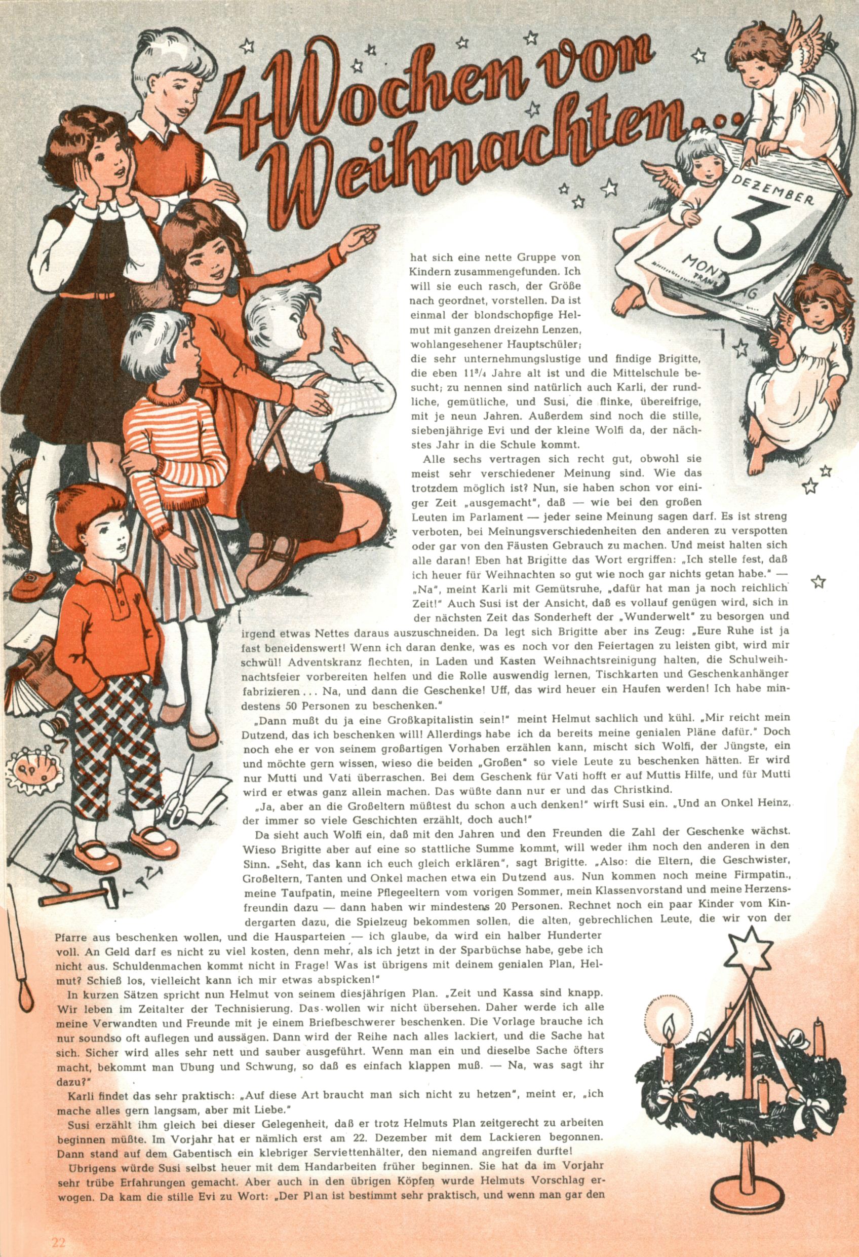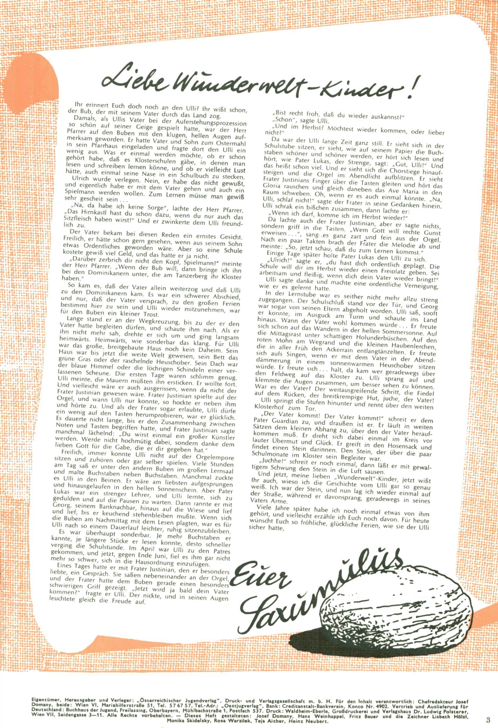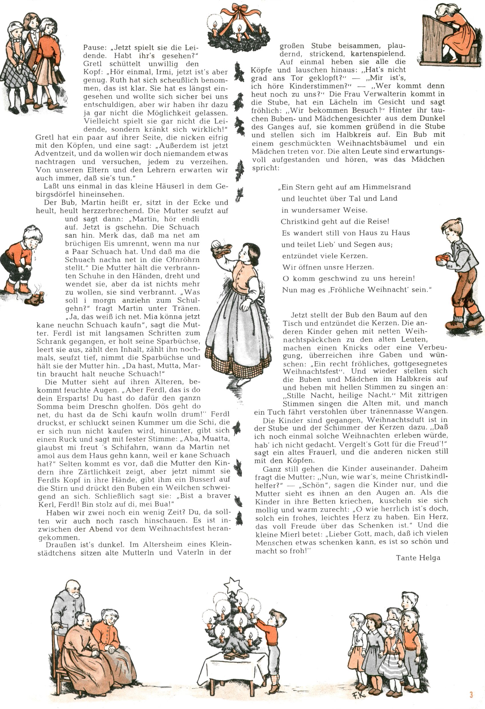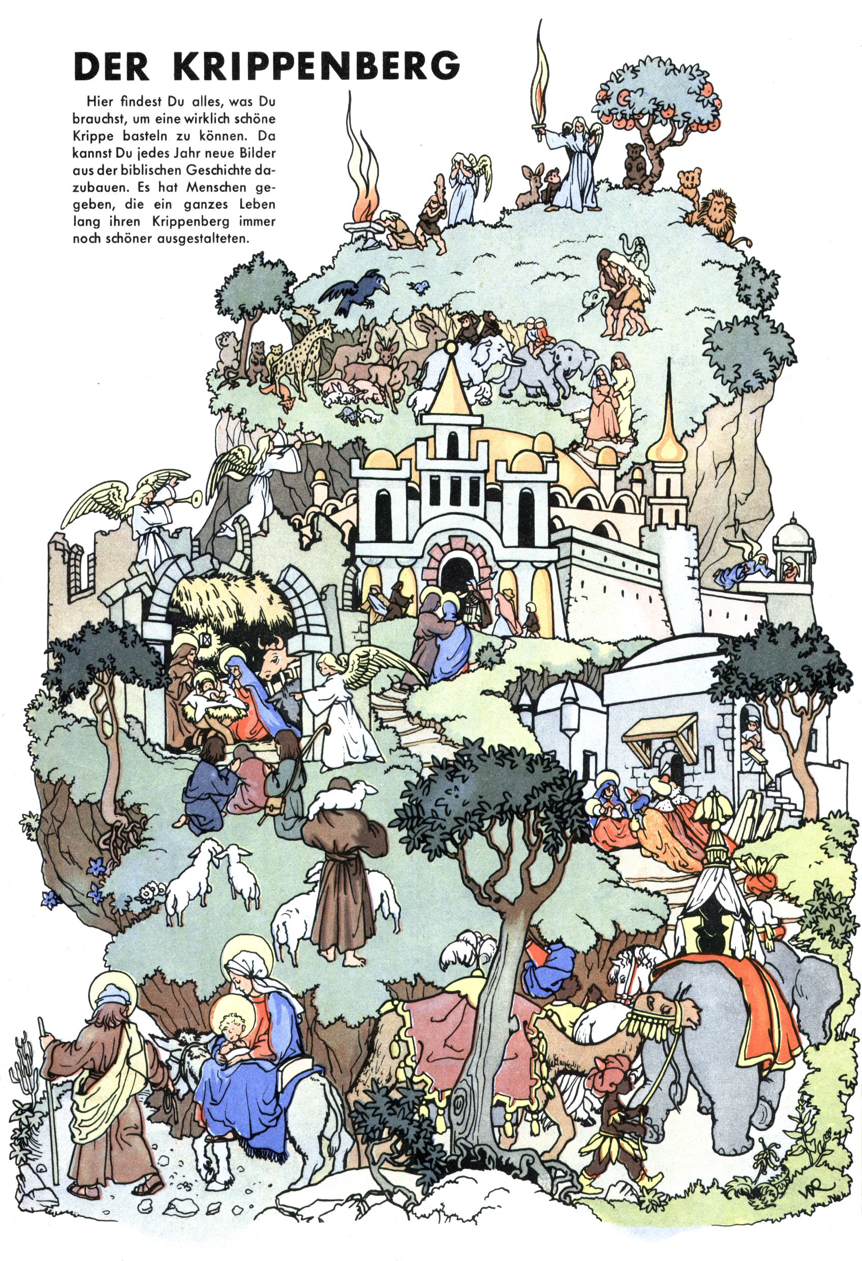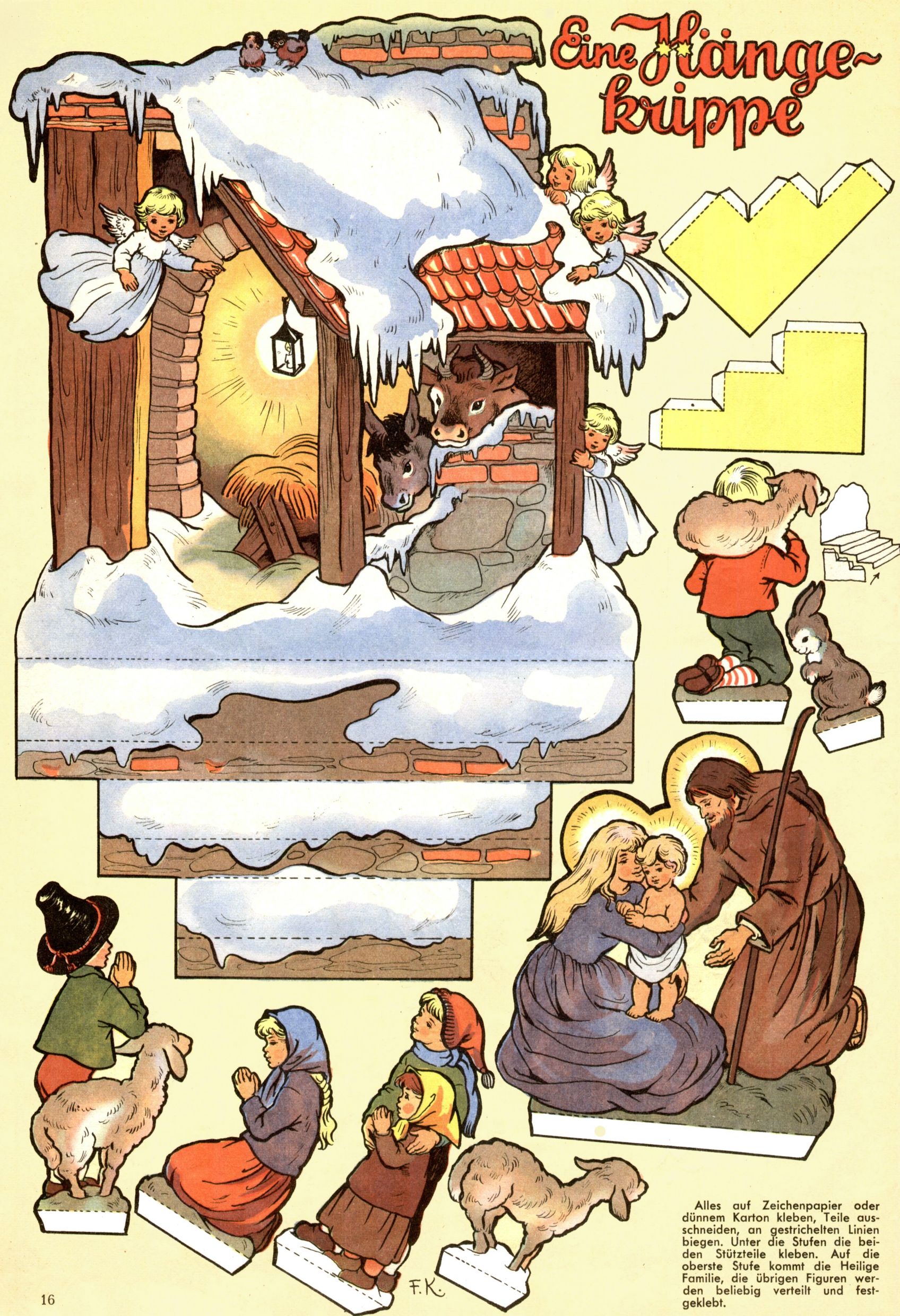 Die Wunderwelt im Festtagsgewand In den Sonderheften präsentierte sich die Wunderwelt wahrhaftig in Feiertagsstimmung. Mit wenigen Ausnahmen gab es pro Jahr drei Sonderhefte - zu Weihnachten bzw. im Advent, zu Ostern und in den Ferien im Sommer. Experimente mit Faschings- und Muttertagsheften hatten sich nicht bewährt. Selbst als es die Einzelhefte in der Krisensituation nach 1967 nicht mehr gab, wurde die Wunderwelt-Zeitung im Layout der Sonderhefte fortgesetzt: Zunächst mit 3 bis 5 und ab 1971 immerhin wieder mit 10-12 Heften pro Jahr. Die Weihnachts-, Oster- und Ferienhefte hatten naturgemäß verschiedene Schwerpunkte. Während im Sommer Spielen und Werken mit Material im Vordergrund stand, waren es zu Weihnachten Krippen und Adventhäuser; zu Ostern dann Erzählungen, Hasenstädte und Oster-Basteleien. Das bessere Papier der Sonderhefte erleichterte das Ausschneiden der insgesamt mehr als 1000 Papiermodelle erheblich. Die Sonderhefte waren vergleichsweise aufwändig gestaltet, aber auch ein wichtiges Zusatzgeschäft für die Zeitung. Die Kinder fieberten dem Erscheinungsdatum der jeweiligen Ausgabe nicht selten richtiggehend entgegen. Mit knapp 100 Seiten pro Jahr machten die Sonderhefte von der Menge her zwar nicht einmal ein Viertel aus, trugen aber zum Erscheinungsbild mindestens genauso viel bei wie die Standardhefte. Im Wesentlichen blieb das Layout der Sonderhefte über die Jahre hin unverändert. Mühselig wurde es, als man den Inhalt der Beiträge vorübergehend auf die Seiten gleichmäßig verteilte und die Kinder ermunterte, die Hefte in der Mitte zu zerschneiden. Die eine Hälfte enthielt dann etwa Erzählungen und Bastelvorschläge, der andere Teil der Zeitung Spielanleitungen. Zur übersichtlichkeit trugen diese Layoutversuche jedenfalls in keiner Weise bei und als besonderen Auswuchs gab es eine Zeitlang auf einer Seite oft mehrere Seitennummern, je nachdem, ob sich diese auf das Gesamtheft oder den herauszunehmenden und zu zerschneidenden Heftteil bezogen. Gegen Ende der 1950er Jahre kehrte man wieder zu einem ganzseitigen Layout zurück und Ideen wie ein Spiel-(Heft-im-)Heft gehörten der Vergangenheit an. In den Sonderheften experimentierte man dann noch ab Mitte der 1960er Jahre, als die Verkaufszahlen stark rückläufig waren, mit grundsätzlich neuen Darstellungsformen - weg vom Niedlich-Kitschigen und engagierte neue Grafikerinnen wie Gundi Groh und Hella Soyka. Den erhofften Erfolg brachte dies jedoch nicht mehr. |