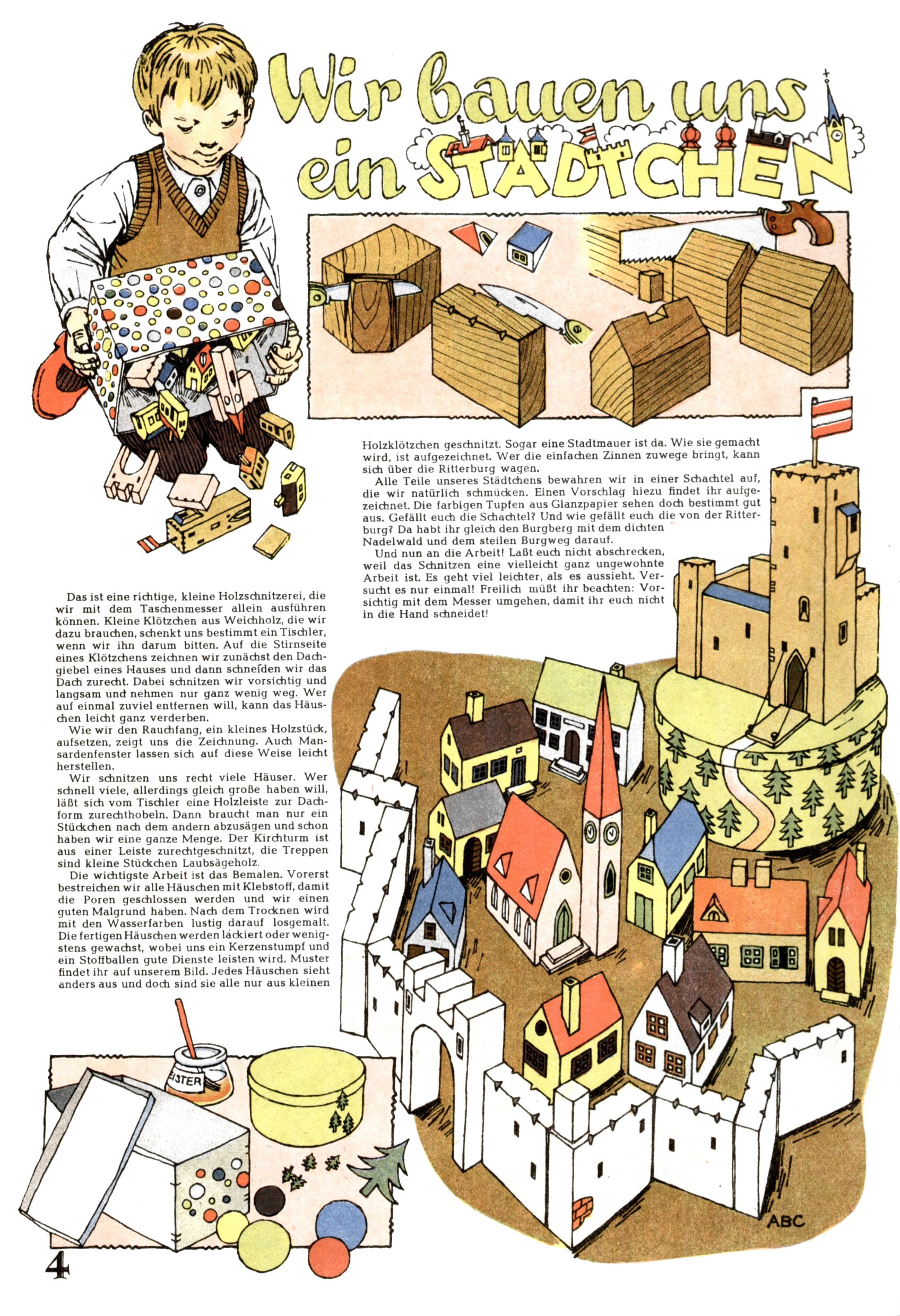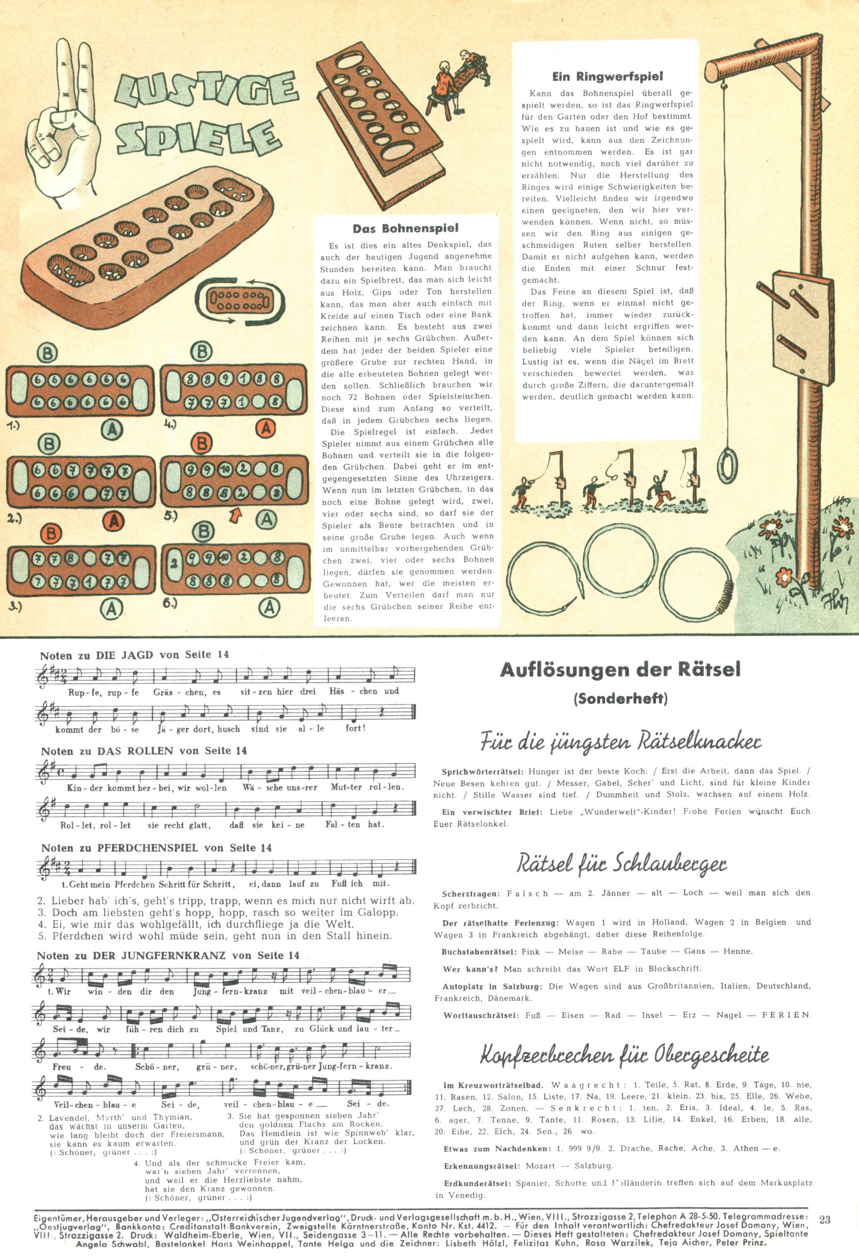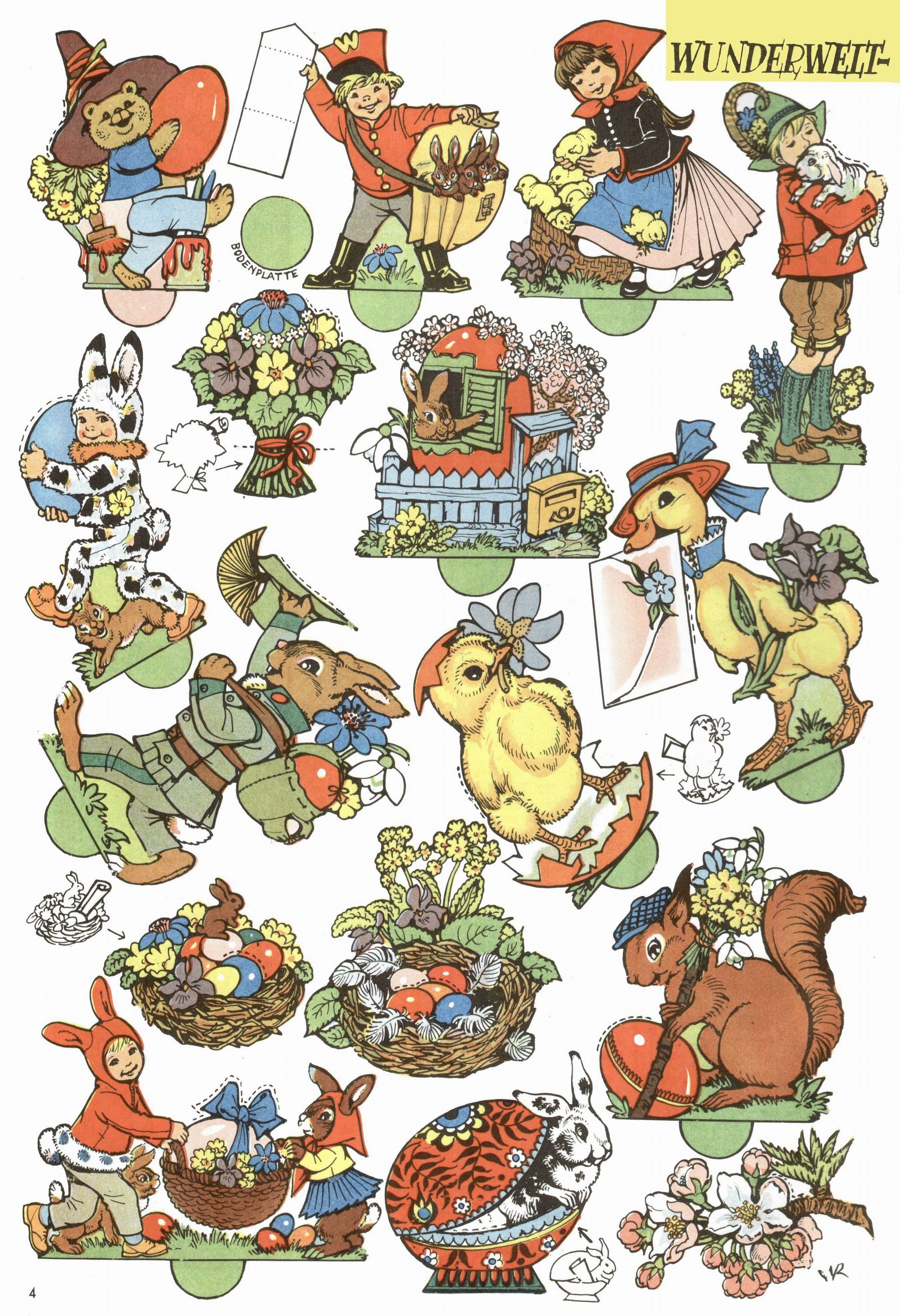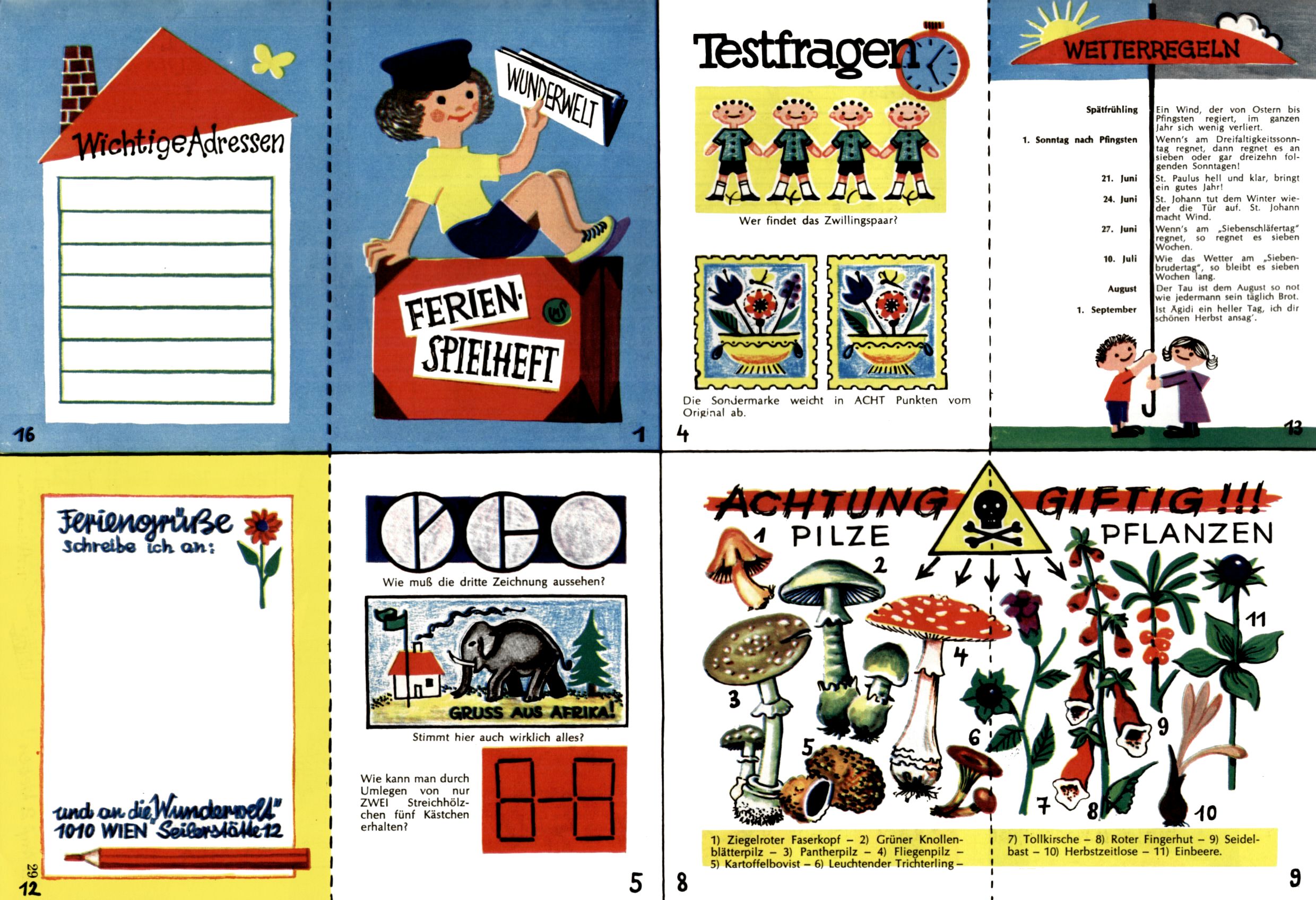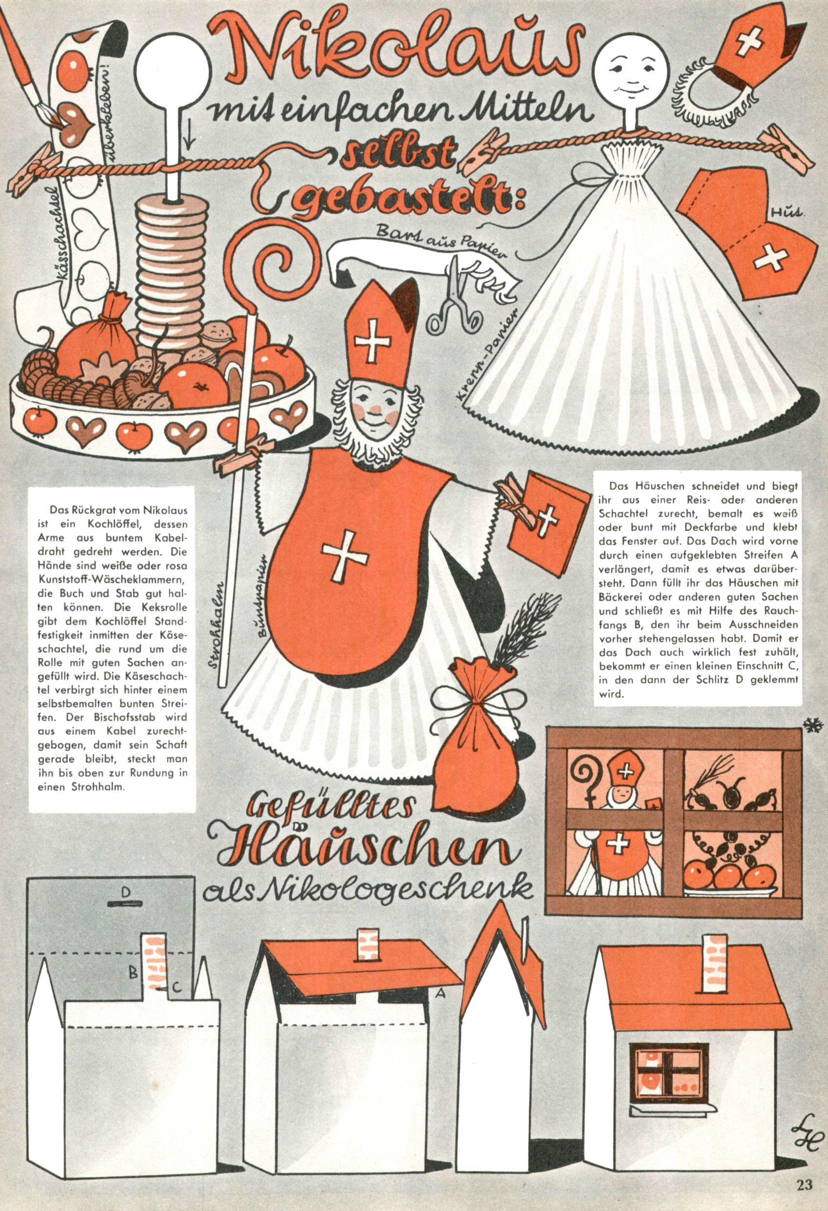 Die Wunderwelt im Festtagsgewand In den Sonderheften präsentierte sich die Wunderwelt wahrhaftig in Feiertagsstimmung. Mit wenigen Ausnahmen gab es pro Jahr drei Sonderhefte - zu Weihnachten bzw. im Advent, zu Ostern und in den Ferien im Sommer. Experimente mit Faschings- und Muttertagsheften hatten sich nicht bewährt. Selbst als es die Einzelhefte in der Krisensituation nach 1967 nicht mehr gab, wurde die Wunderwelt-Zeitung im Layout der Sonderhefte fortgesetzt: Zunächst mit 3 bis 5 und ab 1971 immerhin wieder mit 10-12 Heften pro Jahr. Die Weihnachts-, Oster- und Ferienhefte hatten naturgemäß verschiedene Schwerpunkte. Während im Sommer Spielen und Werken mit Material im Vordergrund stand, waren es zu Weihnachten Krippen und Adventhäuser; zu Ostern dann Erzählungen, Hasenstädte und Oster-Basteleien. Das bessere Papier der Sonderhefte erleichterte das Ausschneiden der insgesamt mehr als 1000 Papiermodelle erheblich. Die Sonderhefte waren vergleichsweise aufwändig gestaltet, aber auch ein wichtiges Zusatzgeschäft für die Zeitung. Die Kinder fieberten dem Erscheinungsdatum der jeweiligen Ausgabe nicht selten richtiggehend entgegen. Mit knapp 100 Seiten pro Jahr machten die Sonderhefte von der Menge her zwar nicht einmal ein Viertel aus, trugen aber zum Erscheinungsbild mindestens genauso viel bei wie die Standardhefte. Im Wesentlichen blieb das Layout der Sonderhefte über die Jahre hin unverändert. Mühselig wurde es, als man den Inhalt der Beiträge vorübergehend auf die Seiten gleichmäßig verteilte und die Kinder ermunterte, die Hefte in der Mitte zu zerschneiden. Die eine Hälfte enthielt dann etwa Erzählungen und Bastelvorschläge, der andere Teil der Zeitung Spielanleitungen. Zur übersichtlichkeit trugen diese Layoutversuche jedenfalls in keiner Weise bei und als besonderen Auswuchs gab es eine Zeitlang auf einer Seite oft mehrere Seitennummern, je nachdem, ob sich diese auf das Gesamtheft oder den herauszunehmenden und zu zerschneidenden Heftteil bezogen. Gegen Ende der 1950er Jahre kehrte man wieder zu einem ganzseitigen Layout zurück und Ideen wie ein Spiel-(Heft-im-)Heft gehörten der Vergangenheit an. In den Sonderheften experimentierte man dann noch ab Mitte der 1960er Jahre, als die Verkaufszahlen stark rückläufig waren, mit grundsätzlich neuen Darstellungsformen - weg vom Niedlich-Kitschigen und engagierte neue Grafikerinnen wie Gundi Groh und Hella Soyka. Den erhofften Erfolg brachte dies jedoch nicht mehr. |