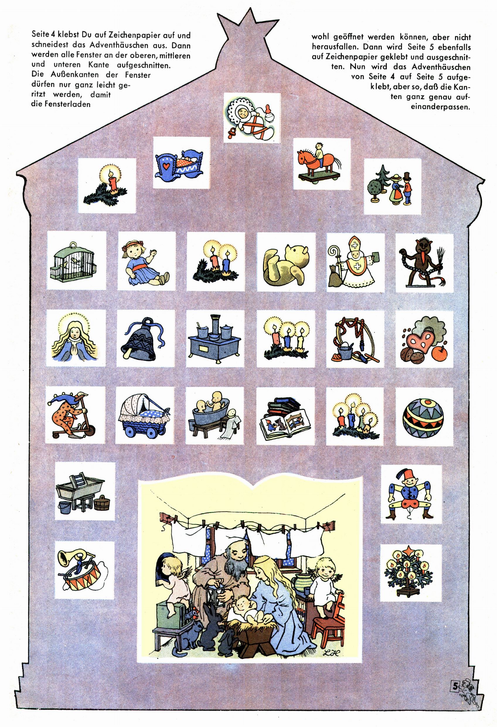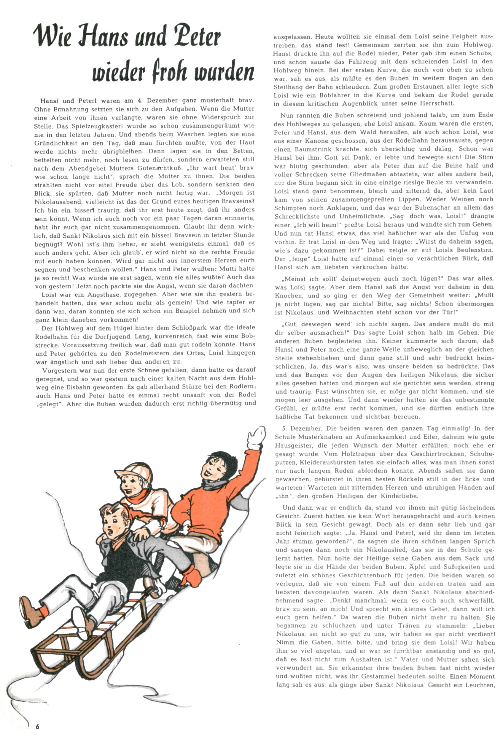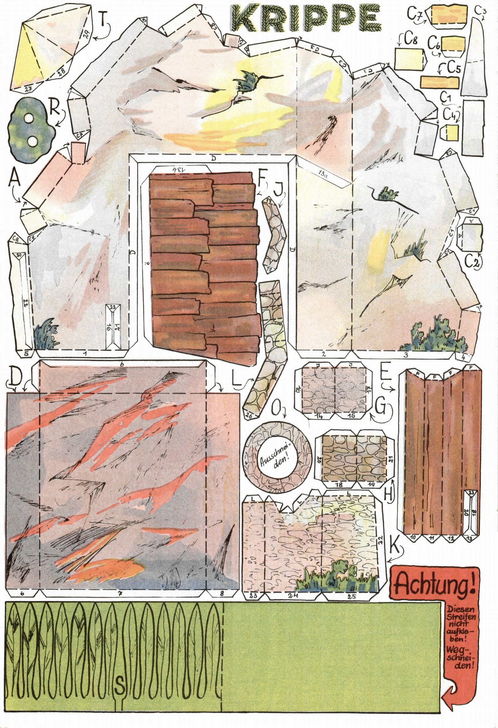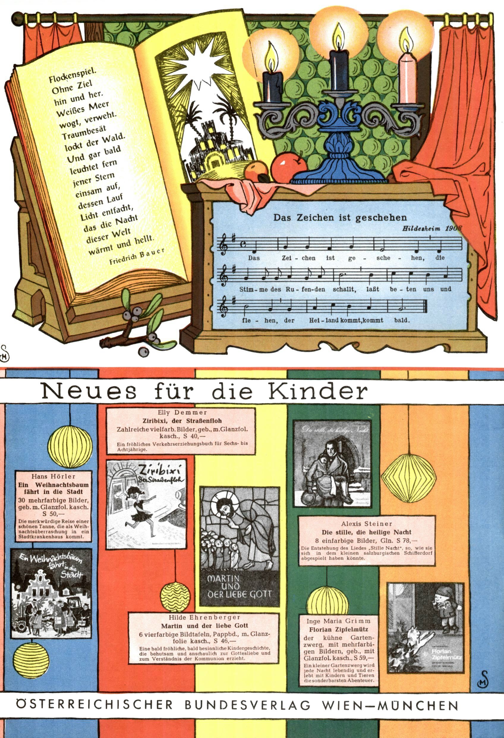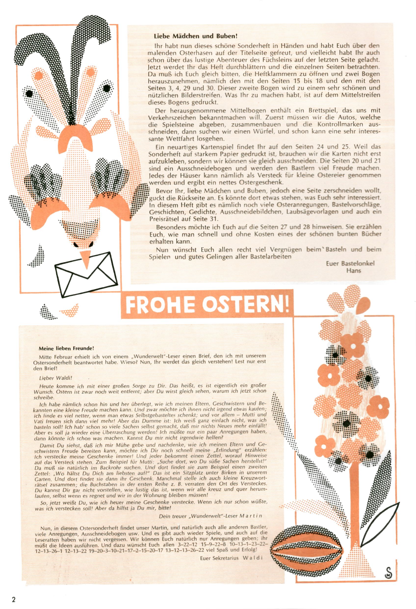 Die Wunderwelt im Festtagsgewand In den Sonderheften präsentierte sich die Wunderwelt wahrhaftig in Feiertagsstimmung. Mit wenigen Ausnahmen gab es pro Jahr drei Sonderhefte - zu Weihnachten bzw. im Advent, zu Ostern und in den Ferien im Sommer. Experimente mit Faschings- und Muttertagsheften hatten sich nicht bewährt. Selbst als es die Einzelhefte in der Krisensituation nach 1967 nicht mehr gab, wurde die Wunderwelt-Zeitung im Layout der Sonderhefte fortgesetzt: Zunächst mit 3 bis 5 und ab 1971 immerhin wieder mit 10-12 Heften pro Jahr. Die Weihnachts-, Oster- und Ferienhefte hatten naturgemäß verschiedene Schwerpunkte. Während im Sommer Spielen und Werken mit Material im Vordergrund stand, waren es zu Weihnachten Krippen und Adventhäuser; zu Ostern dann Erzählungen, Hasenstädte und Oster-Basteleien. Das bessere Papier der Sonderhefte erleichterte das Ausschneiden der insgesamt mehr als 1000 Papiermodelle erheblich. Die Sonderhefte waren vergleichsweise aufwändig gestaltet, aber auch ein wichtiges Zusatzgeschäft für die Zeitung. Die Kinder fieberten dem Erscheinungsdatum der jeweiligen Ausgabe nicht selten richtiggehend entgegen. Mit knapp 100 Seiten pro Jahr machten die Sonderhefte von der Menge her zwar nicht einmal ein Viertel aus, trugen aber zum Erscheinungsbild mindestens genauso viel bei wie die Standardhefte. Im Wesentlichen blieb das Layout der Sonderhefte über die Jahre hin unverändert. Mühselig wurde es, als man den Inhalt der Beiträge vorübergehend auf die Seiten gleichmäßig verteilte und die Kinder ermunterte, die Hefte in der Mitte zu zerschneiden. Die eine Hälfte enthielt dann etwa Erzählungen und Bastelvorschläge, der andere Teil der Zeitung Spielanleitungen. Zur übersichtlichkeit trugen diese Layoutversuche jedenfalls in keiner Weise bei und als besonderen Auswuchs gab es eine Zeitlang auf einer Seite oft mehrere Seitennummern, je nachdem, ob sich diese auf das Gesamtheft oder den herauszunehmenden und zu zerschneidenden Heftteil bezogen. Gegen Ende der 1950er Jahre kehrte man wieder zu einem ganzseitigen Layout zurück und Ideen wie ein Spiel-(Heft-im-)Heft gehörten der Vergangenheit an. In den Sonderheften experimentierte man dann noch ab Mitte der 1960er Jahre, als die Verkaufszahlen stark rückläufig waren, mit grundsätzlich neuen Darstellungsformen - weg vom Niedlich-Kitschigen und engagierte neue Grafikerinnen wie Gundi Groh und Hella Soyka. Den erhofften Erfolg brachte dies jedoch nicht mehr. |