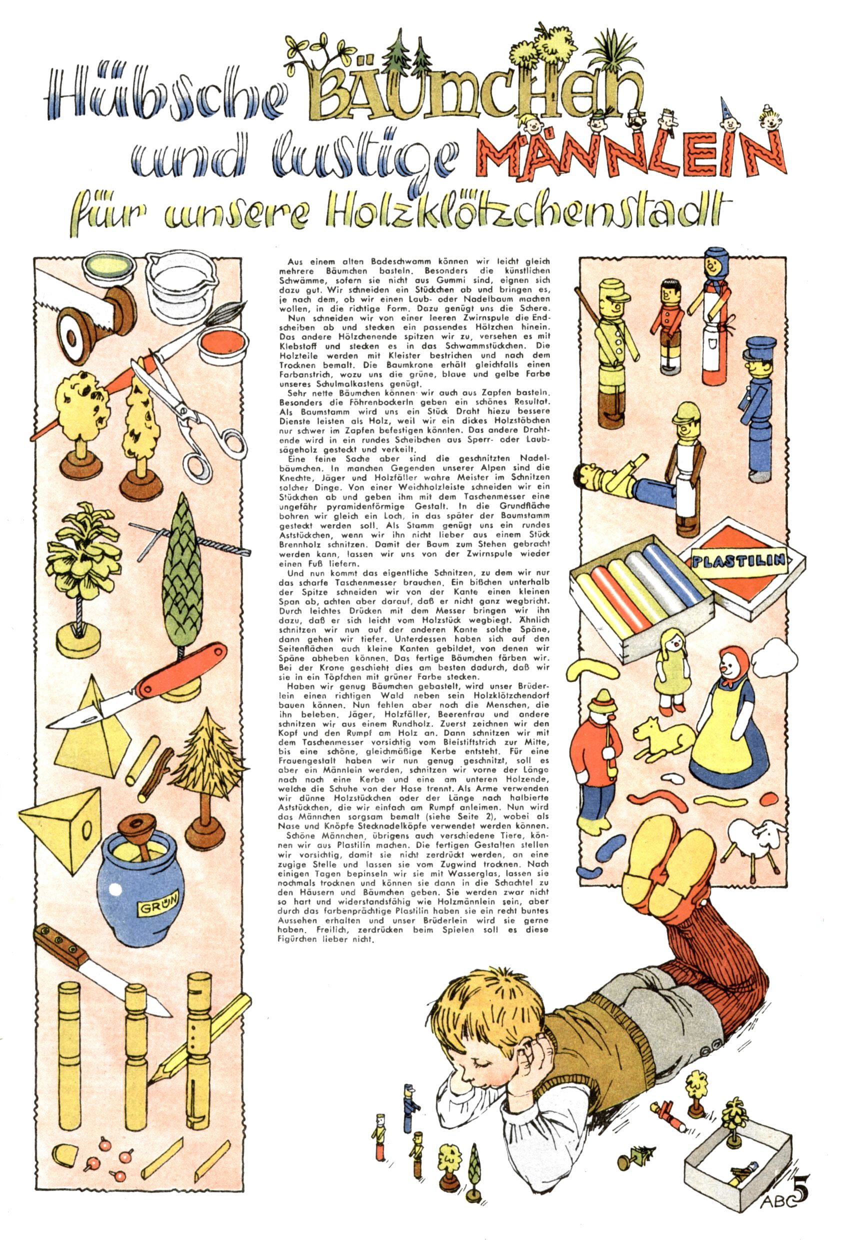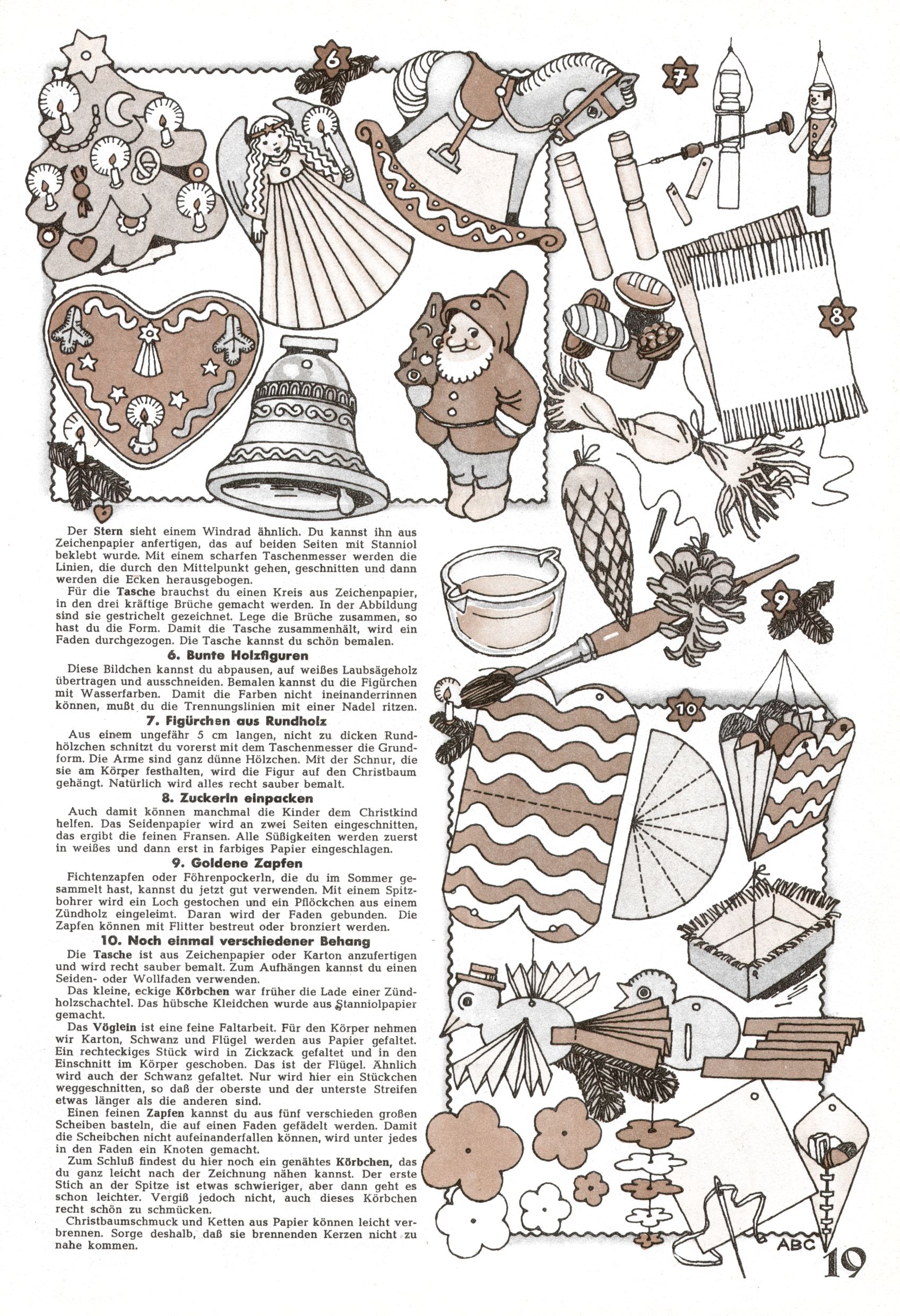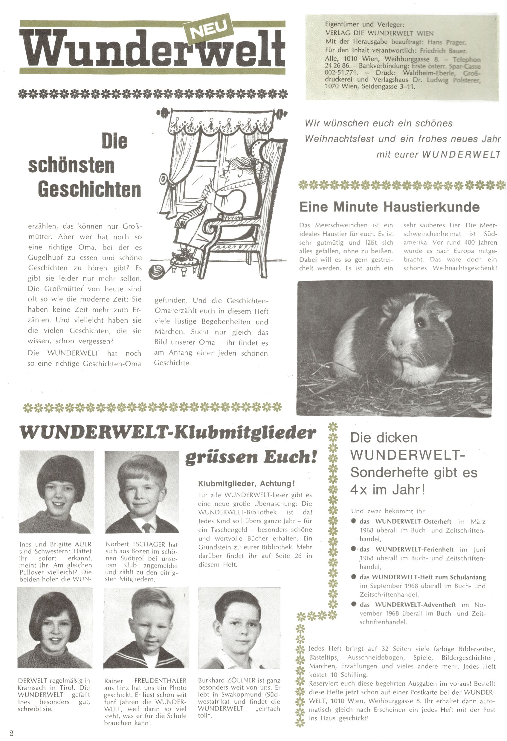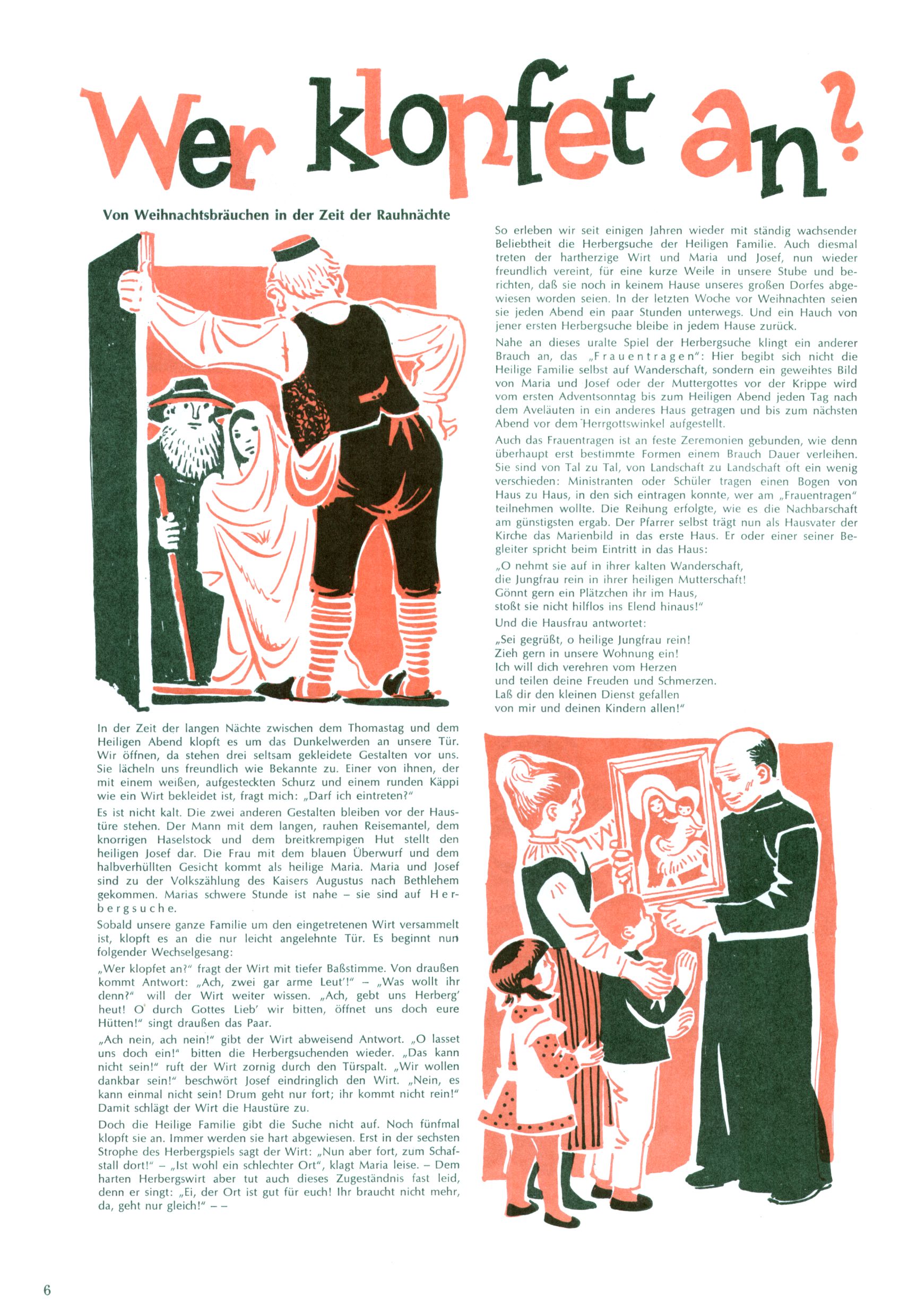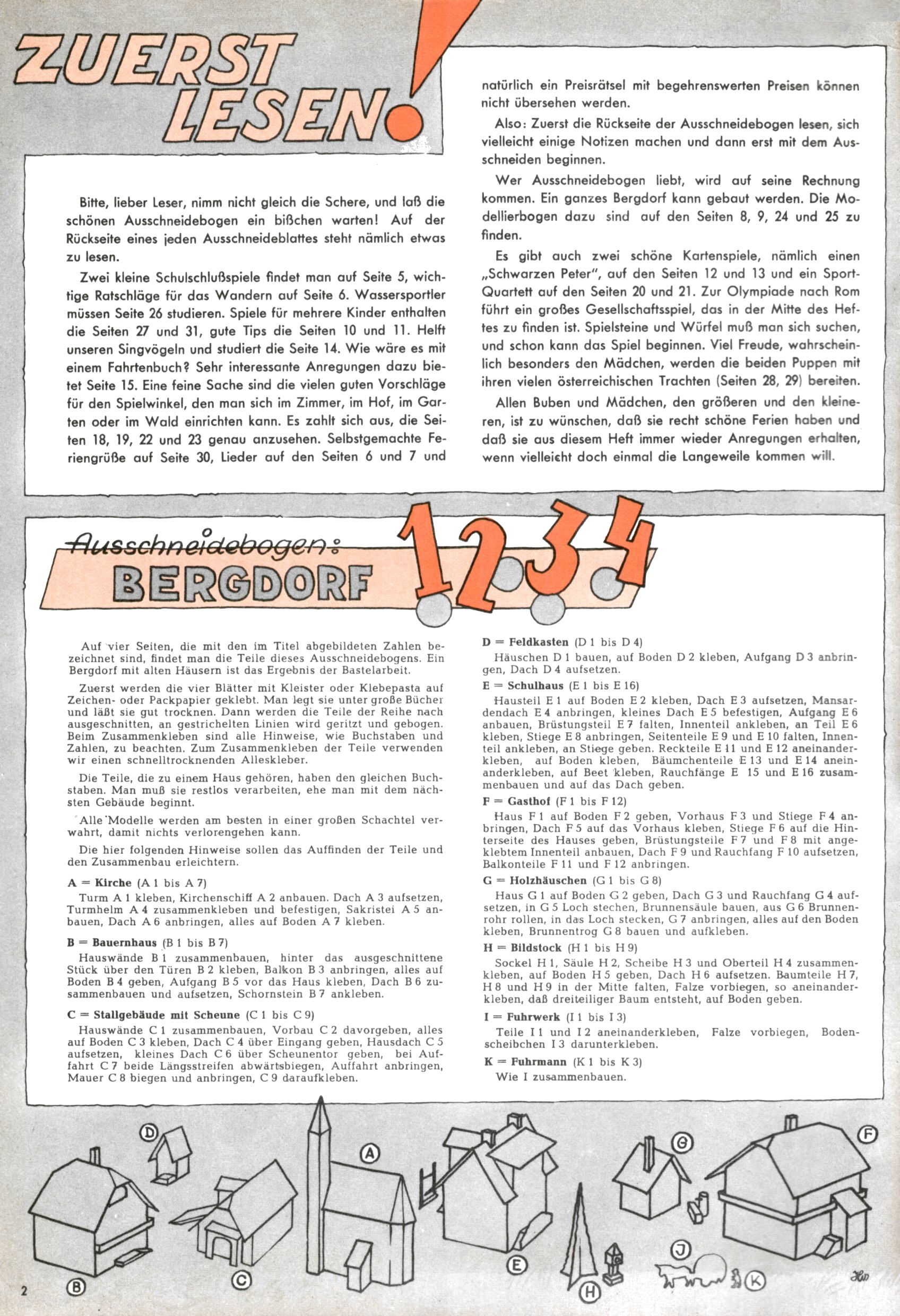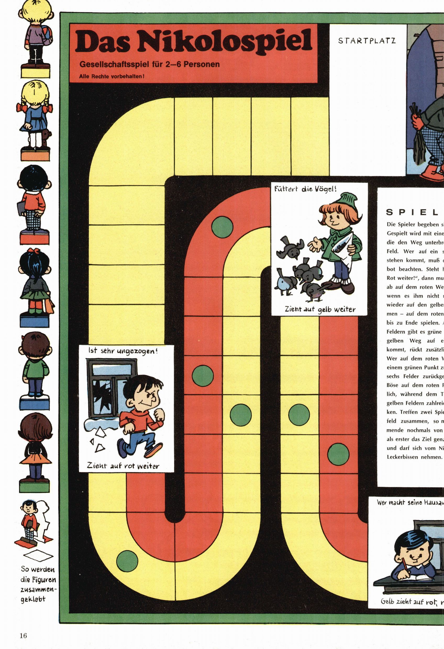 Die Wunderwelt im Festtagsgewand In den Sonderheften präsentierte sich die Wunderwelt wahrhaftig in Feiertagsstimmung. Mit wenigen Ausnahmen gab es pro Jahr drei Sonderhefte - zu Weihnachten bzw. im Advent, zu Ostern und in den Ferien im Sommer. Experimente mit Faschings- und Muttertagsheften hatten sich nicht bewährt. Selbst als es die Einzelhefte in der Krisensituation nach 1967 nicht mehr gab, wurde die Wunderwelt-Zeitung im Layout der Sonderhefte fortgesetzt: Zunächst mit 3 bis 5 und ab 1971 immerhin wieder mit 10-12 Heften pro Jahr. Die Weihnachts-, Oster- und Ferienhefte hatten naturgemäß verschiedene Schwerpunkte. Während im Sommer Spielen und Werken mit Material im Vordergrund stand, waren es zu Weihnachten Krippen und Adventhäuser; zu Ostern dann Erzählungen, Hasenstädte und Oster-Basteleien. Das bessere Papier der Sonderhefte erleichterte das Ausschneiden der insgesamt mehr als 1000 Papiermodelle erheblich. Die Sonderhefte waren vergleichsweise aufwändig gestaltet, aber auch ein wichtiges Zusatzgeschäft für die Zeitung. Die Kinder fieberten dem Erscheinungsdatum der jeweiligen Ausgabe nicht selten richtiggehend entgegen. Mit knapp 100 Seiten pro Jahr machten die Sonderhefte von der Menge her zwar nicht einmal ein Viertel aus, trugen aber zum Erscheinungsbild mindestens genauso viel bei wie die Standardhefte. Im Wesentlichen blieb das Layout der Sonderhefte über die Jahre hin unverändert. Mühselig wurde es, als man den Inhalt der Beiträge vorübergehend auf die Seiten gleichmäßig verteilte und die Kinder ermunterte, die Hefte in der Mitte zu zerschneiden. Die eine Hälfte enthielt dann etwa Erzählungen und Bastelvorschläge, der andere Teil der Zeitung Spielanleitungen. Zur übersichtlichkeit trugen diese Layoutversuche jedenfalls in keiner Weise bei und als besonderen Auswuchs gab es eine Zeitlang auf einer Seite oft mehrere Seitennummern, je nachdem, ob sich diese auf das Gesamtheft oder den herauszunehmenden und zu zerschneidenden Heftteil bezogen. Gegen Ende der 1950er Jahre kehrte man wieder zu einem ganzseitigen Layout zurück und Ideen wie ein Spiel-(Heft-im-)Heft gehörten der Vergangenheit an. In den Sonderheften experimentierte man dann noch ab Mitte der 1960er Jahre, als die Verkaufszahlen stark rückläufig waren, mit grundsätzlich neuen Darstellungsformen - weg vom Niedlich-Kitschigen und engagierte neue Grafikerinnen wie Gundi Groh und Hella Soyka. Den erhofften Erfolg brachte dies jedoch nicht mehr. |