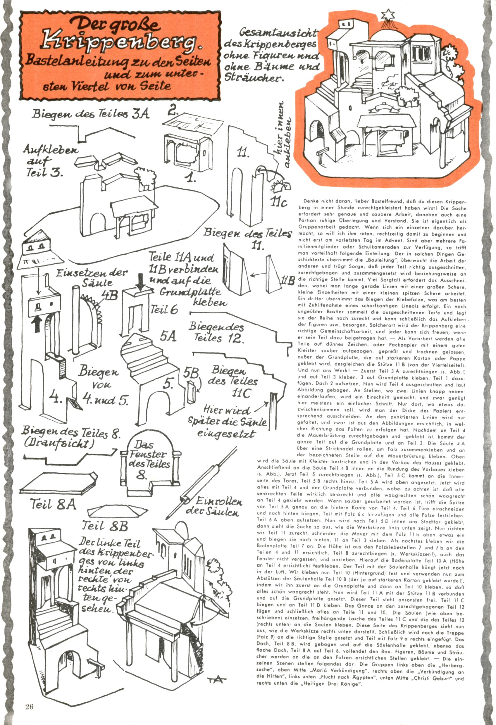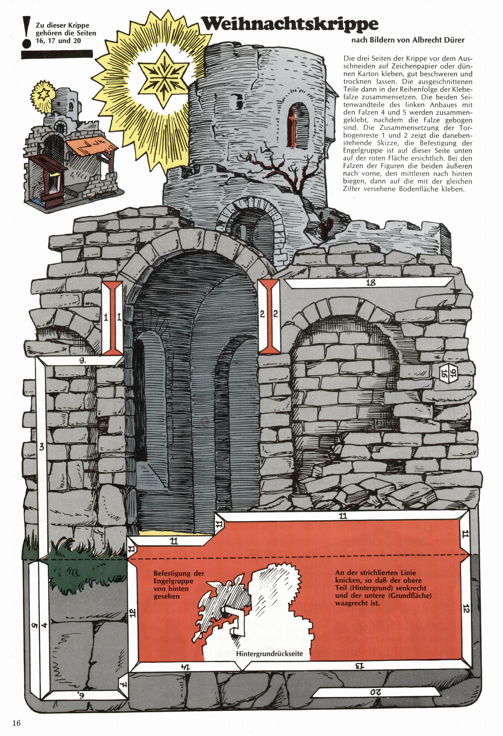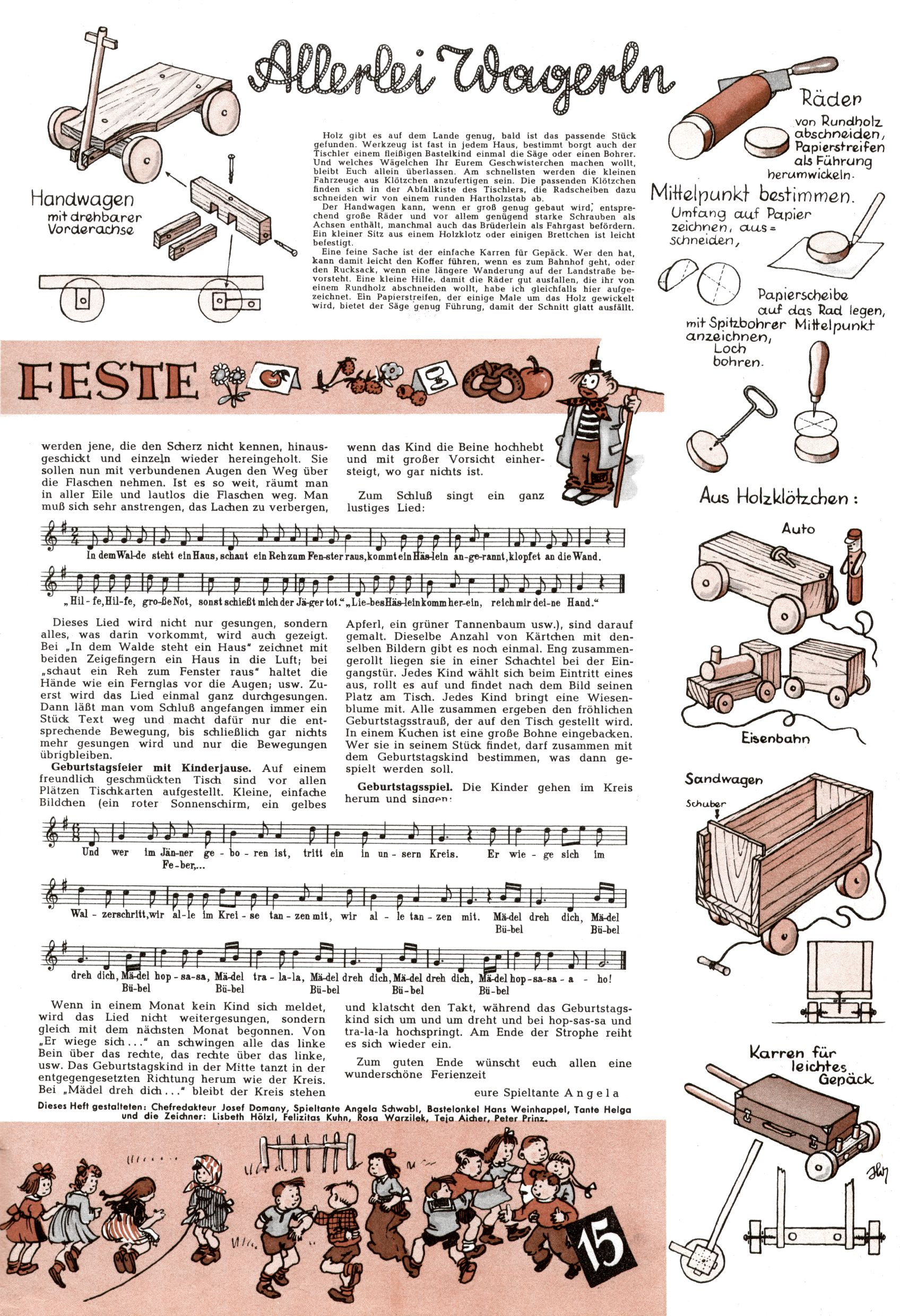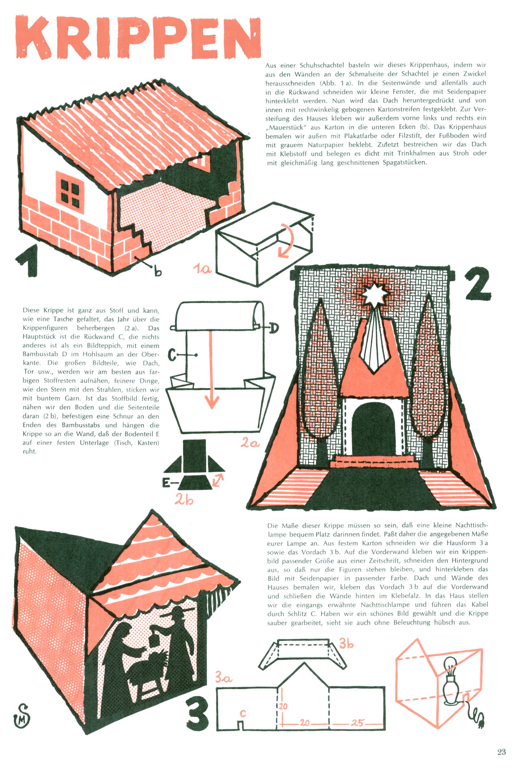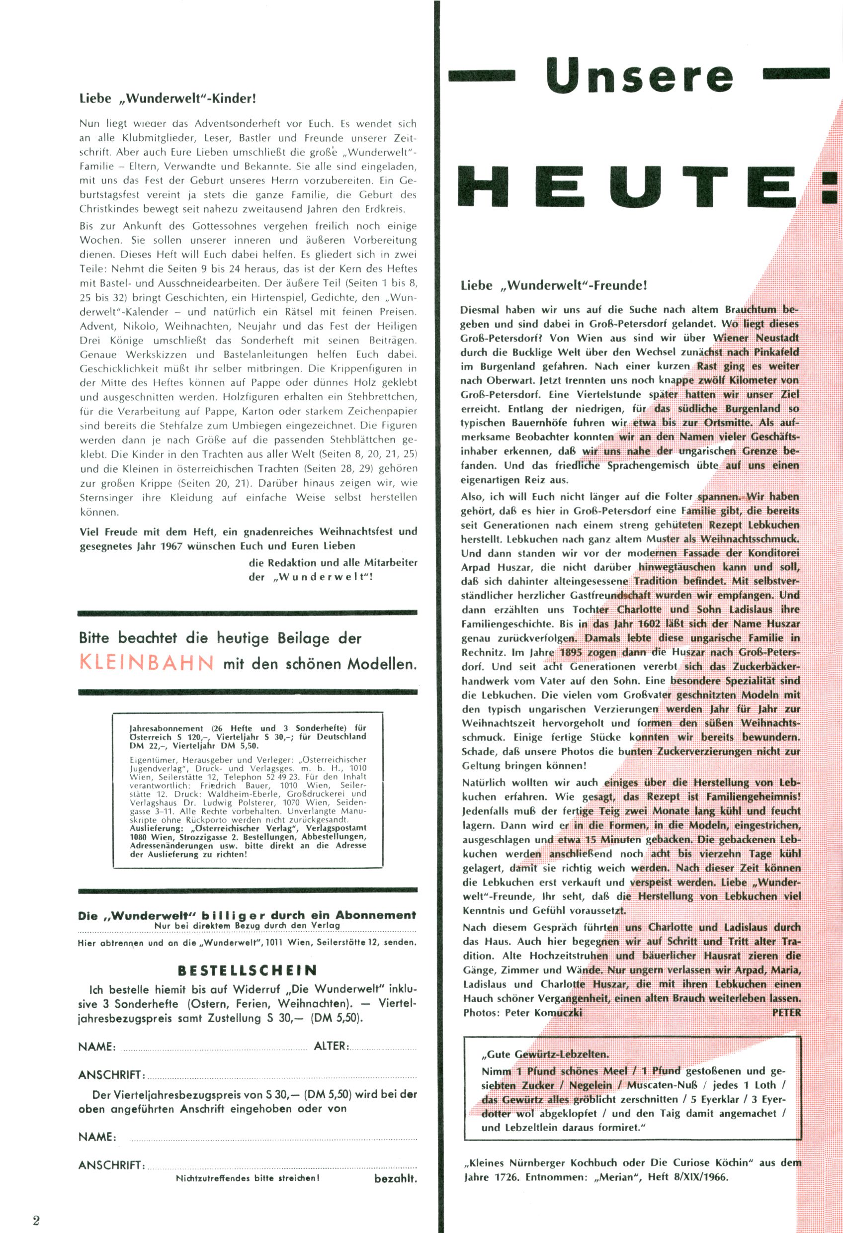 Die Wunderwelt im Festtagsgewand In den Sonderheften präsentierte sich die Wunderwelt wahrhaftig in Feiertagsstimmung. Mit wenigen Ausnahmen gab es pro Jahr drei Sonderhefte - zu Weihnachten bzw. im Advent, zu Ostern und in den Ferien im Sommer. Experimente mit Faschings- und Muttertagsheften hatten sich nicht bewährt. Selbst als es die Einzelhefte in der Krisensituation nach 1967 nicht mehr gab, wurde die Wunderwelt-Zeitung im Layout der Sonderhefte fortgesetzt: Zunächst mit 3 bis 5 und ab 1971 immerhin wieder mit 10-12 Heften pro Jahr. Die Weihnachts-, Oster- und Ferienhefte hatten naturgemäß verschiedene Schwerpunkte. Während im Sommer Spielen und Werken mit Material im Vordergrund stand, waren es zu Weihnachten Krippen und Adventhäuser; zu Ostern dann Erzählungen, Hasenstädte und Oster-Basteleien. Das bessere Papier der Sonderhefte erleichterte das Ausschneiden der insgesamt mehr als 1000 Papiermodelle erheblich. Die Sonderhefte waren vergleichsweise aufwändig gestaltet, aber auch ein wichtiges Zusatzgeschäft für die Zeitung. Die Kinder fieberten dem Erscheinungsdatum der jeweiligen Ausgabe nicht selten richtiggehend entgegen. Mit knapp 100 Seiten pro Jahr machten die Sonderhefte von der Menge her zwar nicht einmal ein Viertel aus, trugen aber zum Erscheinungsbild mindestens genauso viel bei wie die Standardhefte. Im Wesentlichen blieb das Layout der Sonderhefte über die Jahre hin unverändert. Mühselig wurde es, als man den Inhalt der Beiträge vorübergehend auf die Seiten gleichmäßig verteilte und die Kinder ermunterte, die Hefte in der Mitte zu zerschneiden. Die eine Hälfte enthielt dann etwa Erzählungen und Bastelvorschläge, der andere Teil der Zeitung Spielanleitungen. Zur übersichtlichkeit trugen diese Layoutversuche jedenfalls in keiner Weise bei und als besonderen Auswuchs gab es eine Zeitlang auf einer Seite oft mehrere Seitennummern, je nachdem, ob sich diese auf das Gesamtheft oder den herauszunehmenden und zu zerschneidenden Heftteil bezogen. Gegen Ende der 1950er Jahre kehrte man wieder zu einem ganzseitigen Layout zurück und Ideen wie ein Spiel-(Heft-im-)Heft gehörten der Vergangenheit an. In den Sonderheften experimentierte man dann noch ab Mitte der 1960er Jahre, als die Verkaufszahlen stark rückläufig waren, mit grundsätzlich neuen Darstellungsformen - weg vom Niedlich-Kitschigen und engagierte neue Grafikerinnen wie Gundi Groh und Hella Soyka. Den erhofften Erfolg brachte dies jedoch nicht mehr. |