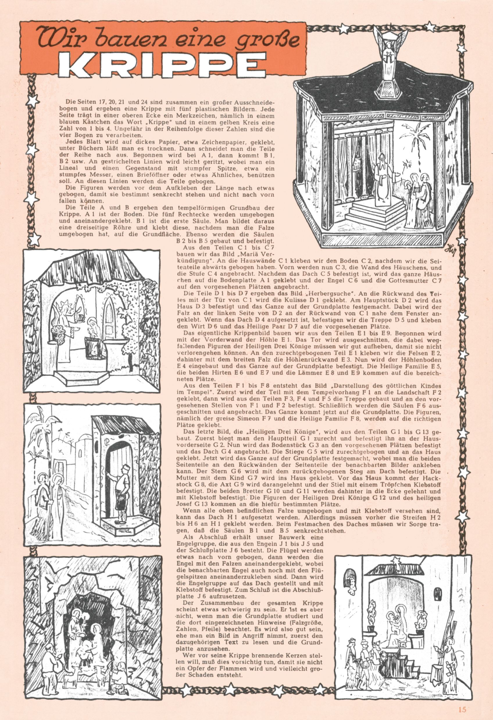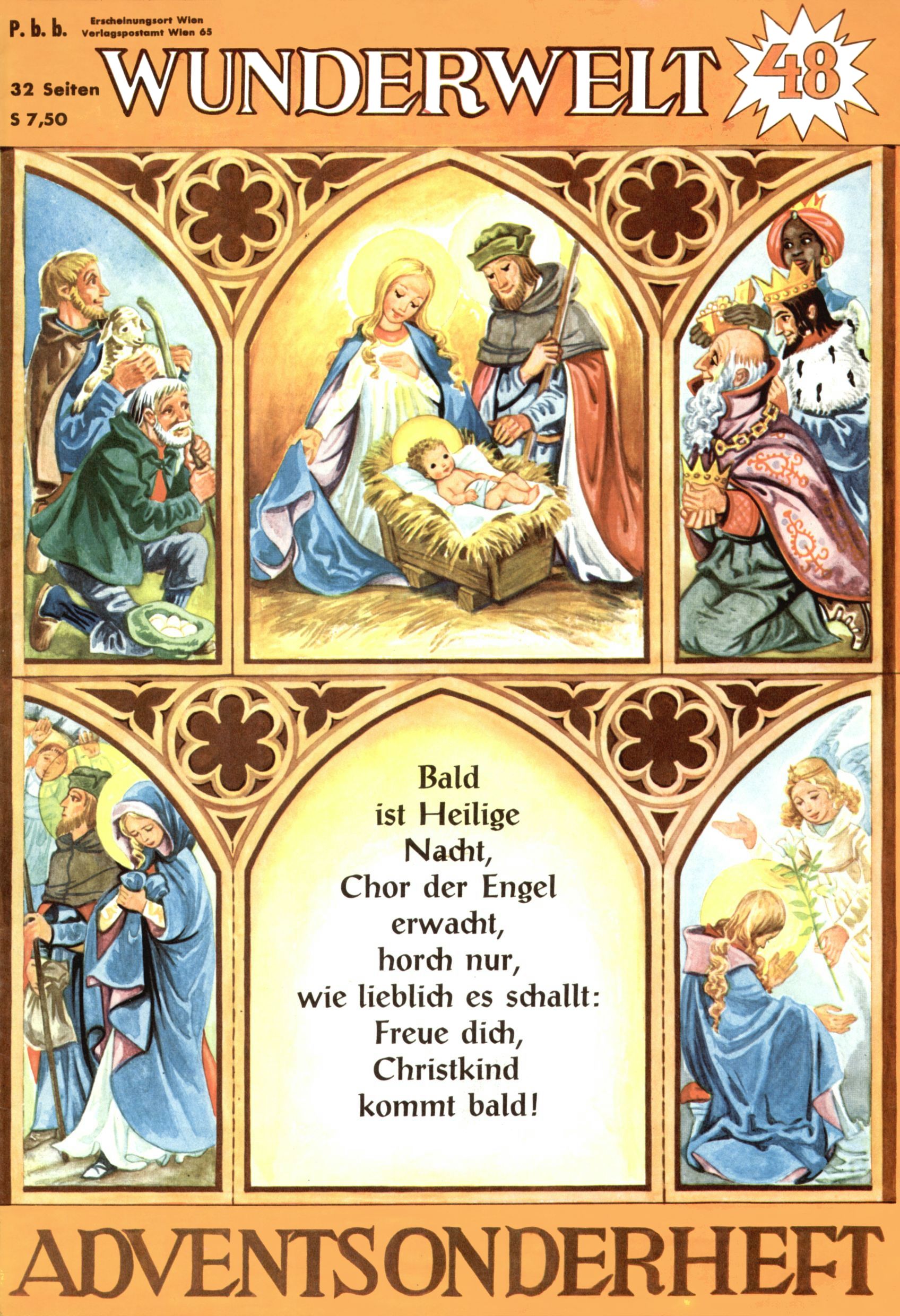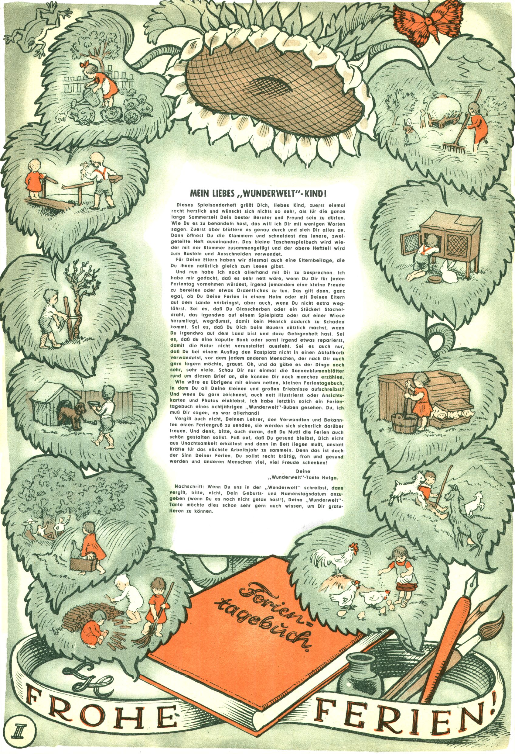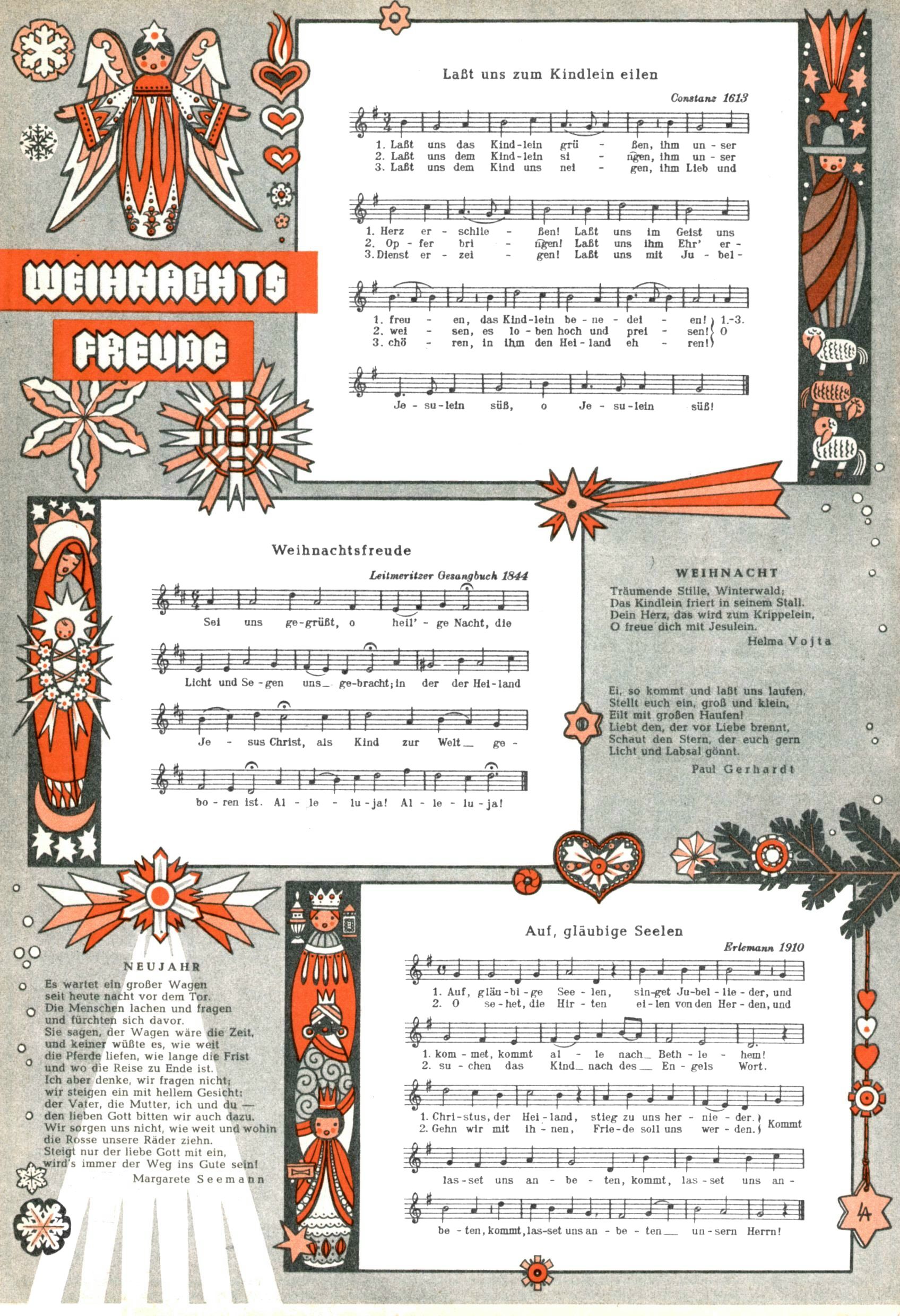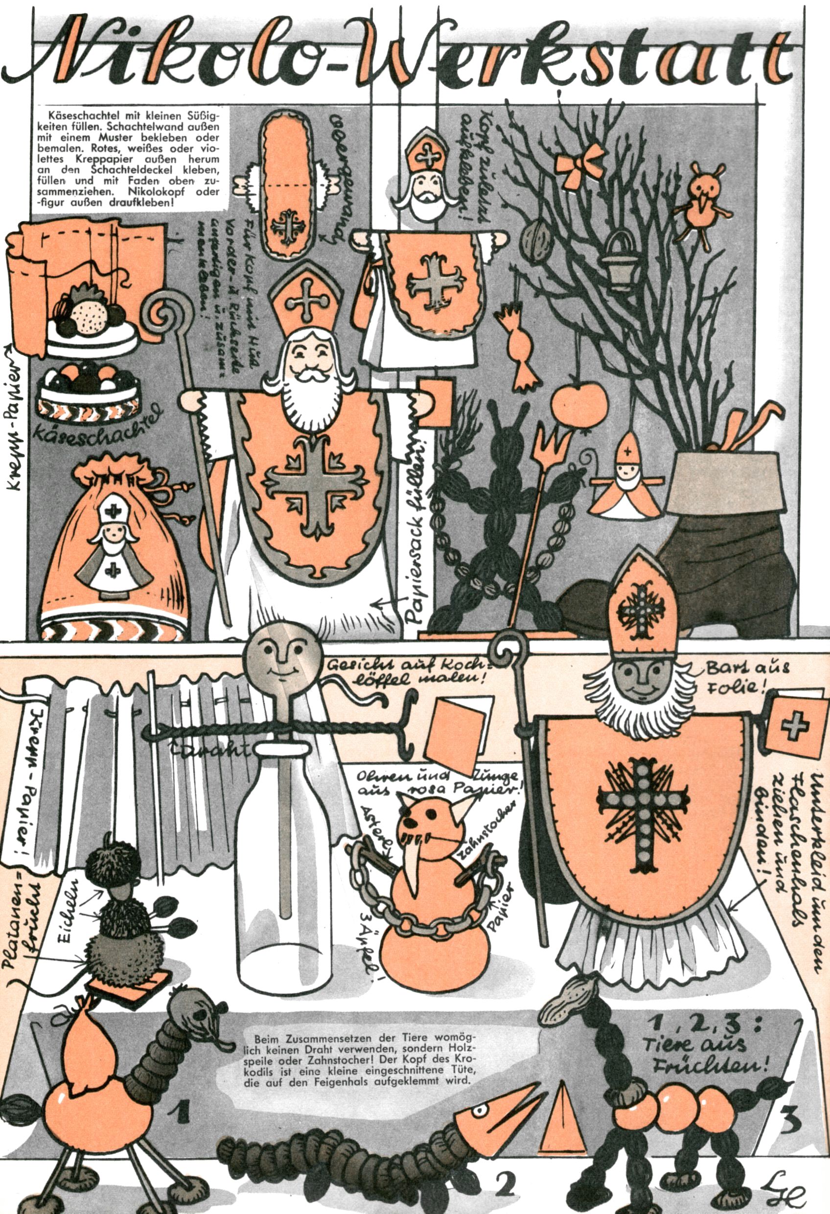 Die Wunderwelt im Festtagsgewand In den Sonderheften präsentierte sich die Wunderwelt wahrhaftig in Feiertagsstimmung. Mit wenigen Ausnahmen gab es pro Jahr drei Sonderhefte - zu Weihnachten bzw. im Advent, zu Ostern und in den Ferien im Sommer. Experimente mit Faschings- und Muttertagsheften hatten sich nicht bewährt. Selbst als es die Einzelhefte in der Krisensituation nach 1967 nicht mehr gab, wurde die Wunderwelt-Zeitung im Layout der Sonderhefte fortgesetzt: Zunächst mit 3 bis 5 und ab 1971 immerhin wieder mit 10-12 Heften pro Jahr. Die Weihnachts-, Oster- und Ferienhefte hatten naturgemäß verschiedene Schwerpunkte. Während im Sommer Spielen und Werken mit Material im Vordergrund stand, waren es zu Weihnachten Krippen und Adventhäuser; zu Ostern dann Erzählungen, Hasenstädte und Oster-Basteleien. Das bessere Papier der Sonderhefte erleichterte das Ausschneiden der insgesamt mehr als 1000 Papiermodelle erheblich. Die Sonderhefte waren vergleichsweise aufwändig gestaltet, aber auch ein wichtiges Zusatzgeschäft für die Zeitung. Die Kinder fieberten dem Erscheinungsdatum der jeweiligen Ausgabe nicht selten richtiggehend entgegen. Mit knapp 100 Seiten pro Jahr machten die Sonderhefte von der Menge her zwar nicht einmal ein Viertel aus, trugen aber zum Erscheinungsbild mindestens genauso viel bei wie die Standardhefte. Im Wesentlichen blieb das Layout der Sonderhefte über die Jahre hin unverändert. Mühselig wurde es, als man den Inhalt der Beiträge vorübergehend auf die Seiten gleichmäßig verteilte und die Kinder ermunterte, die Hefte in der Mitte zu zerschneiden. Die eine Hälfte enthielt dann etwa Erzählungen und Bastelvorschläge, der andere Teil der Zeitung Spielanleitungen. Zur übersichtlichkeit trugen diese Layoutversuche jedenfalls in keiner Weise bei und als besonderen Auswuchs gab es eine Zeitlang auf einer Seite oft mehrere Seitennummern, je nachdem, ob sich diese auf das Gesamtheft oder den herauszunehmenden und zu zerschneidenden Heftteil bezogen. Gegen Ende der 1950er Jahre kehrte man wieder zu einem ganzseitigen Layout zurück und Ideen wie ein Spiel-(Heft-im-)Heft gehörten der Vergangenheit an. In den Sonderheften experimentierte man dann noch ab Mitte der 1960er Jahre, als die Verkaufszahlen stark rückläufig waren, mit grundsätzlich neuen Darstellungsformen - weg vom Niedlich-Kitschigen und engagierte neue Grafikerinnen wie Gundi Groh und Hella Soyka. Den erhofften Erfolg brachte dies jedoch nicht mehr. |
