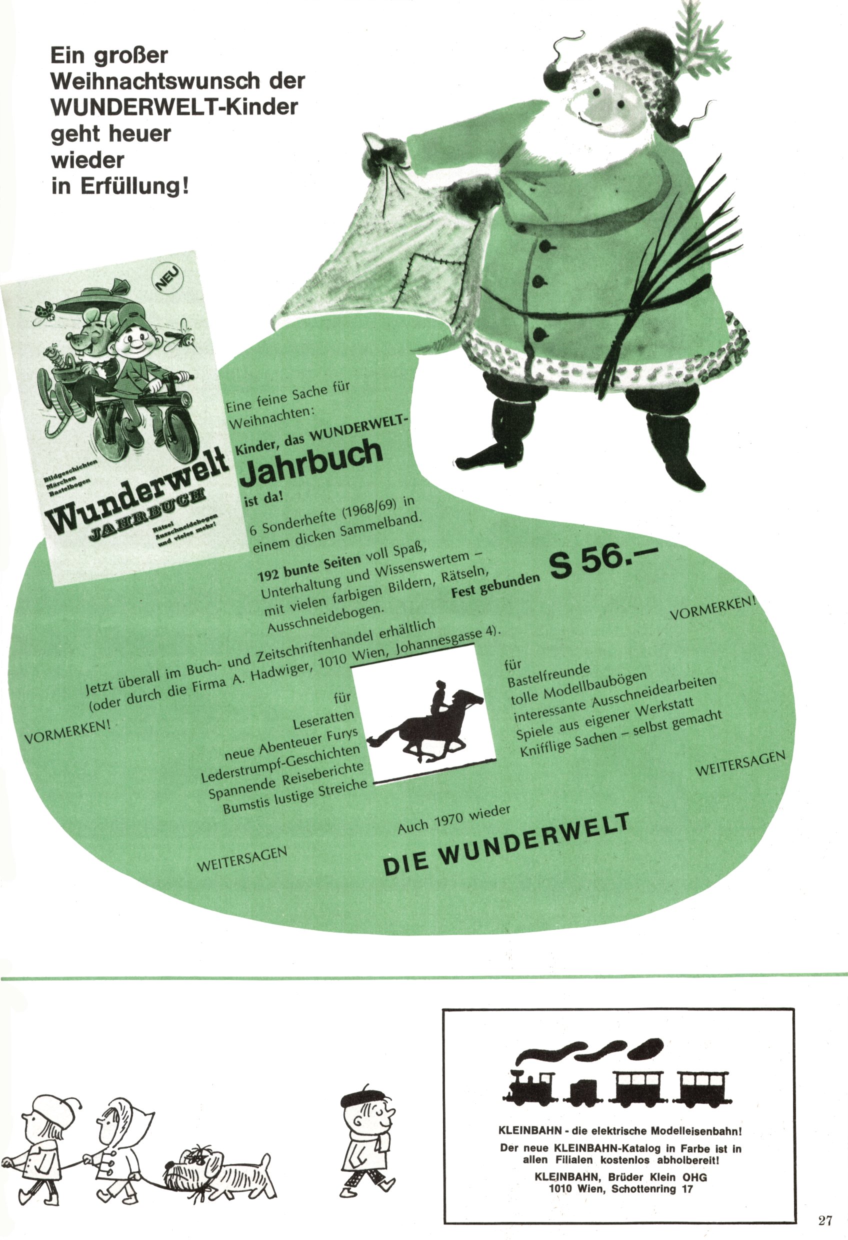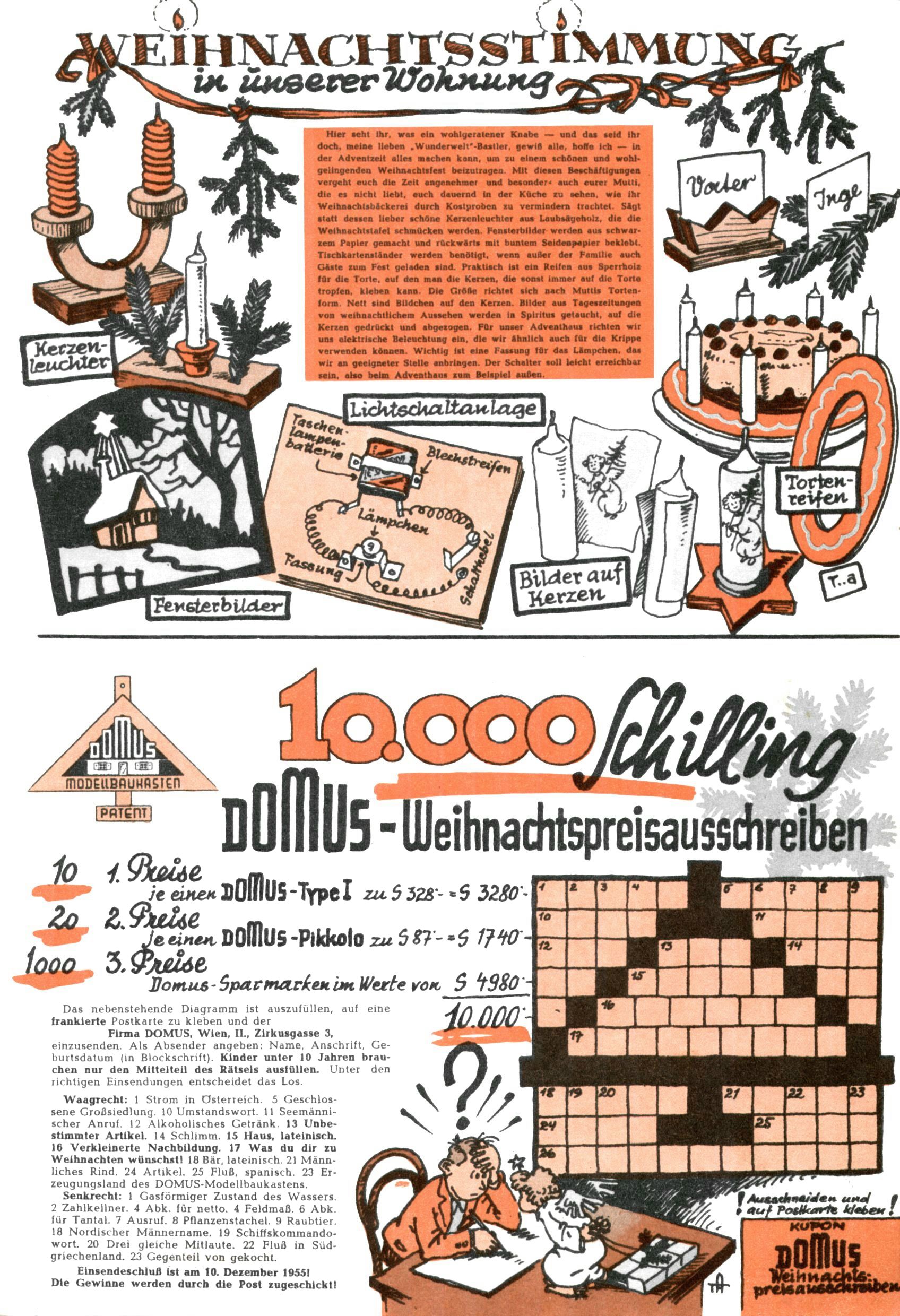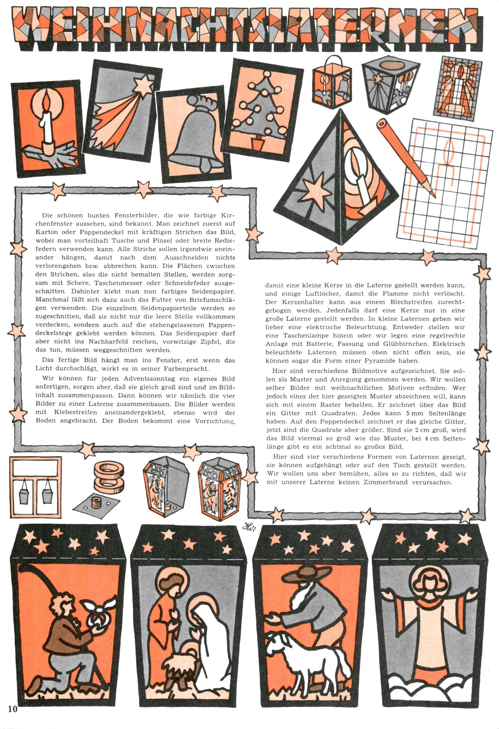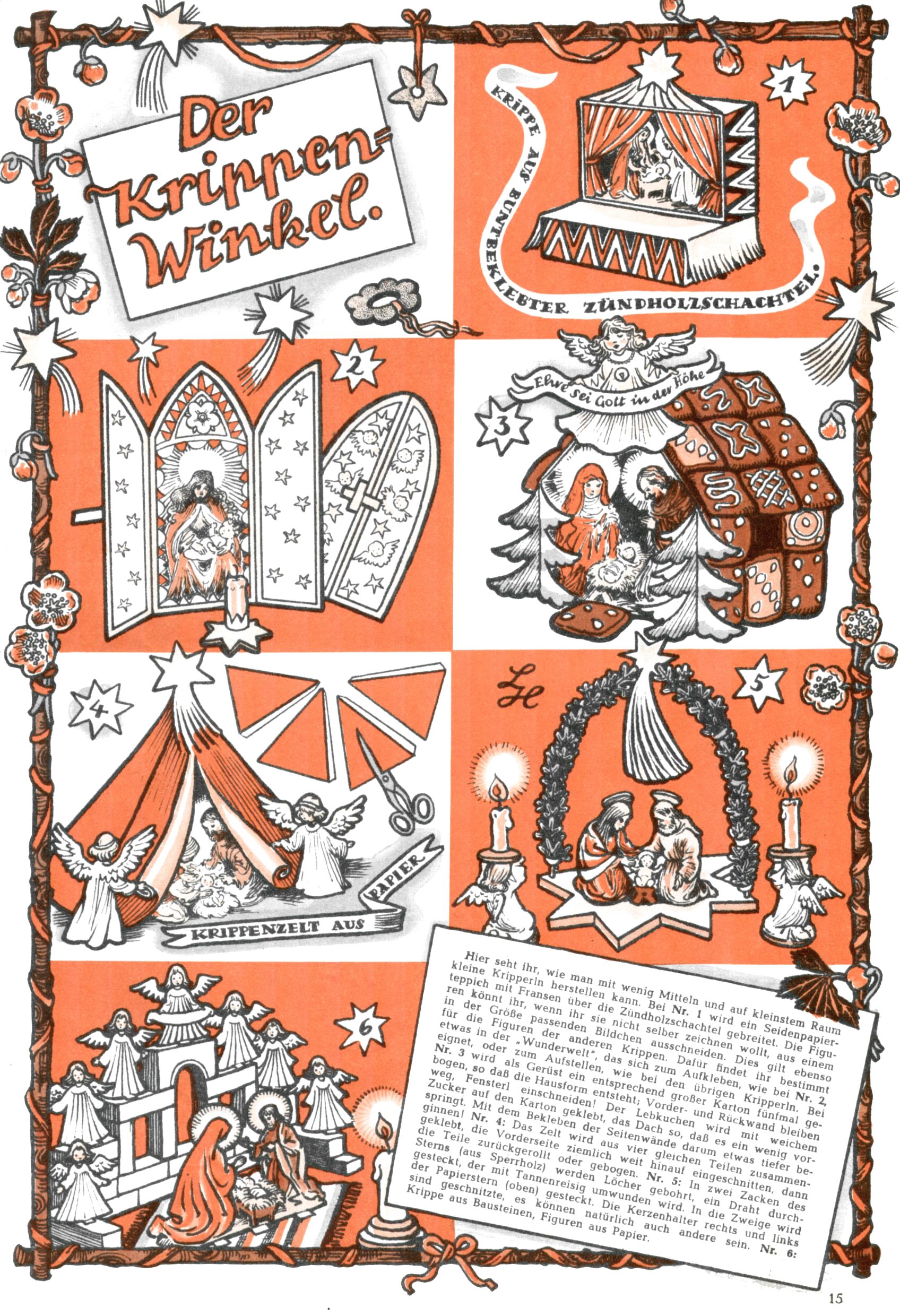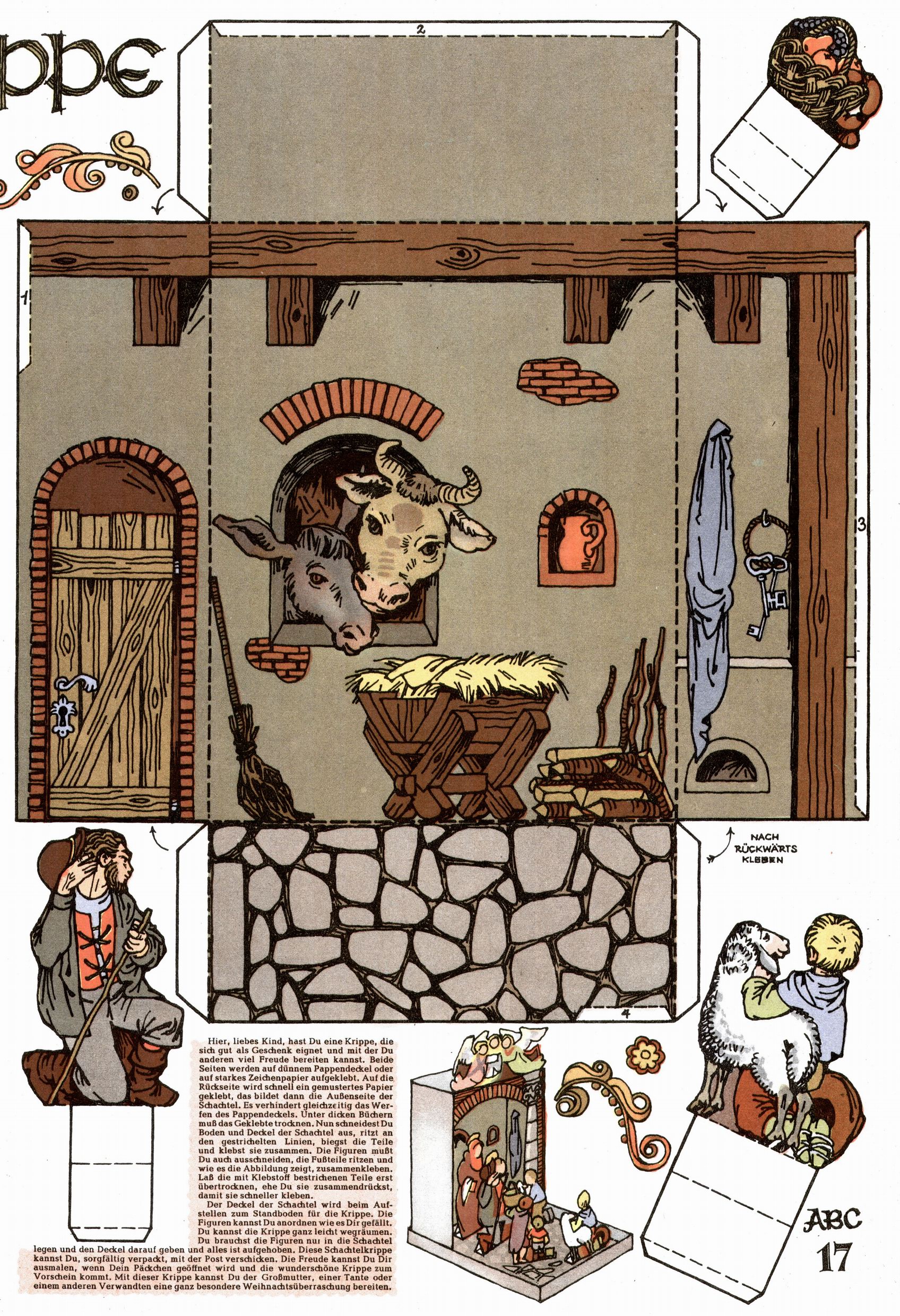 Die Wunderwelt im Festtagsgewand In den Sonderheften präsentierte sich die Wunderwelt wahrhaftig in Feiertagsstimmung. Mit wenigen Ausnahmen gab es pro Jahr drei Sonderhefte - zu Weihnachten bzw. im Advent, zu Ostern und in den Ferien im Sommer. Experimente mit Faschings- und Muttertagsheften hatten sich nicht bewährt. Selbst als es die Einzelhefte in der Krisensituation nach 1967 nicht mehr gab, wurde die Wunderwelt-Zeitung im Layout der Sonderhefte fortgesetzt: Zunächst mit 3 bis 5 und ab 1971 immerhin wieder mit 10-12 Heften pro Jahr. Die Weihnachts-, Oster- und Ferienhefte hatten naturgemäß verschiedene Schwerpunkte. Während im Sommer Spielen und Werken mit Material im Vordergrund stand, waren es zu Weihnachten Krippen und Adventhäuser; zu Ostern dann Erzählungen, Hasenstädte und Oster-Basteleien. Das bessere Papier der Sonderhefte erleichterte das Ausschneiden der insgesamt mehr als 1000 Papiermodelle erheblich. Die Sonderhefte waren vergleichsweise aufwändig gestaltet, aber auch ein wichtiges Zusatzgeschäft für die Zeitung. Die Kinder fieberten dem Erscheinungsdatum der jeweiligen Ausgabe nicht selten richtiggehend entgegen. Mit knapp 100 Seiten pro Jahr machten die Sonderhefte von der Menge her zwar nicht einmal ein Viertel aus, trugen aber zum Erscheinungsbild mindestens genauso viel bei wie die Standardhefte. Im Wesentlichen blieb das Layout der Sonderhefte über die Jahre hin unverändert. Mühselig wurde es, als man den Inhalt der Beiträge vorübergehend auf die Seiten gleichmäßig verteilte und die Kinder ermunterte, die Hefte in der Mitte zu zerschneiden. Die eine Hälfte enthielt dann etwa Erzählungen und Bastelvorschläge, der andere Teil der Zeitung Spielanleitungen. Zur übersichtlichkeit trugen diese Layoutversuche jedenfalls in keiner Weise bei und als besonderen Auswuchs gab es eine Zeitlang auf einer Seite oft mehrere Seitennummern, je nachdem, ob sich diese auf das Gesamtheft oder den herauszunehmenden und zu zerschneidenden Heftteil bezogen. Gegen Ende der 1950er Jahre kehrte man wieder zu einem ganzseitigen Layout zurück und Ideen wie ein Spiel-(Heft-im-)Heft gehörten der Vergangenheit an. In den Sonderheften experimentierte man dann noch ab Mitte der 1960er Jahre, als die Verkaufszahlen stark rückläufig waren, mit grundsätzlich neuen Darstellungsformen - weg vom Niedlich-Kitschigen und engagierte neue Grafikerinnen wie Gundi Groh und Hella Soyka. Den erhofften Erfolg brachte dies jedoch nicht mehr. |