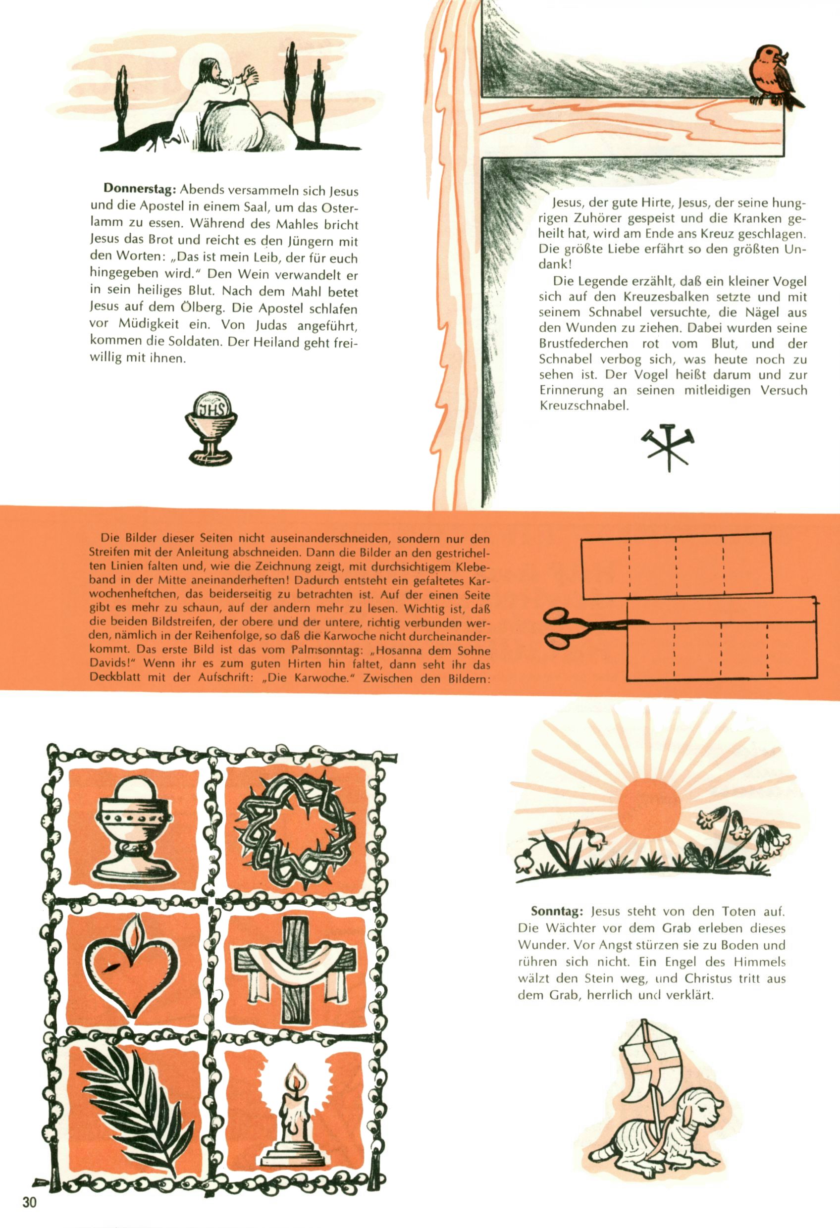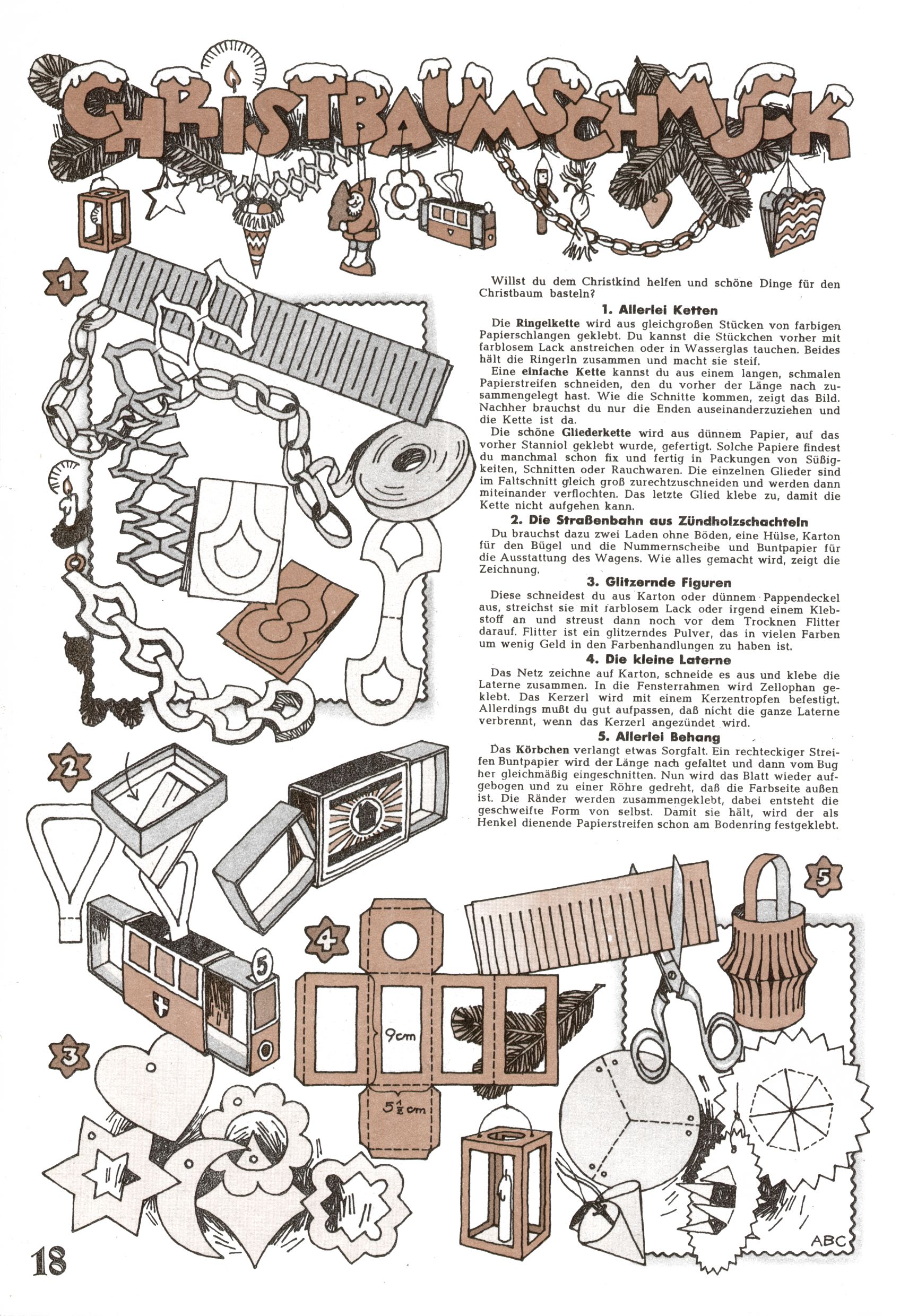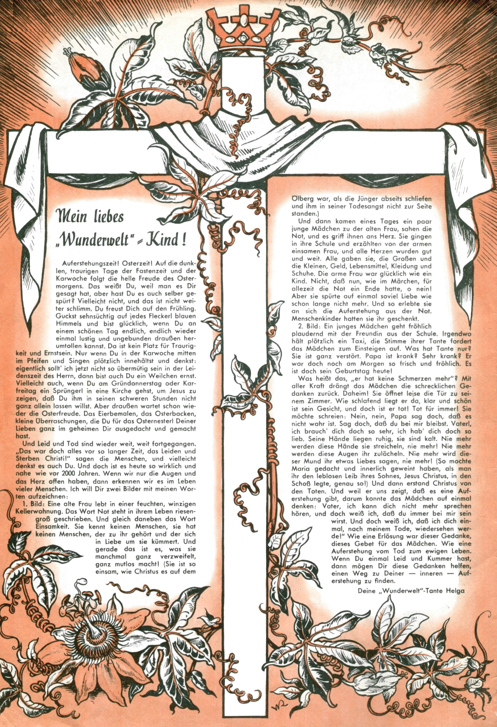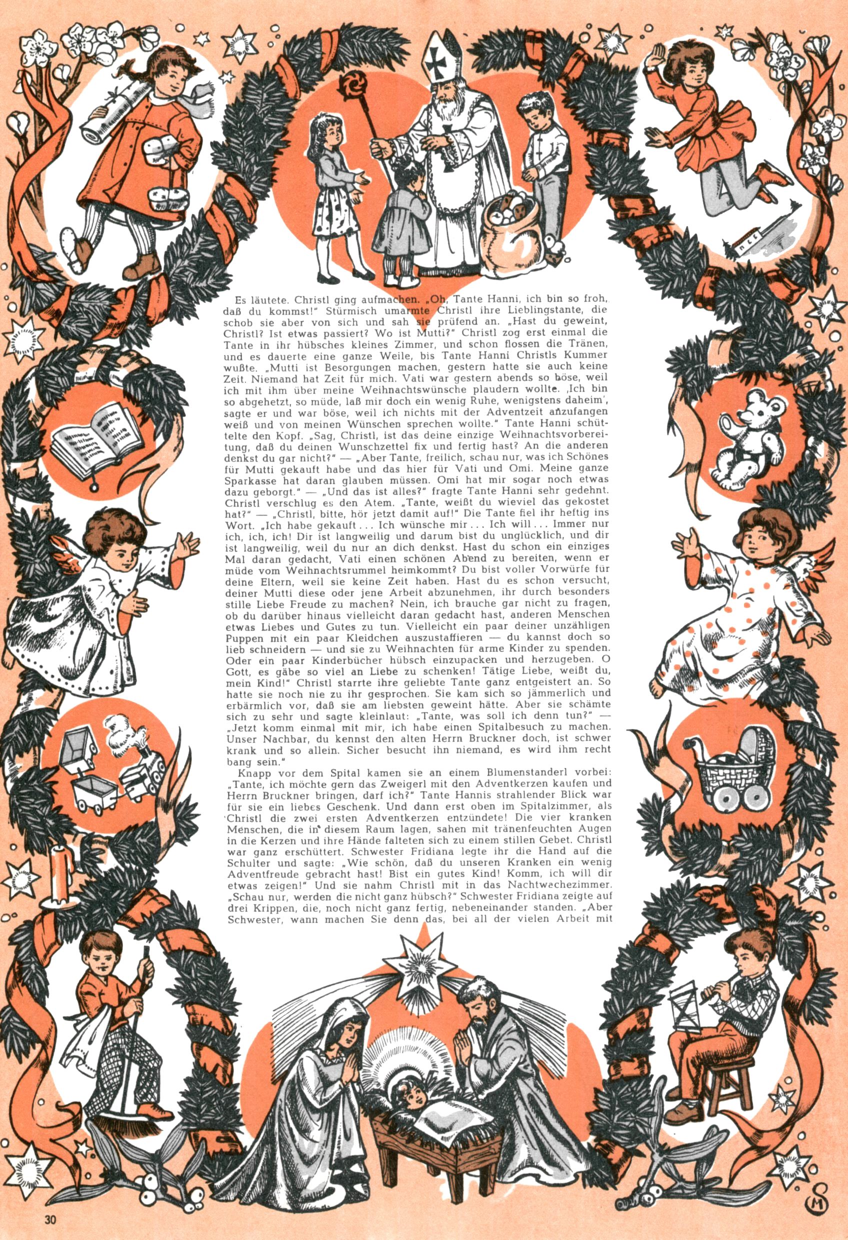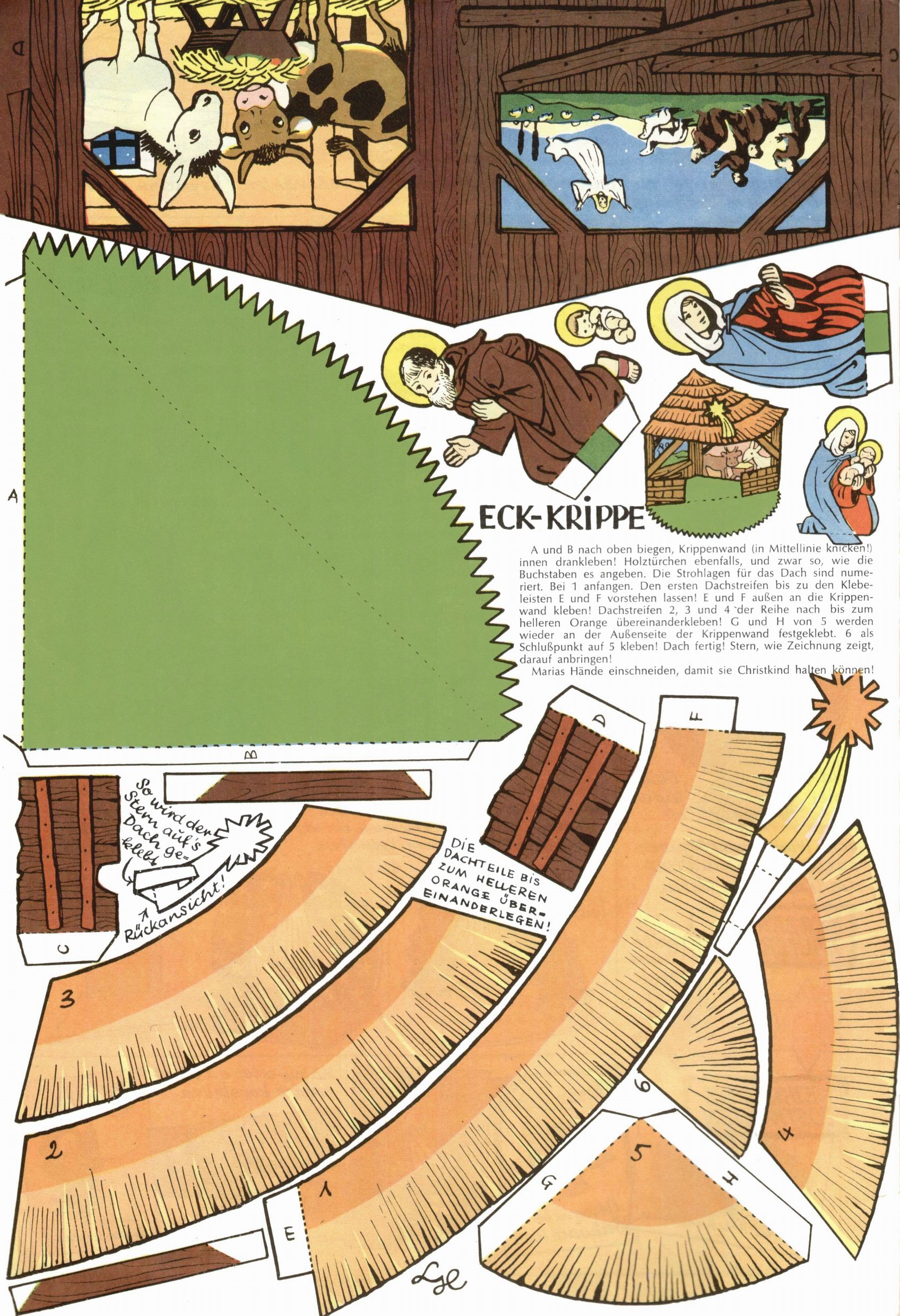 Die Wunderwelt im Festtagsgewand In den Sonderheften präsentierte sich die Wunderwelt wahrhaftig in Feiertagsstimmung. Mit wenigen Ausnahmen gab es pro Jahr drei Sonderhefte - zu Weihnachten bzw. im Advent, zu Ostern und in den Ferien im Sommer. Experimente mit Faschings- und Muttertagsheften hatten sich nicht bewährt. Selbst als es die Einzelhefte in der Krisensituation nach 1967 nicht mehr gab, wurde die Wunderwelt-Zeitung im Layout der Sonderhefte fortgesetzt: Zunächst mit 3 bis 5 und ab 1971 immerhin wieder mit 10-12 Heften pro Jahr. Die Weihnachts-, Oster- und Ferienhefte hatten naturgemäß verschiedene Schwerpunkte. Während im Sommer Spielen und Werken mit Material im Vordergrund stand, waren es zu Weihnachten Krippen und Adventhäuser; zu Ostern dann Erzählungen, Hasenstädte und Oster-Basteleien. Das bessere Papier der Sonderhefte erleichterte das Ausschneiden der insgesamt mehr als 1000 Papiermodelle erheblich. Die Sonderhefte waren vergleichsweise aufwändig gestaltet, aber auch ein wichtiges Zusatzgeschäft für die Zeitung. Die Kinder fieberten dem Erscheinungsdatum der jeweiligen Ausgabe nicht selten richtiggehend entgegen. Mit knapp 100 Seiten pro Jahr machten die Sonderhefte von der Menge her zwar nicht einmal ein Viertel aus, trugen aber zum Erscheinungsbild mindestens genauso viel bei wie die Standardhefte. Im Wesentlichen blieb das Layout der Sonderhefte über die Jahre hin unverändert. Mühselig wurde es, als man den Inhalt der Beiträge vorübergehend auf die Seiten gleichmäßig verteilte und die Kinder ermunterte, die Hefte in der Mitte zu zerschneiden. Die eine Hälfte enthielt dann etwa Erzählungen und Bastelvorschläge, der andere Teil der Zeitung Spielanleitungen. Zur übersichtlichkeit trugen diese Layoutversuche jedenfalls in keiner Weise bei und als besonderen Auswuchs gab es eine Zeitlang auf einer Seite oft mehrere Seitennummern, je nachdem, ob sich diese auf das Gesamtheft oder den herauszunehmenden und zu zerschneidenden Heftteil bezogen. Gegen Ende der 1950er Jahre kehrte man wieder zu einem ganzseitigen Layout zurück und Ideen wie ein Spiel-(Heft-im-)Heft gehörten der Vergangenheit an. In den Sonderheften experimentierte man dann noch ab Mitte der 1960er Jahre, als die Verkaufszahlen stark rückläufig waren, mit grundsätzlich neuen Darstellungsformen - weg vom Niedlich-Kitschigen und engagierte neue Grafikerinnen wie Gundi Groh und Hella Soyka. Den erhofften Erfolg brachte dies jedoch nicht mehr. |