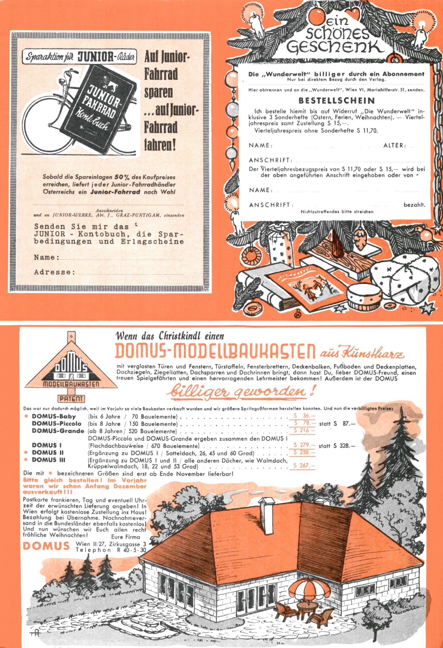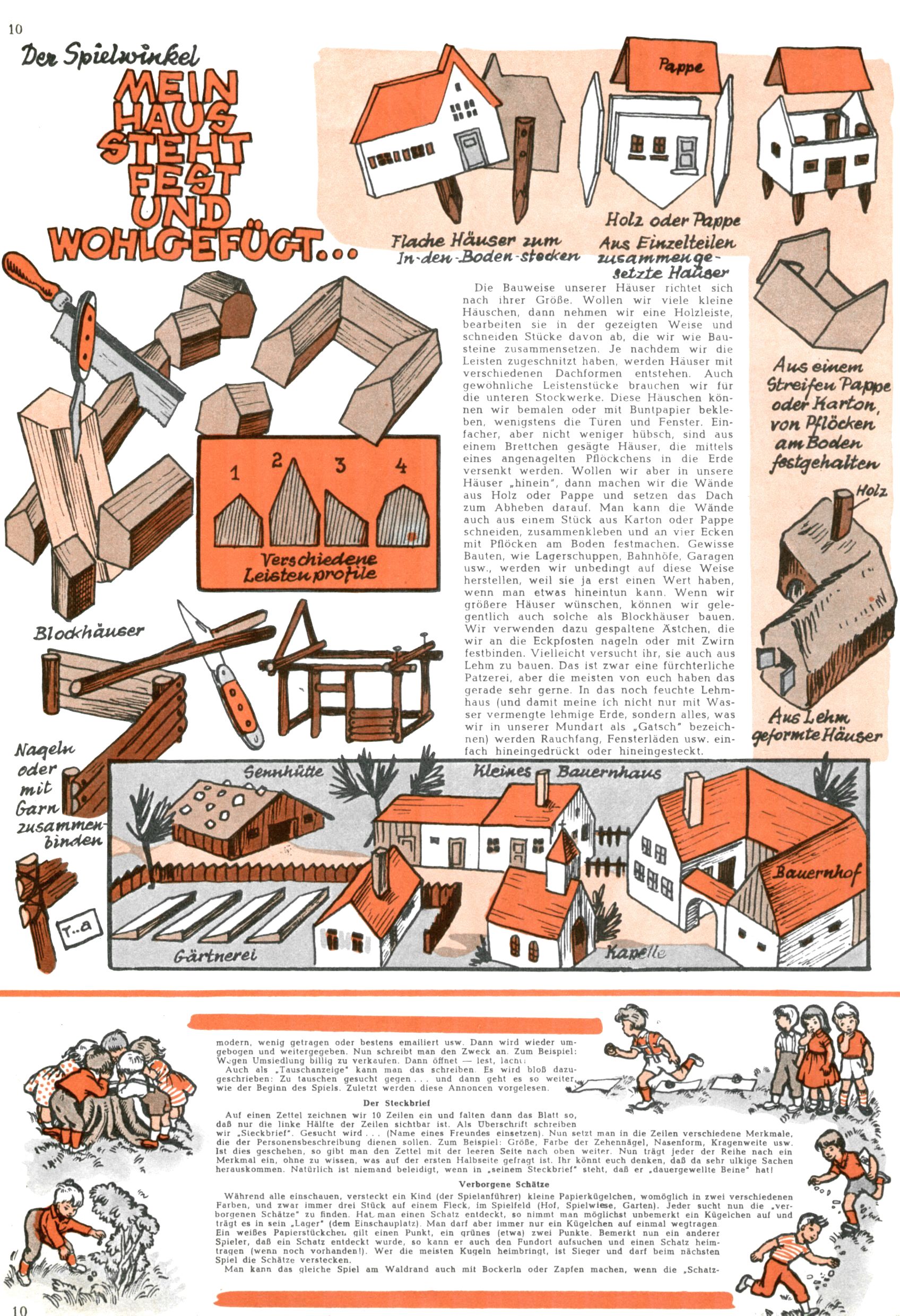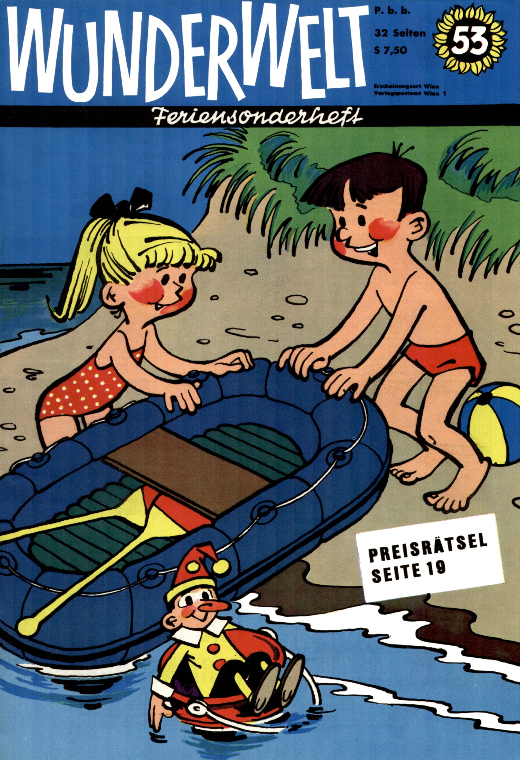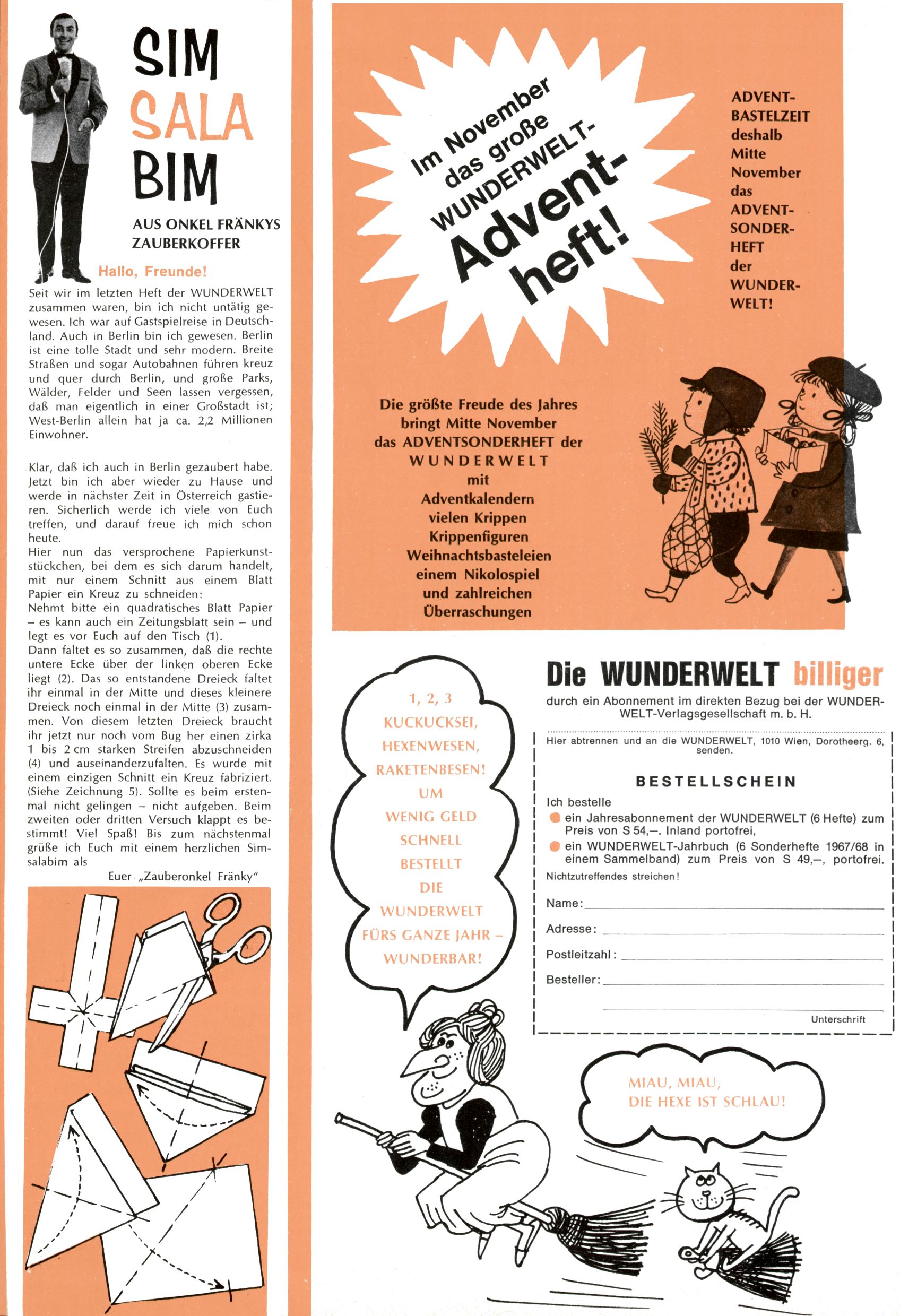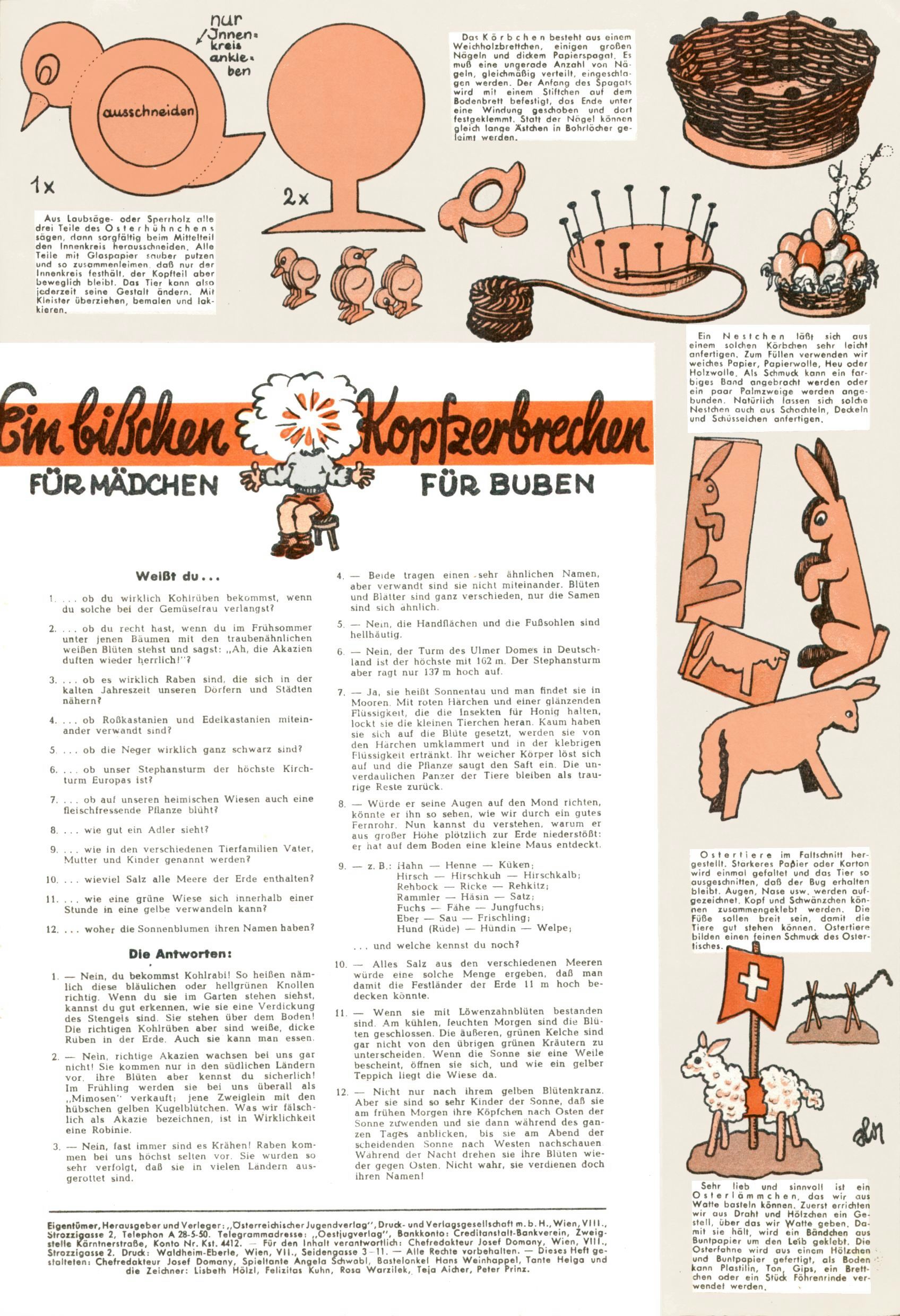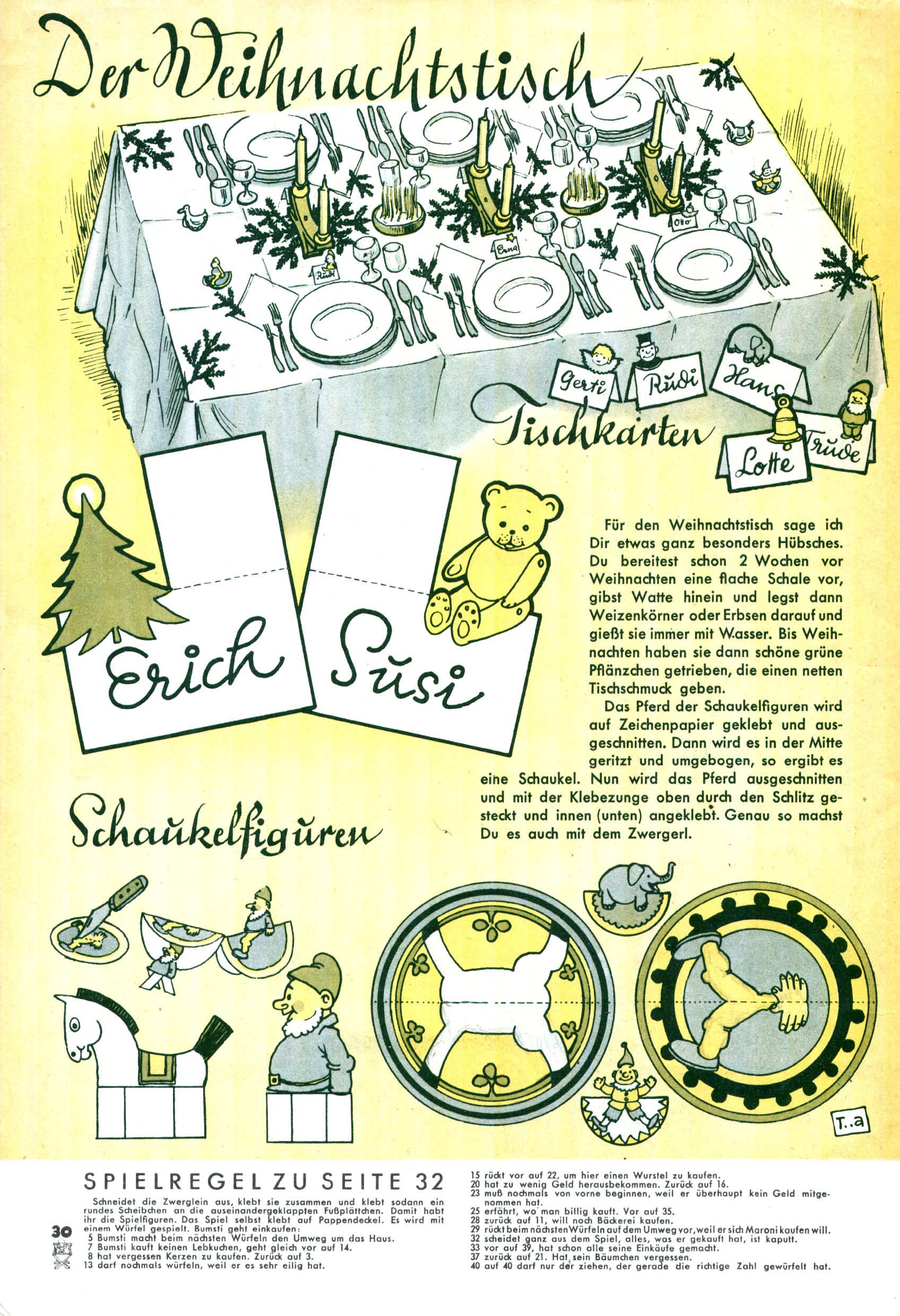 Die Wunderwelt im Festtagsgewand In den Sonderheften präsentierte sich die Wunderwelt wahrhaftig in Feiertagsstimmung. Mit wenigen Ausnahmen gab es pro Jahr drei Sonderhefte - zu Weihnachten bzw. im Advent, zu Ostern und in den Ferien im Sommer. Experimente mit Faschings- und Muttertagsheften hatten sich nicht bewährt. Selbst als es die Einzelhefte in der Krisensituation nach 1967 nicht mehr gab, wurde die Wunderwelt-Zeitung im Layout der Sonderhefte fortgesetzt: Zunächst mit 3 bis 5 und ab 1971 immerhin wieder mit 10-12 Heften pro Jahr. Die Weihnachts-, Oster- und Ferienhefte hatten naturgemäß verschiedene Schwerpunkte. Während im Sommer Spielen und Werken mit Material im Vordergrund stand, waren es zu Weihnachten Krippen und Adventhäuser; zu Ostern dann Erzählungen, Hasenstädte und Oster-Basteleien. Das bessere Papier der Sonderhefte erleichterte das Ausschneiden der insgesamt mehr als 1000 Papiermodelle erheblich. Die Sonderhefte waren vergleichsweise aufwändig gestaltet, aber auch ein wichtiges Zusatzgeschäft für die Zeitung. Die Kinder fieberten dem Erscheinungsdatum der jeweiligen Ausgabe nicht selten richtiggehend entgegen. Mit knapp 100 Seiten pro Jahr machten die Sonderhefte von der Menge her zwar nicht einmal ein Viertel aus, trugen aber zum Erscheinungsbild mindestens genauso viel bei wie die Standardhefte. Im Wesentlichen blieb das Layout der Sonderhefte über die Jahre hin unverändert. Mühselig wurde es, als man den Inhalt der Beiträge vorübergehend auf die Seiten gleichmäßig verteilte und die Kinder ermunterte, die Hefte in der Mitte zu zerschneiden. Die eine Hälfte enthielt dann etwa Erzählungen und Bastelvorschläge, der andere Teil der Zeitung Spielanleitungen. Zur übersichtlichkeit trugen diese Layoutversuche jedenfalls in keiner Weise bei und als besonderen Auswuchs gab es eine Zeitlang auf einer Seite oft mehrere Seitennummern, je nachdem, ob sich diese auf das Gesamtheft oder den herauszunehmenden und zu zerschneidenden Heftteil bezogen. Gegen Ende der 1950er Jahre kehrte man wieder zu einem ganzseitigen Layout zurück und Ideen wie ein Spiel-(Heft-im-)Heft gehörten der Vergangenheit an. In den Sonderheften experimentierte man dann noch ab Mitte der 1960er Jahre, als die Verkaufszahlen stark rückläufig waren, mit grundsätzlich neuen Darstellungsformen - weg vom Niedlich-Kitschigen und engagierte neue Grafikerinnen wie Gundi Groh und Hella Soyka. Den erhofften Erfolg brachte dies jedoch nicht mehr. |