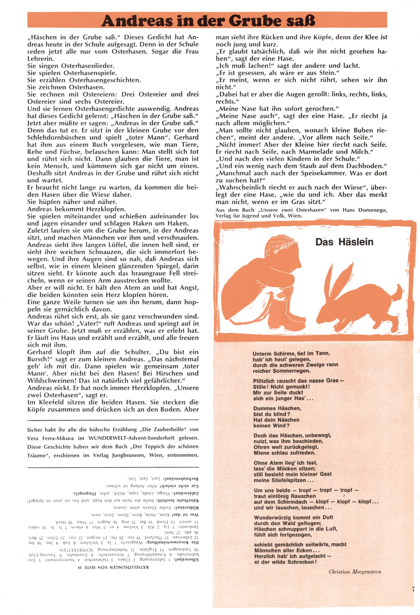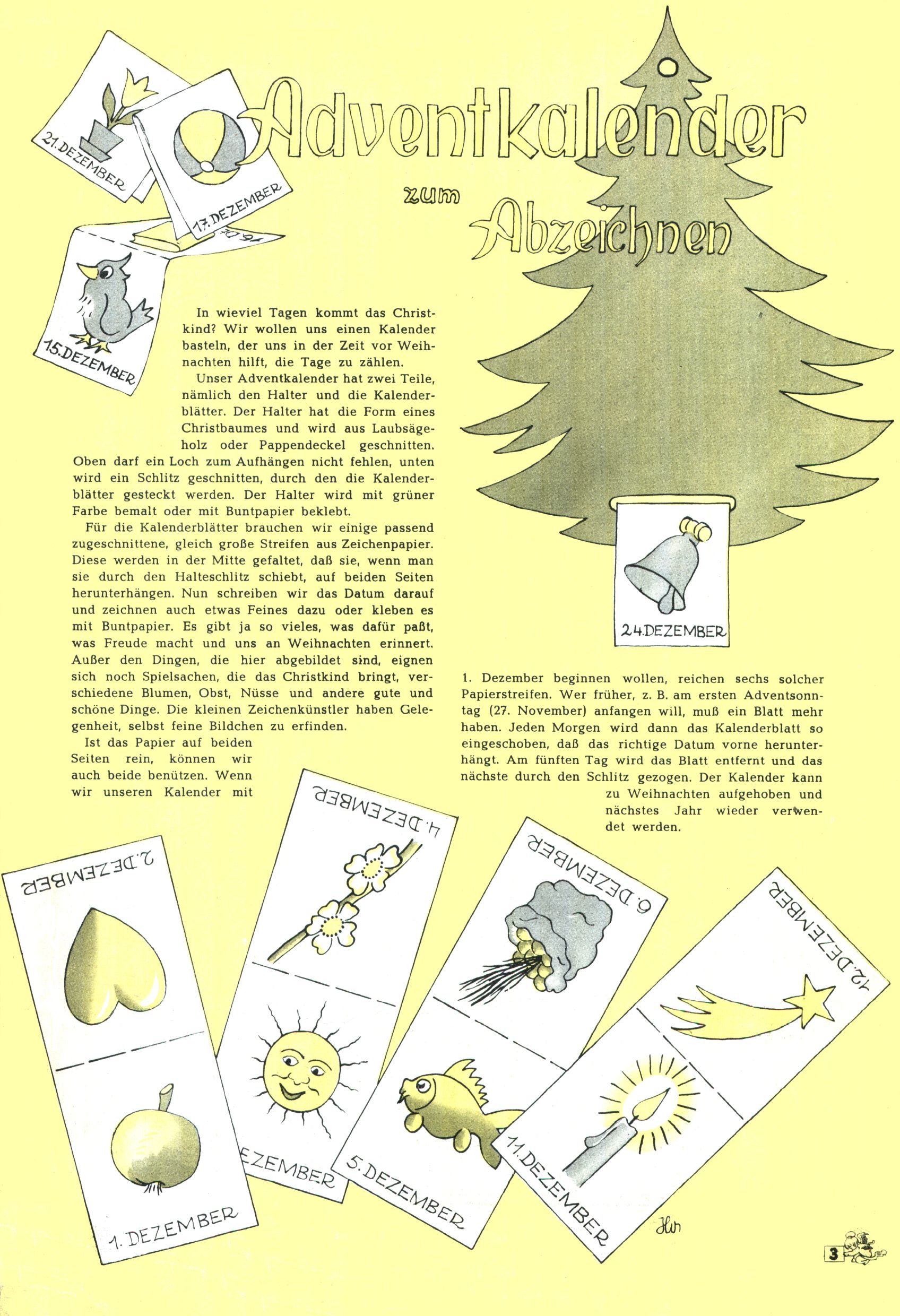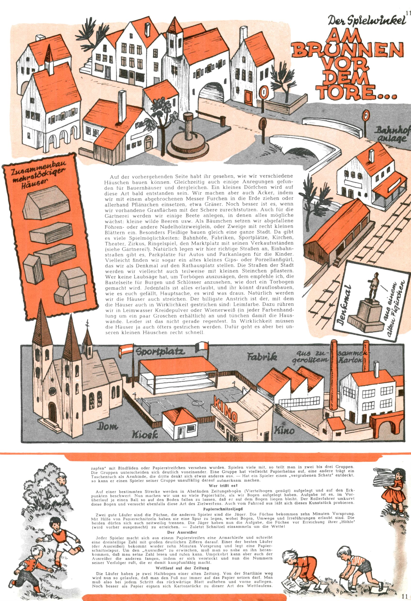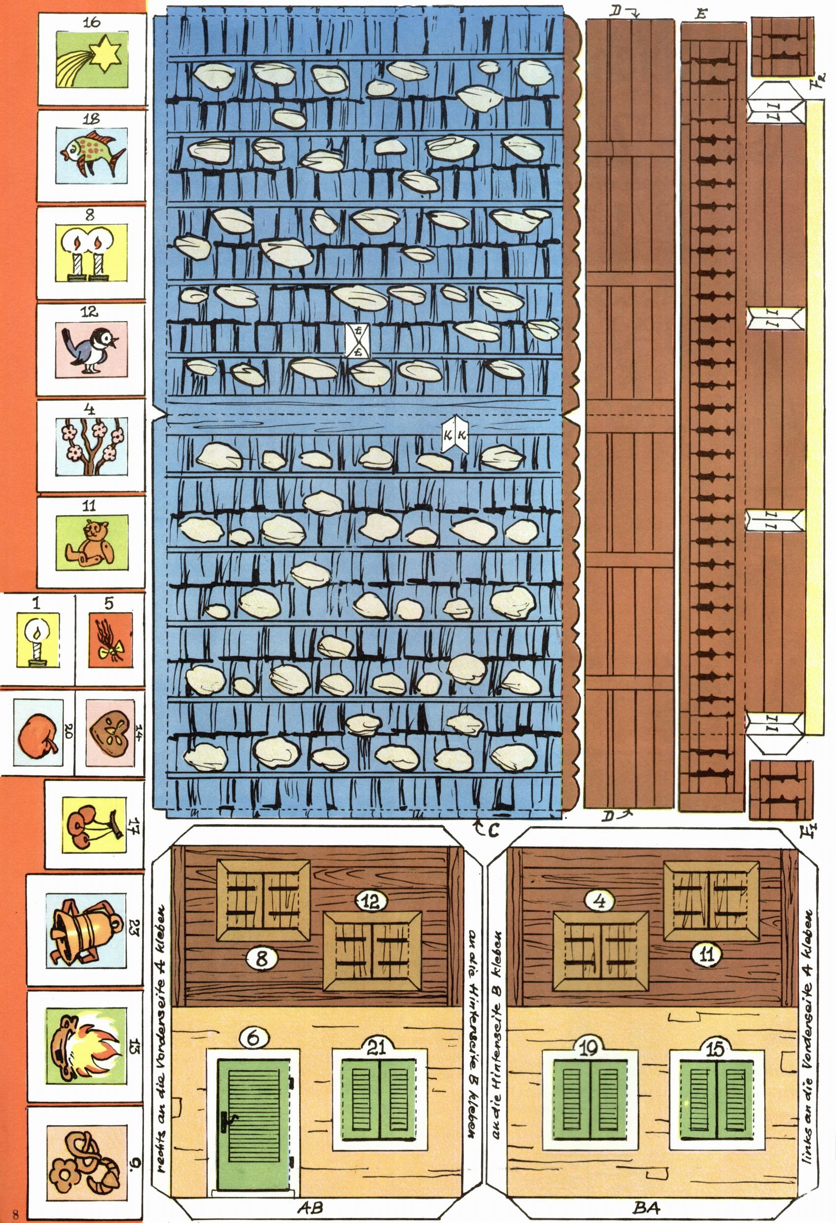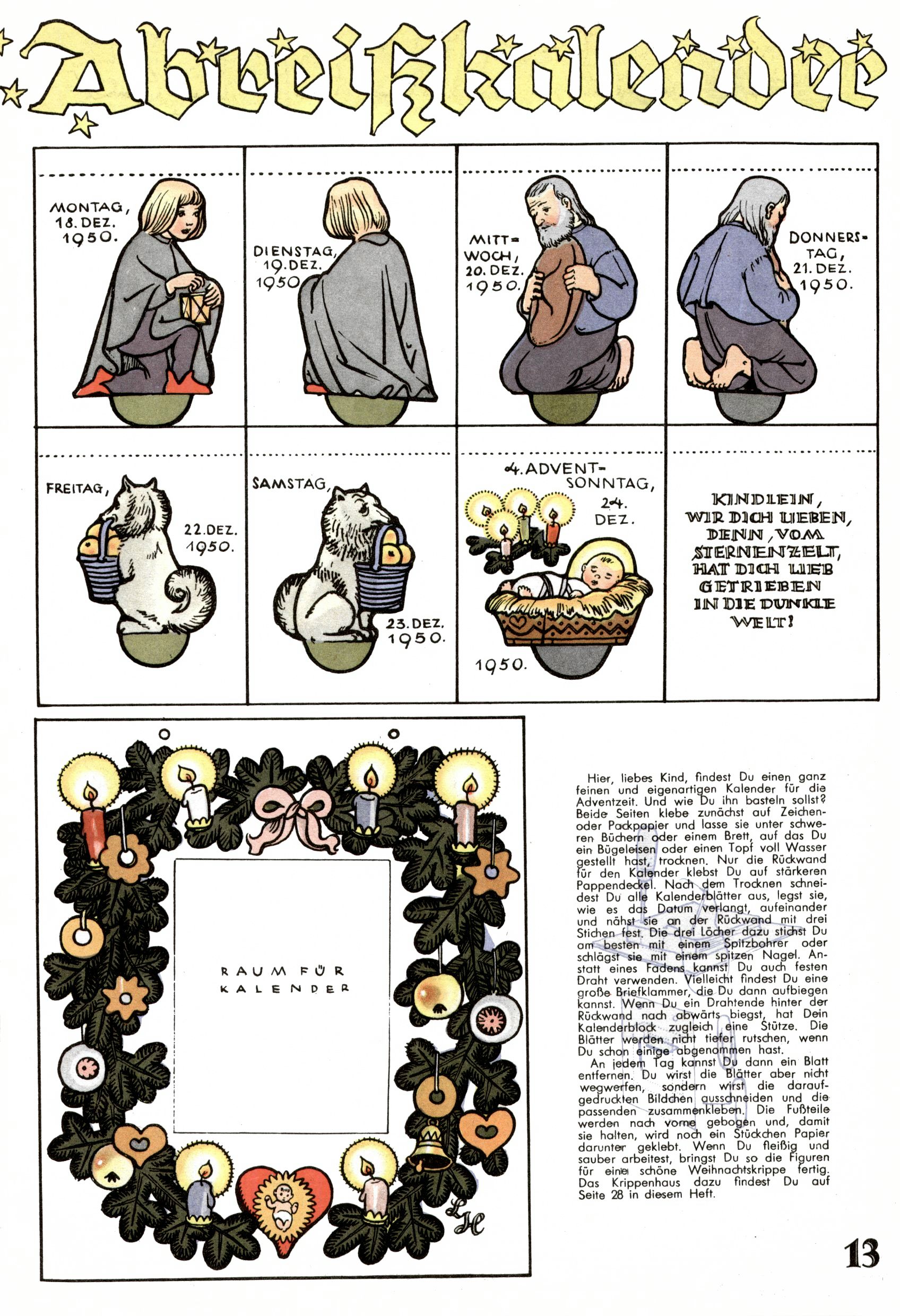 Die Wunderwelt im Festtagsgewand In den Sonderheften präsentierte sich die Wunderwelt wahrhaftig in Feiertagsstimmung. Mit wenigen Ausnahmen gab es pro Jahr drei Sonderhefte - zu Weihnachten bzw. im Advent, zu Ostern und in den Ferien im Sommer. Experimente mit Faschings- und Muttertagsheften hatten sich nicht bewährt. Selbst als es die Einzelhefte in der Krisensituation nach 1967 nicht mehr gab, wurde die Wunderwelt-Zeitung im Layout der Sonderhefte fortgesetzt: Zunächst mit 3 bis 5 und ab 1971 immerhin wieder mit 10-12 Heften pro Jahr. Die Weihnachts-, Oster- und Ferienhefte hatten naturgemäß verschiedene Schwerpunkte. Während im Sommer Spielen und Werken mit Material im Vordergrund stand, waren es zu Weihnachten Krippen und Adventhäuser; zu Ostern dann Erzählungen, Hasenstädte und Oster-Basteleien. Das bessere Papier der Sonderhefte erleichterte das Ausschneiden der insgesamt mehr als 1000 Papiermodelle erheblich. Die Sonderhefte waren vergleichsweise aufwändig gestaltet, aber auch ein wichtiges Zusatzgeschäft für die Zeitung. Die Kinder fieberten dem Erscheinungsdatum der jeweiligen Ausgabe nicht selten richtiggehend entgegen. Mit knapp 100 Seiten pro Jahr machten die Sonderhefte von der Menge her zwar nicht einmal ein Viertel aus, trugen aber zum Erscheinungsbild mindestens genauso viel bei wie die Standardhefte. Im Wesentlichen blieb das Layout der Sonderhefte über die Jahre hin unverändert. Mühselig wurde es, als man den Inhalt der Beiträge vorübergehend auf die Seiten gleichmäßig verteilte und die Kinder ermunterte, die Hefte in der Mitte zu zerschneiden. Die eine Hälfte enthielt dann etwa Erzählungen und Bastelvorschläge, der andere Teil der Zeitung Spielanleitungen. Zur übersichtlichkeit trugen diese Layoutversuche jedenfalls in keiner Weise bei und als besonderen Auswuchs gab es eine Zeitlang auf einer Seite oft mehrere Seitennummern, je nachdem, ob sich diese auf das Gesamtheft oder den herauszunehmenden und zu zerschneidenden Heftteil bezogen. Gegen Ende der 1950er Jahre kehrte man wieder zu einem ganzseitigen Layout zurück und Ideen wie ein Spiel-(Heft-im-)Heft gehörten der Vergangenheit an. In den Sonderheften experimentierte man dann noch ab Mitte der 1960er Jahre, als die Verkaufszahlen stark rückläufig waren, mit grundsätzlich neuen Darstellungsformen - weg vom Niedlich-Kitschigen und engagierte neue Grafikerinnen wie Gundi Groh und Hella Soyka. Den erhofften Erfolg brachte dies jedoch nicht mehr. |
