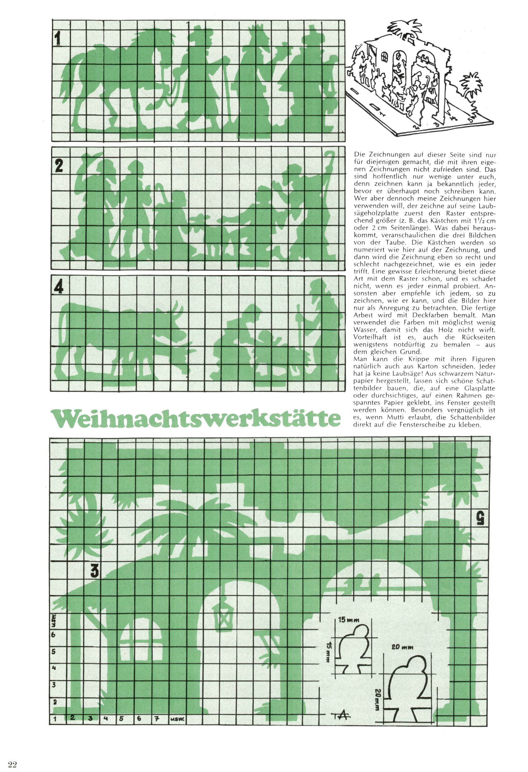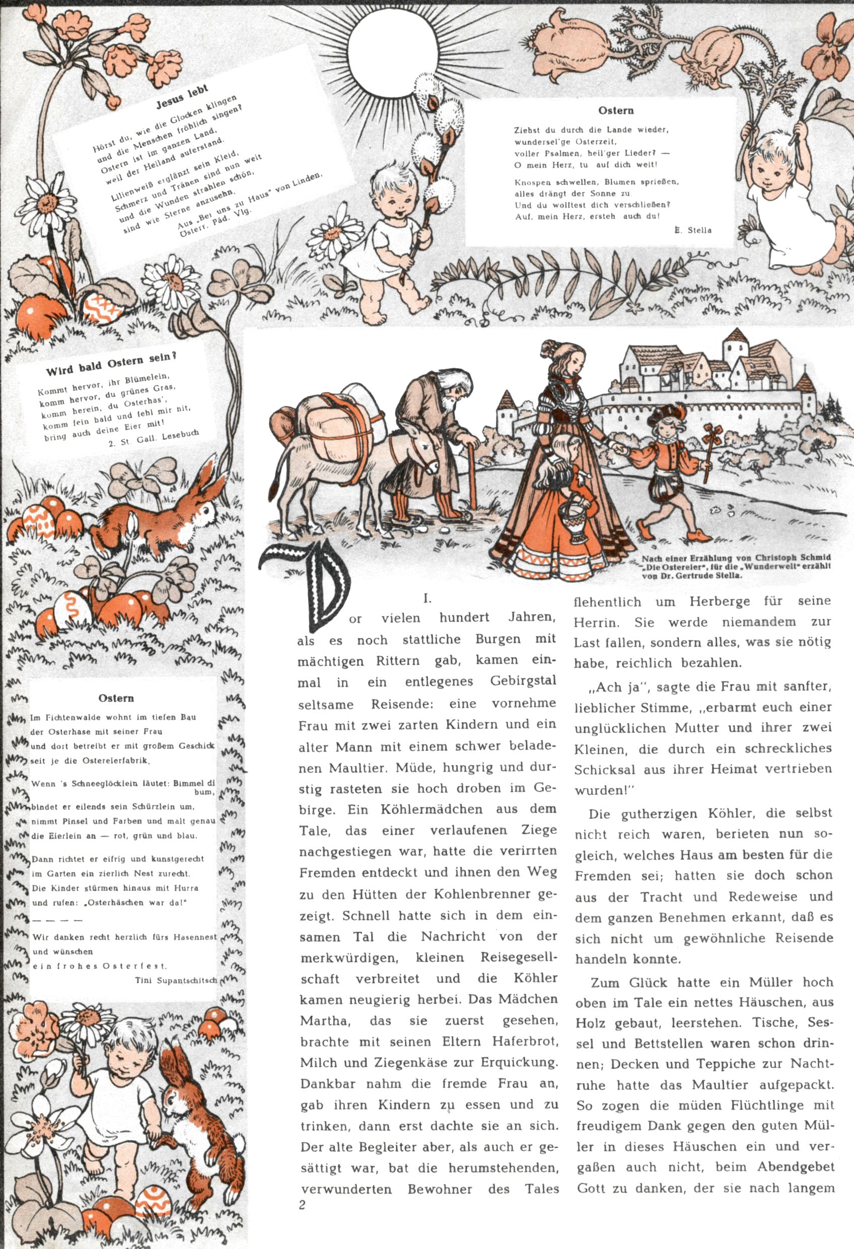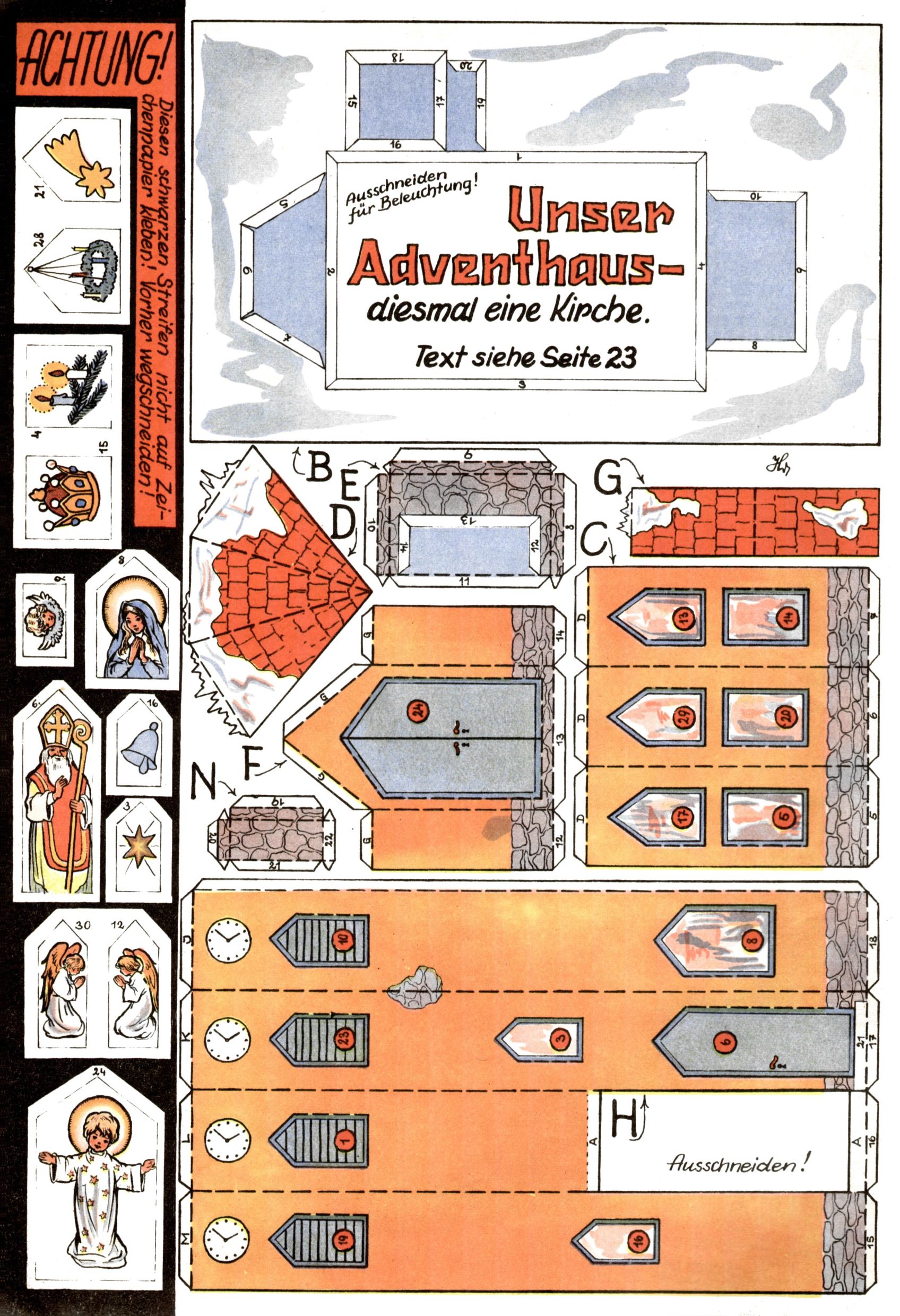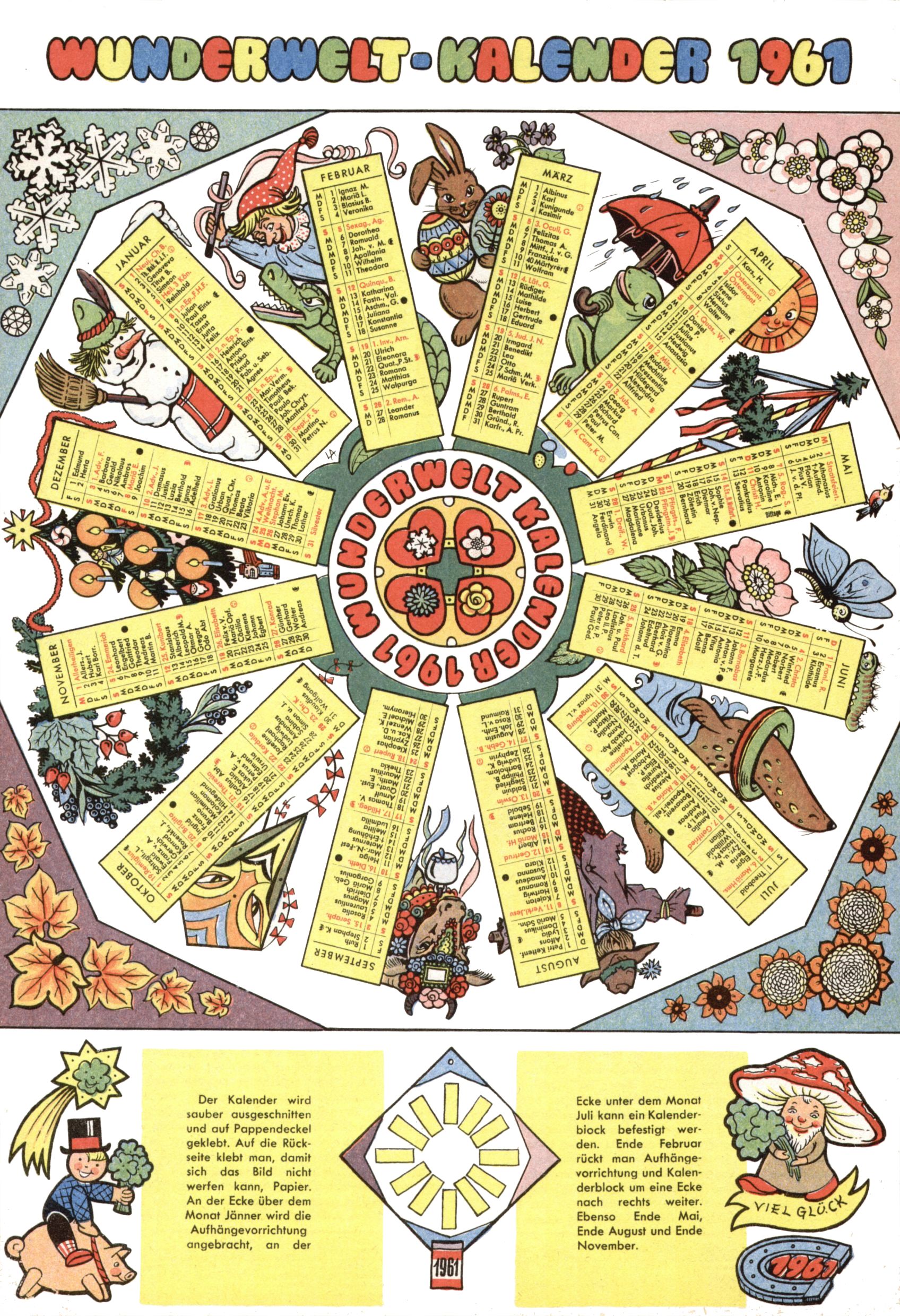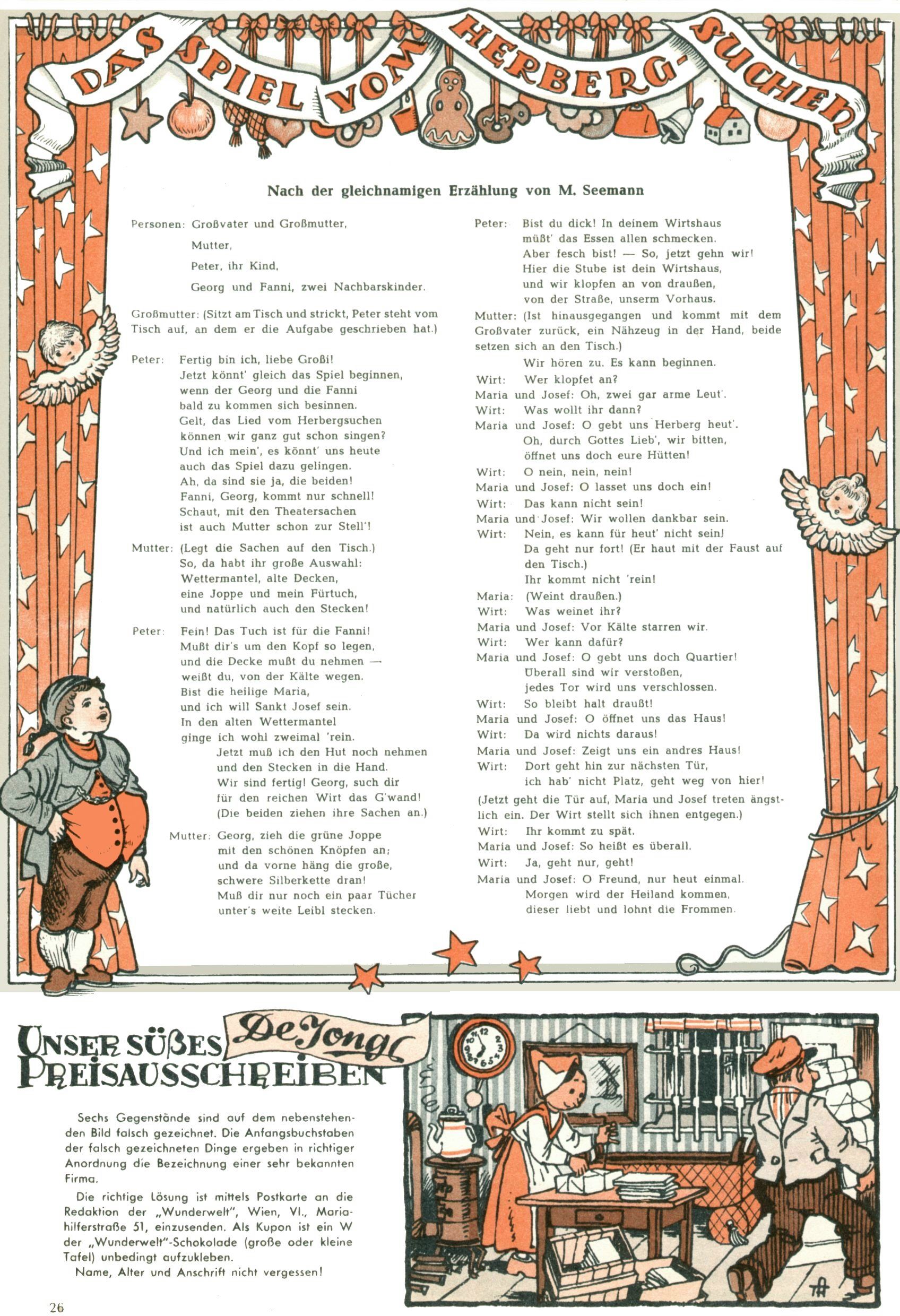 Die Wunderwelt im Festtagsgewand In den Sonderheften präsentierte sich die Wunderwelt wahrhaftig in Feiertagsstimmung. Mit wenigen Ausnahmen gab es pro Jahr drei Sonderhefte - zu Weihnachten bzw. im Advent, zu Ostern und in den Ferien im Sommer. Experimente mit Faschings- und Muttertagsheften hatten sich nicht bewährt. Selbst als es die Einzelhefte in der Krisensituation nach 1967 nicht mehr gab, wurde die Wunderwelt-Zeitung im Layout der Sonderhefte fortgesetzt: Zunächst mit 3 bis 5 und ab 1971 immerhin wieder mit 10-12 Heften pro Jahr. Die Weihnachts-, Oster- und Ferienhefte hatten naturgemäß verschiedene Schwerpunkte. Während im Sommer Spielen und Werken mit Material im Vordergrund stand, waren es zu Weihnachten Krippen und Adventhäuser; zu Ostern dann Erzählungen, Hasenstädte und Oster-Basteleien. Das bessere Papier der Sonderhefte erleichterte das Ausschneiden der insgesamt mehr als 1000 Papiermodelle erheblich. Die Sonderhefte waren vergleichsweise aufwändig gestaltet, aber auch ein wichtiges Zusatzgeschäft für die Zeitung. Die Kinder fieberten dem Erscheinungsdatum der jeweiligen Ausgabe nicht selten richtiggehend entgegen. Mit knapp 100 Seiten pro Jahr machten die Sonderhefte von der Menge her zwar nicht einmal ein Viertel aus, trugen aber zum Erscheinungsbild mindestens genauso viel bei wie die Standardhefte. Im Wesentlichen blieb das Layout der Sonderhefte über die Jahre hin unverändert. Mühselig wurde es, als man den Inhalt der Beiträge vorübergehend auf die Seiten gleichmäßig verteilte und die Kinder ermunterte, die Hefte in der Mitte zu zerschneiden. Die eine Hälfte enthielt dann etwa Erzählungen und Bastelvorschläge, der andere Teil der Zeitung Spielanleitungen. Zur übersichtlichkeit trugen diese Layoutversuche jedenfalls in keiner Weise bei und als besonderen Auswuchs gab es eine Zeitlang auf einer Seite oft mehrere Seitennummern, je nachdem, ob sich diese auf das Gesamtheft oder den herauszunehmenden und zu zerschneidenden Heftteil bezogen. Gegen Ende der 1950er Jahre kehrte man wieder zu einem ganzseitigen Layout zurück und Ideen wie ein Spiel-(Heft-im-)Heft gehörten der Vergangenheit an. In den Sonderheften experimentierte man dann noch ab Mitte der 1960er Jahre, als die Verkaufszahlen stark rückläufig waren, mit grundsätzlich neuen Darstellungsformen - weg vom Niedlich-Kitschigen und engagierte neue Grafikerinnen wie Gundi Groh und Hella Soyka. Den erhofften Erfolg brachte dies jedoch nicht mehr. |
