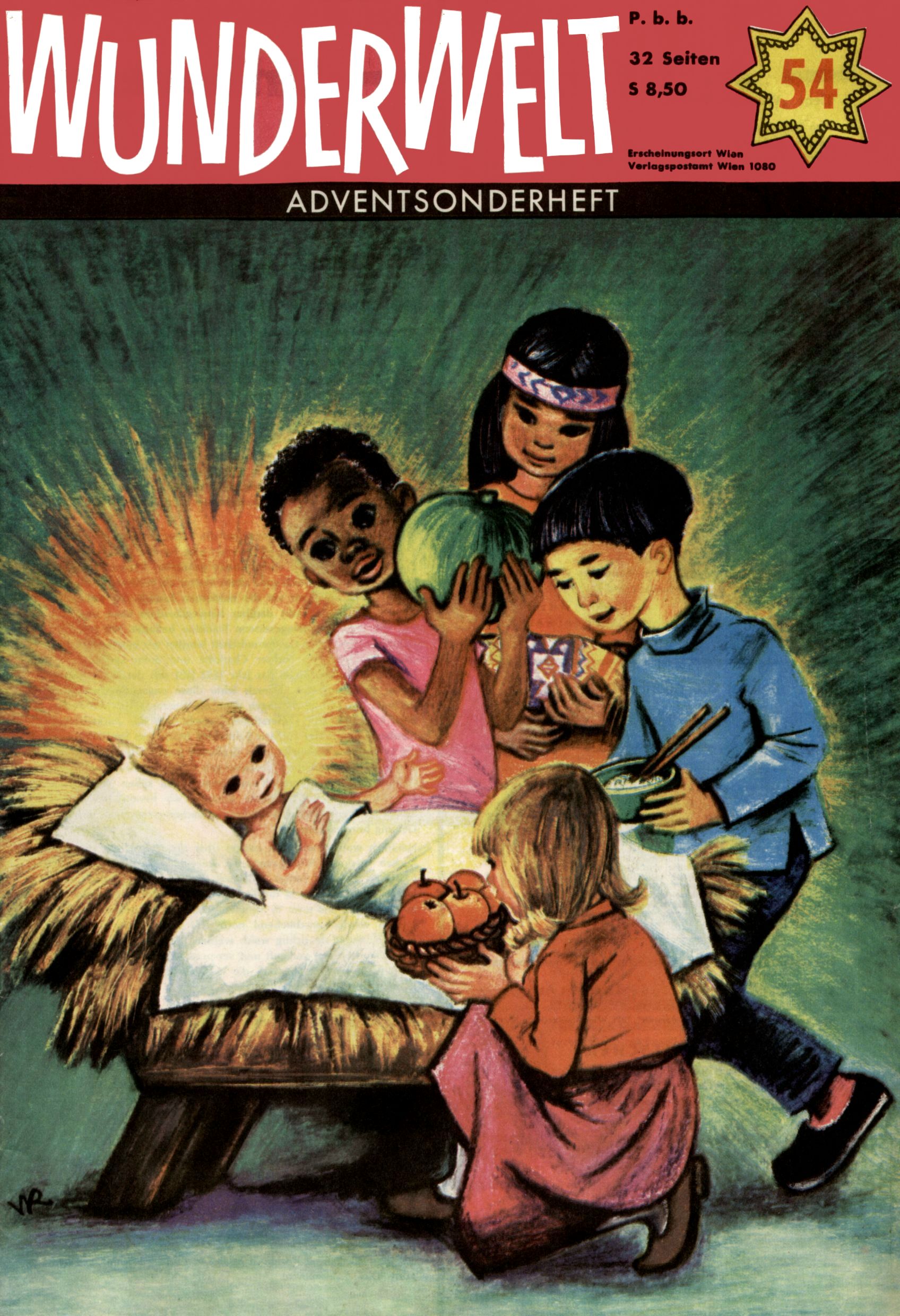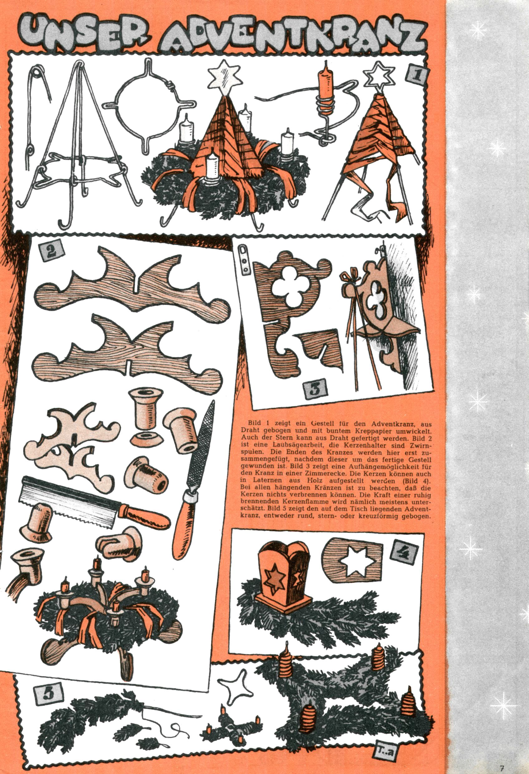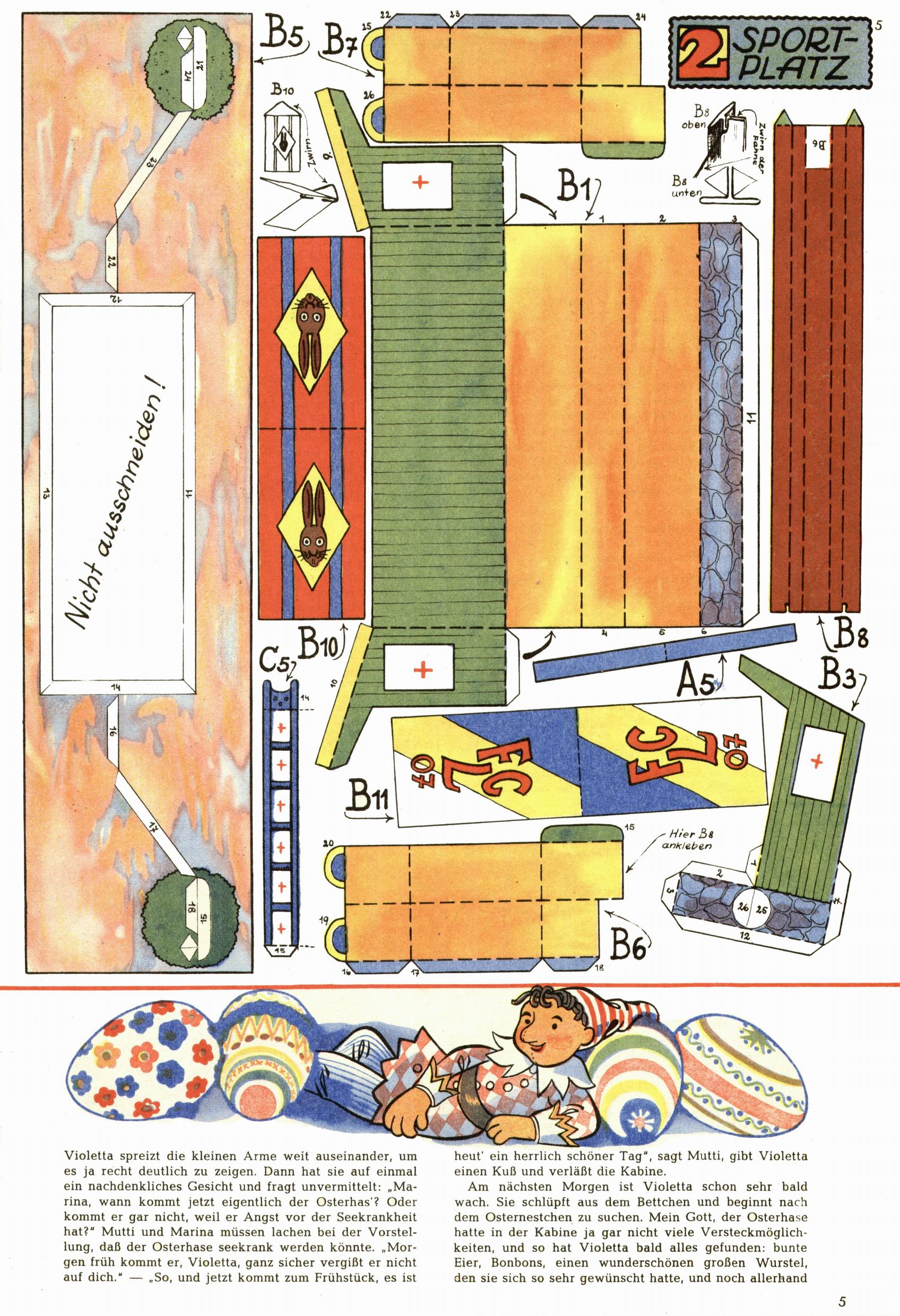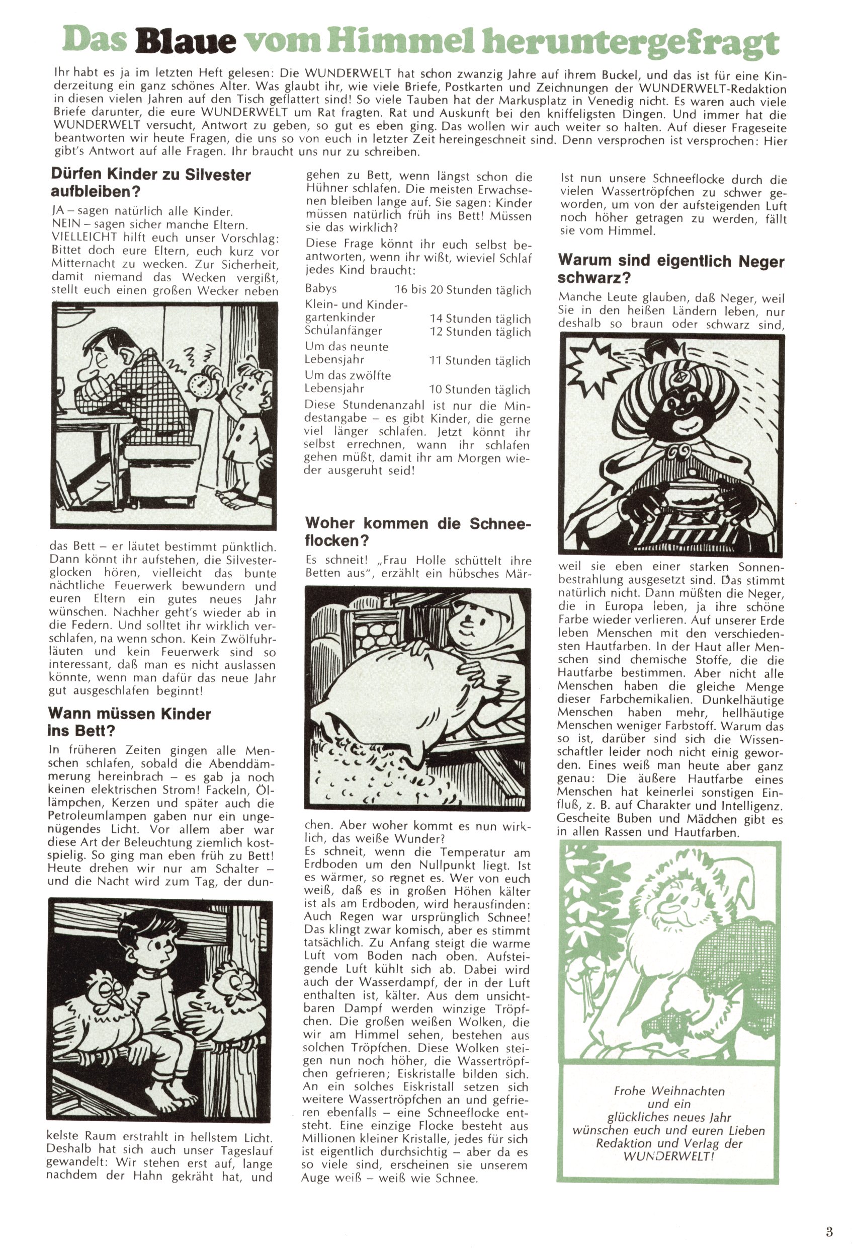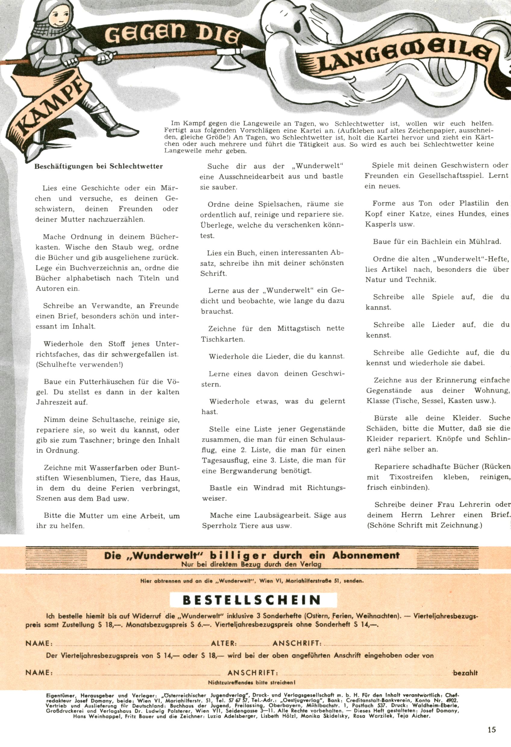 Die Wunderwelt im Festtagsgewand In den Sonderheften präsentierte sich die Wunderwelt wahrhaftig in Feiertagsstimmung. Mit wenigen Ausnahmen gab es pro Jahr drei Sonderhefte - zu Weihnachten bzw. im Advent, zu Ostern und in den Ferien im Sommer. Experimente mit Faschings- und Muttertagsheften hatten sich nicht bewährt. Selbst als es die Einzelhefte in der Krisensituation nach 1967 nicht mehr gab, wurde die Wunderwelt-Zeitung im Layout der Sonderhefte fortgesetzt: Zunächst mit 3 bis 5 und ab 1971 immerhin wieder mit 10-12 Heften pro Jahr. Die Weihnachts-, Oster- und Ferienhefte hatten naturgemäß verschiedene Schwerpunkte. Während im Sommer Spielen und Werken mit Material im Vordergrund stand, waren es zu Weihnachten Krippen und Adventhäuser; zu Ostern dann Erzählungen, Hasenstädte und Oster-Basteleien. Das bessere Papier der Sonderhefte erleichterte das Ausschneiden der insgesamt mehr als 1000 Papiermodelle erheblich. Die Sonderhefte waren vergleichsweise aufwändig gestaltet, aber auch ein wichtiges Zusatzgeschäft für die Zeitung. Die Kinder fieberten dem Erscheinungsdatum der jeweiligen Ausgabe nicht selten richtiggehend entgegen. Mit knapp 100 Seiten pro Jahr machten die Sonderhefte von der Menge her zwar nicht einmal ein Viertel aus, trugen aber zum Erscheinungsbild mindestens genauso viel bei wie die Standardhefte. Im Wesentlichen blieb das Layout der Sonderhefte über die Jahre hin unverändert. Mühselig wurde es, als man den Inhalt der Beiträge vorübergehend auf die Seiten gleichmäßig verteilte und die Kinder ermunterte, die Hefte in der Mitte zu zerschneiden. Die eine Hälfte enthielt dann etwa Erzählungen und Bastelvorschläge, der andere Teil der Zeitung Spielanleitungen. Zur übersichtlichkeit trugen diese Layoutversuche jedenfalls in keiner Weise bei und als besonderen Auswuchs gab es eine Zeitlang auf einer Seite oft mehrere Seitennummern, je nachdem, ob sich diese auf das Gesamtheft oder den herauszunehmenden und zu zerschneidenden Heftteil bezogen. Gegen Ende der 1950er Jahre kehrte man wieder zu einem ganzseitigen Layout zurück und Ideen wie ein Spiel-(Heft-im-)Heft gehörten der Vergangenheit an. In den Sonderheften experimentierte man dann noch ab Mitte der 1960er Jahre, als die Verkaufszahlen stark rückläufig waren, mit grundsätzlich neuen Darstellungsformen - weg vom Niedlich-Kitschigen und engagierte neue Grafikerinnen wie Gundi Groh und Hella Soyka. Den erhofften Erfolg brachte dies jedoch nicht mehr. |