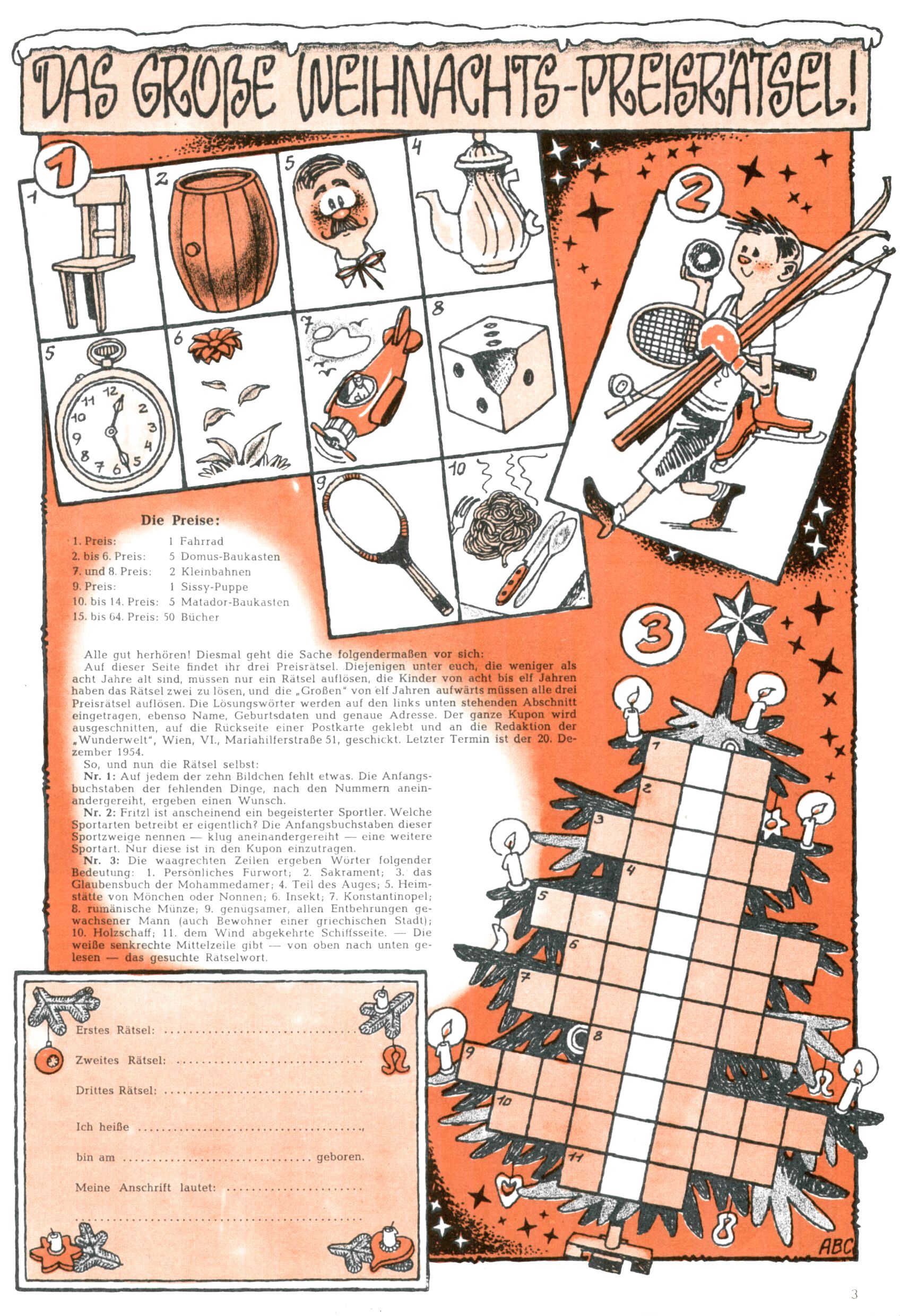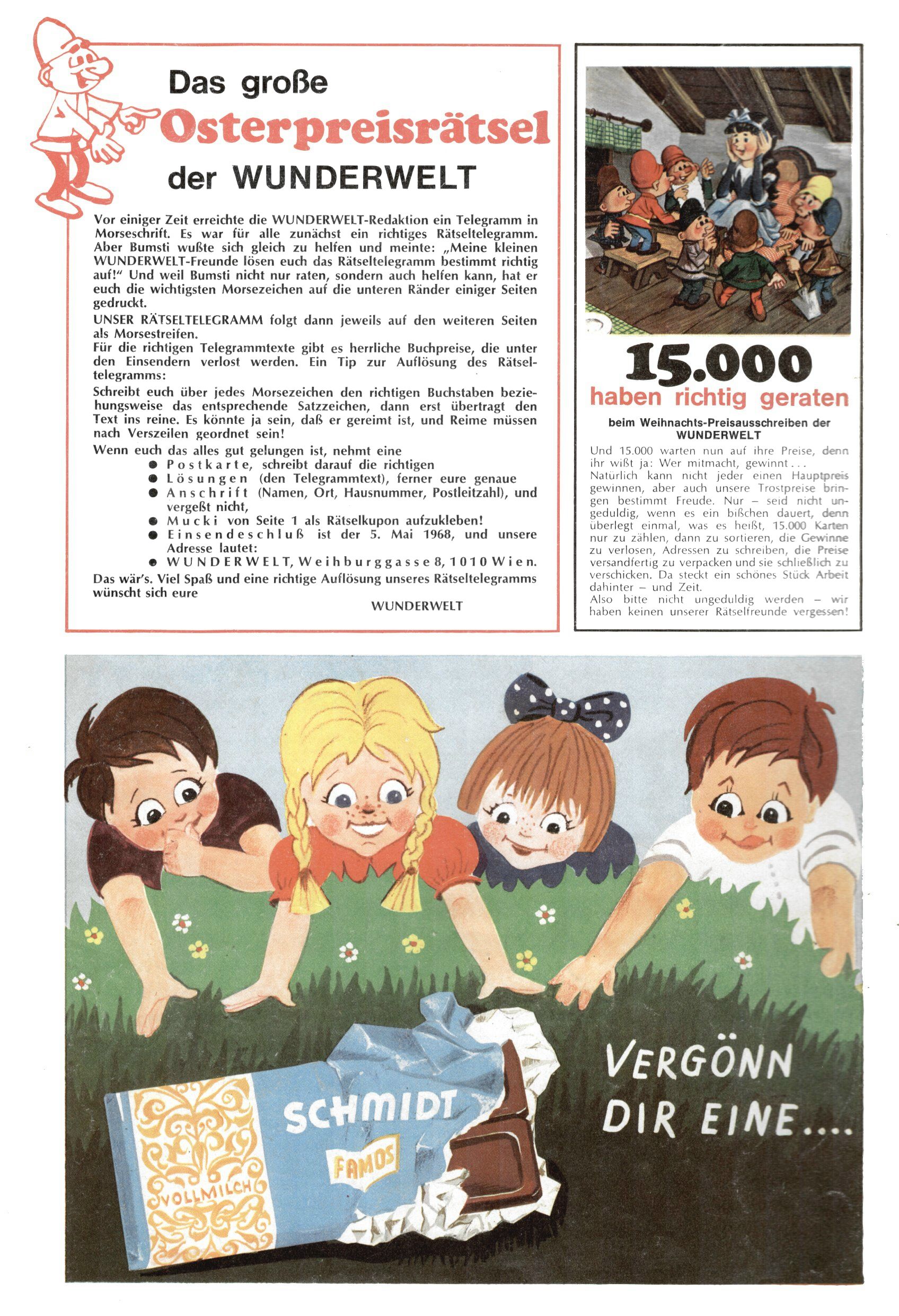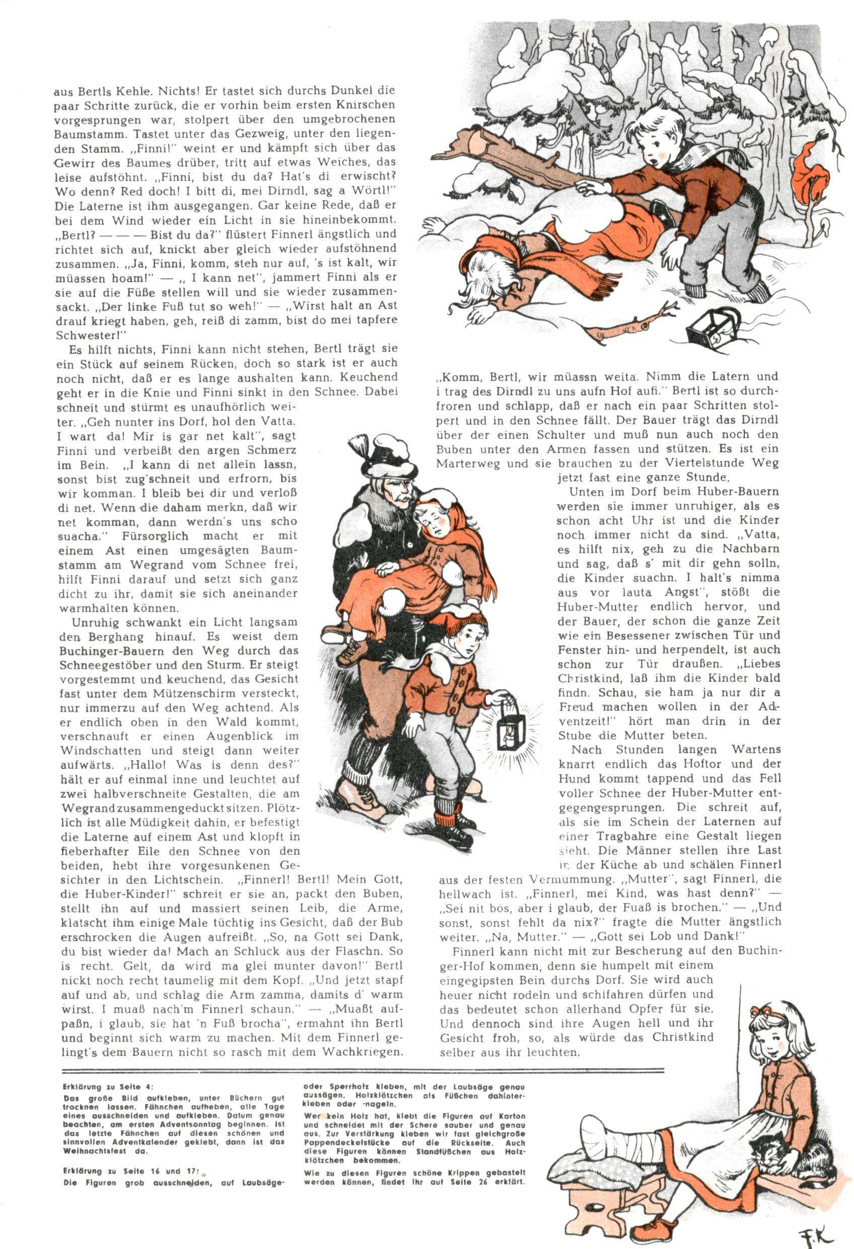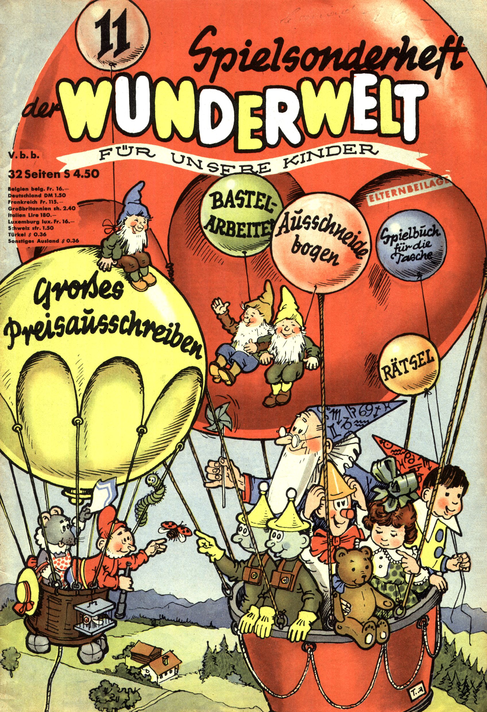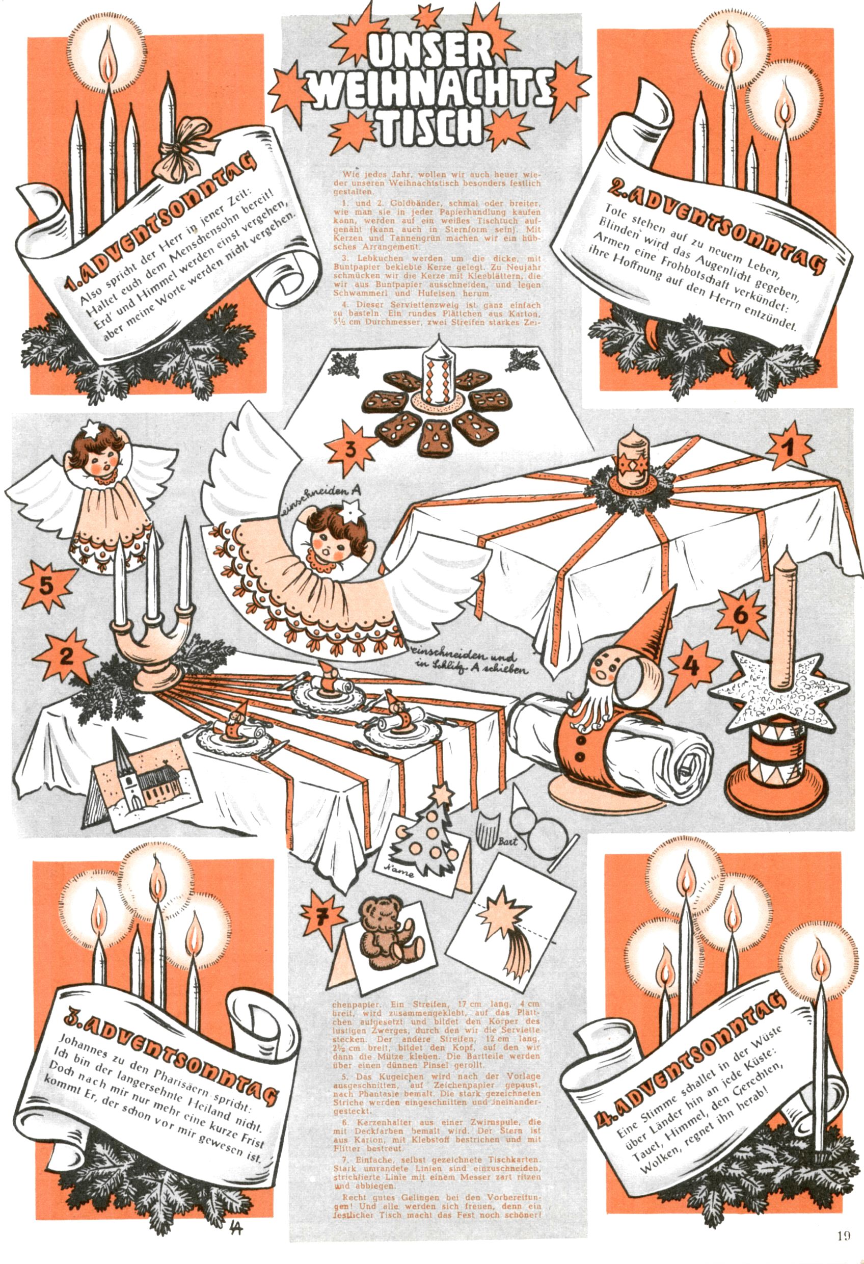 Die Wunderwelt im Festtagsgewand In den Sonderheften präsentierte sich die Wunderwelt wahrhaftig in Feiertagsstimmung. Mit wenigen Ausnahmen gab es pro Jahr drei Sonderhefte - zu Weihnachten bzw. im Advent, zu Ostern und in den Ferien im Sommer. Experimente mit Faschings- und Muttertagsheften hatten sich nicht bewährt. Selbst als es die Einzelhefte in der Krisensituation nach 1967 nicht mehr gab, wurde die Wunderwelt-Zeitung im Layout der Sonderhefte fortgesetzt: Zunächst mit 3 bis 5 und ab 1971 immerhin wieder mit 10-12 Heften pro Jahr. Die Weihnachts-, Oster- und Ferienhefte hatten naturgemäß verschiedene Schwerpunkte. Während im Sommer Spielen und Werken mit Material im Vordergrund stand, waren es zu Weihnachten Krippen und Adventhäuser; zu Ostern dann Erzählungen, Hasenstädte und Oster-Basteleien. Das bessere Papier der Sonderhefte erleichterte das Ausschneiden der insgesamt mehr als 1000 Papiermodelle erheblich. Die Sonderhefte waren vergleichsweise aufwändig gestaltet, aber auch ein wichtiges Zusatzgeschäft für die Zeitung. Die Kinder fieberten dem Erscheinungsdatum der jeweiligen Ausgabe nicht selten richtiggehend entgegen. Mit knapp 100 Seiten pro Jahr machten die Sonderhefte von der Menge her zwar nicht einmal ein Viertel aus, trugen aber zum Erscheinungsbild mindestens genauso viel bei wie die Standardhefte. Im Wesentlichen blieb das Layout der Sonderhefte über die Jahre hin unverändert. Mühselig wurde es, als man den Inhalt der Beiträge vorübergehend auf die Seiten gleichmäßig verteilte und die Kinder ermunterte, die Hefte in der Mitte zu zerschneiden. Die eine Hälfte enthielt dann etwa Erzählungen und Bastelvorschläge, der andere Teil der Zeitung Spielanleitungen. Zur übersichtlichkeit trugen diese Layoutversuche jedenfalls in keiner Weise bei und als besonderen Auswuchs gab es eine Zeitlang auf einer Seite oft mehrere Seitennummern, je nachdem, ob sich diese auf das Gesamtheft oder den herauszunehmenden und zu zerschneidenden Heftteil bezogen. Gegen Ende der 1950er Jahre kehrte man wieder zu einem ganzseitigen Layout zurück und Ideen wie ein Spiel-(Heft-im-)Heft gehörten der Vergangenheit an. In den Sonderheften experimentierte man dann noch ab Mitte der 1960er Jahre, als die Verkaufszahlen stark rückläufig waren, mit grundsätzlich neuen Darstellungsformen - weg vom Niedlich-Kitschigen und engagierte neue Grafikerinnen wie Gundi Groh und Hella Soyka. Den erhofften Erfolg brachte dies jedoch nicht mehr. |