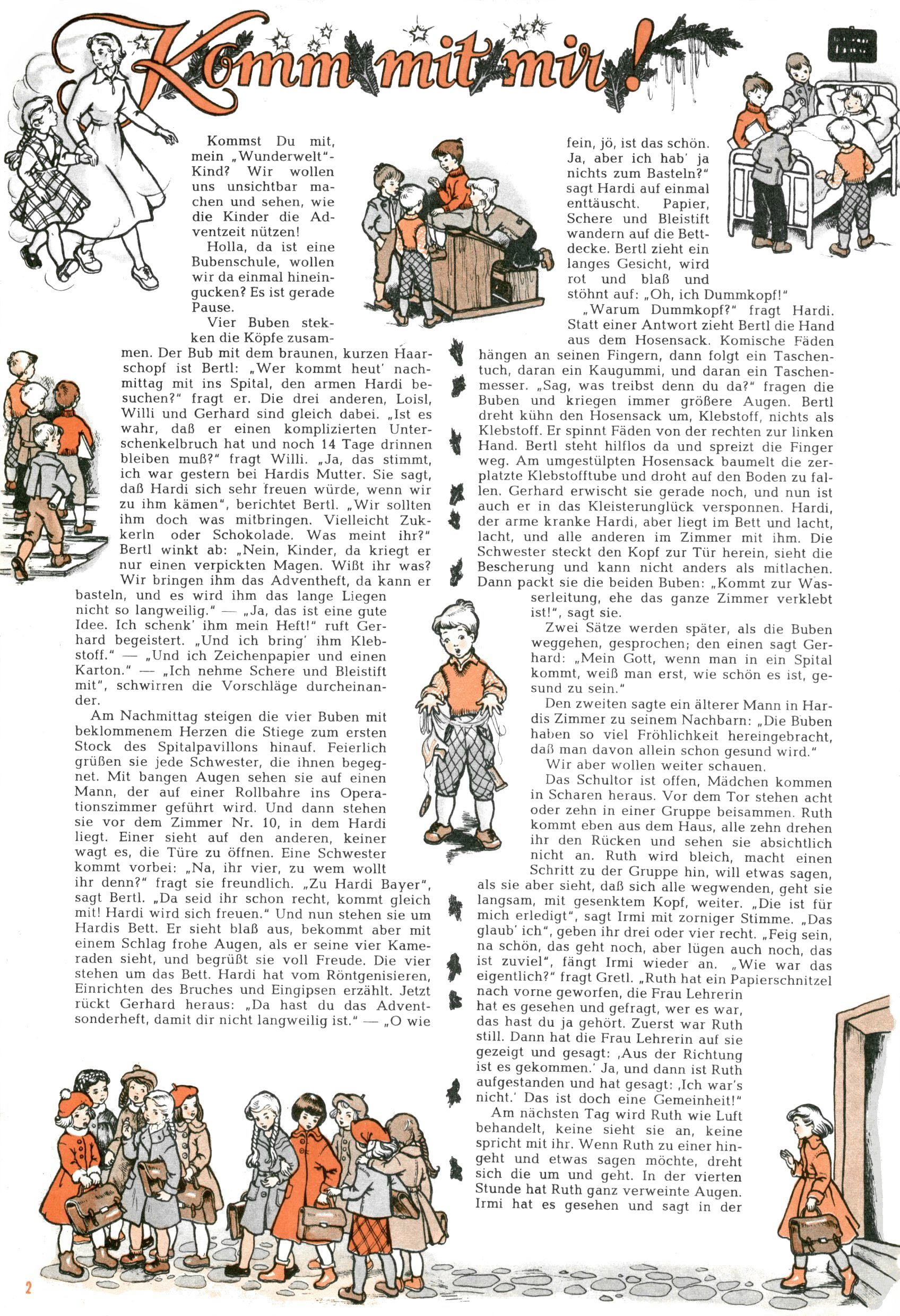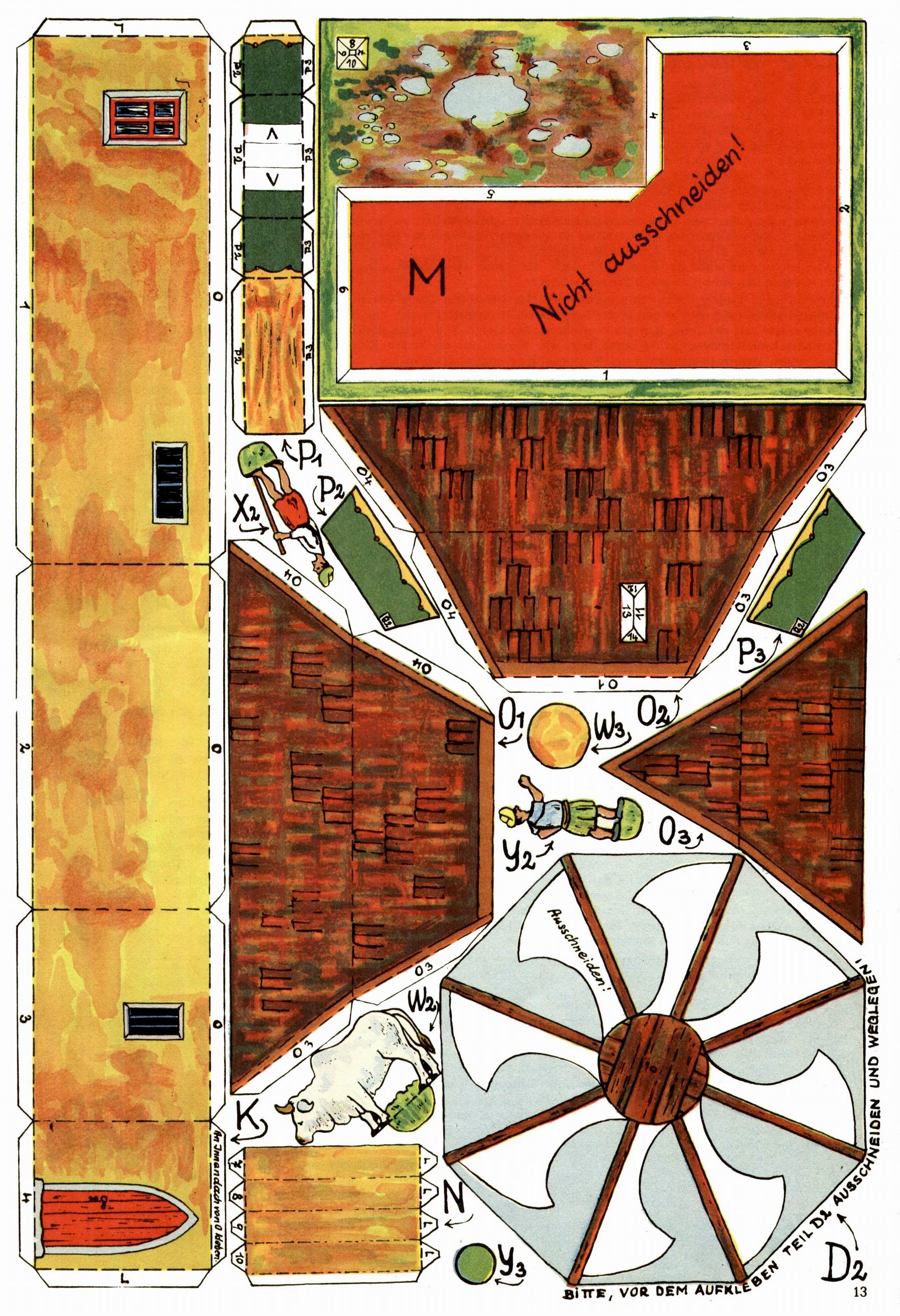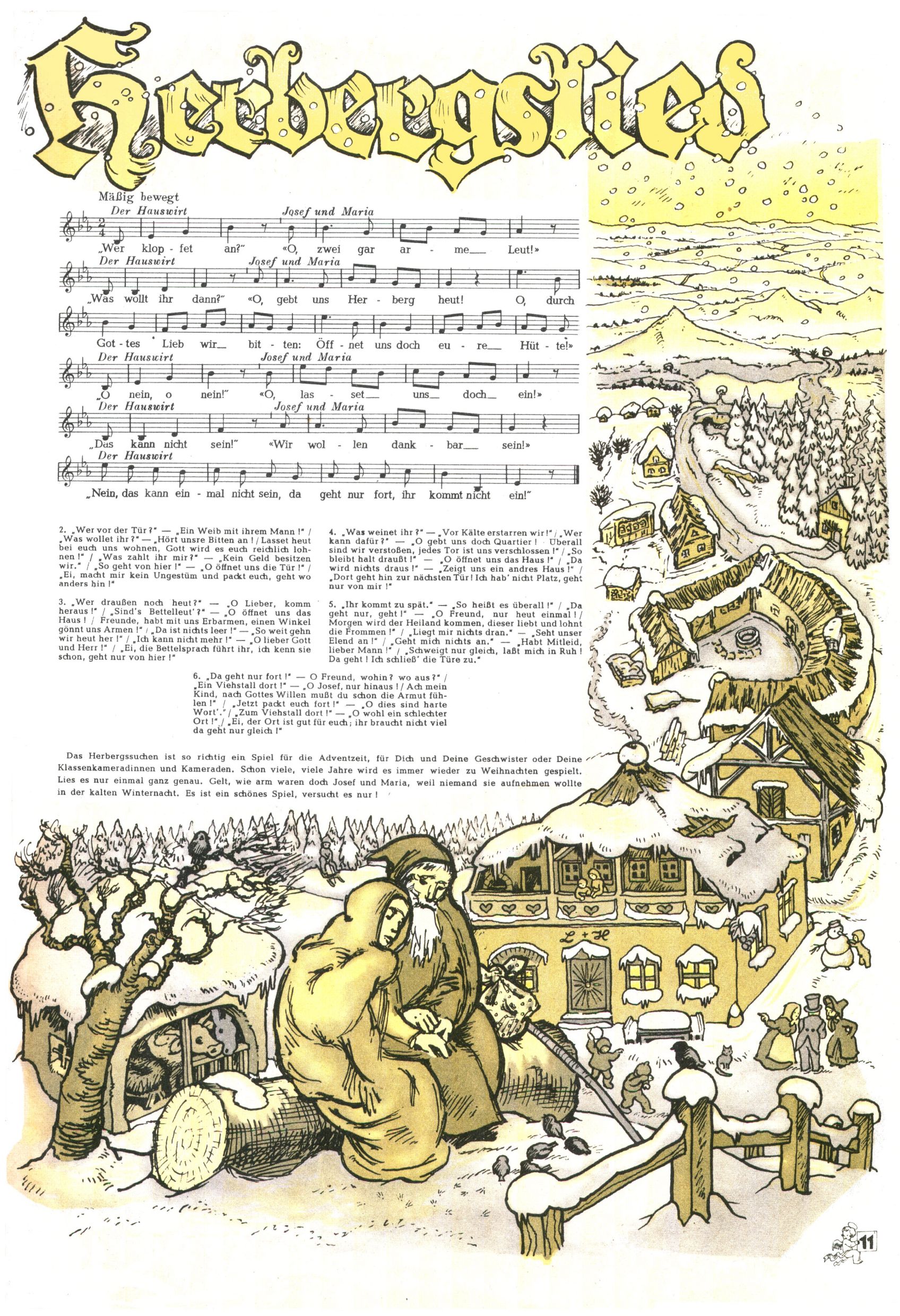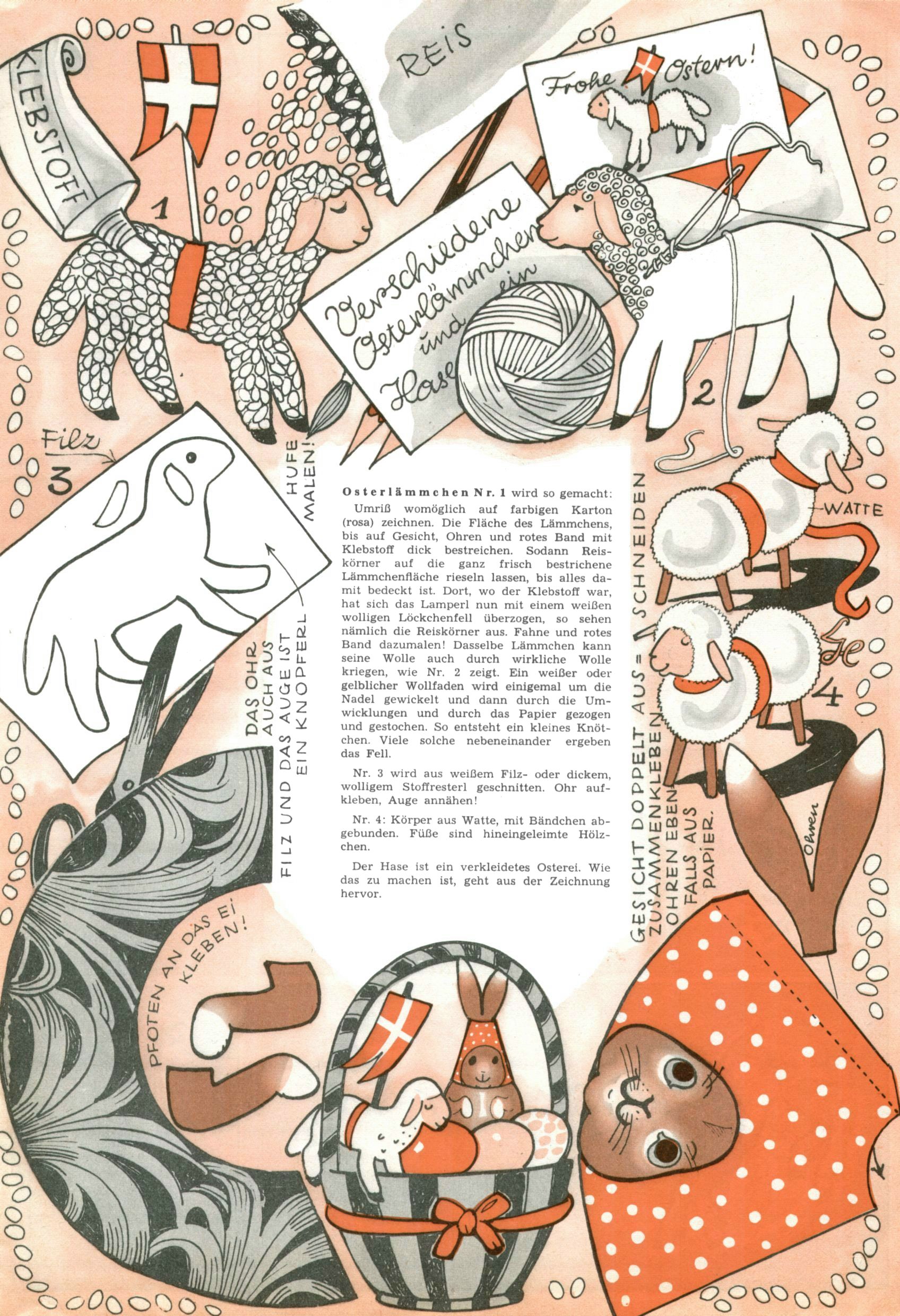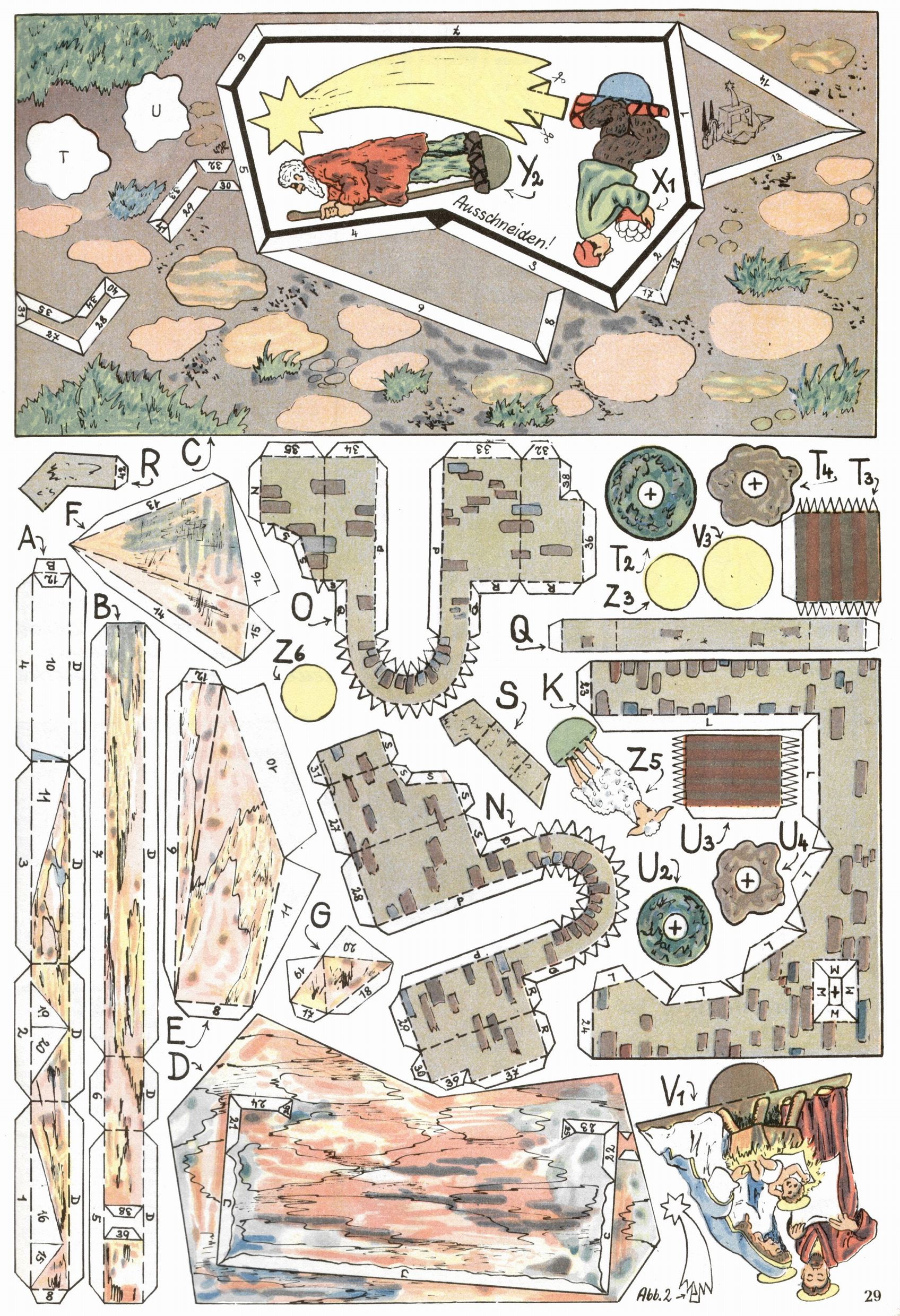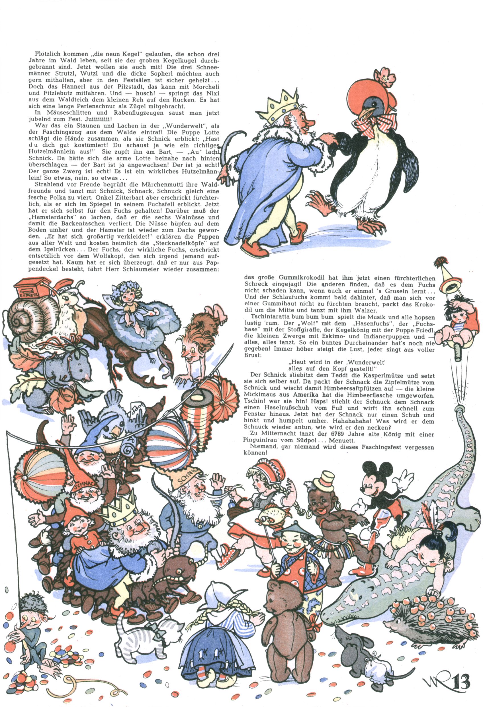 Die Wunderwelt im Festtagsgewand In den Sonderheften präsentierte sich die Wunderwelt wahrhaftig in Feiertagsstimmung. Mit wenigen Ausnahmen gab es pro Jahr drei Sonderhefte - zu Weihnachten bzw. im Advent, zu Ostern und in den Ferien im Sommer. Experimente mit Faschings- und Muttertagsheften hatten sich nicht bewährt. Selbst als es die Einzelhefte in der Krisensituation nach 1967 nicht mehr gab, wurde die Wunderwelt-Zeitung im Layout der Sonderhefte fortgesetzt: Zunächst mit 3 bis 5 und ab 1971 immerhin wieder mit 10-12 Heften pro Jahr. Die Weihnachts-, Oster- und Ferienhefte hatten naturgemäß verschiedene Schwerpunkte. Während im Sommer Spielen und Werken mit Material im Vordergrund stand, waren es zu Weihnachten Krippen und Adventhäuser; zu Ostern dann Erzählungen, Hasenstädte und Oster-Basteleien. Das bessere Papier der Sonderhefte erleichterte das Ausschneiden der insgesamt mehr als 1000 Papiermodelle erheblich. Die Sonderhefte waren vergleichsweise aufwändig gestaltet, aber auch ein wichtiges Zusatzgeschäft für die Zeitung. Die Kinder fieberten dem Erscheinungsdatum der jeweiligen Ausgabe nicht selten richtiggehend entgegen. Mit knapp 100 Seiten pro Jahr machten die Sonderhefte von der Menge her zwar nicht einmal ein Viertel aus, trugen aber zum Erscheinungsbild mindestens genauso viel bei wie die Standardhefte. Im Wesentlichen blieb das Layout der Sonderhefte über die Jahre hin unverändert. Mühselig wurde es, als man den Inhalt der Beiträge vorübergehend auf die Seiten gleichmäßig verteilte und die Kinder ermunterte, die Hefte in der Mitte zu zerschneiden. Die eine Hälfte enthielt dann etwa Erzählungen und Bastelvorschläge, der andere Teil der Zeitung Spielanleitungen. Zur übersichtlichkeit trugen diese Layoutversuche jedenfalls in keiner Weise bei und als besonderen Auswuchs gab es eine Zeitlang auf einer Seite oft mehrere Seitennummern, je nachdem, ob sich diese auf das Gesamtheft oder den herauszunehmenden und zu zerschneidenden Heftteil bezogen. Gegen Ende der 1950er Jahre kehrte man wieder zu einem ganzseitigen Layout zurück und Ideen wie ein Spiel-(Heft-im-)Heft gehörten der Vergangenheit an. In den Sonderheften experimentierte man dann noch ab Mitte der 1960er Jahre, als die Verkaufszahlen stark rückläufig waren, mit grundsätzlich neuen Darstellungsformen - weg vom Niedlich-Kitschigen und engagierte neue Grafikerinnen wie Gundi Groh und Hella Soyka. Den erhofften Erfolg brachte dies jedoch nicht mehr. |
