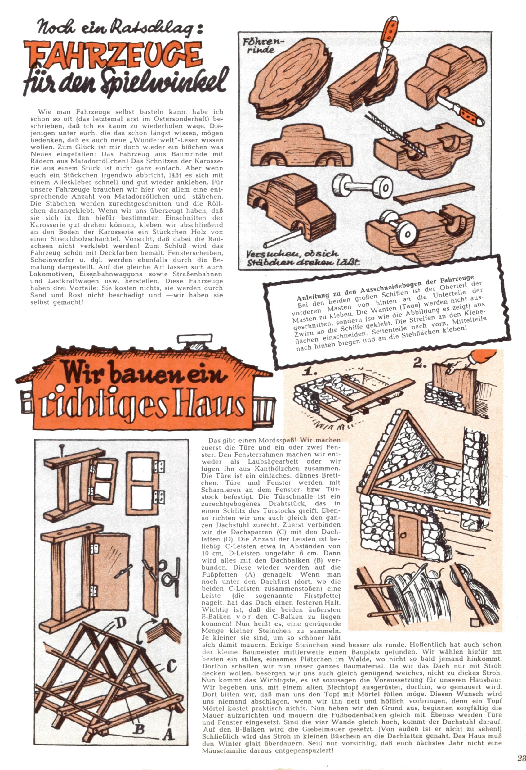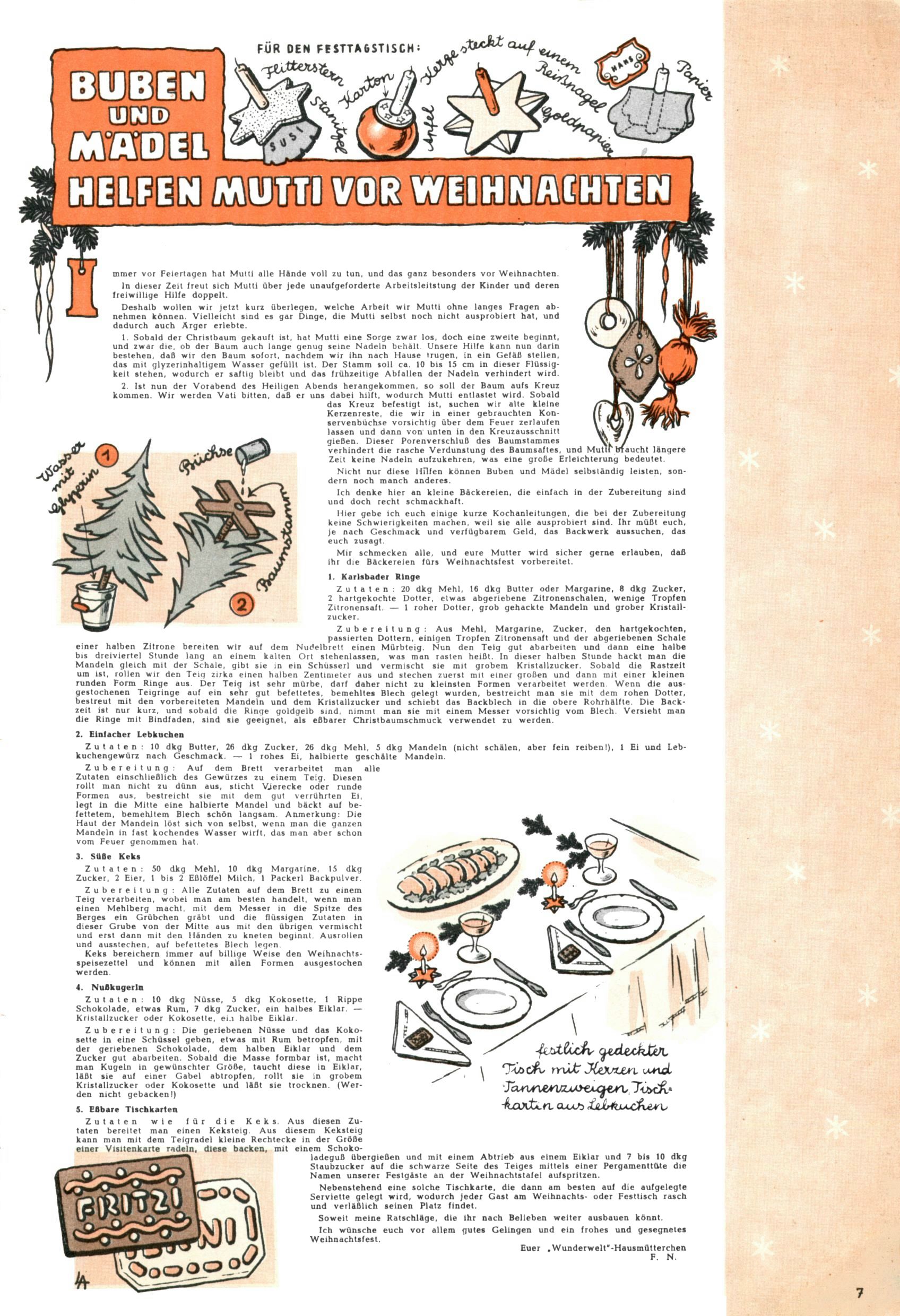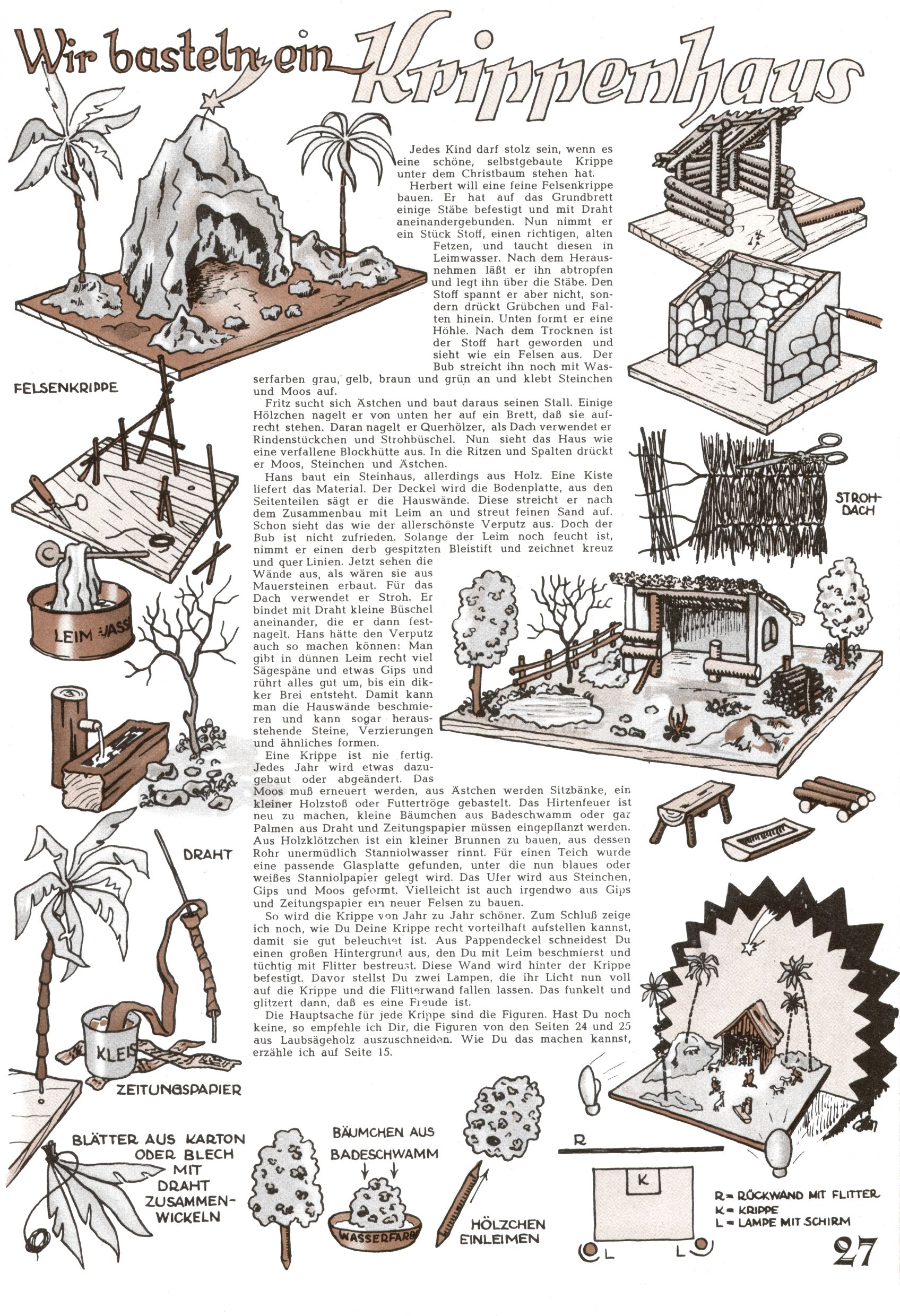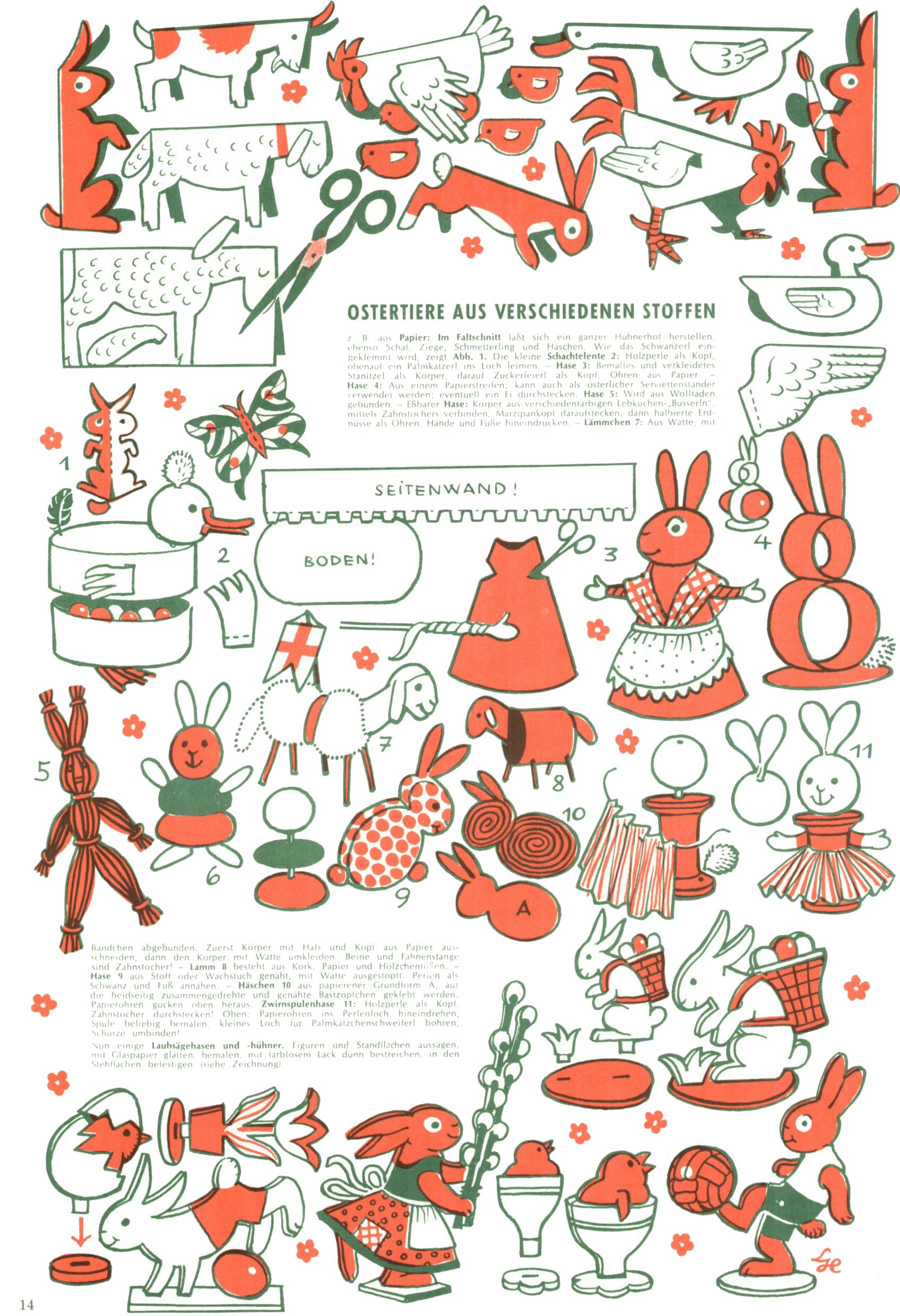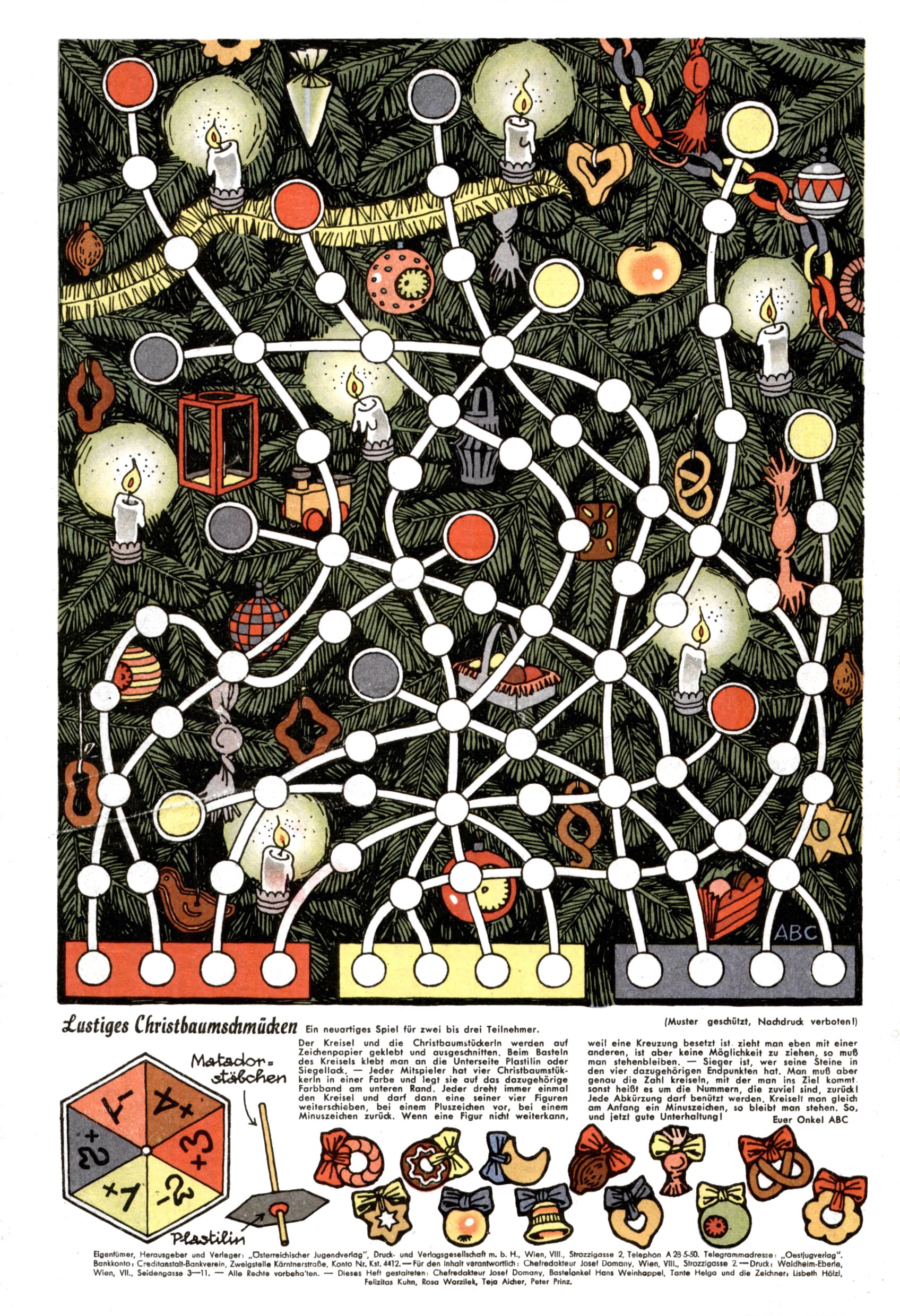 Die Wunderwelt im Festtagsgewand In den Sonderheften präsentierte sich die Wunderwelt wahrhaftig in Feiertagsstimmung. Mit wenigen Ausnahmen gab es pro Jahr drei Sonderhefte - zu Weihnachten bzw. im Advent, zu Ostern und in den Ferien im Sommer. Experimente mit Faschings- und Muttertagsheften hatten sich nicht bewährt. Selbst als es die Einzelhefte in der Krisensituation nach 1967 nicht mehr gab, wurde die Wunderwelt-Zeitung im Layout der Sonderhefte fortgesetzt: Zunächst mit 3 bis 5 und ab 1971 immerhin wieder mit 10-12 Heften pro Jahr. Die Weihnachts-, Oster- und Ferienhefte hatten naturgemäß verschiedene Schwerpunkte. Während im Sommer Spielen und Werken mit Material im Vordergrund stand, waren es zu Weihnachten Krippen und Adventhäuser; zu Ostern dann Erzählungen, Hasenstädte und Oster-Basteleien. Das bessere Papier der Sonderhefte erleichterte das Ausschneiden der insgesamt mehr als 1000 Papiermodelle erheblich. Die Sonderhefte waren vergleichsweise aufwändig gestaltet, aber auch ein wichtiges Zusatzgeschäft für die Zeitung. Die Kinder fieberten dem Erscheinungsdatum der jeweiligen Ausgabe nicht selten richtiggehend entgegen. Mit knapp 100 Seiten pro Jahr machten die Sonderhefte von der Menge her zwar nicht einmal ein Viertel aus, trugen aber zum Erscheinungsbild mindestens genauso viel bei wie die Standardhefte. Im Wesentlichen blieb das Layout der Sonderhefte über die Jahre hin unverändert. Mühselig wurde es, als man den Inhalt der Beiträge vorübergehend auf die Seiten gleichmäßig verteilte und die Kinder ermunterte, die Hefte in der Mitte zu zerschneiden. Die eine Hälfte enthielt dann etwa Erzählungen und Bastelvorschläge, der andere Teil der Zeitung Spielanleitungen. Zur übersichtlichkeit trugen diese Layoutversuche jedenfalls in keiner Weise bei und als besonderen Auswuchs gab es eine Zeitlang auf einer Seite oft mehrere Seitennummern, je nachdem, ob sich diese auf das Gesamtheft oder den herauszunehmenden und zu zerschneidenden Heftteil bezogen. Gegen Ende der 1950er Jahre kehrte man wieder zu einem ganzseitigen Layout zurück und Ideen wie ein Spiel-(Heft-im-)Heft gehörten der Vergangenheit an. In den Sonderheften experimentierte man dann noch ab Mitte der 1960er Jahre, als die Verkaufszahlen stark rückläufig waren, mit grundsätzlich neuen Darstellungsformen - weg vom Niedlich-Kitschigen und engagierte neue Grafikerinnen wie Gundi Groh und Hella Soyka. Den erhofften Erfolg brachte dies jedoch nicht mehr. |
