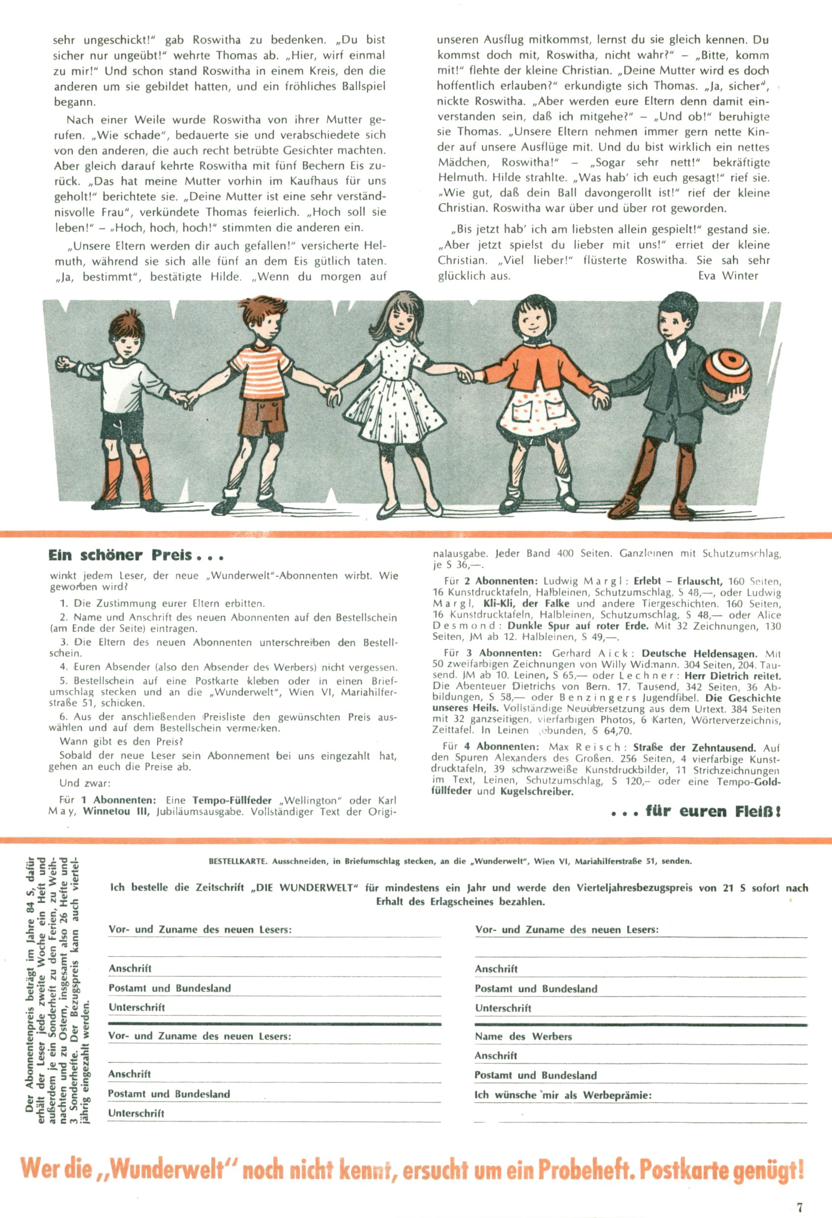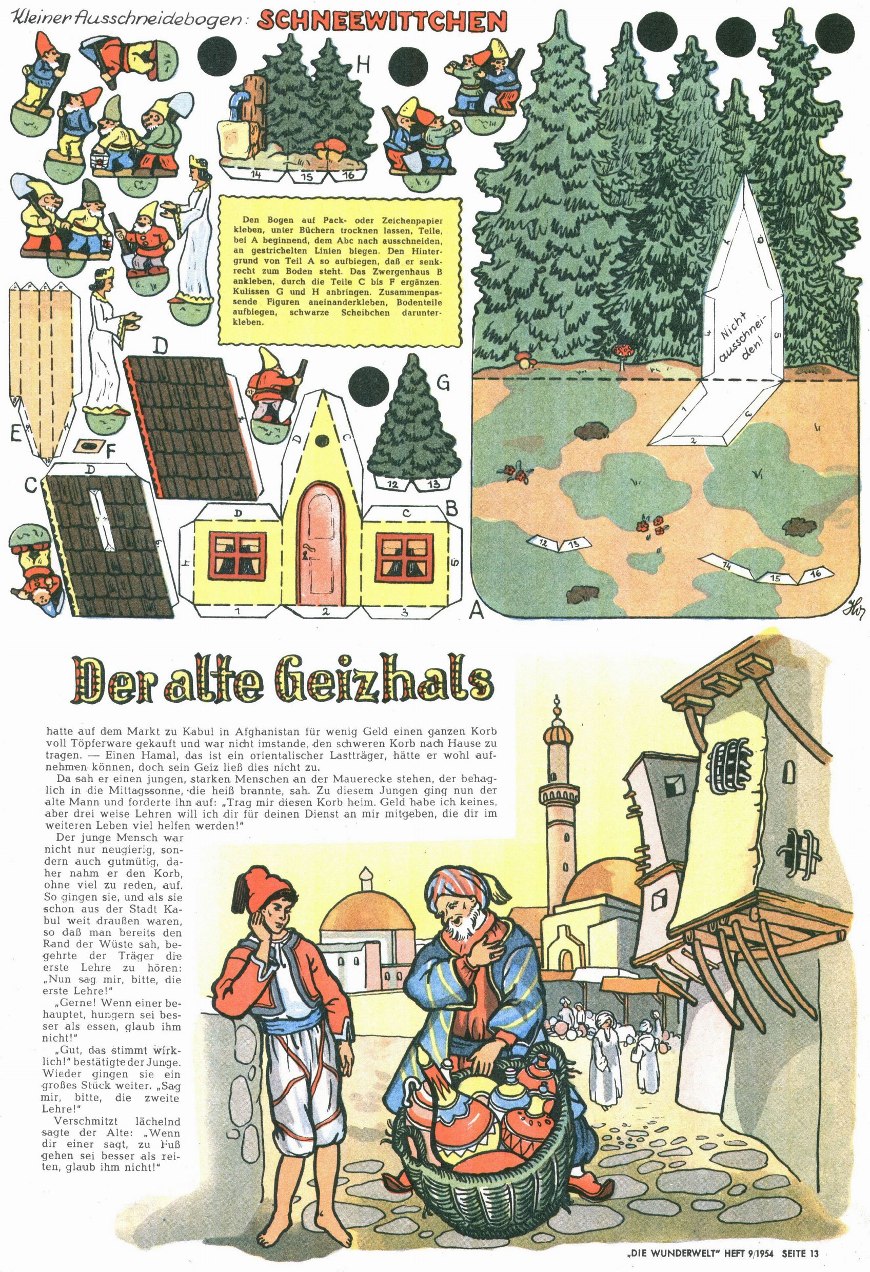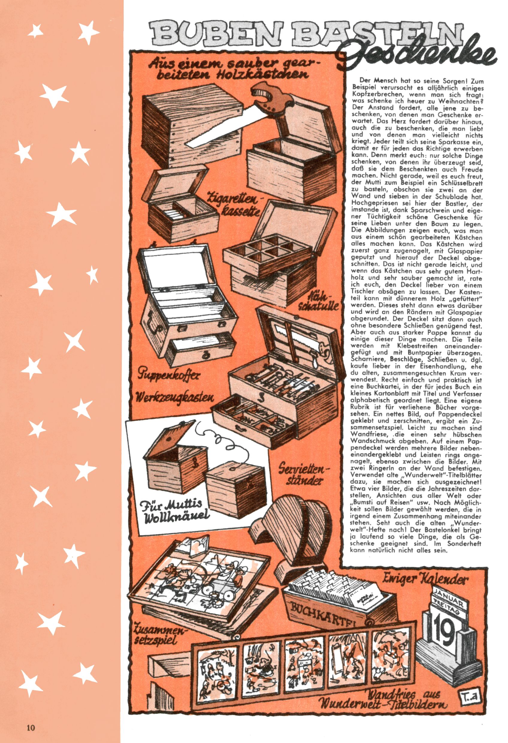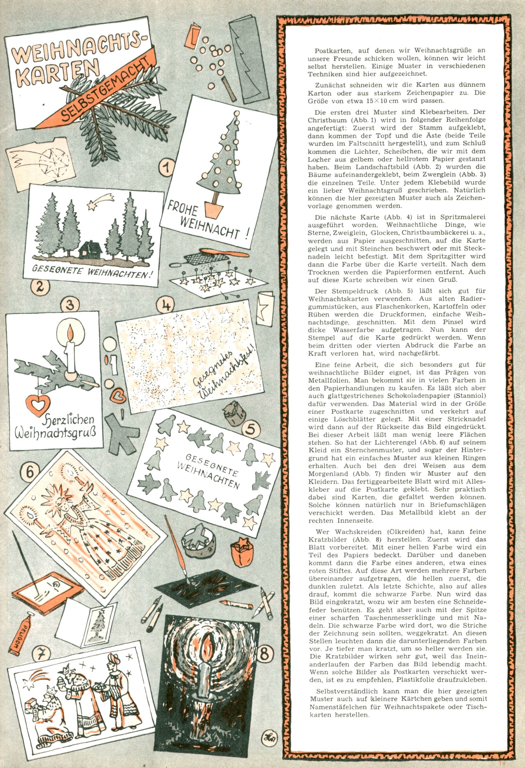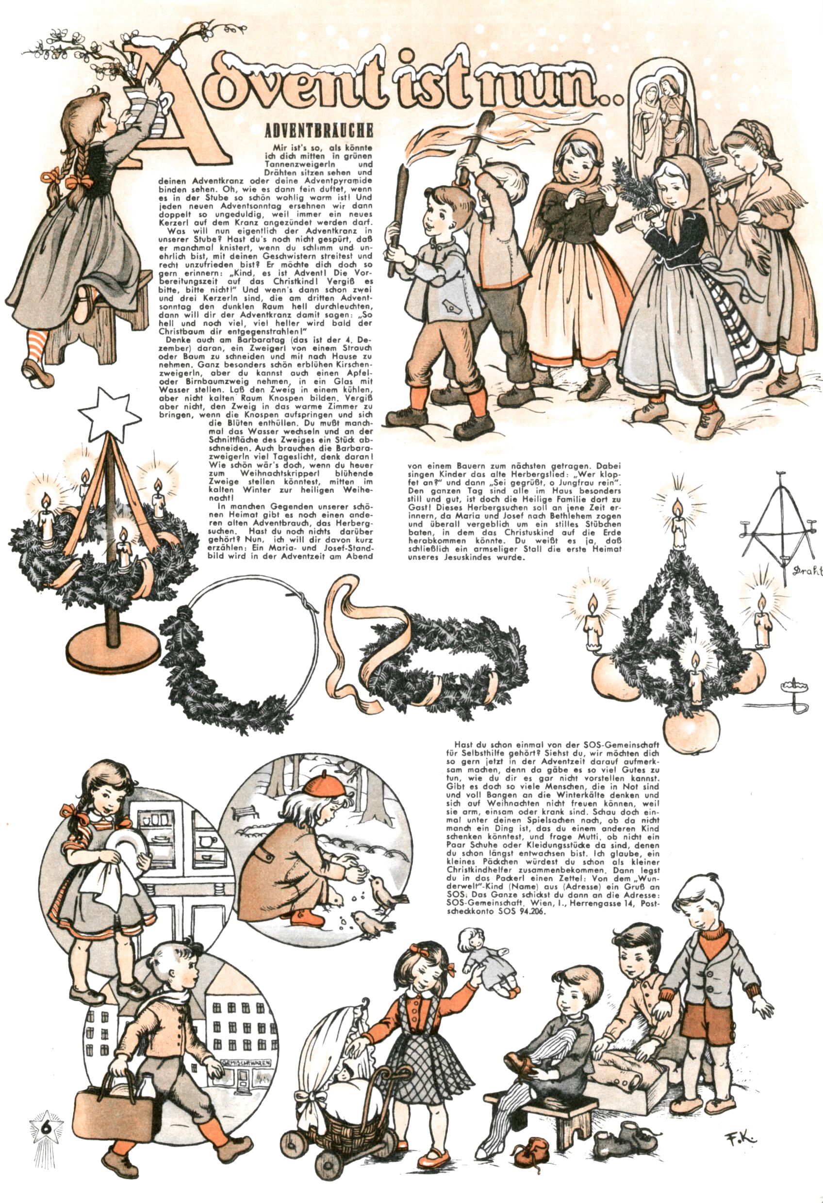 Die Wunderwelt im Festtagsgewand In den Sonderheften präsentierte sich die Wunderwelt wahrhaftig in Feiertagsstimmung. Mit wenigen Ausnahmen gab es pro Jahr drei Sonderhefte - zu Weihnachten bzw. im Advent, zu Ostern und in den Ferien im Sommer. Experimente mit Faschings- und Muttertagsheften hatten sich nicht bewährt. Selbst als es die Einzelhefte in der Krisensituation nach 1967 nicht mehr gab, wurde die Wunderwelt-Zeitung im Layout der Sonderhefte fortgesetzt: Zunächst mit 3 bis 5 und ab 1971 immerhin wieder mit 10-12 Heften pro Jahr. Die Weihnachts-, Oster- und Ferienhefte hatten naturgemäß verschiedene Schwerpunkte. Während im Sommer Spielen und Werken mit Material im Vordergrund stand, waren es zu Weihnachten Krippen und Adventhäuser; zu Ostern dann Erzählungen, Hasenstädte und Oster-Basteleien. Das bessere Papier der Sonderhefte erleichterte das Ausschneiden der insgesamt mehr als 1000 Papiermodelle erheblich. Die Sonderhefte waren vergleichsweise aufwändig gestaltet, aber auch ein wichtiges Zusatzgeschäft für die Zeitung. Die Kinder fieberten dem Erscheinungsdatum der jeweiligen Ausgabe nicht selten richtiggehend entgegen. Mit knapp 100 Seiten pro Jahr machten die Sonderhefte von der Menge her zwar nicht einmal ein Viertel aus, trugen aber zum Erscheinungsbild mindestens genauso viel bei wie die Standardhefte. Im Wesentlichen blieb das Layout der Sonderhefte über die Jahre hin unverändert. Mühselig wurde es, als man den Inhalt der Beiträge vorübergehend auf die Seiten gleichmäßig verteilte und die Kinder ermunterte, die Hefte in der Mitte zu zerschneiden. Die eine Hälfte enthielt dann etwa Erzählungen und Bastelvorschläge, der andere Teil der Zeitung Spielanleitungen. Zur übersichtlichkeit trugen diese Layoutversuche jedenfalls in keiner Weise bei und als besonderen Auswuchs gab es eine Zeitlang auf einer Seite oft mehrere Seitennummern, je nachdem, ob sich diese auf das Gesamtheft oder den herauszunehmenden und zu zerschneidenden Heftteil bezogen. Gegen Ende der 1950er Jahre kehrte man wieder zu einem ganzseitigen Layout zurück und Ideen wie ein Spiel-(Heft-im-)Heft gehörten der Vergangenheit an. In den Sonderheften experimentierte man dann noch ab Mitte der 1960er Jahre, als die Verkaufszahlen stark rückläufig waren, mit grundsätzlich neuen Darstellungsformen - weg vom Niedlich-Kitschigen und engagierte neue Grafikerinnen wie Gundi Groh und Hella Soyka. Den erhofften Erfolg brachte dies jedoch nicht mehr. |