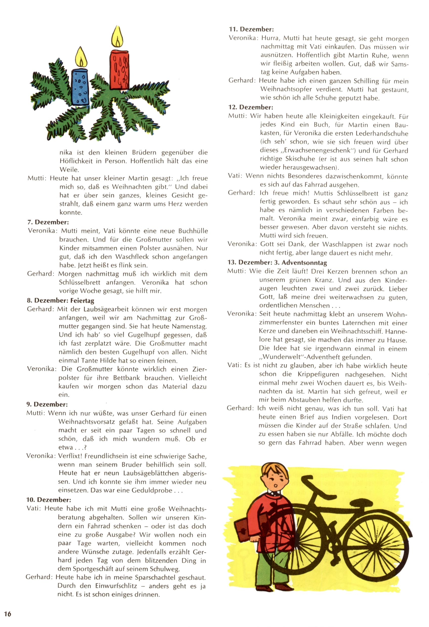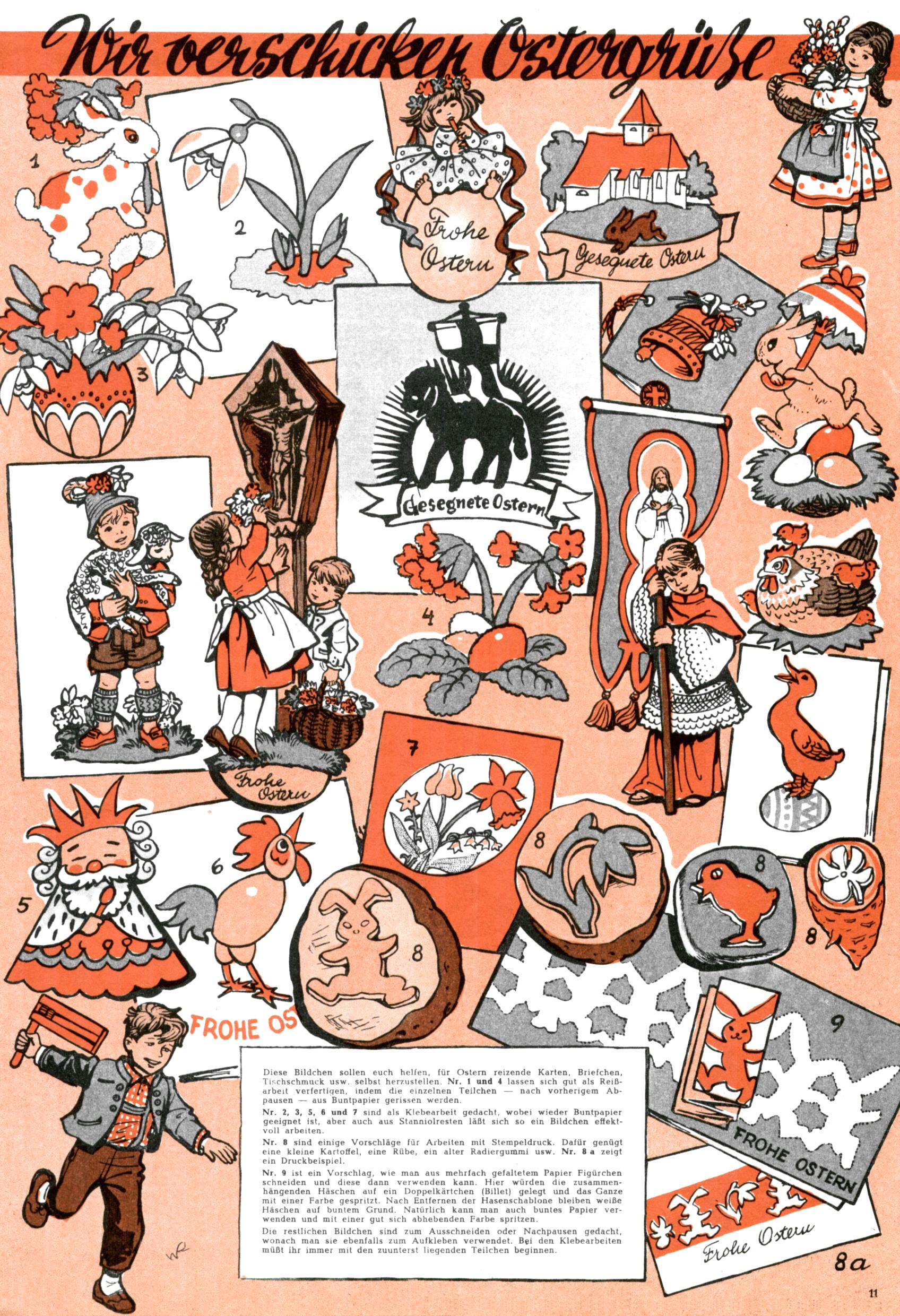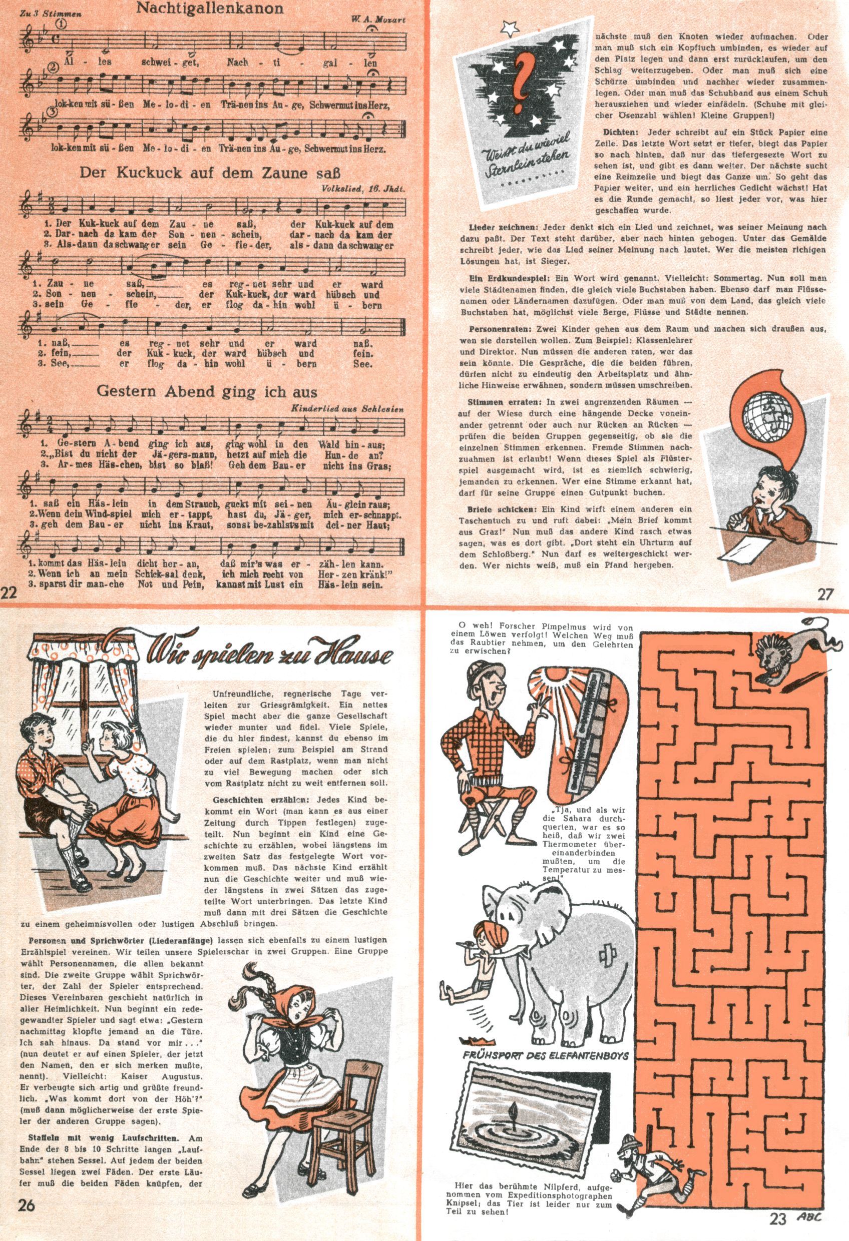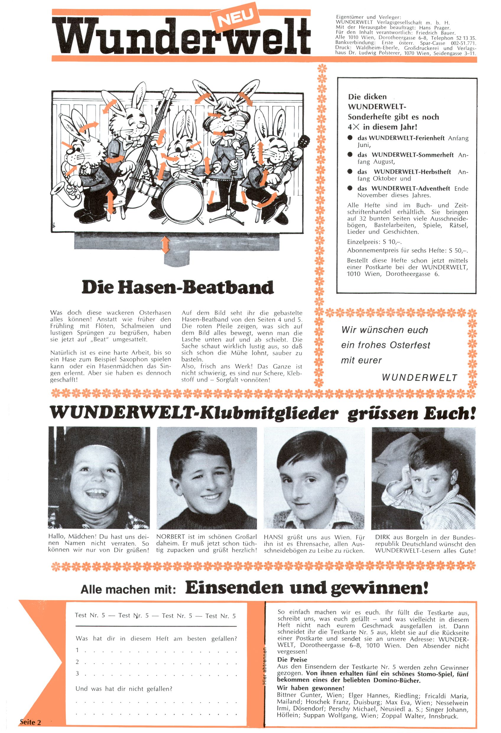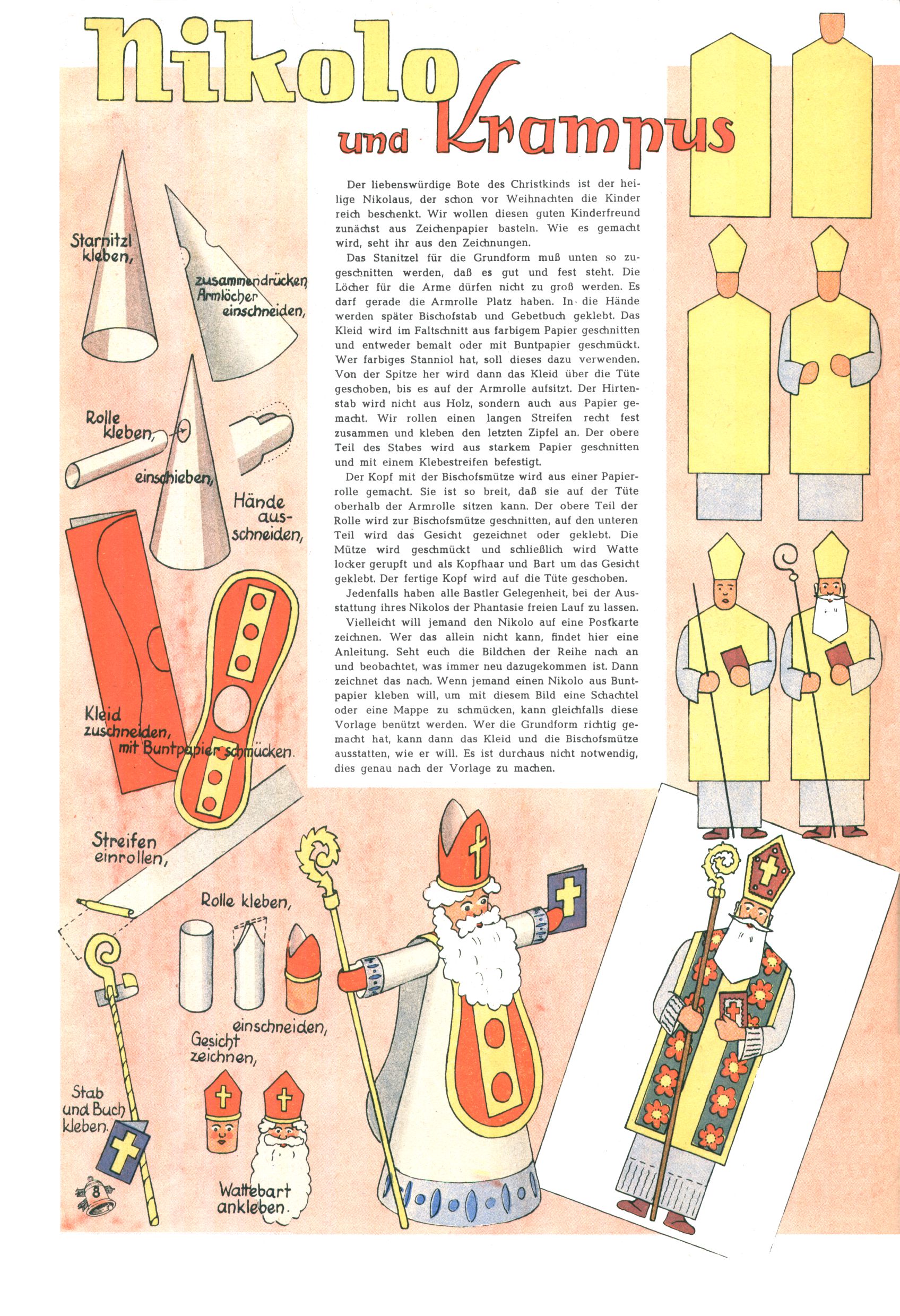 Die Wunderwelt im Festtagsgewand In den Sonderheften präsentierte sich die Wunderwelt wahrhaftig in Feiertagsstimmung. Mit wenigen Ausnahmen gab es pro Jahr drei Sonderhefte - zu Weihnachten bzw. im Advent, zu Ostern und in den Ferien im Sommer. Experimente mit Faschings- und Muttertagsheften hatten sich nicht bewährt. Selbst als es die Einzelhefte in der Krisensituation nach 1967 nicht mehr gab, wurde die Wunderwelt-Zeitung im Layout der Sonderhefte fortgesetzt: Zunächst mit 3 bis 5 und ab 1971 immerhin wieder mit 10-12 Heften pro Jahr. Die Weihnachts-, Oster- und Ferienhefte hatten naturgemäß verschiedene Schwerpunkte. Während im Sommer Spielen und Werken mit Material im Vordergrund stand, waren es zu Weihnachten Krippen und Adventhäuser; zu Ostern dann Erzählungen, Hasenstädte und Oster-Basteleien. Das bessere Papier der Sonderhefte erleichterte das Ausschneiden der insgesamt mehr als 1000 Papiermodelle erheblich. Die Sonderhefte waren vergleichsweise aufwändig gestaltet, aber auch ein wichtiges Zusatzgeschäft für die Zeitung. Die Kinder fieberten dem Erscheinungsdatum der jeweiligen Ausgabe nicht selten richtiggehend entgegen. Mit knapp 100 Seiten pro Jahr machten die Sonderhefte von der Menge her zwar nicht einmal ein Viertel aus, trugen aber zum Erscheinungsbild mindestens genauso viel bei wie die Standardhefte. Im Wesentlichen blieb das Layout der Sonderhefte über die Jahre hin unverändert. Mühselig wurde es, als man den Inhalt der Beiträge vorübergehend auf die Seiten gleichmäßig verteilte und die Kinder ermunterte, die Hefte in der Mitte zu zerschneiden. Die eine Hälfte enthielt dann etwa Erzählungen und Bastelvorschläge, der andere Teil der Zeitung Spielanleitungen. Zur übersichtlichkeit trugen diese Layoutversuche jedenfalls in keiner Weise bei und als besonderen Auswuchs gab es eine Zeitlang auf einer Seite oft mehrere Seitennummern, je nachdem, ob sich diese auf das Gesamtheft oder den herauszunehmenden und zu zerschneidenden Heftteil bezogen. Gegen Ende der 1950er Jahre kehrte man wieder zu einem ganzseitigen Layout zurück und Ideen wie ein Spiel-(Heft-im-)Heft gehörten der Vergangenheit an. In den Sonderheften experimentierte man dann noch ab Mitte der 1960er Jahre, als die Verkaufszahlen stark rückläufig waren, mit grundsätzlich neuen Darstellungsformen - weg vom Niedlich-Kitschigen und engagierte neue Grafikerinnen wie Gundi Groh und Hella Soyka. Den erhofften Erfolg brachte dies jedoch nicht mehr. |