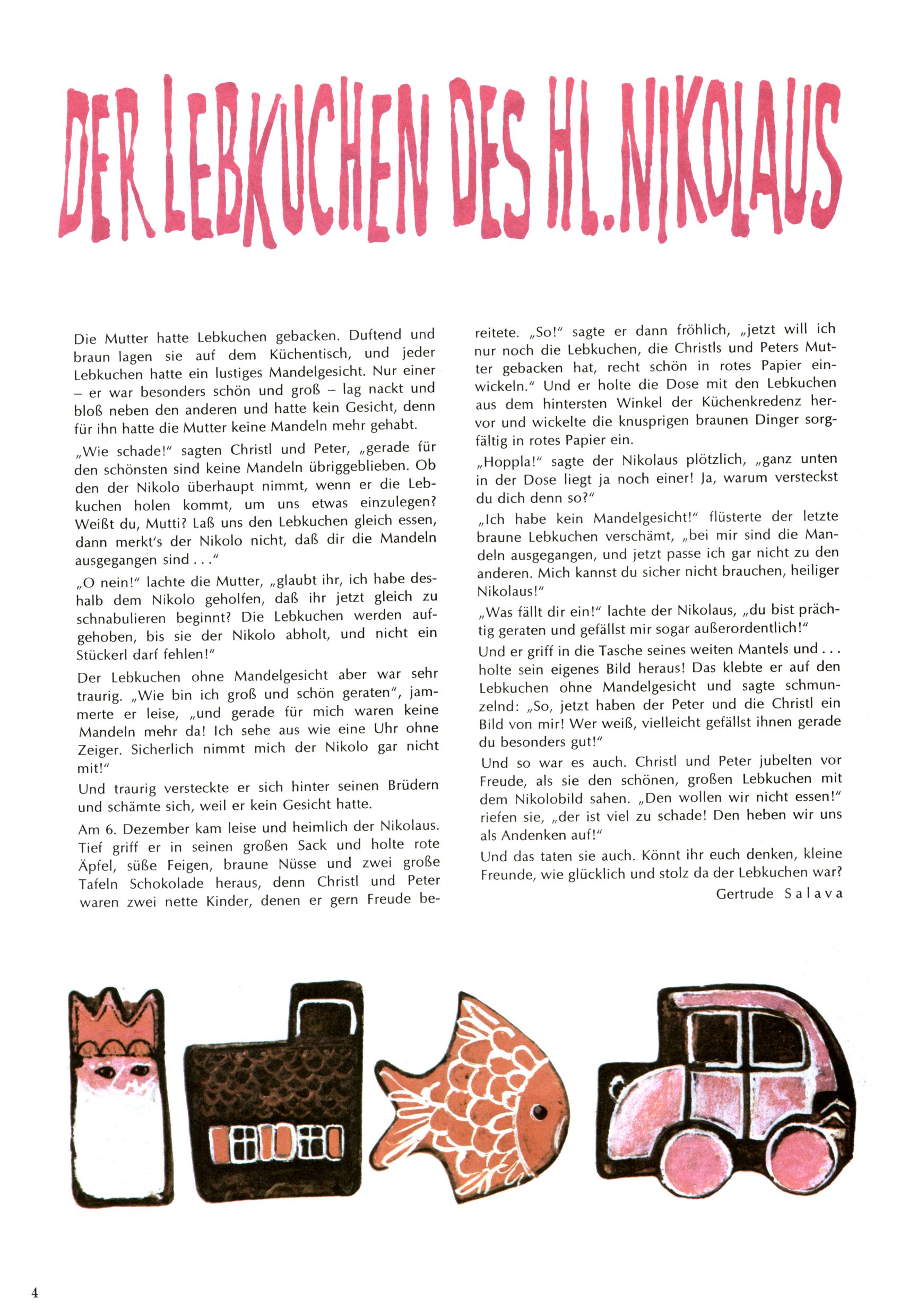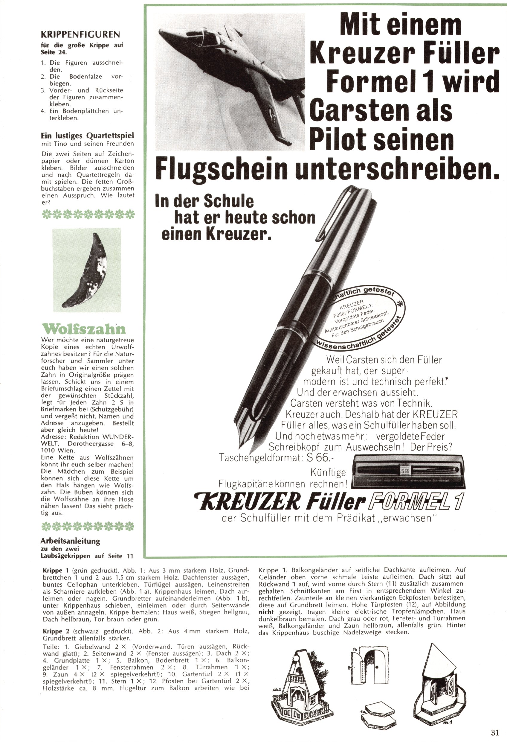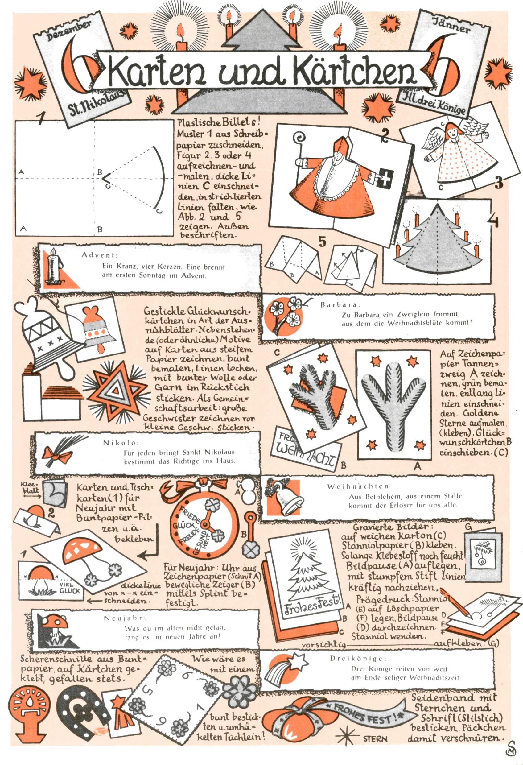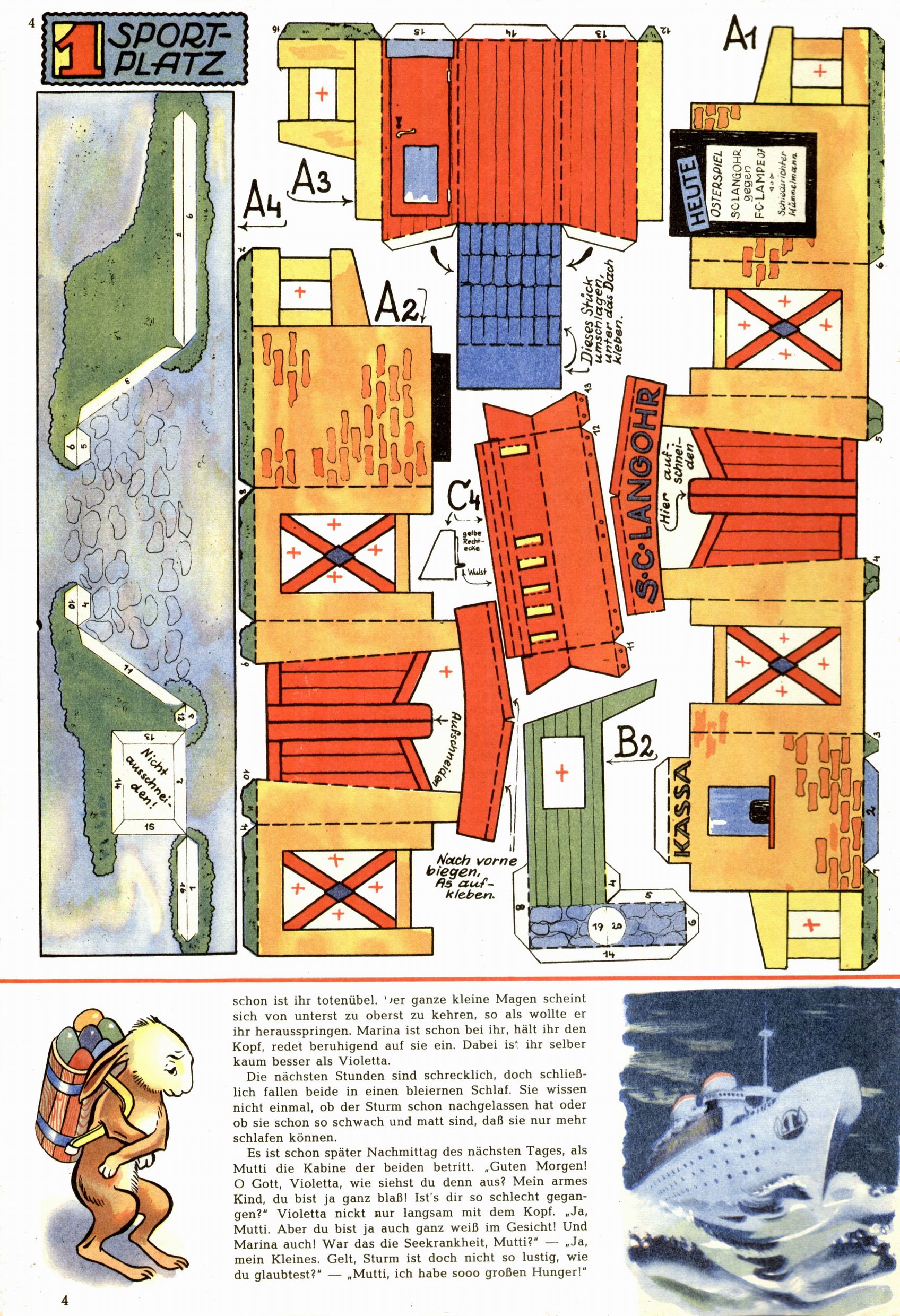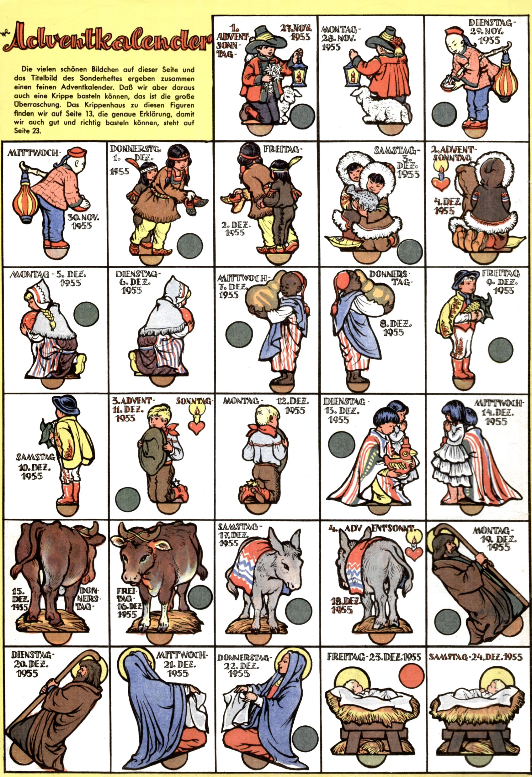 Die Wunderwelt im Festtagsgewand In den Sonderheften präsentierte sich die Wunderwelt wahrhaftig in Feiertagsstimmung. Mit wenigen Ausnahmen gab es pro Jahr drei Sonderhefte - zu Weihnachten bzw. im Advent, zu Ostern und in den Ferien im Sommer. Experimente mit Faschings- und Muttertagsheften hatten sich nicht bewährt. Selbst als es die Einzelhefte in der Krisensituation nach 1967 nicht mehr gab, wurde die Wunderwelt-Zeitung im Layout der Sonderhefte fortgesetzt: Zunächst mit 3 bis 5 und ab 1971 immerhin wieder mit 10-12 Heften pro Jahr. Die Weihnachts-, Oster- und Ferienhefte hatten naturgemäß verschiedene Schwerpunkte. Während im Sommer Spielen und Werken mit Material im Vordergrund stand, waren es zu Weihnachten Krippen und Adventhäuser; zu Ostern dann Erzählungen, Hasenstädte und Oster-Basteleien. Das bessere Papier der Sonderhefte erleichterte das Ausschneiden der insgesamt mehr als 1000 Papiermodelle erheblich. Die Sonderhefte waren vergleichsweise aufwändig gestaltet, aber auch ein wichtiges Zusatzgeschäft für die Zeitung. Die Kinder fieberten dem Erscheinungsdatum der jeweiligen Ausgabe nicht selten richtiggehend entgegen. Mit knapp 100 Seiten pro Jahr machten die Sonderhefte von der Menge her zwar nicht einmal ein Viertel aus, trugen aber zum Erscheinungsbild mindestens genauso viel bei wie die Standardhefte. Im Wesentlichen blieb das Layout der Sonderhefte über die Jahre hin unverändert. Mühselig wurde es, als man den Inhalt der Beiträge vorübergehend auf die Seiten gleichmäßig verteilte und die Kinder ermunterte, die Hefte in der Mitte zu zerschneiden. Die eine Hälfte enthielt dann etwa Erzählungen und Bastelvorschläge, der andere Teil der Zeitung Spielanleitungen. Zur übersichtlichkeit trugen diese Layoutversuche jedenfalls in keiner Weise bei und als besonderen Auswuchs gab es eine Zeitlang auf einer Seite oft mehrere Seitennummern, je nachdem, ob sich diese auf das Gesamtheft oder den herauszunehmenden und zu zerschneidenden Heftteil bezogen. Gegen Ende der 1950er Jahre kehrte man wieder zu einem ganzseitigen Layout zurück und Ideen wie ein Spiel-(Heft-im-)Heft gehörten der Vergangenheit an. In den Sonderheften experimentierte man dann noch ab Mitte der 1960er Jahre, als die Verkaufszahlen stark rückläufig waren, mit grundsätzlich neuen Darstellungsformen - weg vom Niedlich-Kitschigen und engagierte neue Grafikerinnen wie Gundi Groh und Hella Soyka. Den erhofften Erfolg brachte dies jedoch nicht mehr. |