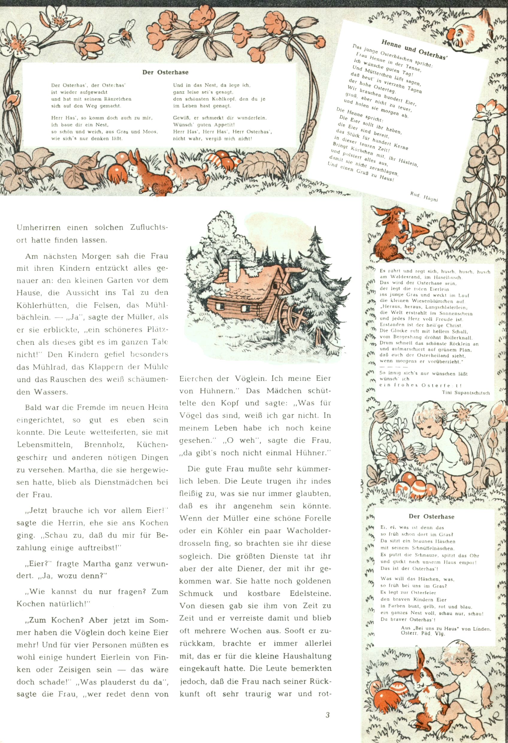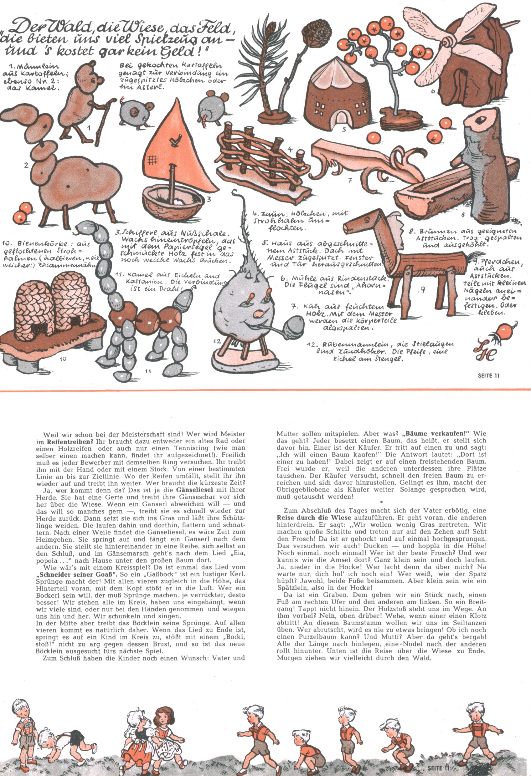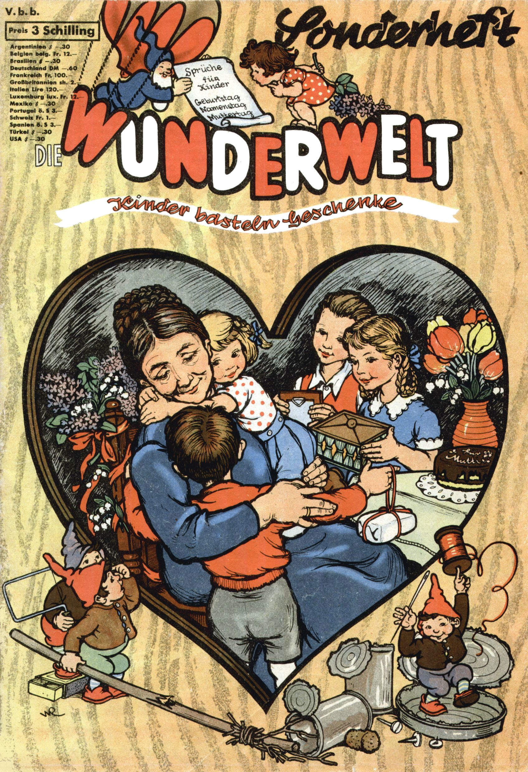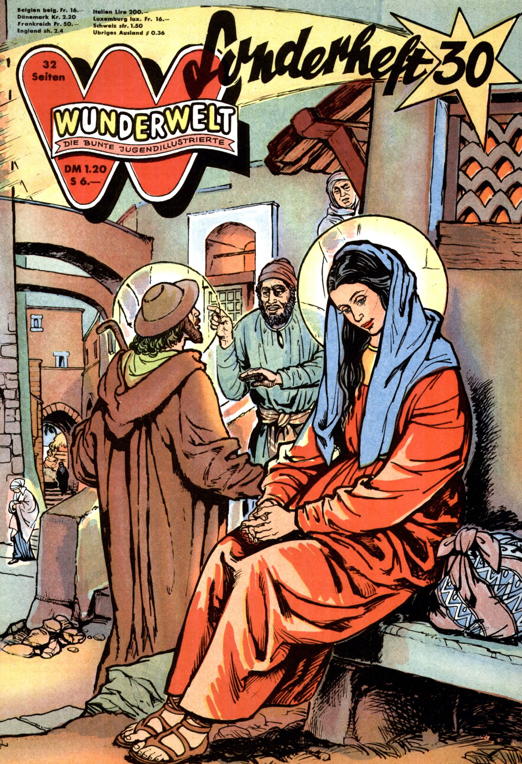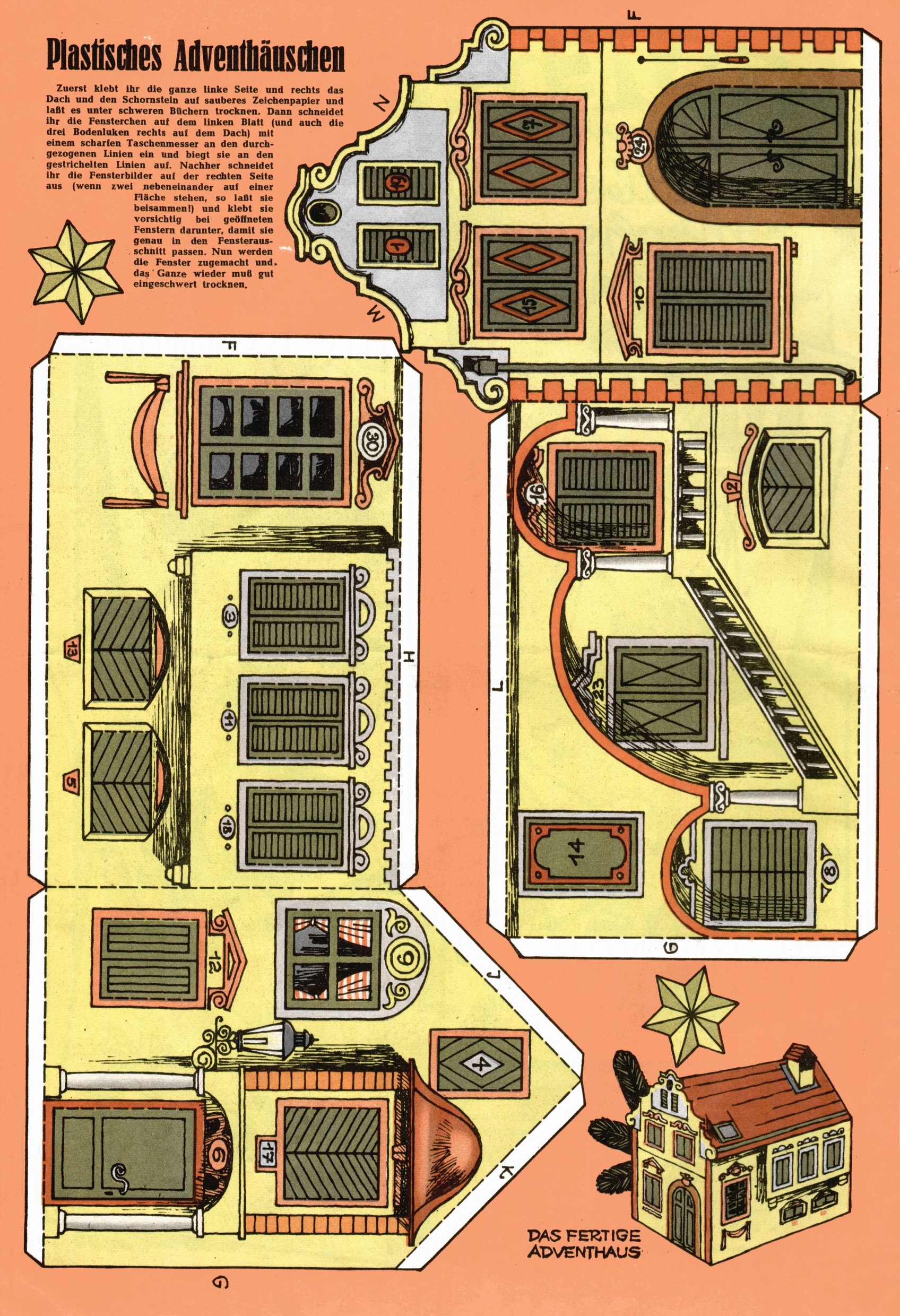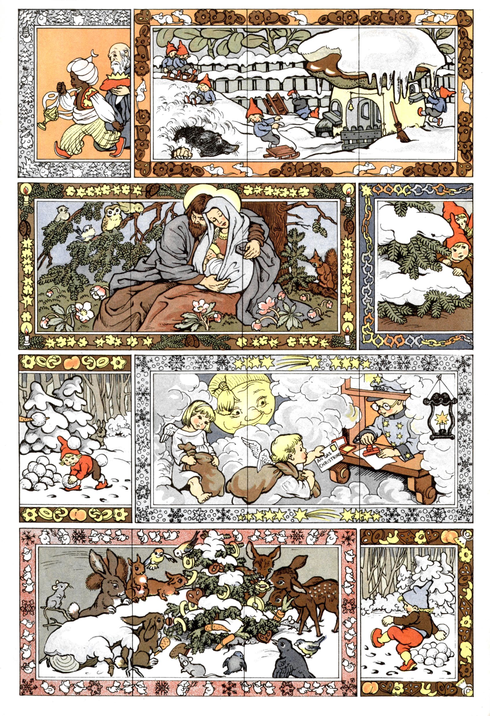 Die Wunderwelt im Festtagsgewand In den Sonderheften präsentierte sich die Wunderwelt wahrhaftig in Feiertagsstimmung. Mit wenigen Ausnahmen gab es pro Jahr drei Sonderhefte - zu Weihnachten bzw. im Advent, zu Ostern und in den Ferien im Sommer. Experimente mit Faschings- und Muttertagsheften hatten sich nicht bewährt. Selbst als es die Einzelhefte in der Krisensituation nach 1967 nicht mehr gab, wurde die Wunderwelt-Zeitung im Layout der Sonderhefte fortgesetzt: Zunächst mit 3 bis 5 und ab 1971 immerhin wieder mit 10-12 Heften pro Jahr. Die Weihnachts-, Oster- und Ferienhefte hatten naturgemäß verschiedene Schwerpunkte. Während im Sommer Spielen und Werken mit Material im Vordergrund stand, waren es zu Weihnachten Krippen und Adventhäuser; zu Ostern dann Erzählungen, Hasenstädte und Oster-Basteleien. Das bessere Papier der Sonderhefte erleichterte das Ausschneiden der insgesamt mehr als 1000 Papiermodelle erheblich. Die Sonderhefte waren vergleichsweise aufwändig gestaltet, aber auch ein wichtiges Zusatzgeschäft für die Zeitung. Die Kinder fieberten dem Erscheinungsdatum der jeweiligen Ausgabe nicht selten richtiggehend entgegen. Mit knapp 100 Seiten pro Jahr machten die Sonderhefte von der Menge her zwar nicht einmal ein Viertel aus, trugen aber zum Erscheinungsbild mindestens genauso viel bei wie die Standardhefte. Im Wesentlichen blieb das Layout der Sonderhefte über die Jahre hin unverändert. Mühselig wurde es, als man den Inhalt der Beiträge vorübergehend auf die Seiten gleichmäßig verteilte und die Kinder ermunterte, die Hefte in der Mitte zu zerschneiden. Die eine Hälfte enthielt dann etwa Erzählungen und Bastelvorschläge, der andere Teil der Zeitung Spielanleitungen. Zur übersichtlichkeit trugen diese Layoutversuche jedenfalls in keiner Weise bei und als besonderen Auswuchs gab es eine Zeitlang auf einer Seite oft mehrere Seitennummern, je nachdem, ob sich diese auf das Gesamtheft oder den herauszunehmenden und zu zerschneidenden Heftteil bezogen. Gegen Ende der 1950er Jahre kehrte man wieder zu einem ganzseitigen Layout zurück und Ideen wie ein Spiel-(Heft-im-)Heft gehörten der Vergangenheit an. In den Sonderheften experimentierte man dann noch ab Mitte der 1960er Jahre, als die Verkaufszahlen stark rückläufig waren, mit grundsätzlich neuen Darstellungsformen - weg vom Niedlich-Kitschigen und engagierte neue Grafikerinnen wie Gundi Groh und Hella Soyka. Den erhofften Erfolg brachte dies jedoch nicht mehr. |