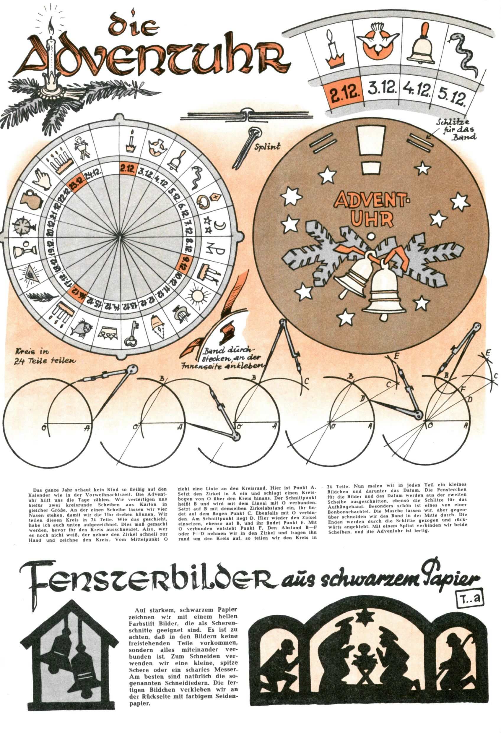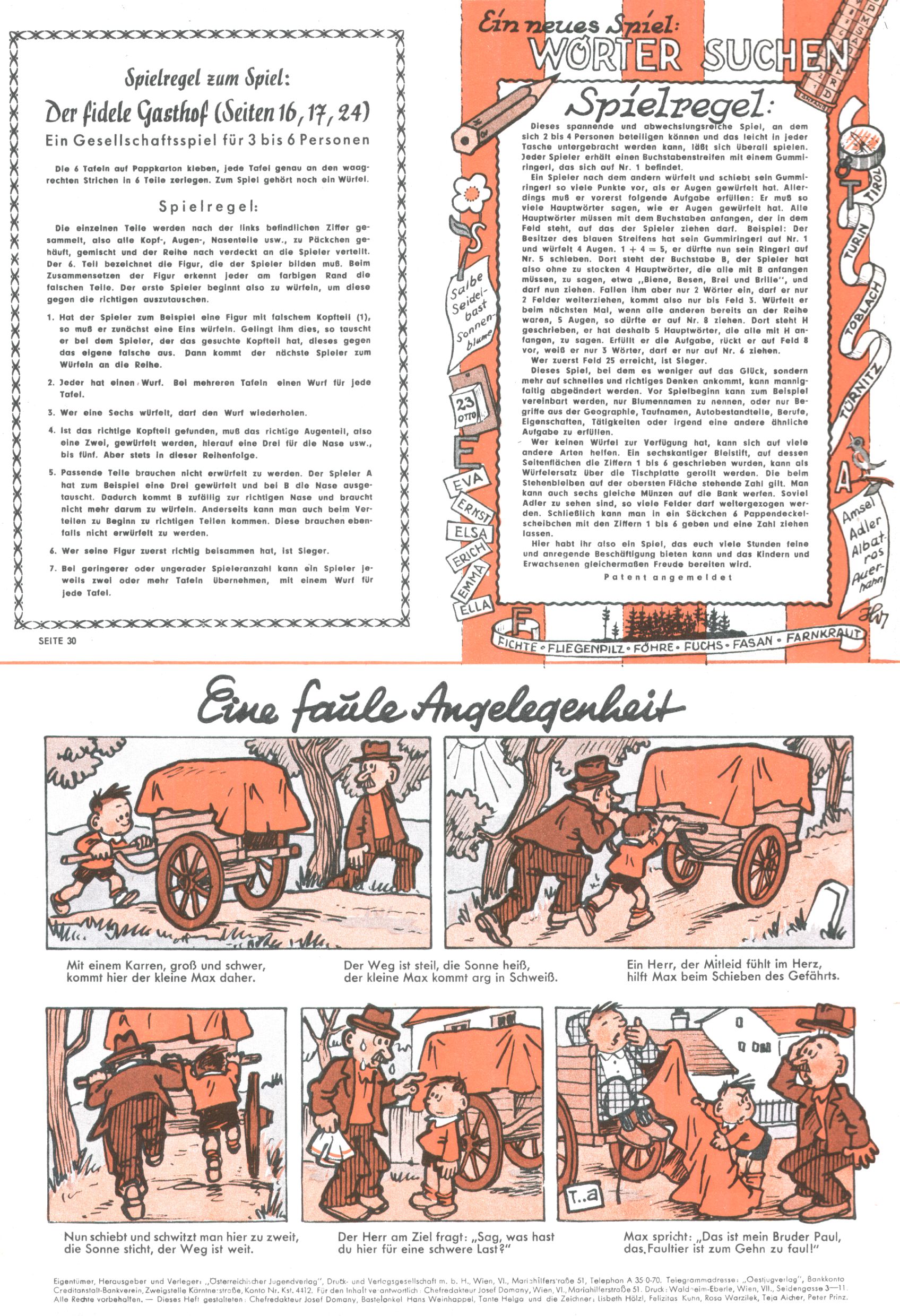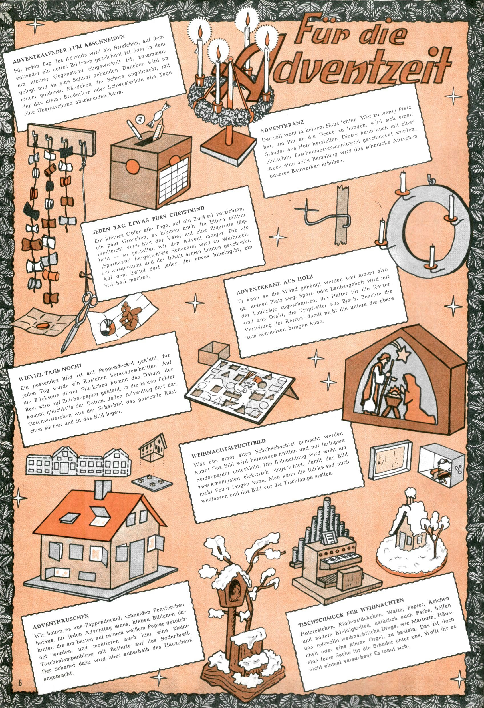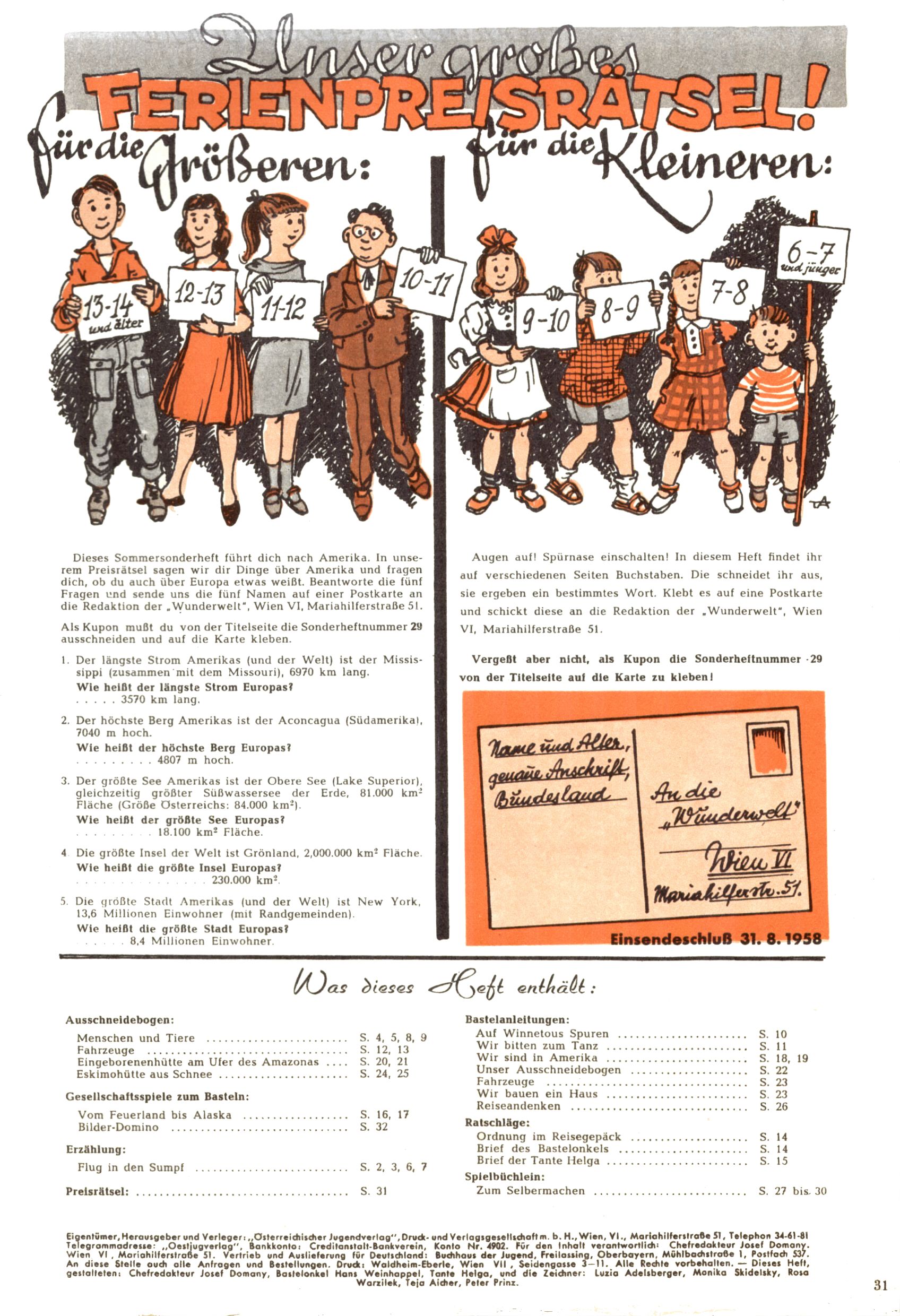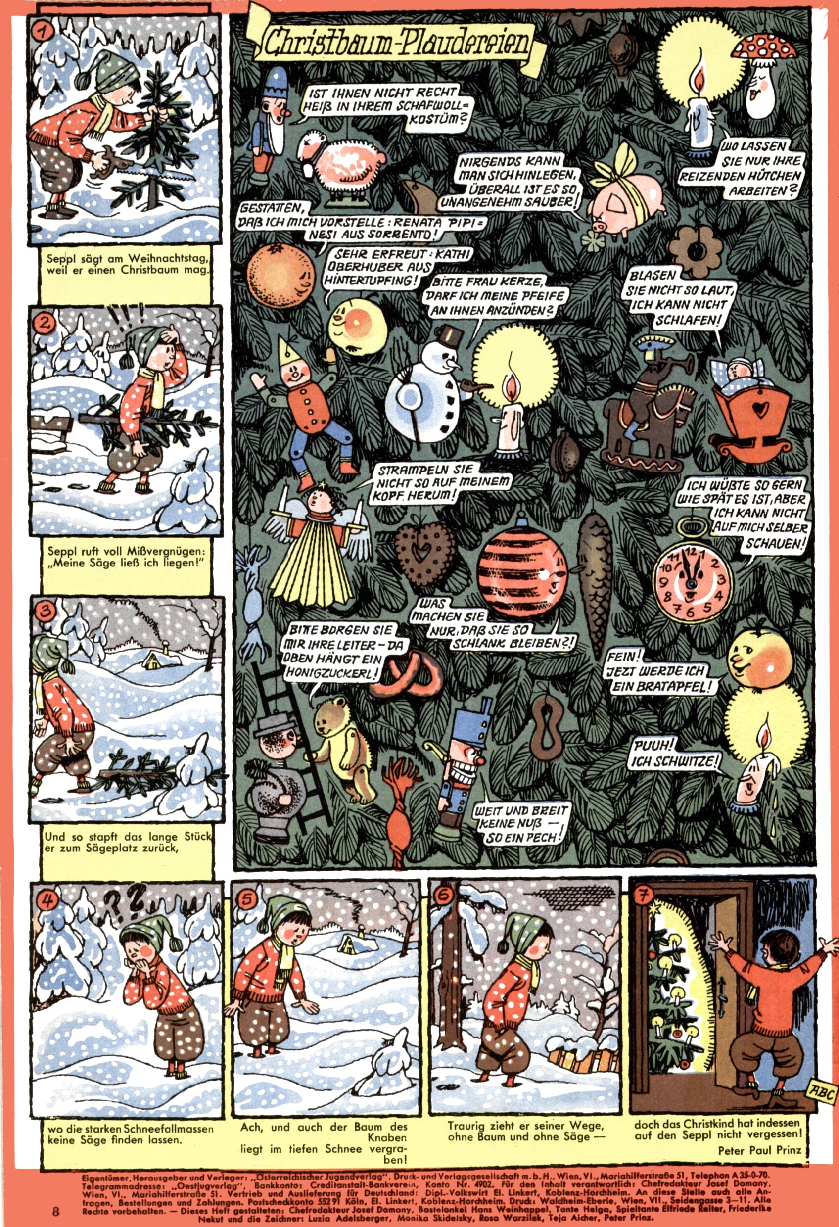 Die Wunderwelt im Festtagsgewand In den Sonderheften präsentierte sich die Wunderwelt wahrhaftig in Feiertagsstimmung. Mit wenigen Ausnahmen gab es pro Jahr drei Sonderhefte - zu Weihnachten bzw. im Advent, zu Ostern und in den Ferien im Sommer. Experimente mit Faschings- und Muttertagsheften hatten sich nicht bewährt. Selbst als es die Einzelhefte in der Krisensituation nach 1967 nicht mehr gab, wurde die Wunderwelt-Zeitung im Layout der Sonderhefte fortgesetzt: Zunächst mit 3 bis 5 und ab 1971 immerhin wieder mit 10-12 Heften pro Jahr. Die Weihnachts-, Oster- und Ferienhefte hatten naturgemäß verschiedene Schwerpunkte. Während im Sommer Spielen und Werken mit Material im Vordergrund stand, waren es zu Weihnachten Krippen und Adventhäuser; zu Ostern dann Erzählungen, Hasenstädte und Oster-Basteleien. Das bessere Papier der Sonderhefte erleichterte das Ausschneiden der insgesamt mehr als 1000 Papiermodelle erheblich. Die Sonderhefte waren vergleichsweise aufwändig gestaltet, aber auch ein wichtiges Zusatzgeschäft für die Zeitung. Die Kinder fieberten dem Erscheinungsdatum der jeweiligen Ausgabe nicht selten richtiggehend entgegen. Mit knapp 100 Seiten pro Jahr machten die Sonderhefte von der Menge her zwar nicht einmal ein Viertel aus, trugen aber zum Erscheinungsbild mindestens genauso viel bei wie die Standardhefte. Im Wesentlichen blieb das Layout der Sonderhefte über die Jahre hin unverändert. Mühselig wurde es, als man den Inhalt der Beiträge vorübergehend auf die Seiten gleichmäßig verteilte und die Kinder ermunterte, die Hefte in der Mitte zu zerschneiden. Die eine Hälfte enthielt dann etwa Erzählungen und Bastelvorschläge, der andere Teil der Zeitung Spielanleitungen. Zur übersichtlichkeit trugen diese Layoutversuche jedenfalls in keiner Weise bei und als besonderen Auswuchs gab es eine Zeitlang auf einer Seite oft mehrere Seitennummern, je nachdem, ob sich diese auf das Gesamtheft oder den herauszunehmenden und zu zerschneidenden Heftteil bezogen. Gegen Ende der 1950er Jahre kehrte man wieder zu einem ganzseitigen Layout zurück und Ideen wie ein Spiel-(Heft-im-)Heft gehörten der Vergangenheit an. In den Sonderheften experimentierte man dann noch ab Mitte der 1960er Jahre, als die Verkaufszahlen stark rückläufig waren, mit grundsätzlich neuen Darstellungsformen - weg vom Niedlich-Kitschigen und engagierte neue Grafikerinnen wie Gundi Groh und Hella Soyka. Den erhofften Erfolg brachte dies jedoch nicht mehr. |