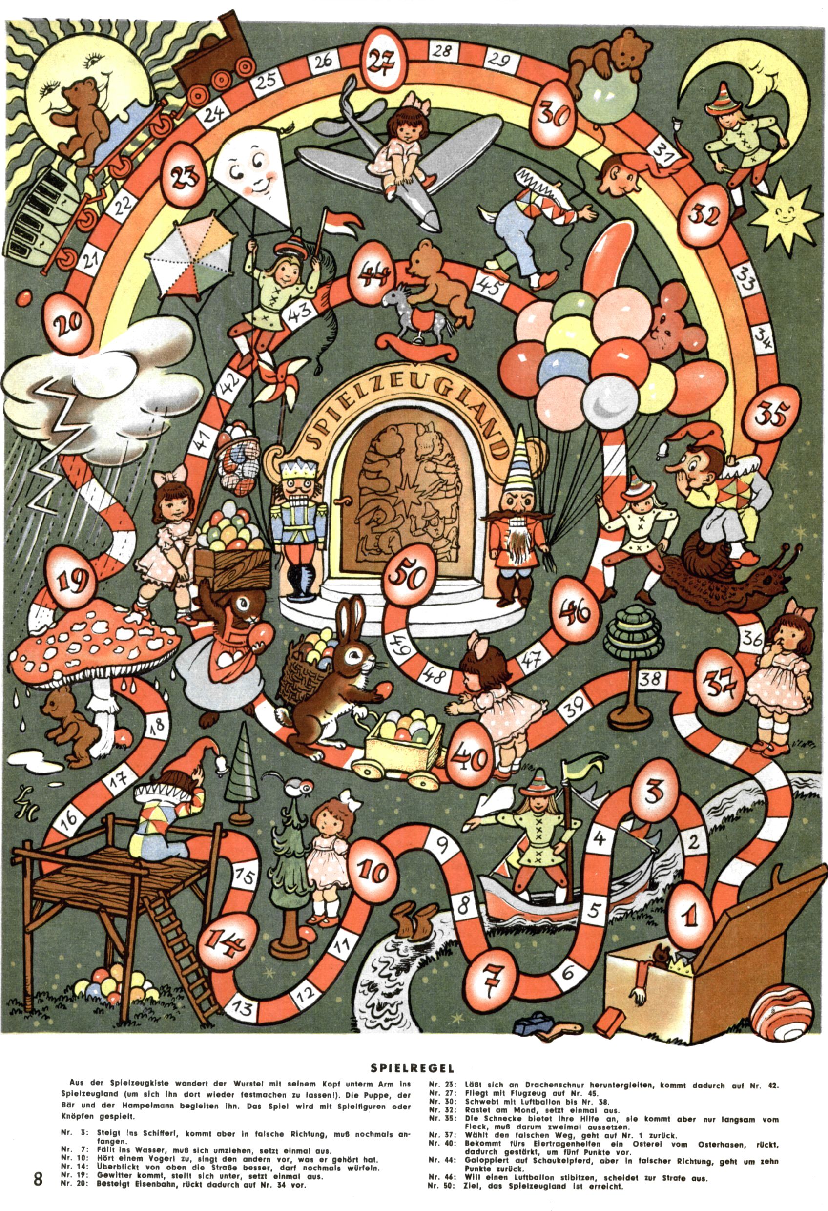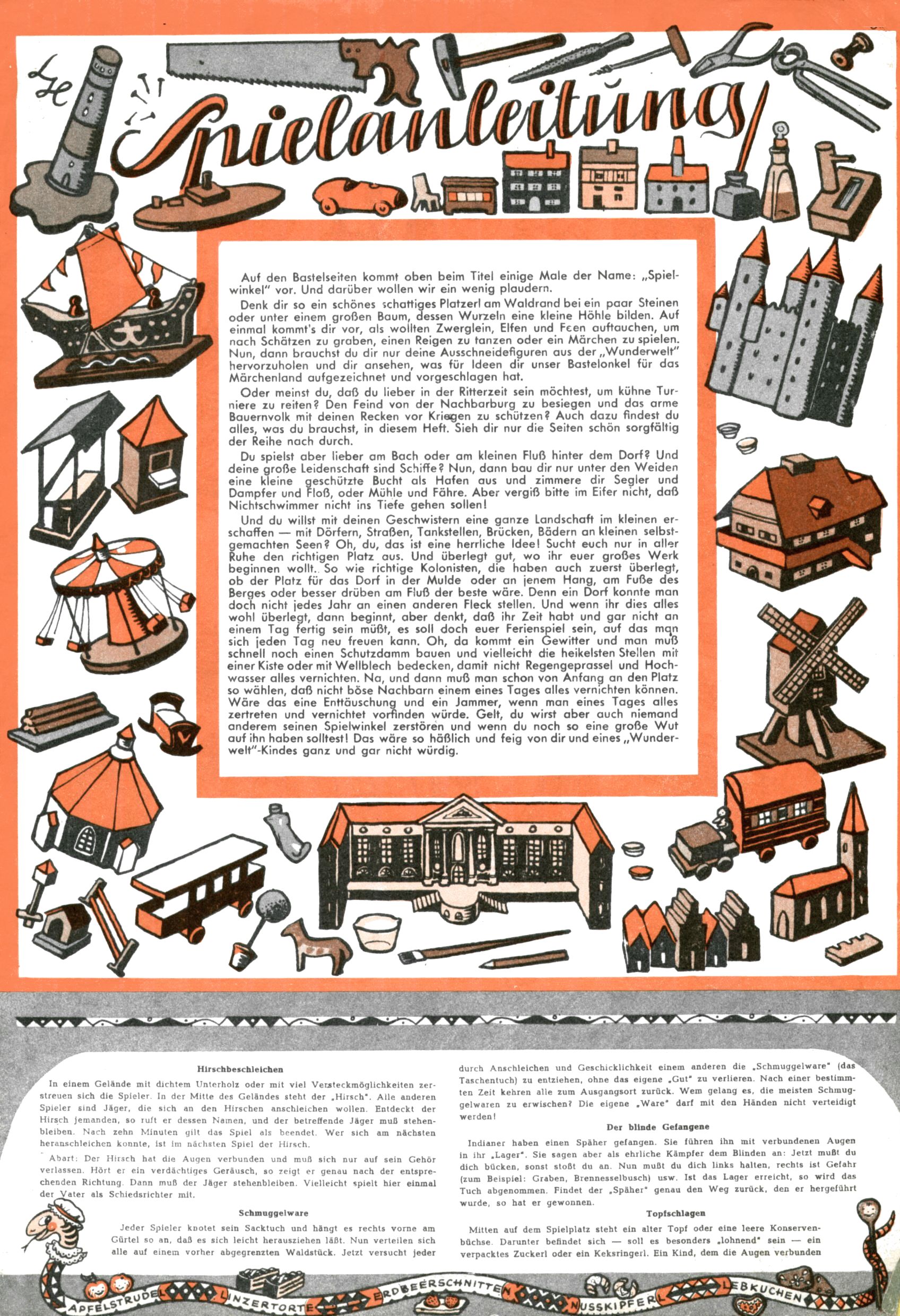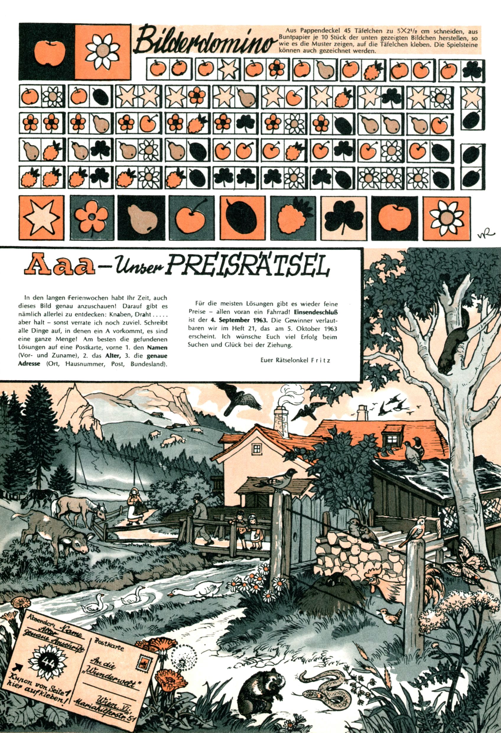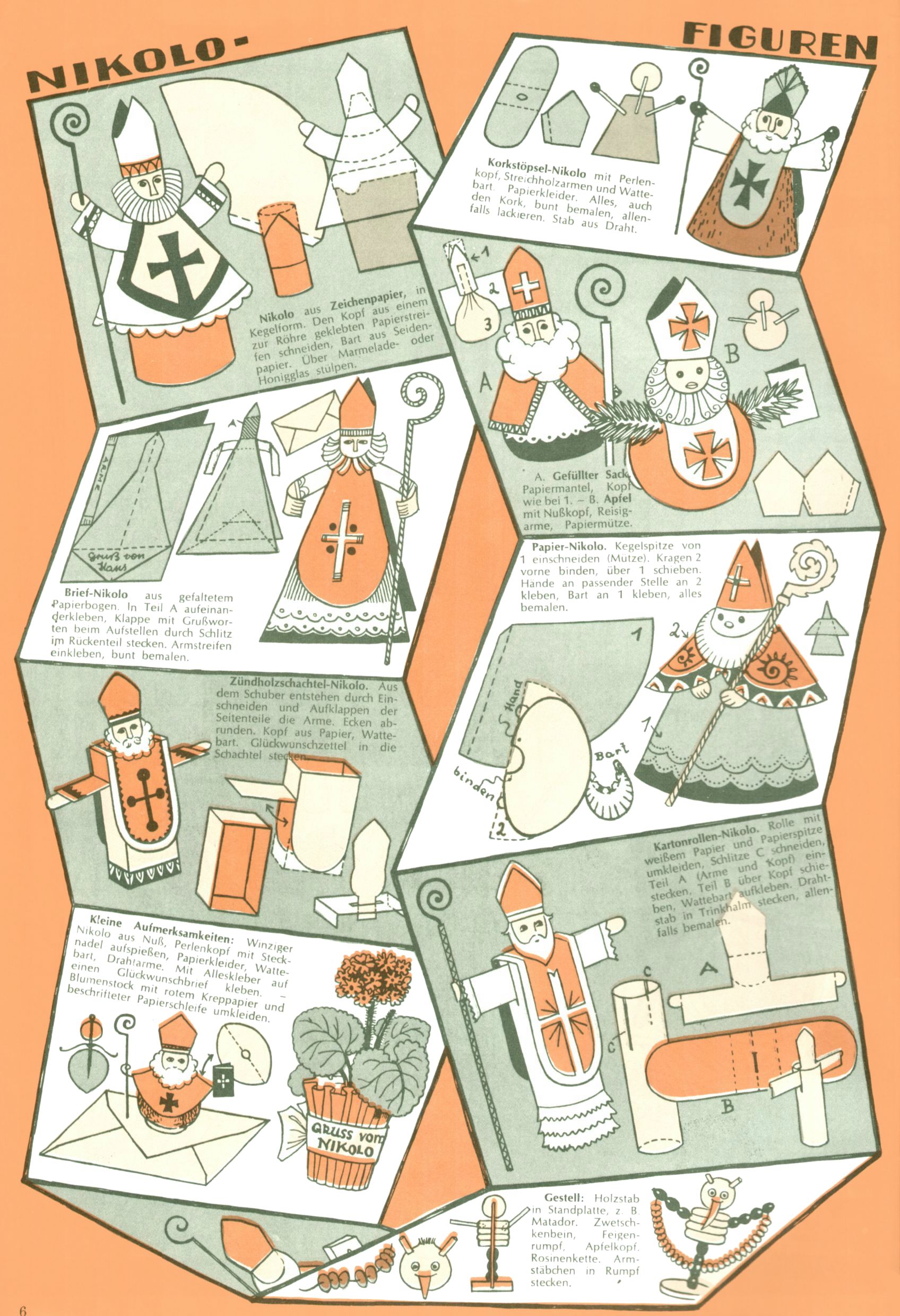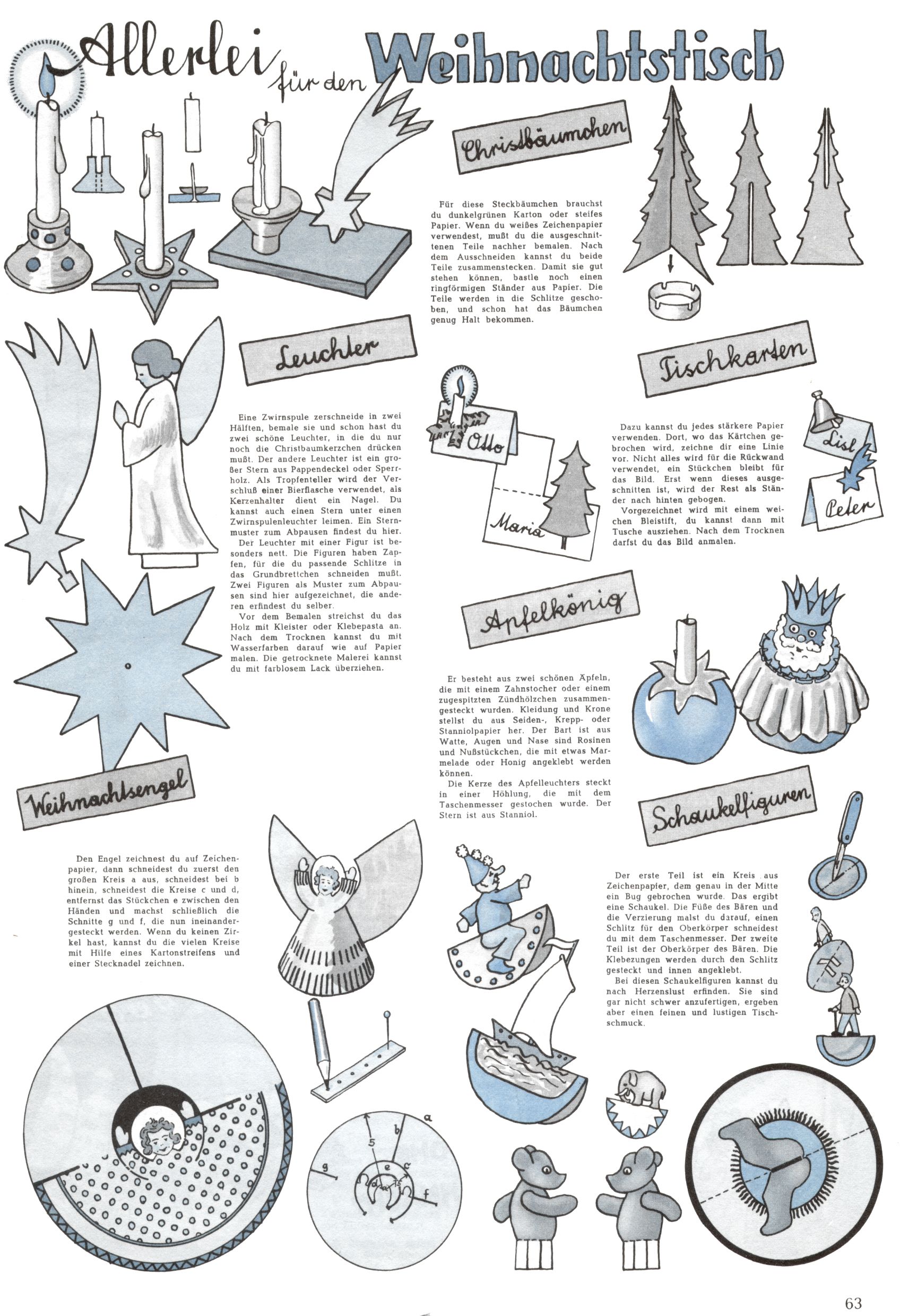 Die Wunderwelt im Festtagsgewand In den Sonderheften präsentierte sich die Wunderwelt wahrhaftig in Feiertagsstimmung. Mit wenigen Ausnahmen gab es pro Jahr drei Sonderhefte - zu Weihnachten bzw. im Advent, zu Ostern und in den Ferien im Sommer. Experimente mit Faschings- und Muttertagsheften hatten sich nicht bewährt. Selbst als es die Einzelhefte in der Krisensituation nach 1967 nicht mehr gab, wurde die Wunderwelt-Zeitung im Layout der Sonderhefte fortgesetzt: Zunächst mit 3 bis 5 und ab 1971 immerhin wieder mit 10-12 Heften pro Jahr. Die Weihnachts-, Oster- und Ferienhefte hatten naturgemäß verschiedene Schwerpunkte. Während im Sommer Spielen und Werken mit Material im Vordergrund stand, waren es zu Weihnachten Krippen und Adventhäuser; zu Ostern dann Erzählungen, Hasenstädte und Oster-Basteleien. Das bessere Papier der Sonderhefte erleichterte das Ausschneiden der insgesamt mehr als 1000 Papiermodelle erheblich. Die Sonderhefte waren vergleichsweise aufwändig gestaltet, aber auch ein wichtiges Zusatzgeschäft für die Zeitung. Die Kinder fieberten dem Erscheinungsdatum der jeweiligen Ausgabe nicht selten richtiggehend entgegen. Mit knapp 100 Seiten pro Jahr machten die Sonderhefte von der Menge her zwar nicht einmal ein Viertel aus, trugen aber zum Erscheinungsbild mindestens genauso viel bei wie die Standardhefte. Im Wesentlichen blieb das Layout der Sonderhefte über die Jahre hin unverändert. Mühselig wurde es, als man den Inhalt der Beiträge vorübergehend auf die Seiten gleichmäßig verteilte und die Kinder ermunterte, die Hefte in der Mitte zu zerschneiden. Die eine Hälfte enthielt dann etwa Erzählungen und Bastelvorschläge, der andere Teil der Zeitung Spielanleitungen. Zur übersichtlichkeit trugen diese Layoutversuche jedenfalls in keiner Weise bei und als besonderen Auswuchs gab es eine Zeitlang auf einer Seite oft mehrere Seitennummern, je nachdem, ob sich diese auf das Gesamtheft oder den herauszunehmenden und zu zerschneidenden Heftteil bezogen. Gegen Ende der 1950er Jahre kehrte man wieder zu einem ganzseitigen Layout zurück und Ideen wie ein Spiel-(Heft-im-)Heft gehörten der Vergangenheit an. In den Sonderheften experimentierte man dann noch ab Mitte der 1960er Jahre, als die Verkaufszahlen stark rückläufig waren, mit grundsätzlich neuen Darstellungsformen - weg vom Niedlich-Kitschigen und engagierte neue Grafikerinnen wie Gundi Groh und Hella Soyka. Den erhofften Erfolg brachte dies jedoch nicht mehr. |