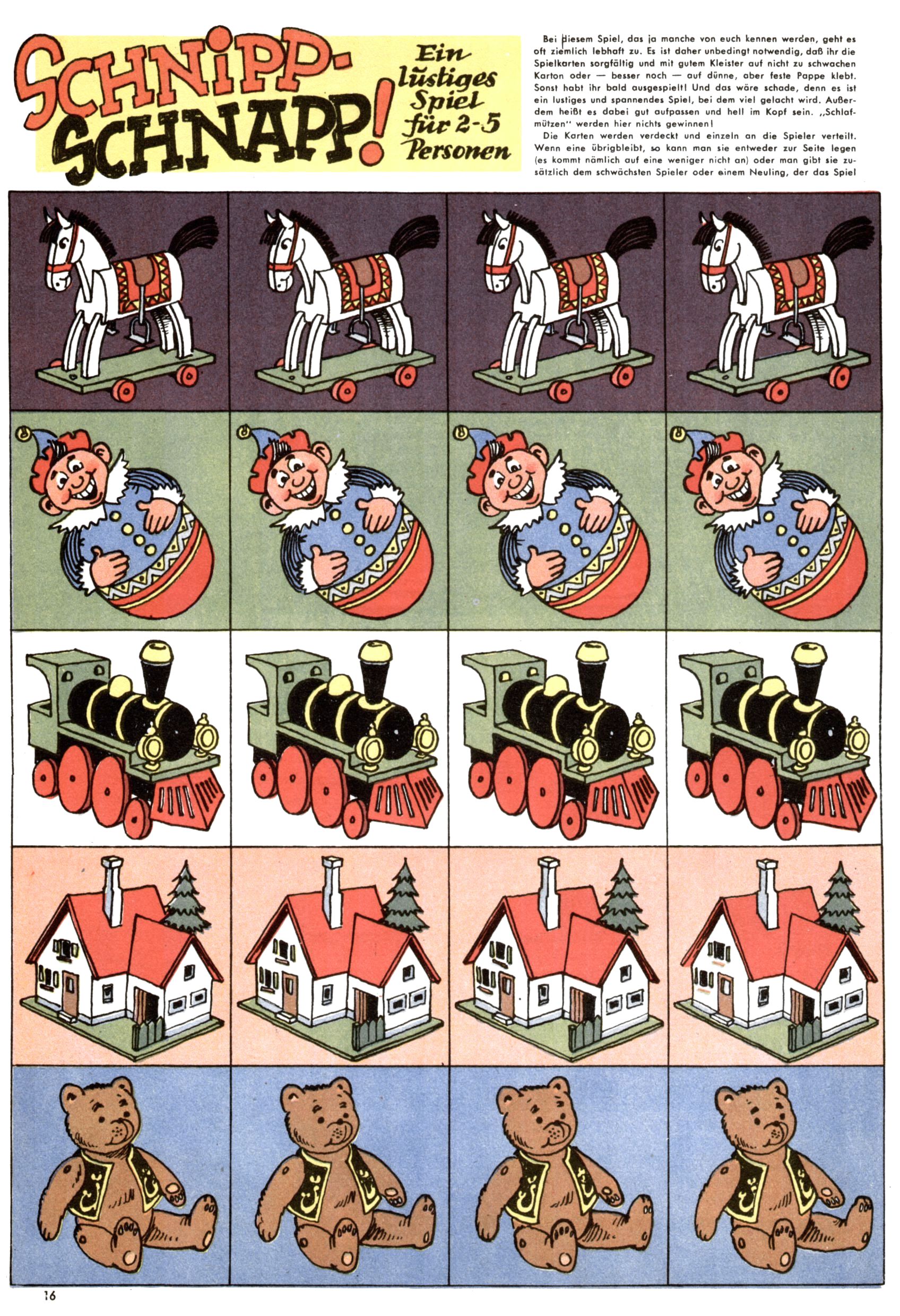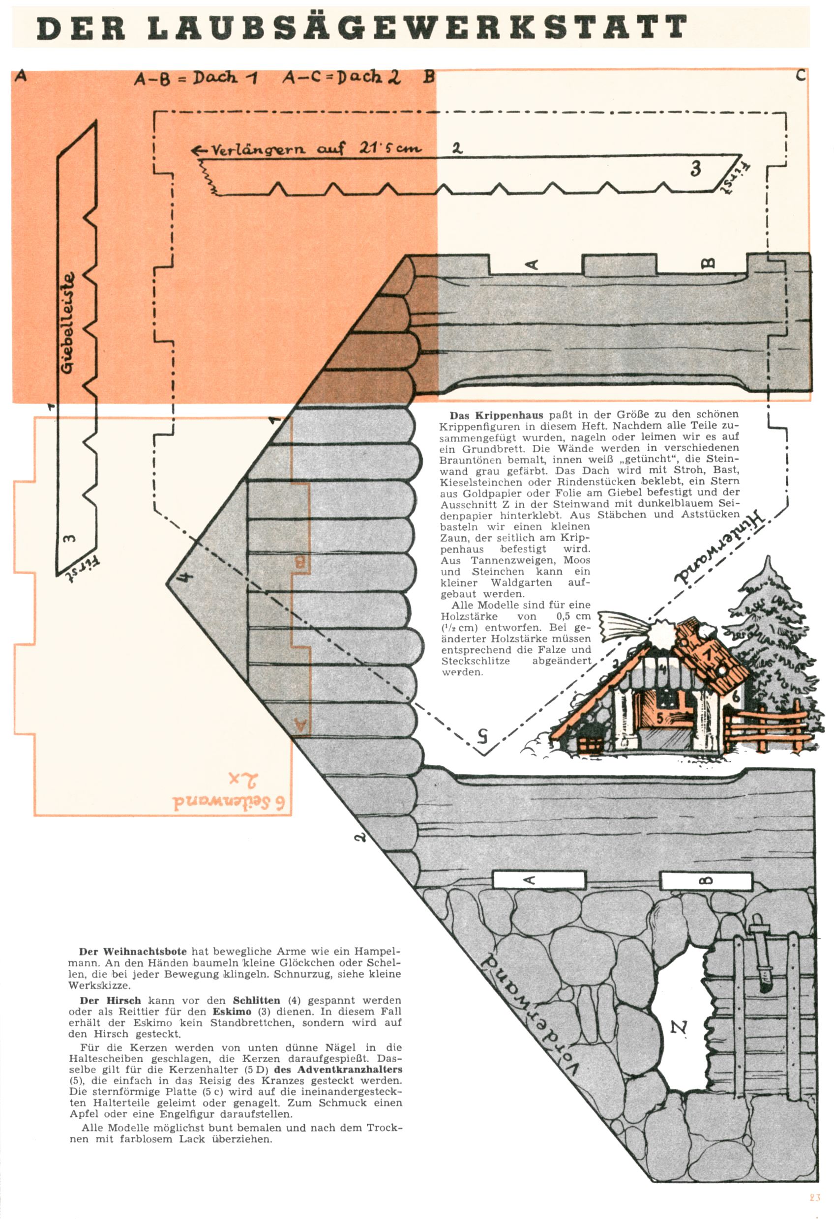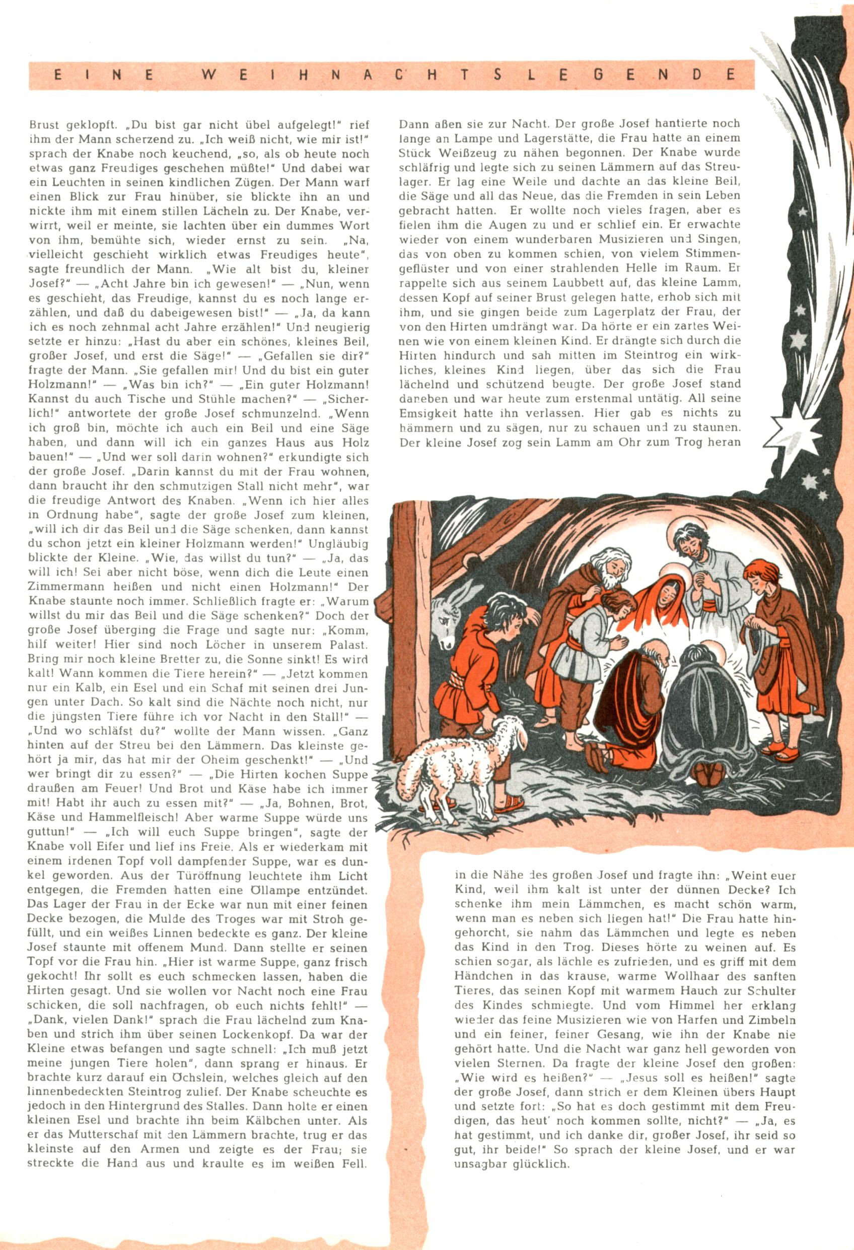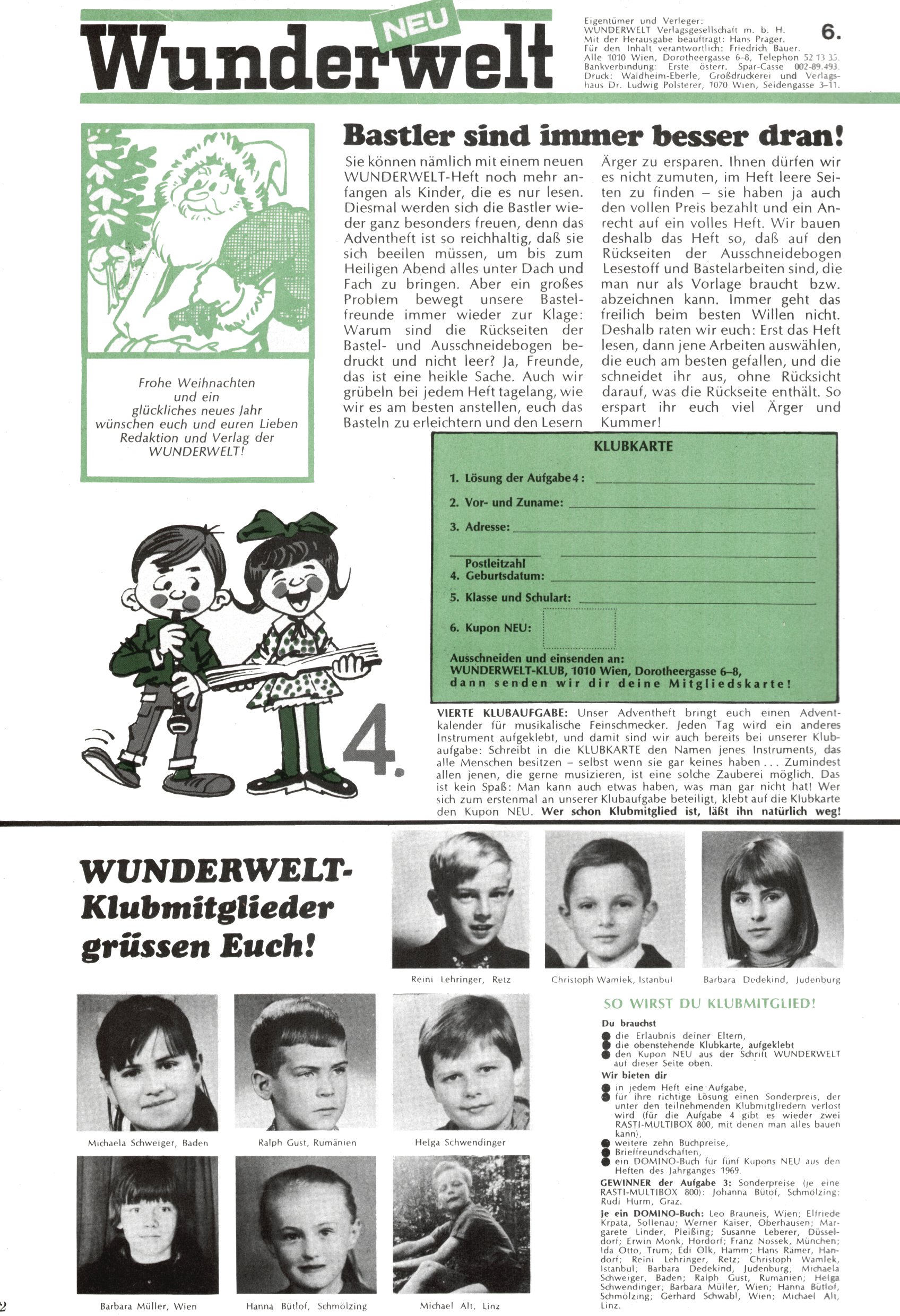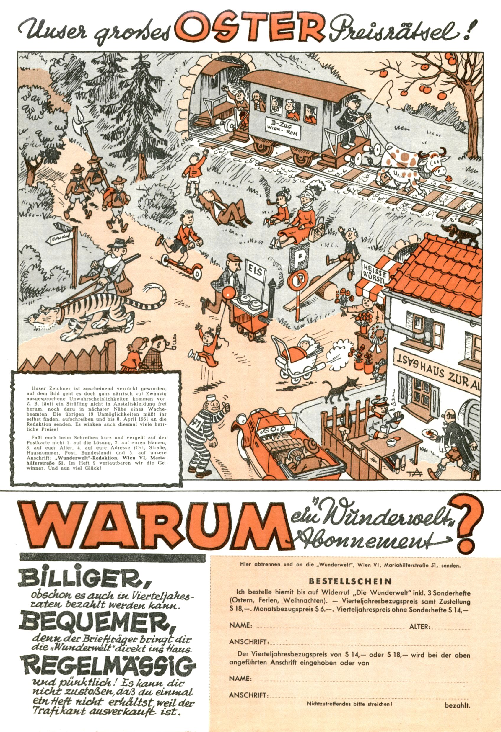 Die Wunderwelt im Festtagsgewand In den Sonderheften präsentierte sich die Wunderwelt wahrhaftig in Feiertagsstimmung. Mit wenigen Ausnahmen gab es pro Jahr drei Sonderhefte - zu Weihnachten bzw. im Advent, zu Ostern und in den Ferien im Sommer. Experimente mit Faschings- und Muttertagsheften hatten sich nicht bewährt. Selbst als es die Einzelhefte in der Krisensituation nach 1967 nicht mehr gab, wurde die Wunderwelt-Zeitung im Layout der Sonderhefte fortgesetzt: Zunächst mit 3 bis 5 und ab 1971 immerhin wieder mit 10-12 Heften pro Jahr. Die Weihnachts-, Oster- und Ferienhefte hatten naturgemäß verschiedene Schwerpunkte. Während im Sommer Spielen und Werken mit Material im Vordergrund stand, waren es zu Weihnachten Krippen und Adventhäuser; zu Ostern dann Erzählungen, Hasenstädte und Oster-Basteleien. Das bessere Papier der Sonderhefte erleichterte das Ausschneiden der insgesamt mehr als 1000 Papiermodelle erheblich. Die Sonderhefte waren vergleichsweise aufwändig gestaltet, aber auch ein wichtiges Zusatzgeschäft für die Zeitung. Die Kinder fieberten dem Erscheinungsdatum der jeweiligen Ausgabe nicht selten richtiggehend entgegen. Mit knapp 100 Seiten pro Jahr machten die Sonderhefte von der Menge her zwar nicht einmal ein Viertel aus, trugen aber zum Erscheinungsbild mindestens genauso viel bei wie die Standardhefte. Im Wesentlichen blieb das Layout der Sonderhefte über die Jahre hin unverändert. Mühselig wurde es, als man den Inhalt der Beiträge vorübergehend auf die Seiten gleichmäßig verteilte und die Kinder ermunterte, die Hefte in der Mitte zu zerschneiden. Die eine Hälfte enthielt dann etwa Erzählungen und Bastelvorschläge, der andere Teil der Zeitung Spielanleitungen. Zur übersichtlichkeit trugen diese Layoutversuche jedenfalls in keiner Weise bei und als besonderen Auswuchs gab es eine Zeitlang auf einer Seite oft mehrere Seitennummern, je nachdem, ob sich diese auf das Gesamtheft oder den herauszunehmenden und zu zerschneidenden Heftteil bezogen. Gegen Ende der 1950er Jahre kehrte man wieder zu einem ganzseitigen Layout zurück und Ideen wie ein Spiel-(Heft-im-)Heft gehörten der Vergangenheit an. In den Sonderheften experimentierte man dann noch ab Mitte der 1960er Jahre, als die Verkaufszahlen stark rückläufig waren, mit grundsätzlich neuen Darstellungsformen - weg vom Niedlich-Kitschigen und engagierte neue Grafikerinnen wie Gundi Groh und Hella Soyka. Den erhofften Erfolg brachte dies jedoch nicht mehr. |