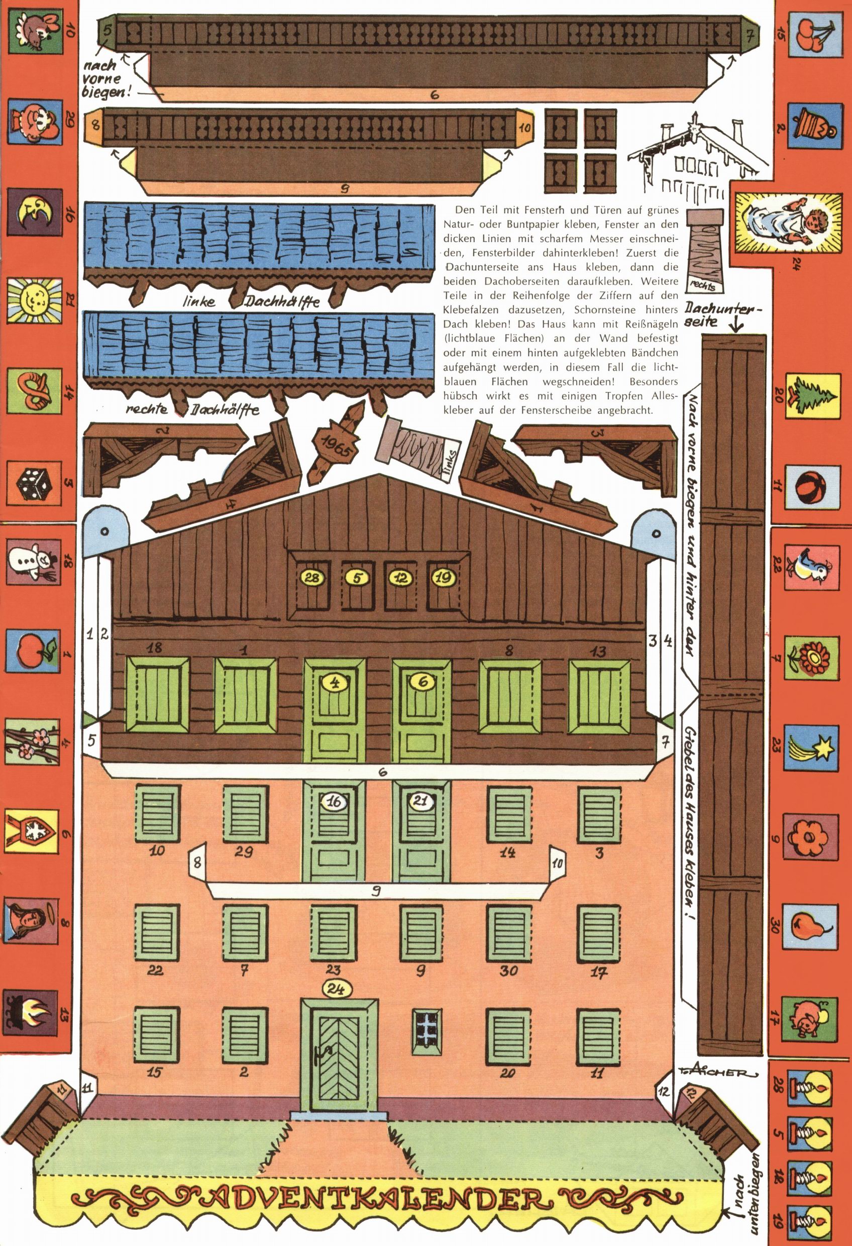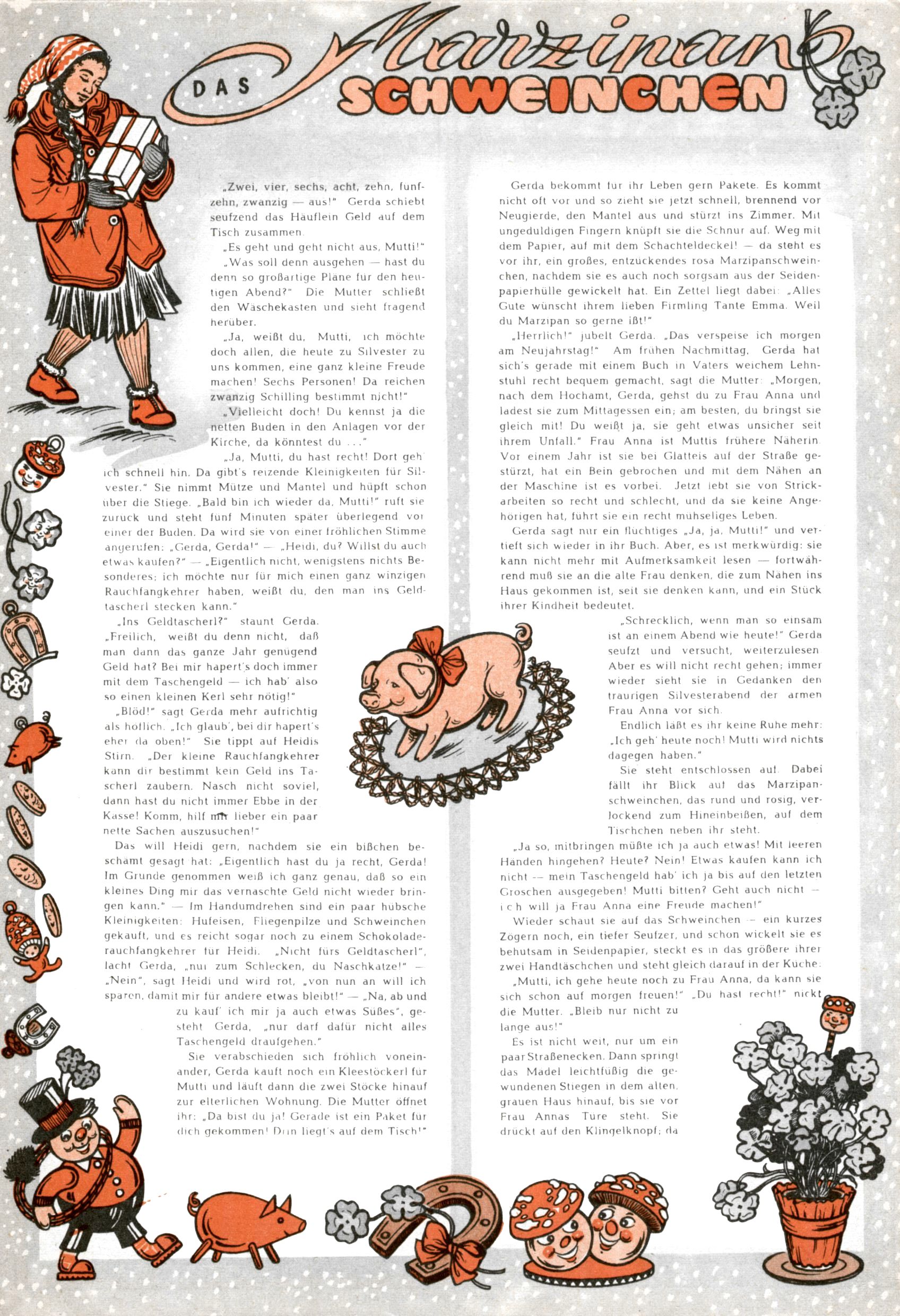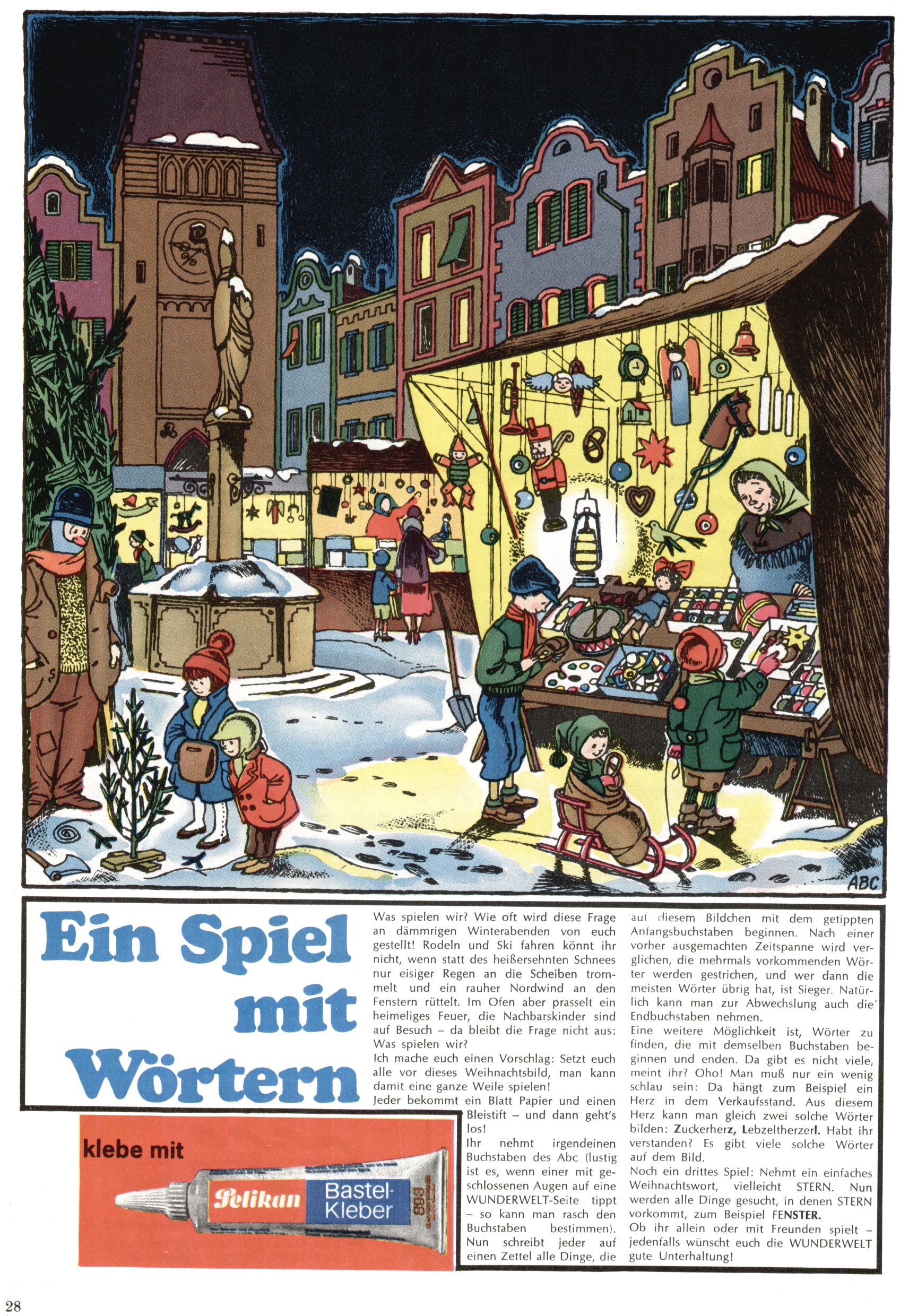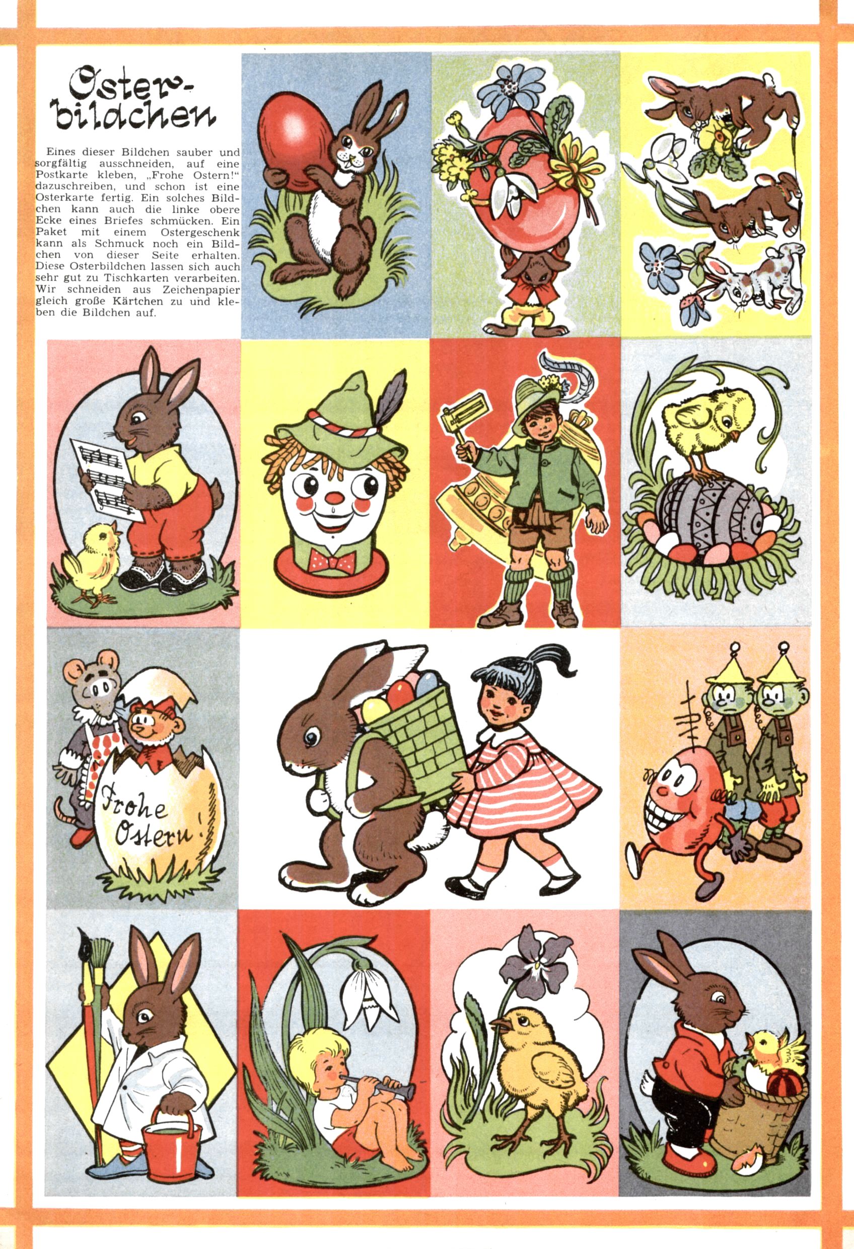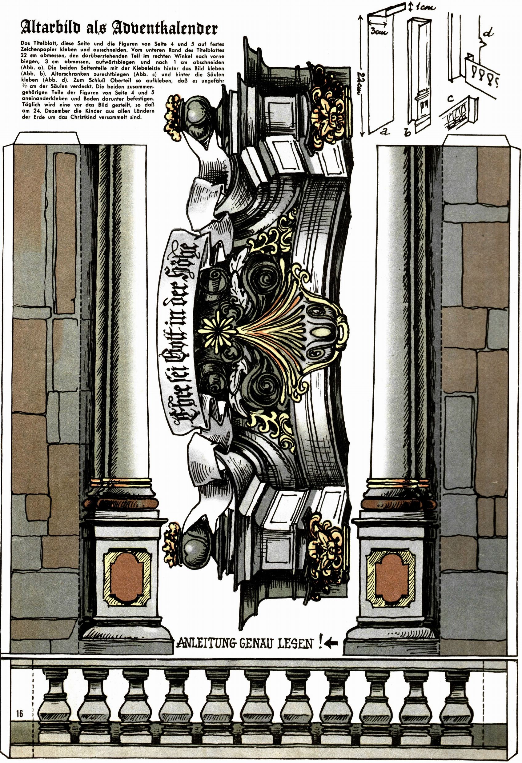 Die Wunderwelt im Festtagsgewand In den Sonderheften präsentierte sich die Wunderwelt wahrhaftig in Feiertagsstimmung. Mit wenigen Ausnahmen gab es pro Jahr drei Sonderhefte - zu Weihnachten bzw. im Advent, zu Ostern und in den Ferien im Sommer. Experimente mit Faschings- und Muttertagsheften hatten sich nicht bewährt. Selbst als es die Einzelhefte in der Krisensituation nach 1967 nicht mehr gab, wurde die Wunderwelt-Zeitung im Layout der Sonderhefte fortgesetzt: Zunächst mit 3 bis 5 und ab 1971 immerhin wieder mit 10-12 Heften pro Jahr. Die Weihnachts-, Oster- und Ferienhefte hatten naturgemäß verschiedene Schwerpunkte. Während im Sommer Spielen und Werken mit Material im Vordergrund stand, waren es zu Weihnachten Krippen und Adventhäuser; zu Ostern dann Erzählungen, Hasenstädte und Oster-Basteleien. Das bessere Papier der Sonderhefte erleichterte das Ausschneiden der insgesamt mehr als 1000 Papiermodelle erheblich. Die Sonderhefte waren vergleichsweise aufwändig gestaltet, aber auch ein wichtiges Zusatzgeschäft für die Zeitung. Die Kinder fieberten dem Erscheinungsdatum der jeweiligen Ausgabe nicht selten richtiggehend entgegen. Mit knapp 100 Seiten pro Jahr machten die Sonderhefte von der Menge her zwar nicht einmal ein Viertel aus, trugen aber zum Erscheinungsbild mindestens genauso viel bei wie die Standardhefte. Im Wesentlichen blieb das Layout der Sonderhefte über die Jahre hin unverändert. Mühselig wurde es, als man den Inhalt der Beiträge vorübergehend auf die Seiten gleichmäßig verteilte und die Kinder ermunterte, die Hefte in der Mitte zu zerschneiden. Die eine Hälfte enthielt dann etwa Erzählungen und Bastelvorschläge, der andere Teil der Zeitung Spielanleitungen. Zur übersichtlichkeit trugen diese Layoutversuche jedenfalls in keiner Weise bei und als besonderen Auswuchs gab es eine Zeitlang auf einer Seite oft mehrere Seitennummern, je nachdem, ob sich diese auf das Gesamtheft oder den herauszunehmenden und zu zerschneidenden Heftteil bezogen. Gegen Ende der 1950er Jahre kehrte man wieder zu einem ganzseitigen Layout zurück und Ideen wie ein Spiel-(Heft-im-)Heft gehörten der Vergangenheit an. In den Sonderheften experimentierte man dann noch ab Mitte der 1960er Jahre, als die Verkaufszahlen stark rückläufig waren, mit grundsätzlich neuen Darstellungsformen - weg vom Niedlich-Kitschigen und engagierte neue Grafikerinnen wie Gundi Groh und Hella Soyka. Den erhofften Erfolg brachte dies jedoch nicht mehr. |