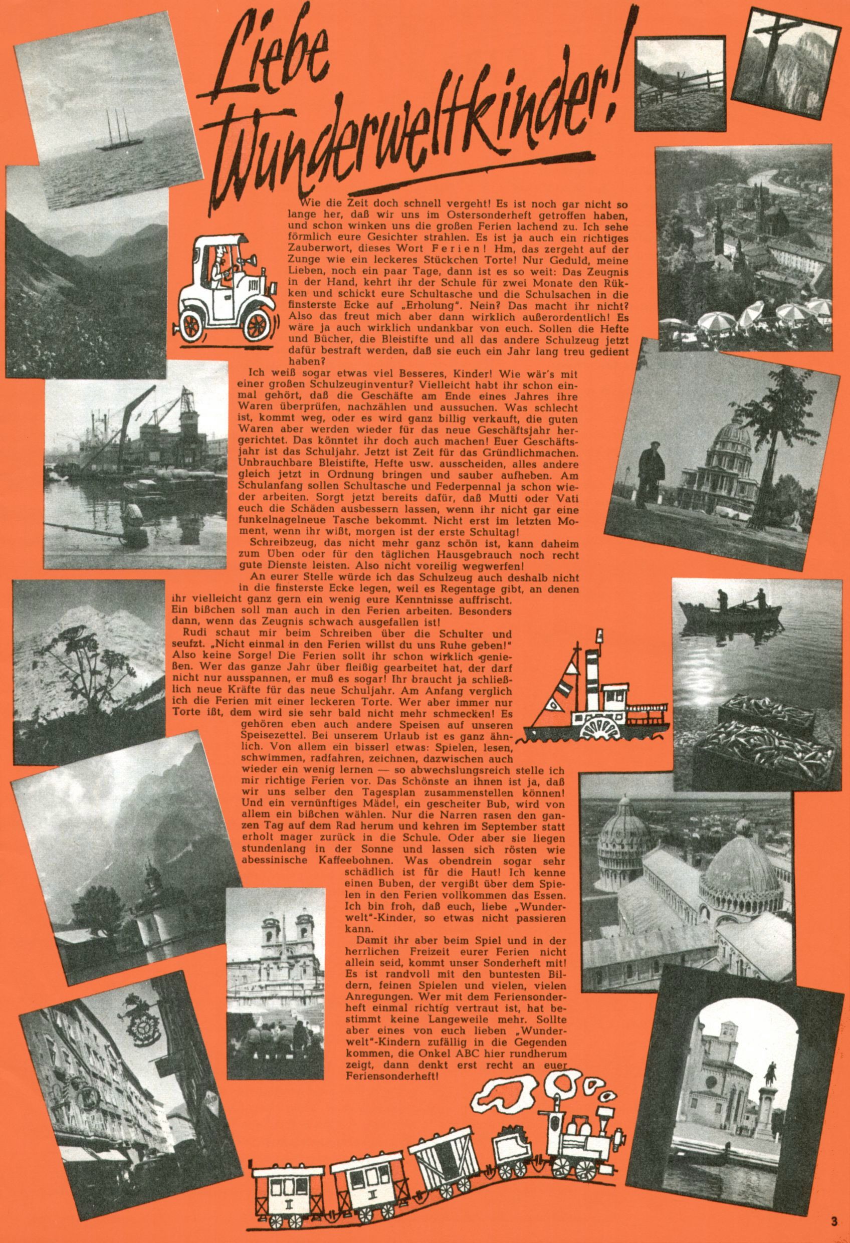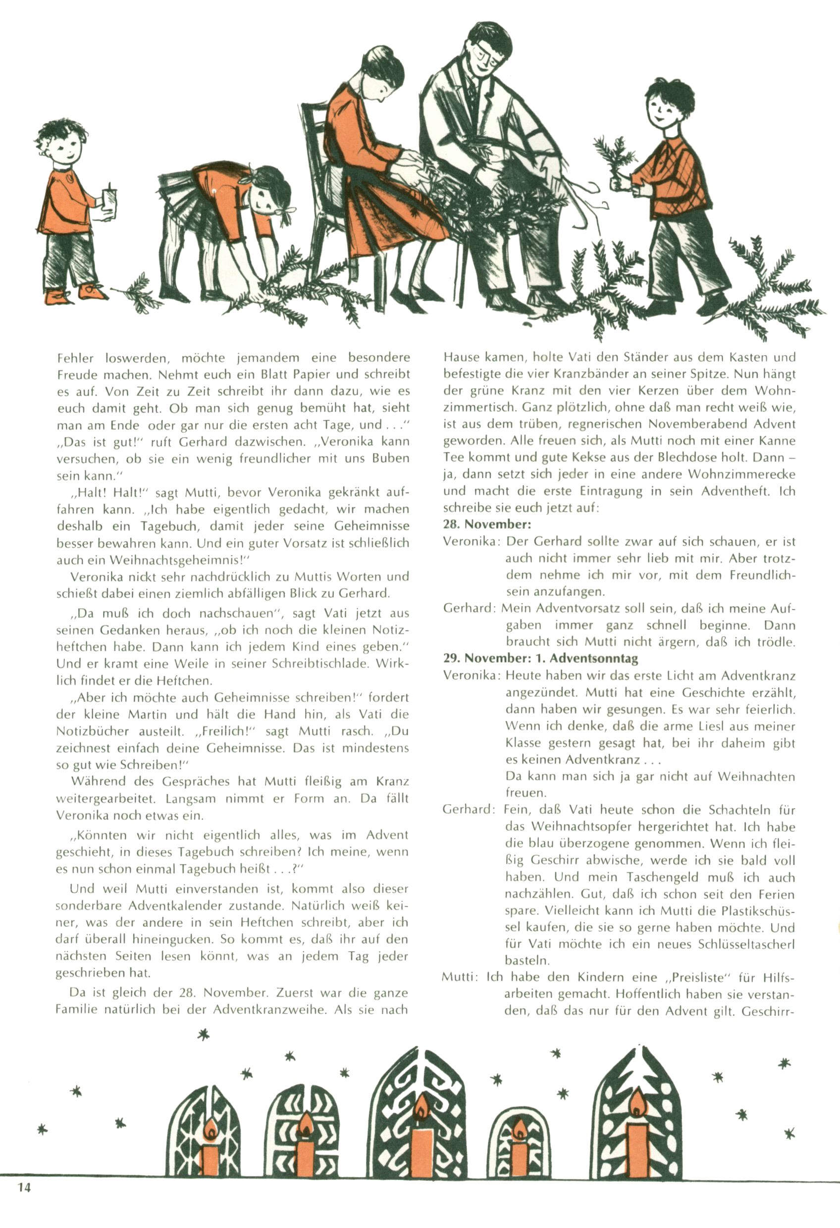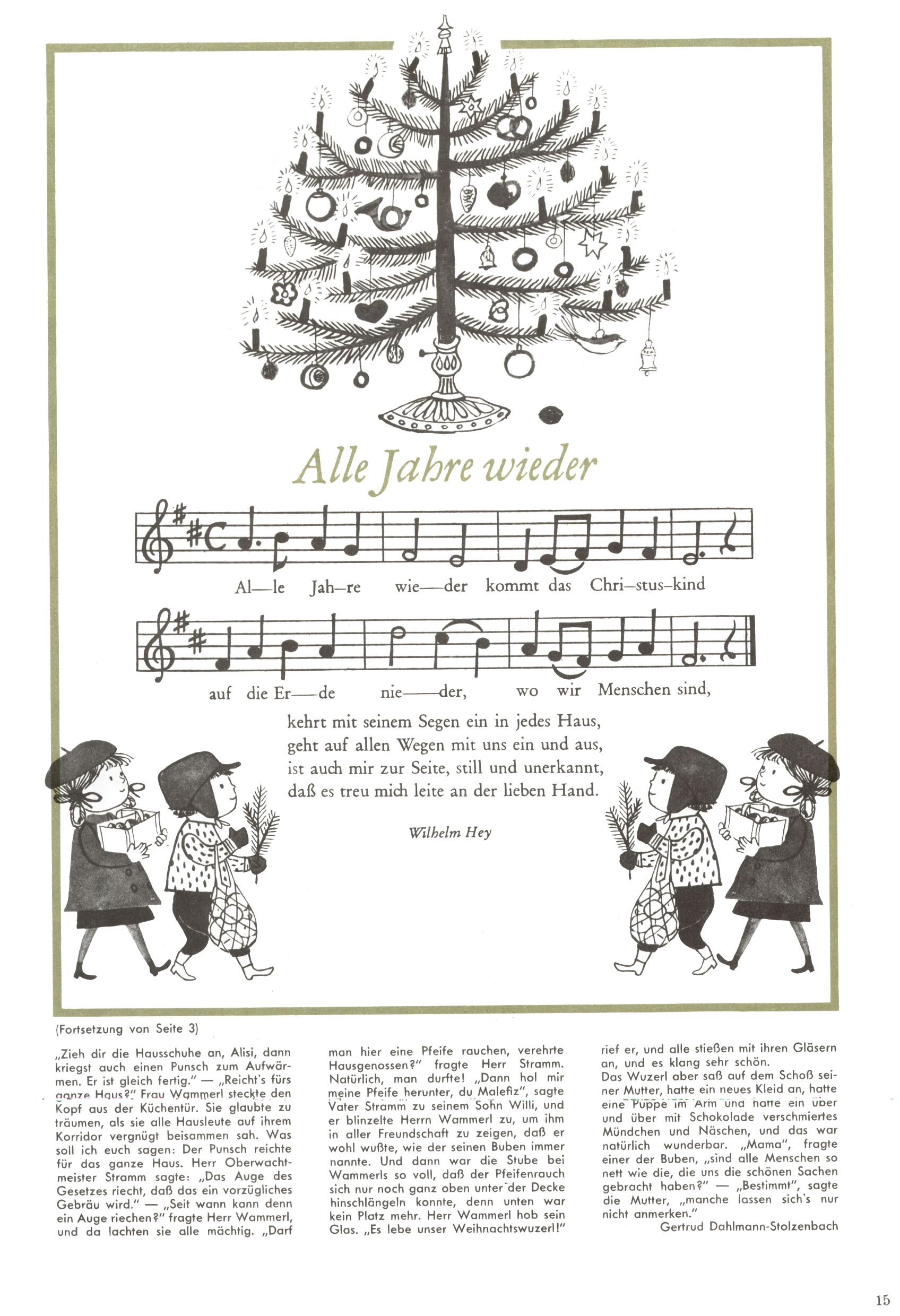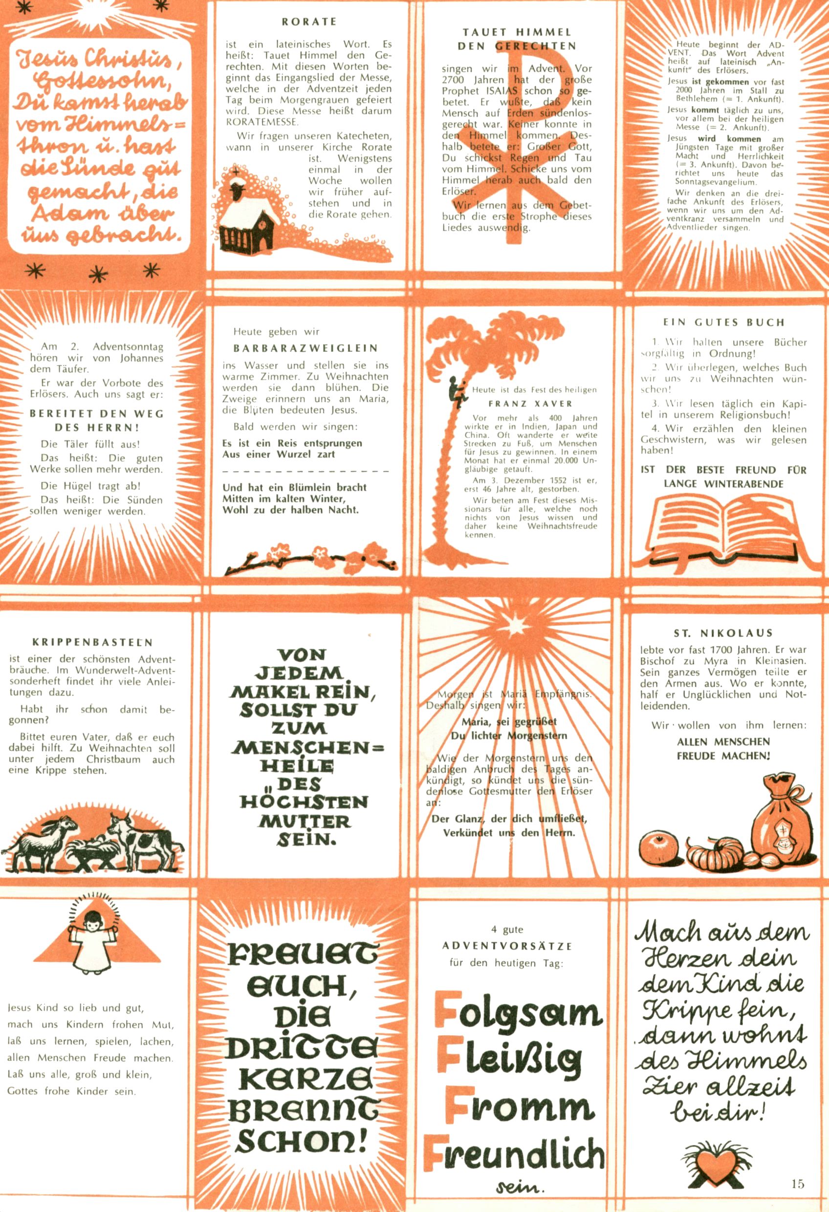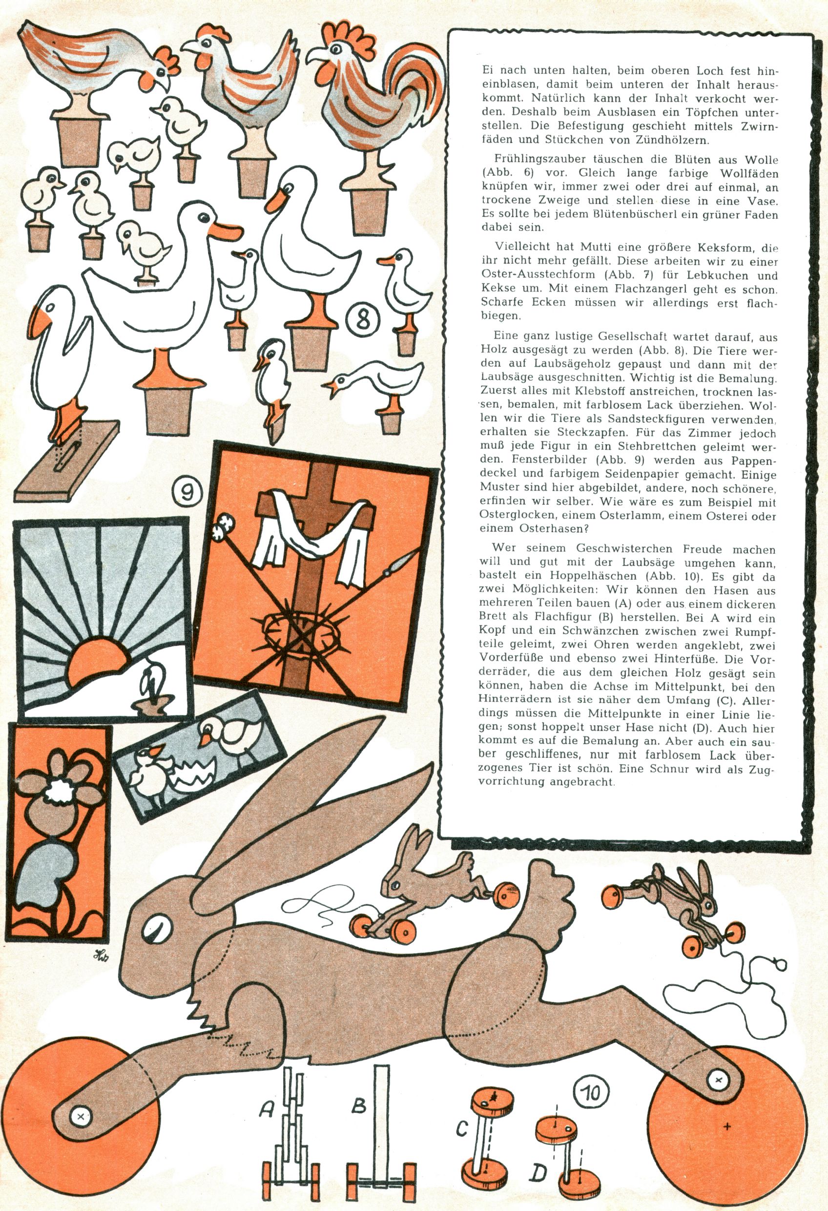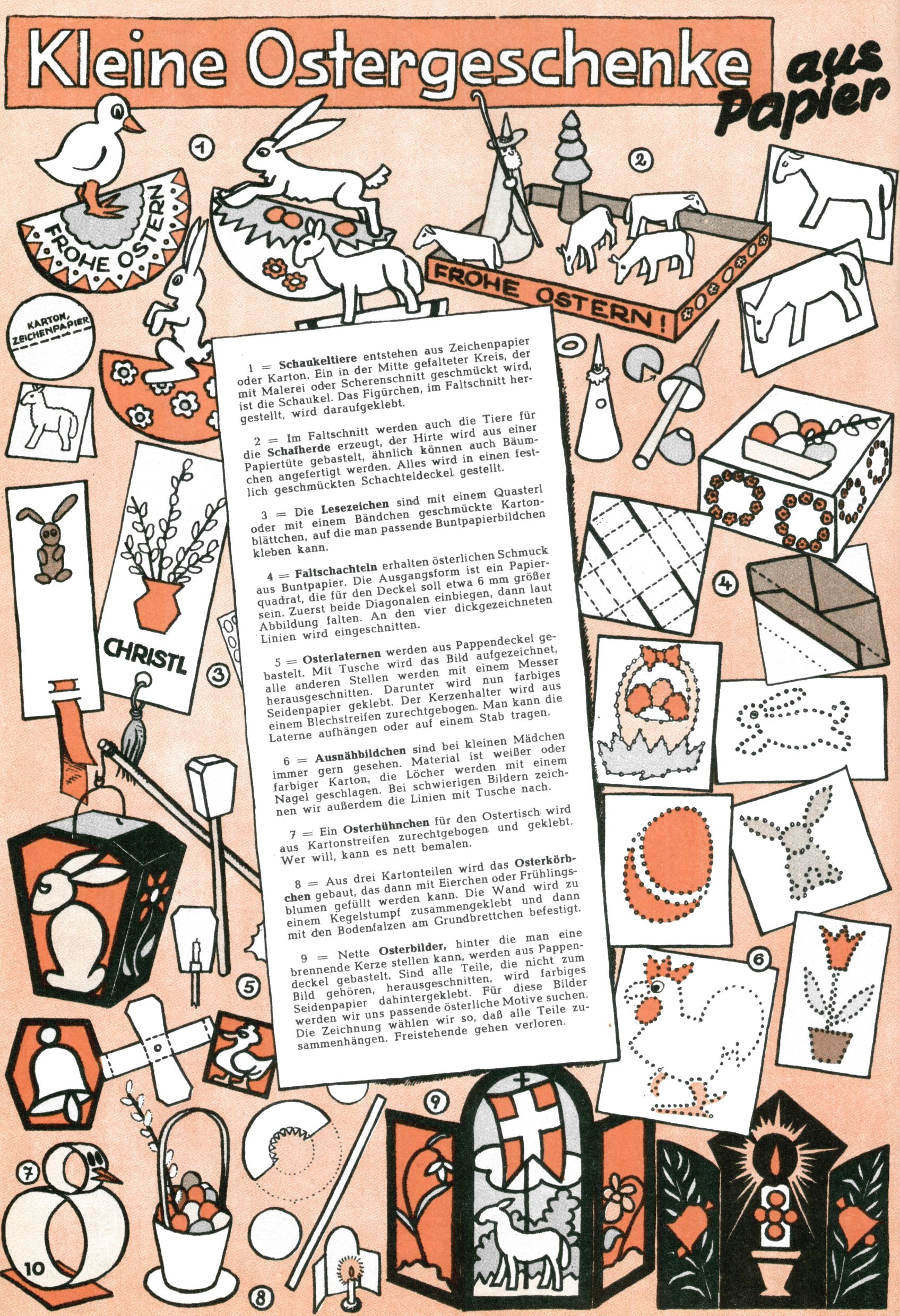 Die Wunderwelt im Festtagsgewand In den Sonderheften präsentierte sich die Wunderwelt wahrhaftig in Feiertagsstimmung. Mit wenigen Ausnahmen gab es pro Jahr drei Sonderhefte - zu Weihnachten bzw. im Advent, zu Ostern und in den Ferien im Sommer. Experimente mit Faschings- und Muttertagsheften hatten sich nicht bewährt. Selbst als es die Einzelhefte in der Krisensituation nach 1967 nicht mehr gab, wurde die Wunderwelt-Zeitung im Layout der Sonderhefte fortgesetzt: Zunächst mit 3 bis 5 und ab 1971 immerhin wieder mit 10-12 Heften pro Jahr. Die Weihnachts-, Oster- und Ferienhefte hatten naturgemäß verschiedene Schwerpunkte. Während im Sommer Spielen und Werken mit Material im Vordergrund stand, waren es zu Weihnachten Krippen und Adventhäuser; zu Ostern dann Erzählungen, Hasenstädte und Oster-Basteleien. Das bessere Papier der Sonderhefte erleichterte das Ausschneiden der insgesamt mehr als 1000 Papiermodelle erheblich. Die Sonderhefte waren vergleichsweise aufwändig gestaltet, aber auch ein wichtiges Zusatzgeschäft für die Zeitung. Die Kinder fieberten dem Erscheinungsdatum der jeweiligen Ausgabe nicht selten richtiggehend entgegen. Mit knapp 100 Seiten pro Jahr machten die Sonderhefte von der Menge her zwar nicht einmal ein Viertel aus, trugen aber zum Erscheinungsbild mindestens genauso viel bei wie die Standardhefte. Im Wesentlichen blieb das Layout der Sonderhefte über die Jahre hin unverändert. Mühselig wurde es, als man den Inhalt der Beiträge vorübergehend auf die Seiten gleichmäßig verteilte und die Kinder ermunterte, die Hefte in der Mitte zu zerschneiden. Die eine Hälfte enthielt dann etwa Erzählungen und Bastelvorschläge, der andere Teil der Zeitung Spielanleitungen. Zur übersichtlichkeit trugen diese Layoutversuche jedenfalls in keiner Weise bei und als besonderen Auswuchs gab es eine Zeitlang auf einer Seite oft mehrere Seitennummern, je nachdem, ob sich diese auf das Gesamtheft oder den herauszunehmenden und zu zerschneidenden Heftteil bezogen. Gegen Ende der 1950er Jahre kehrte man wieder zu einem ganzseitigen Layout zurück und Ideen wie ein Spiel-(Heft-im-)Heft gehörten der Vergangenheit an. In den Sonderheften experimentierte man dann noch ab Mitte der 1960er Jahre, als die Verkaufszahlen stark rückläufig waren, mit grundsätzlich neuen Darstellungsformen - weg vom Niedlich-Kitschigen und engagierte neue Grafikerinnen wie Gundi Groh und Hella Soyka. Den erhofften Erfolg brachte dies jedoch nicht mehr. |