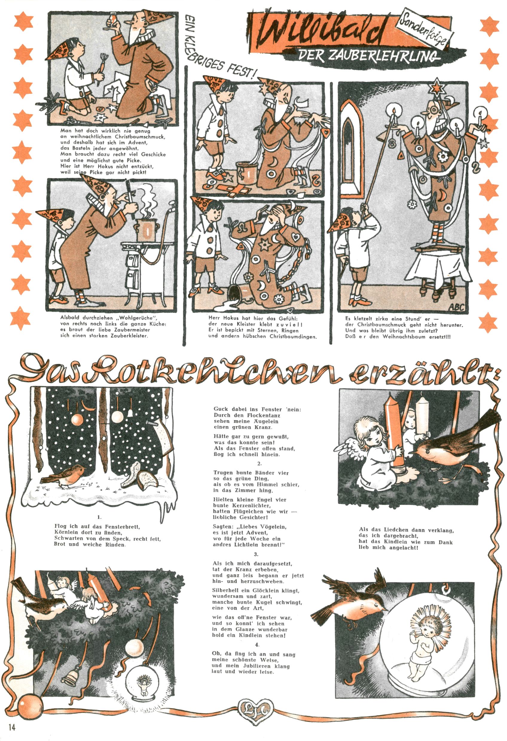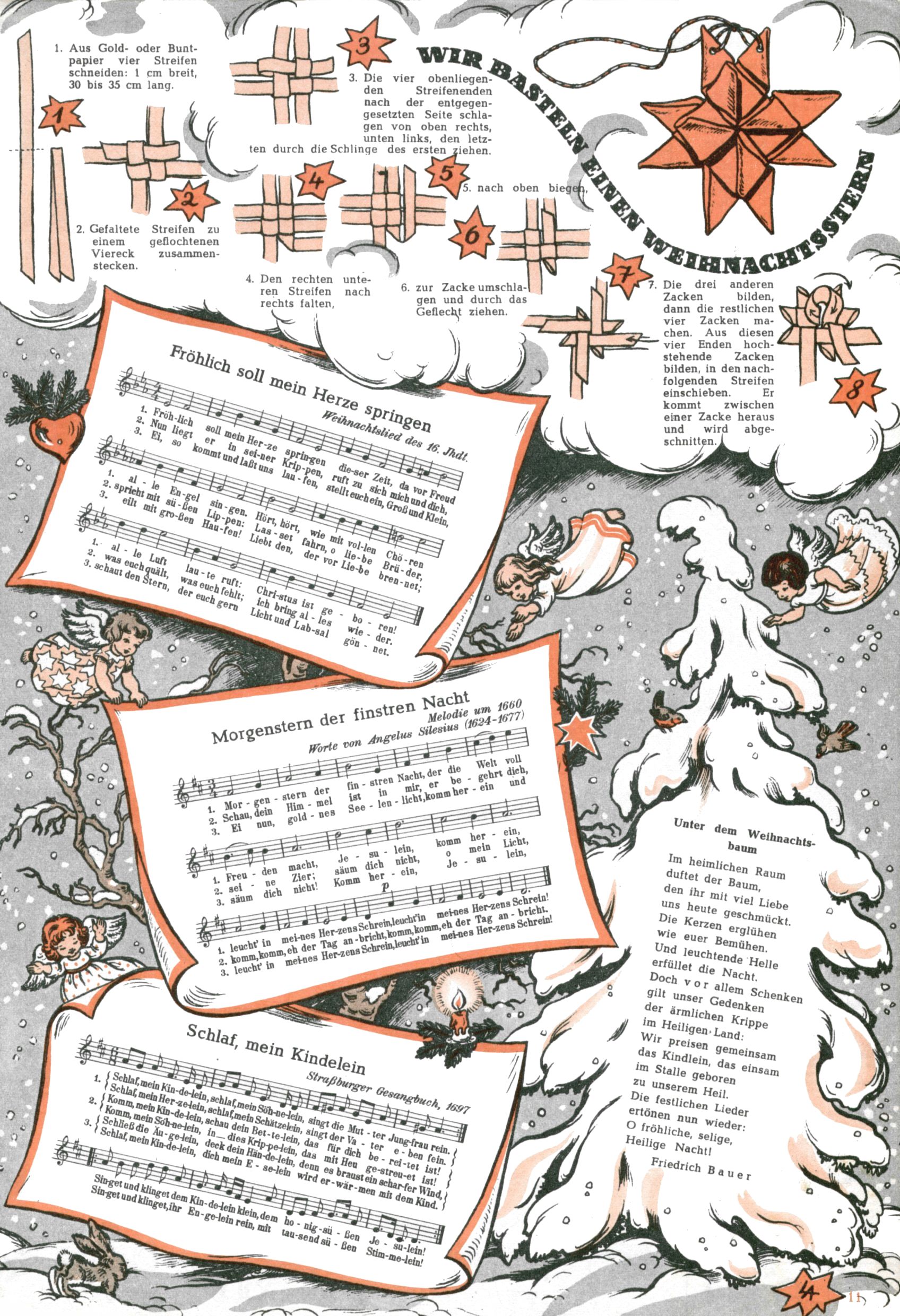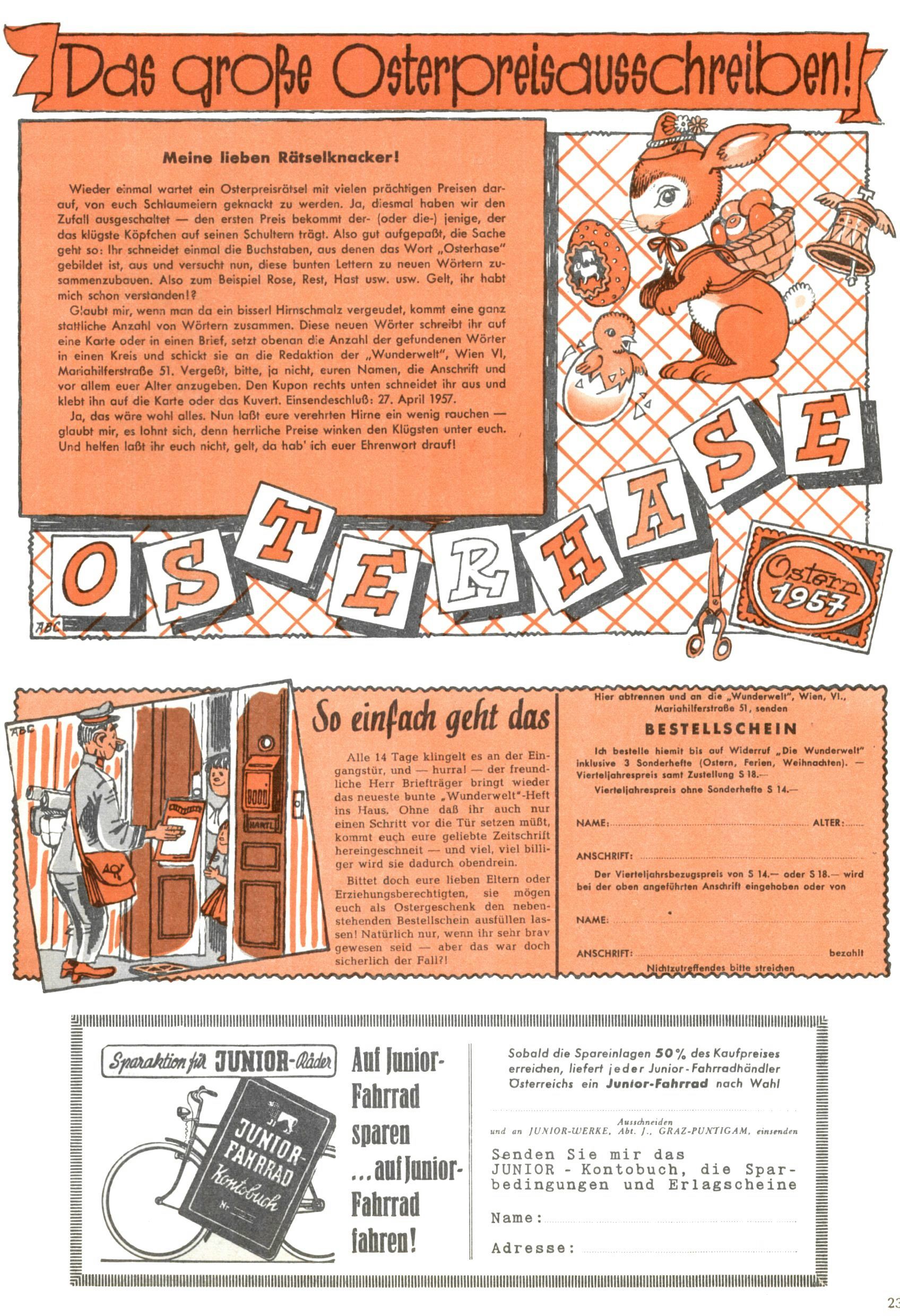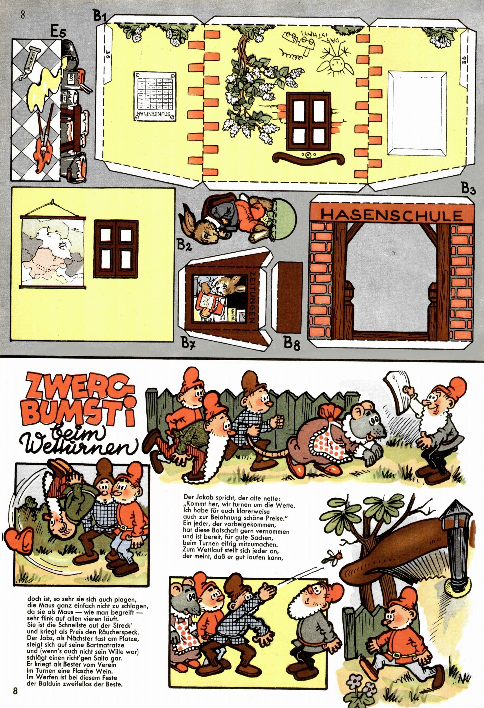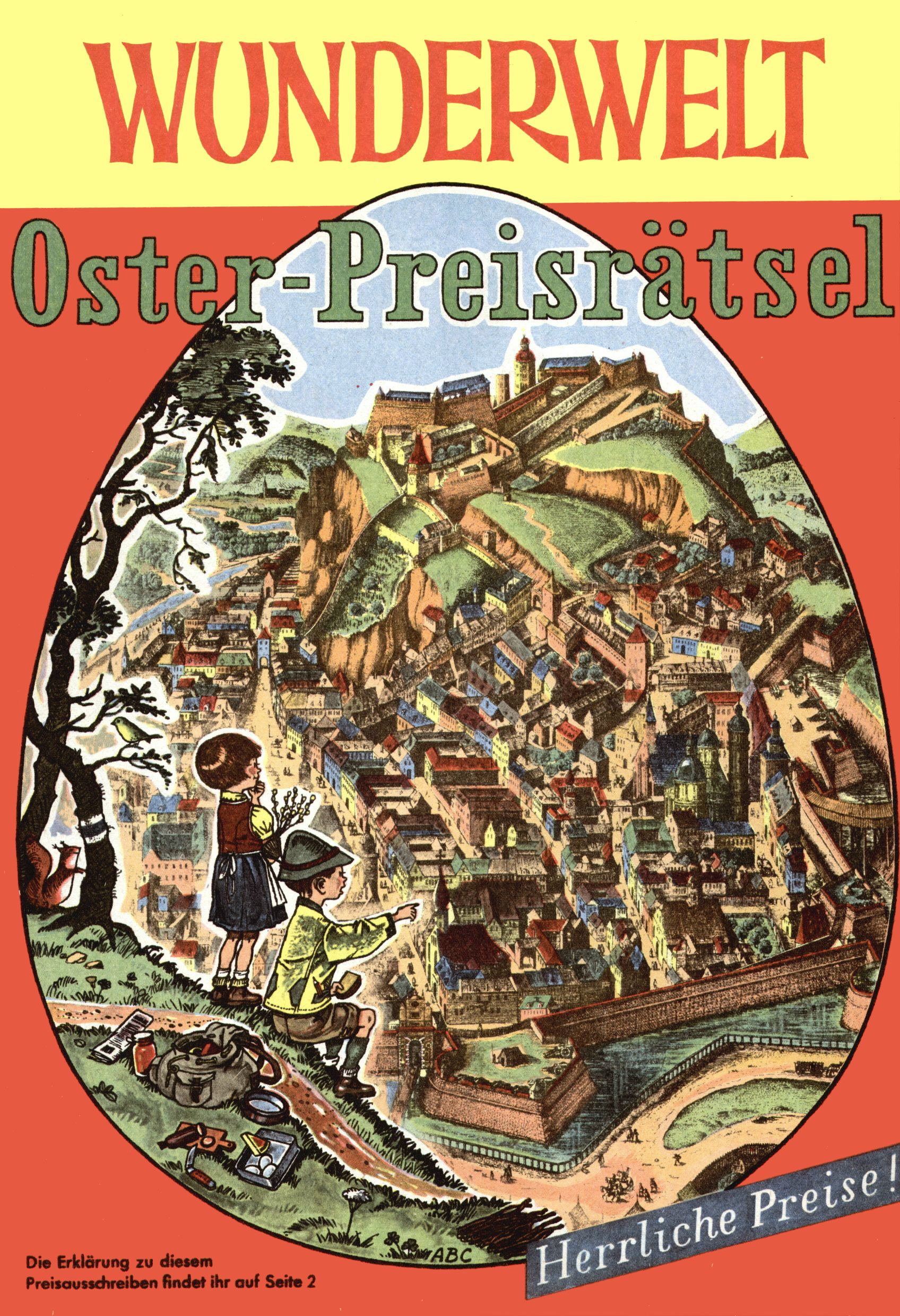 Die Wunderwelt im Festtagsgewand In den Sonderheften präsentierte sich die Wunderwelt wahrhaftig in Feiertagsstimmung. Mit wenigen Ausnahmen gab es pro Jahr drei Sonderhefte - zu Weihnachten bzw. im Advent, zu Ostern und in den Ferien im Sommer. Experimente mit Faschings- und Muttertagsheften hatten sich nicht bewährt. Selbst als es die Einzelhefte in der Krisensituation nach 1967 nicht mehr gab, wurde die Wunderwelt-Zeitung im Layout der Sonderhefte fortgesetzt: Zunächst mit 3 bis 5 und ab 1971 immerhin wieder mit 10-12 Heften pro Jahr. Die Weihnachts-, Oster- und Ferienhefte hatten naturgemäß verschiedene Schwerpunkte. Während im Sommer Spielen und Werken mit Material im Vordergrund stand, waren es zu Weihnachten Krippen und Adventhäuser; zu Ostern dann Erzählungen, Hasenstädte und Oster-Basteleien. Das bessere Papier der Sonderhefte erleichterte das Ausschneiden der insgesamt mehr als 1000 Papiermodelle erheblich. Die Sonderhefte waren vergleichsweise aufwändig gestaltet, aber auch ein wichtiges Zusatzgeschäft für die Zeitung. Die Kinder fieberten dem Erscheinungsdatum der jeweiligen Ausgabe nicht selten richtiggehend entgegen. Mit knapp 100 Seiten pro Jahr machten die Sonderhefte von der Menge her zwar nicht einmal ein Viertel aus, trugen aber zum Erscheinungsbild mindestens genauso viel bei wie die Standardhefte. Im Wesentlichen blieb das Layout der Sonderhefte über die Jahre hin unverändert. Mühselig wurde es, als man den Inhalt der Beiträge vorübergehend auf die Seiten gleichmäßig verteilte und die Kinder ermunterte, die Hefte in der Mitte zu zerschneiden. Die eine Hälfte enthielt dann etwa Erzählungen und Bastelvorschläge, der andere Teil der Zeitung Spielanleitungen. Zur übersichtlichkeit trugen diese Layoutversuche jedenfalls in keiner Weise bei und als besonderen Auswuchs gab es eine Zeitlang auf einer Seite oft mehrere Seitennummern, je nachdem, ob sich diese auf das Gesamtheft oder den herauszunehmenden und zu zerschneidenden Heftteil bezogen. Gegen Ende der 1950er Jahre kehrte man wieder zu einem ganzseitigen Layout zurück und Ideen wie ein Spiel-(Heft-im-)Heft gehörten der Vergangenheit an. In den Sonderheften experimentierte man dann noch ab Mitte der 1960er Jahre, als die Verkaufszahlen stark rückläufig waren, mit grundsätzlich neuen Darstellungsformen - weg vom Niedlich-Kitschigen und engagierte neue Grafikerinnen wie Gundi Groh und Hella Soyka. Den erhofften Erfolg brachte dies jedoch nicht mehr. |