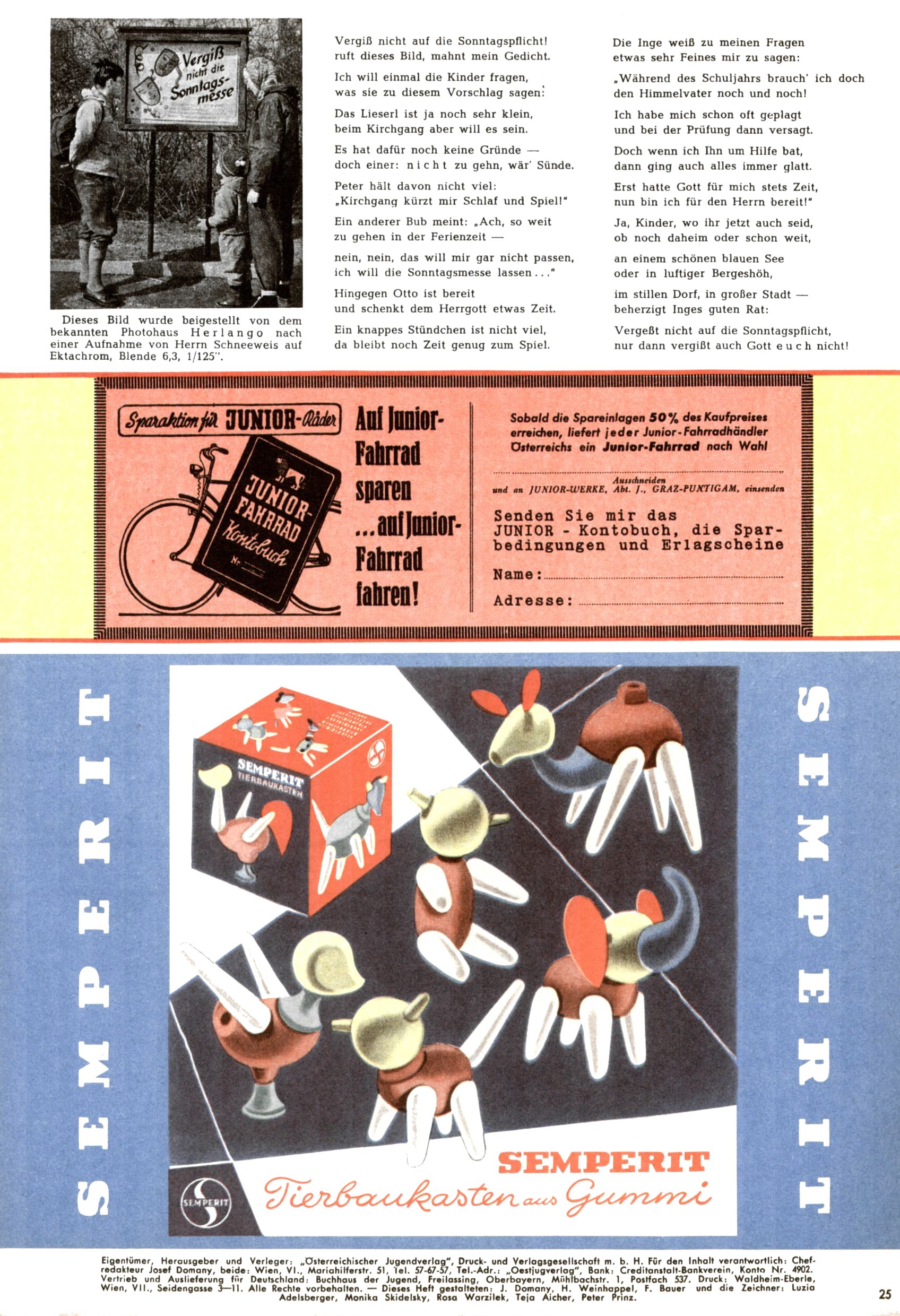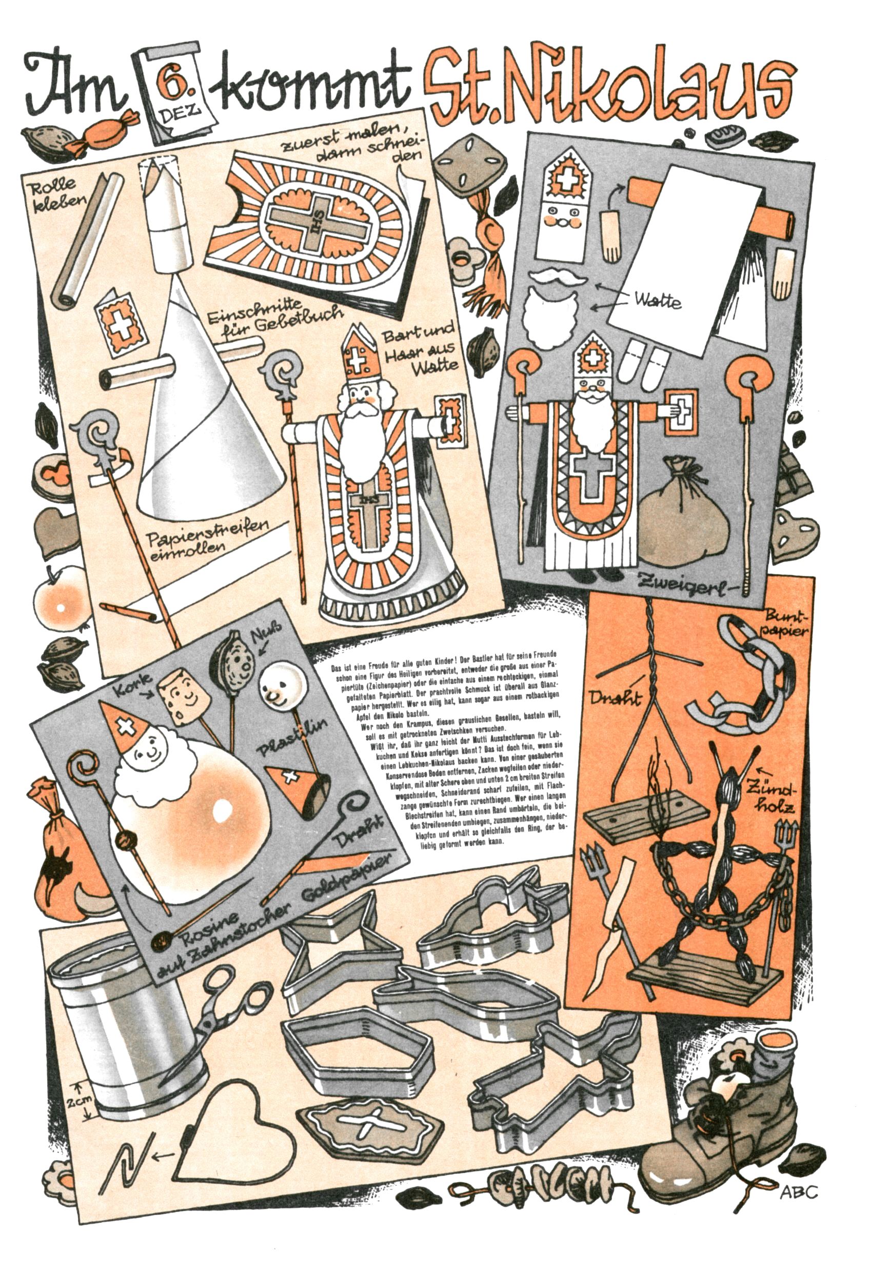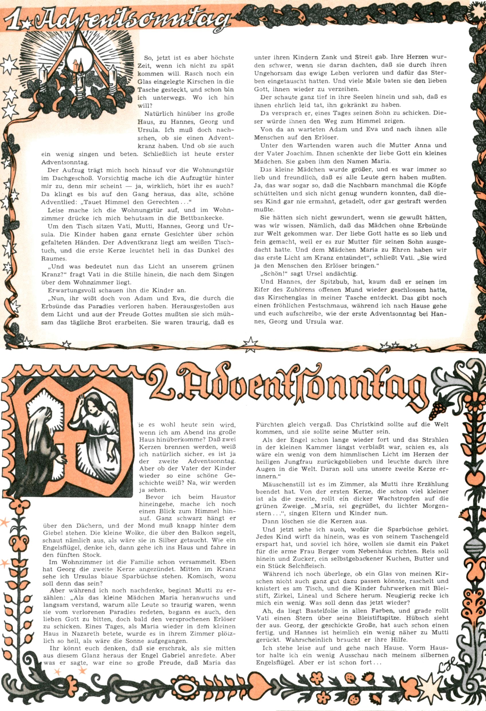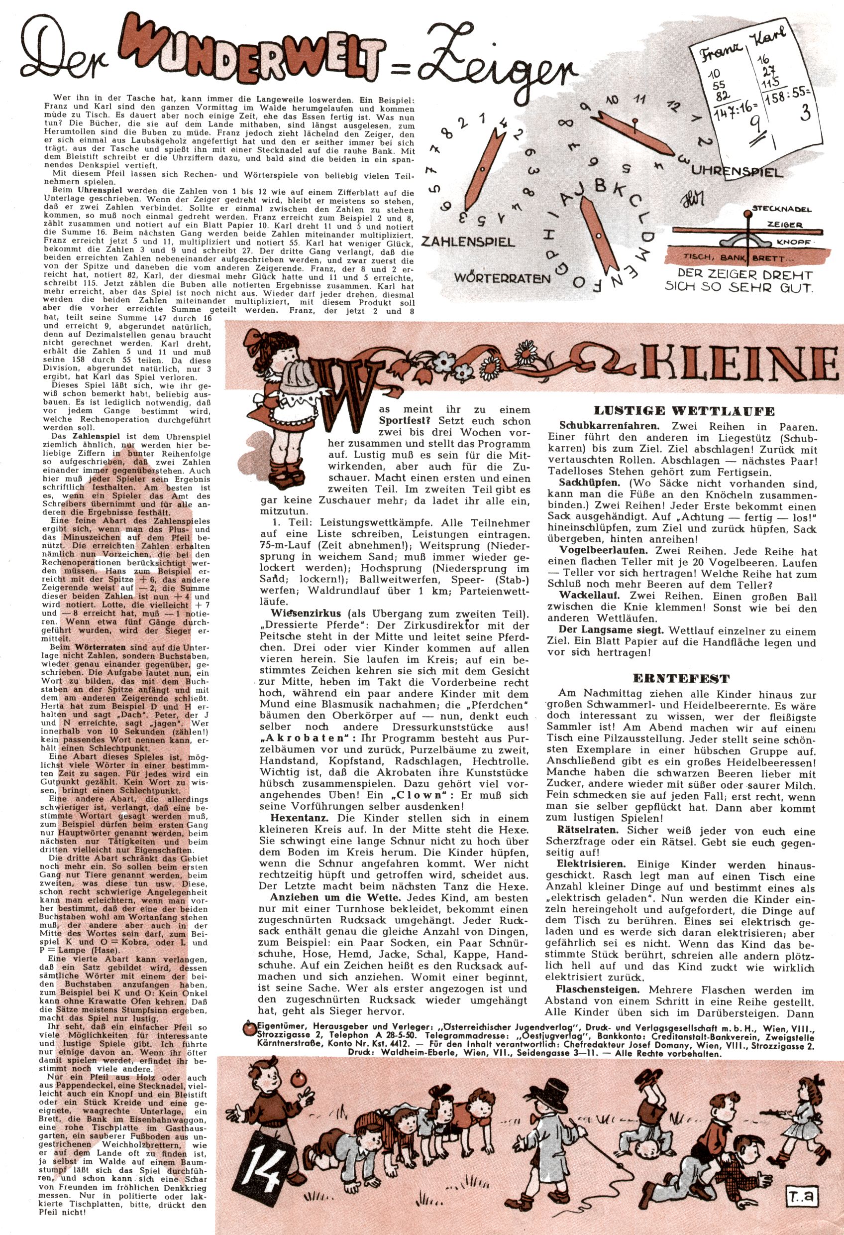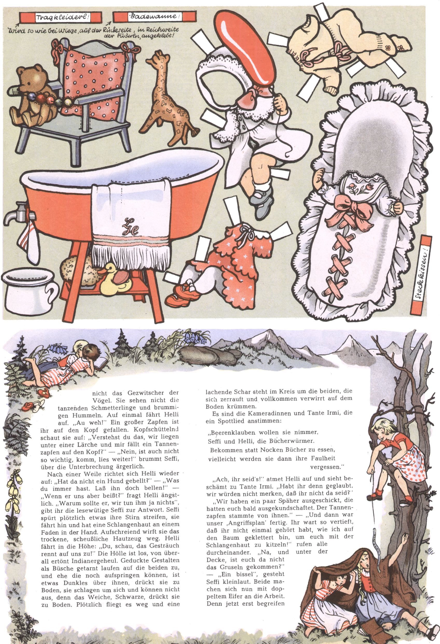 Die Wunderwelt im Festtagsgewand In den Sonderheften präsentierte sich die Wunderwelt wahrhaftig in Feiertagsstimmung. Mit wenigen Ausnahmen gab es pro Jahr drei Sonderhefte - zu Weihnachten bzw. im Advent, zu Ostern und in den Ferien im Sommer. Experimente mit Faschings- und Muttertagsheften hatten sich nicht bewährt. Selbst als es die Einzelhefte in der Krisensituation nach 1967 nicht mehr gab, wurde die Wunderwelt-Zeitung im Layout der Sonderhefte fortgesetzt: Zunächst mit 3 bis 5 und ab 1971 immerhin wieder mit 10-12 Heften pro Jahr. Die Weihnachts-, Oster- und Ferienhefte hatten naturgemäß verschiedene Schwerpunkte. Während im Sommer Spielen und Werken mit Material im Vordergrund stand, waren es zu Weihnachten Krippen und Adventhäuser; zu Ostern dann Erzählungen, Hasenstädte und Oster-Basteleien. Das bessere Papier der Sonderhefte erleichterte das Ausschneiden der insgesamt mehr als 1000 Papiermodelle erheblich. Die Sonderhefte waren vergleichsweise aufwändig gestaltet, aber auch ein wichtiges Zusatzgeschäft für die Zeitung. Die Kinder fieberten dem Erscheinungsdatum der jeweiligen Ausgabe nicht selten richtiggehend entgegen. Mit knapp 100 Seiten pro Jahr machten die Sonderhefte von der Menge her zwar nicht einmal ein Viertel aus, trugen aber zum Erscheinungsbild mindestens genauso viel bei wie die Standardhefte. Im Wesentlichen blieb das Layout der Sonderhefte über die Jahre hin unverändert. Mühselig wurde es, als man den Inhalt der Beiträge vorübergehend auf die Seiten gleichmäßig verteilte und die Kinder ermunterte, die Hefte in der Mitte zu zerschneiden. Die eine Hälfte enthielt dann etwa Erzählungen und Bastelvorschläge, der andere Teil der Zeitung Spielanleitungen. Zur übersichtlichkeit trugen diese Layoutversuche jedenfalls in keiner Weise bei und als besonderen Auswuchs gab es eine Zeitlang auf einer Seite oft mehrere Seitennummern, je nachdem, ob sich diese auf das Gesamtheft oder den herauszunehmenden und zu zerschneidenden Heftteil bezogen. Gegen Ende der 1950er Jahre kehrte man wieder zu einem ganzseitigen Layout zurück und Ideen wie ein Spiel-(Heft-im-)Heft gehörten der Vergangenheit an. In den Sonderheften experimentierte man dann noch ab Mitte der 1960er Jahre, als die Verkaufszahlen stark rückläufig waren, mit grundsätzlich neuen Darstellungsformen - weg vom Niedlich-Kitschigen und engagierte neue Grafikerinnen wie Gundi Groh und Hella Soyka. Den erhofften Erfolg brachte dies jedoch nicht mehr. |