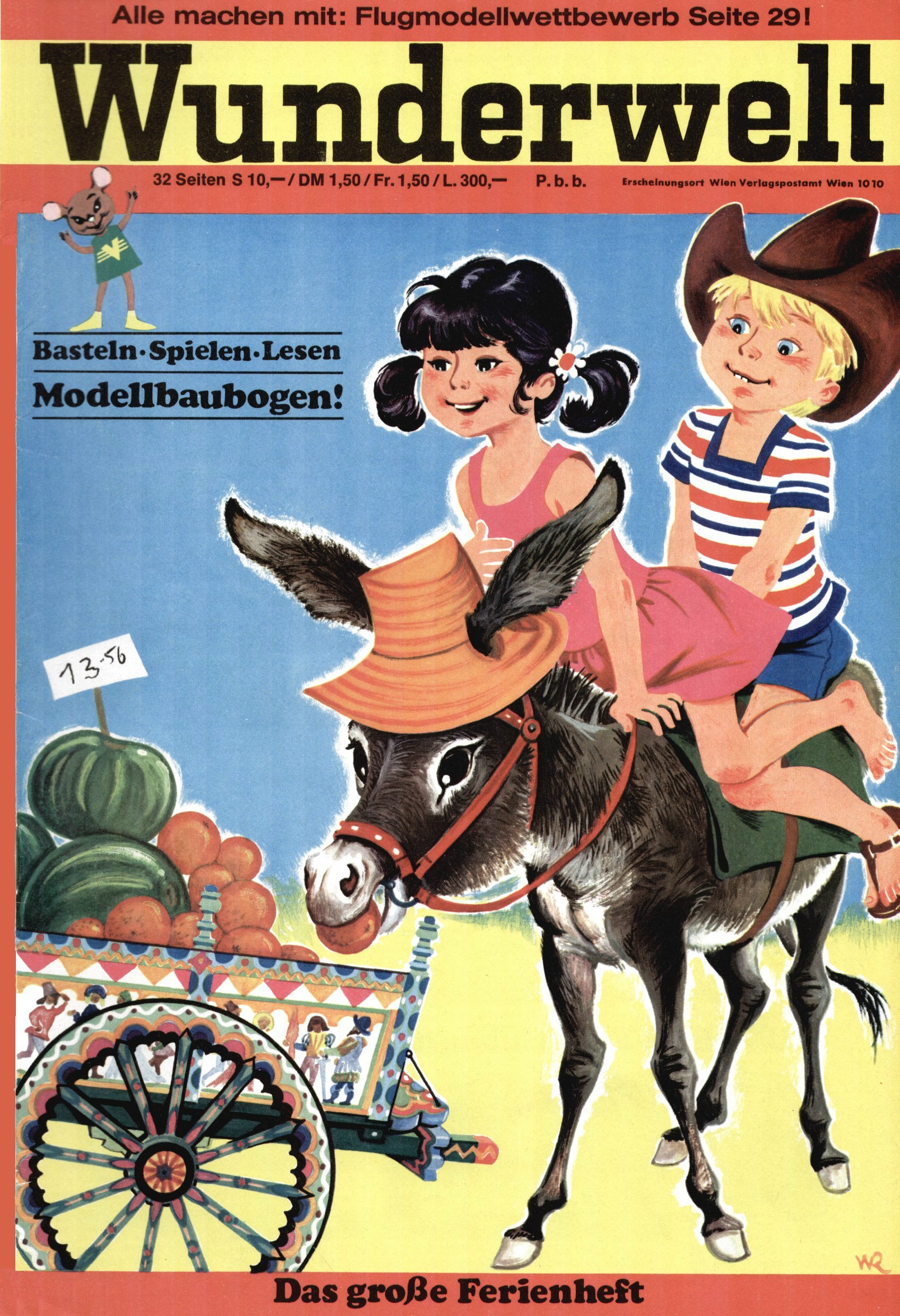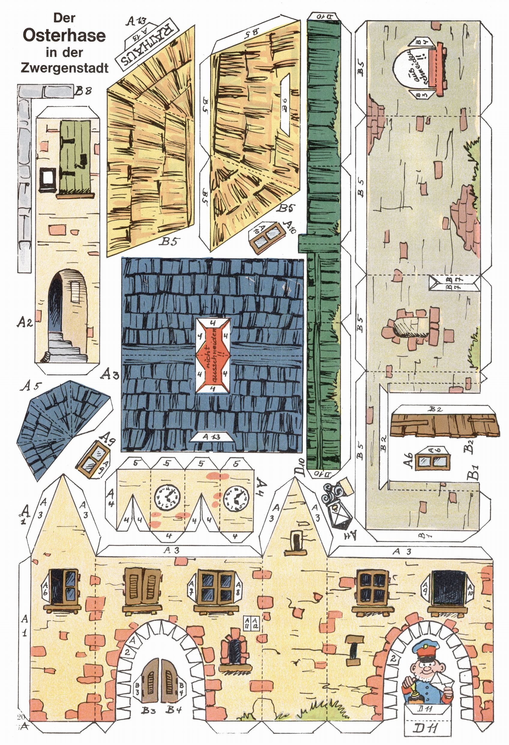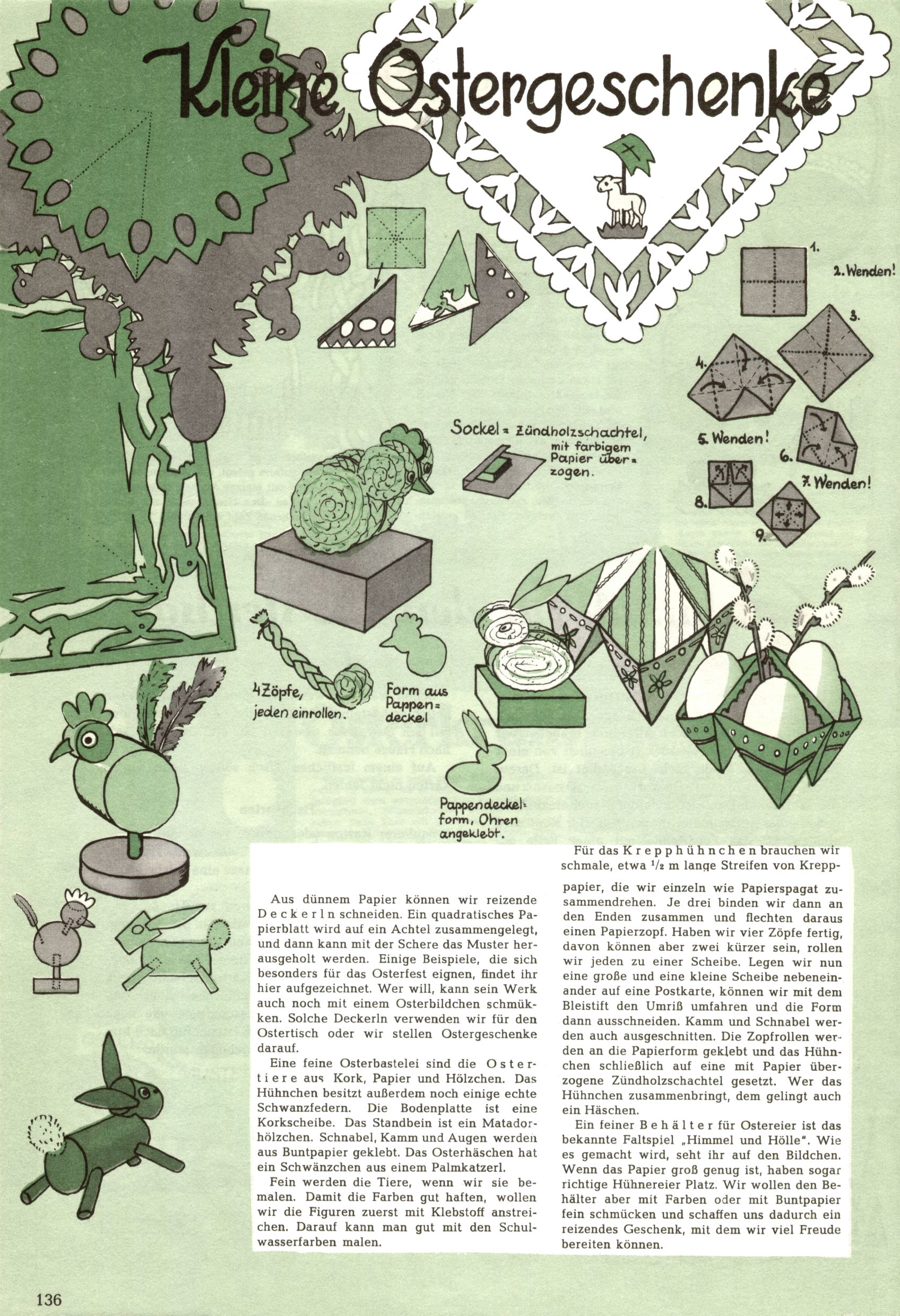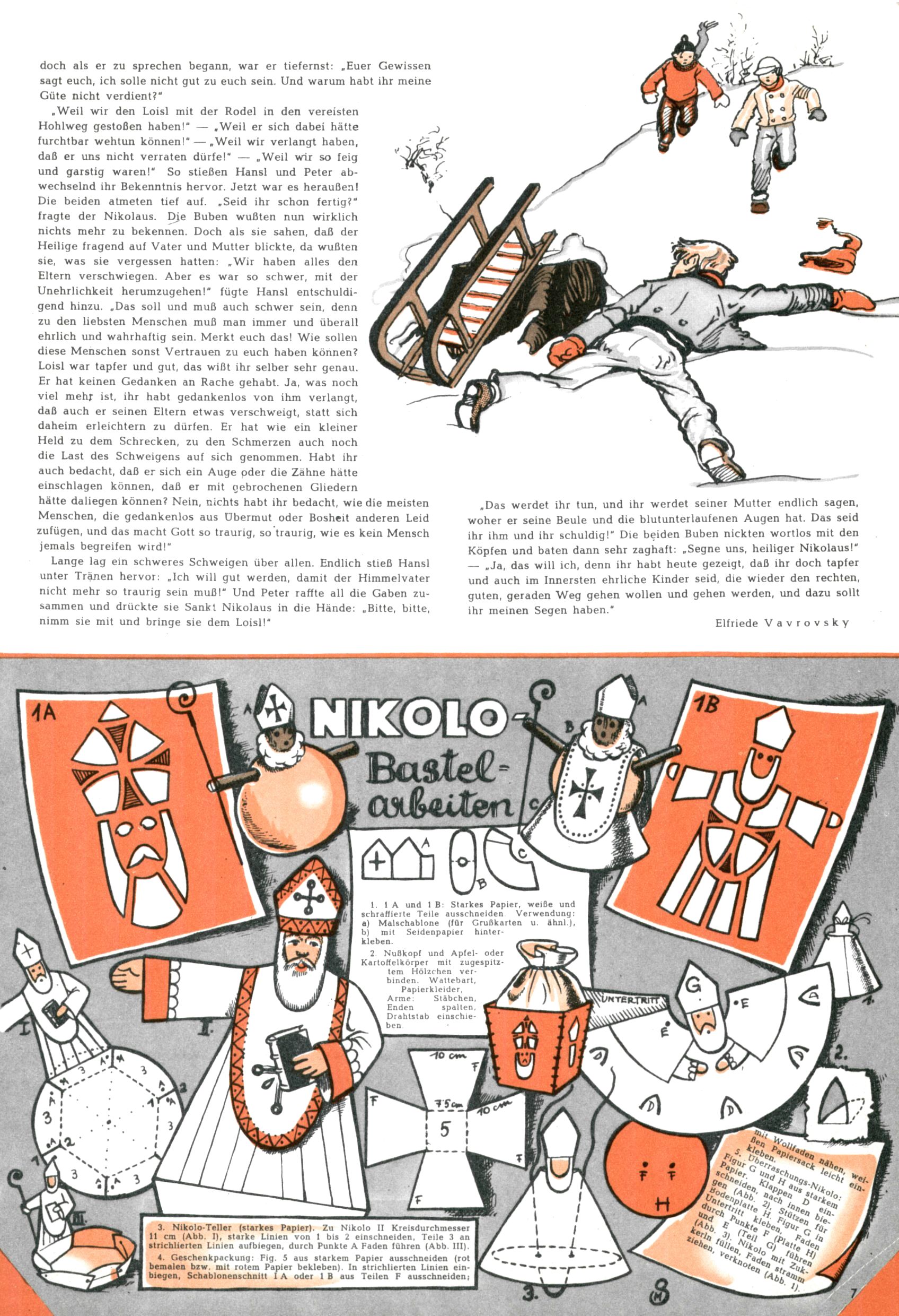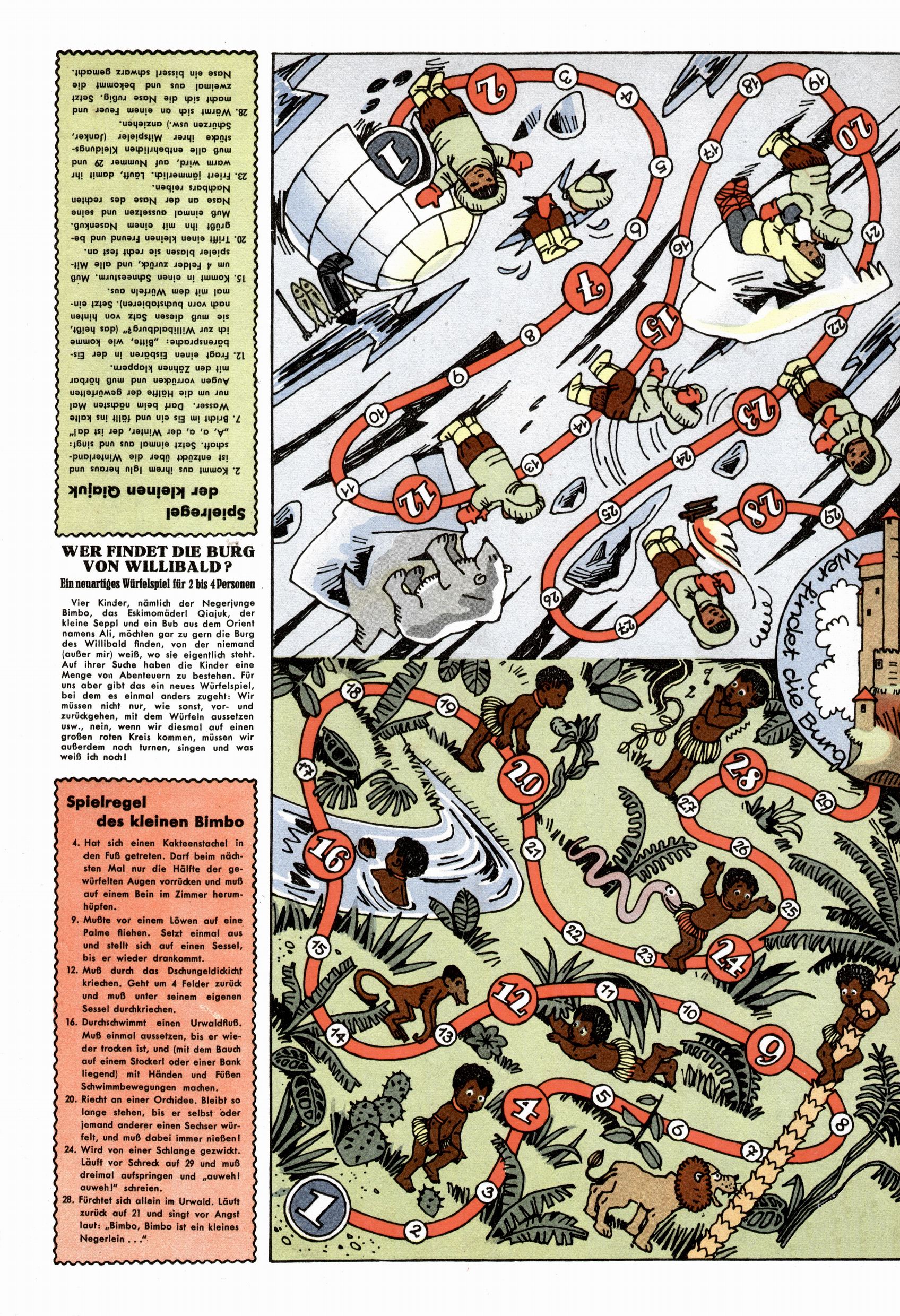 Die Wunderwelt im Festtagsgewand In den Sonderheften präsentierte sich die Wunderwelt wahrhaftig in Feiertagsstimmung. Mit wenigen Ausnahmen gab es pro Jahr drei Sonderhefte - zu Weihnachten bzw. im Advent, zu Ostern und in den Ferien im Sommer. Experimente mit Faschings- und Muttertagsheften hatten sich nicht bewährt. Selbst als es die Einzelhefte in der Krisensituation nach 1967 nicht mehr gab, wurde die Wunderwelt-Zeitung im Layout der Sonderhefte fortgesetzt: Zunächst mit 3 bis 5 und ab 1971 immerhin wieder mit 10-12 Heften pro Jahr. Die Weihnachts-, Oster- und Ferienhefte hatten naturgemäß verschiedene Schwerpunkte. Während im Sommer Spielen und Werken mit Material im Vordergrund stand, waren es zu Weihnachten Krippen und Adventhäuser; zu Ostern dann Erzählungen, Hasenstädte und Oster-Basteleien. Das bessere Papier der Sonderhefte erleichterte das Ausschneiden der insgesamt mehr als 1000 Papiermodelle erheblich. Die Sonderhefte waren vergleichsweise aufwändig gestaltet, aber auch ein wichtiges Zusatzgeschäft für die Zeitung. Die Kinder fieberten dem Erscheinungsdatum der jeweiligen Ausgabe nicht selten richtiggehend entgegen. Mit knapp 100 Seiten pro Jahr machten die Sonderhefte von der Menge her zwar nicht einmal ein Viertel aus, trugen aber zum Erscheinungsbild mindestens genauso viel bei wie die Standardhefte. Im Wesentlichen blieb das Layout der Sonderhefte über die Jahre hin unverändert. Mühselig wurde es, als man den Inhalt der Beiträge vorübergehend auf die Seiten gleichmäßig verteilte und die Kinder ermunterte, die Hefte in der Mitte zu zerschneiden. Die eine Hälfte enthielt dann etwa Erzählungen und Bastelvorschläge, der andere Teil der Zeitung Spielanleitungen. Zur übersichtlichkeit trugen diese Layoutversuche jedenfalls in keiner Weise bei und als besonderen Auswuchs gab es eine Zeitlang auf einer Seite oft mehrere Seitennummern, je nachdem, ob sich diese auf das Gesamtheft oder den herauszunehmenden und zu zerschneidenden Heftteil bezogen. Gegen Ende der 1950er Jahre kehrte man wieder zu einem ganzseitigen Layout zurück und Ideen wie ein Spiel-(Heft-im-)Heft gehörten der Vergangenheit an. In den Sonderheften experimentierte man dann noch ab Mitte der 1960er Jahre, als die Verkaufszahlen stark rückläufig waren, mit grundsätzlich neuen Darstellungsformen - weg vom Niedlich-Kitschigen und engagierte neue Grafikerinnen wie Gundi Groh und Hella Soyka. Den erhofften Erfolg brachte dies jedoch nicht mehr. |
