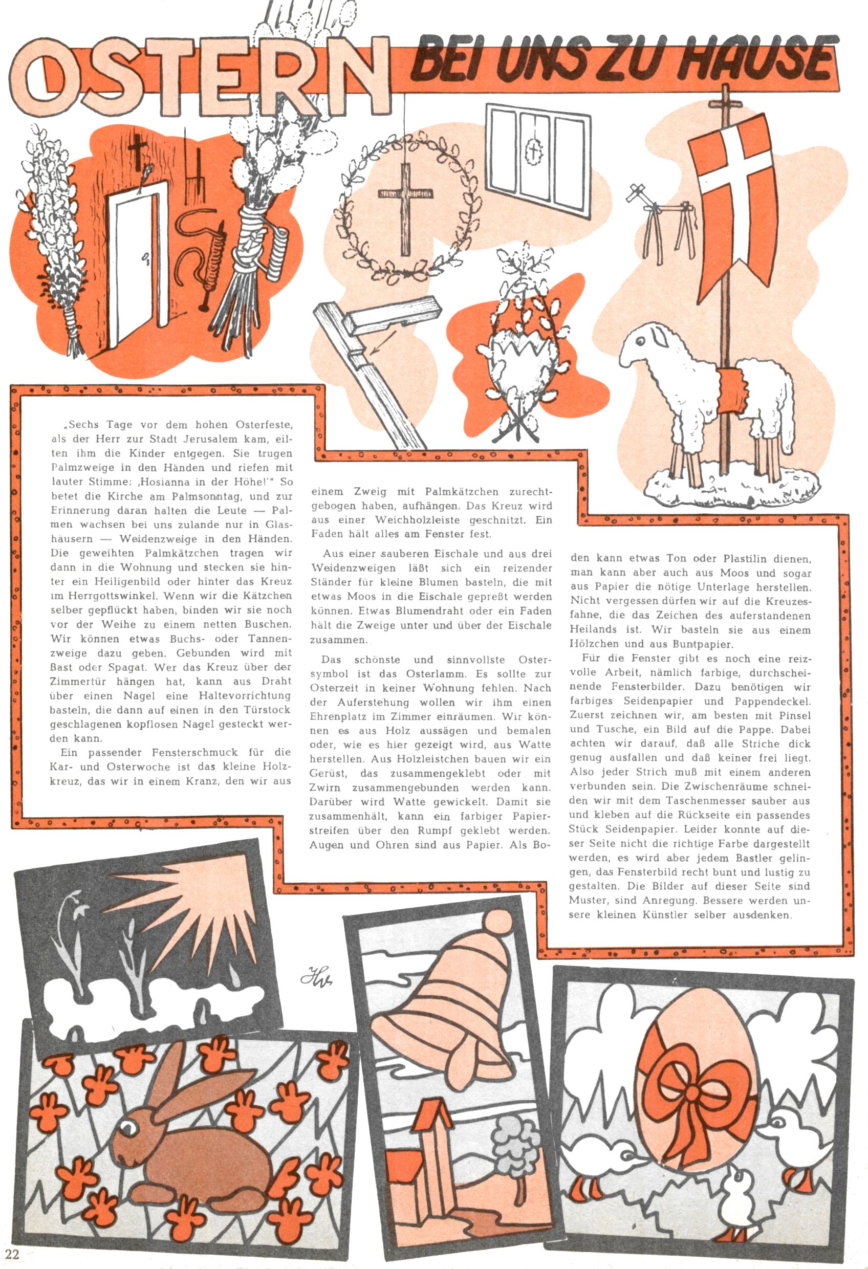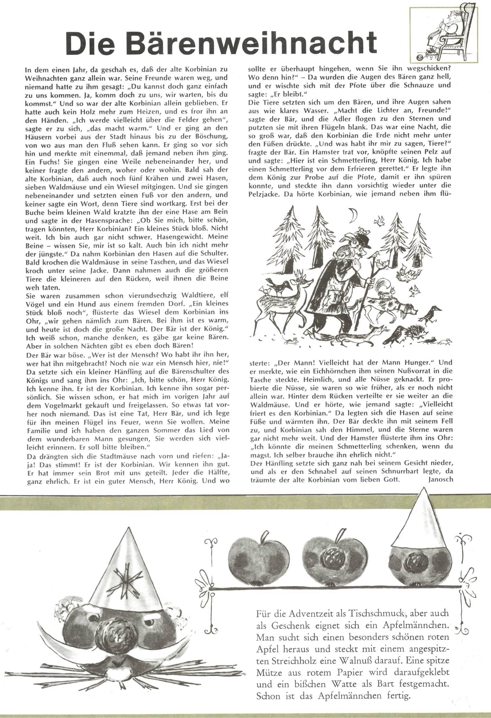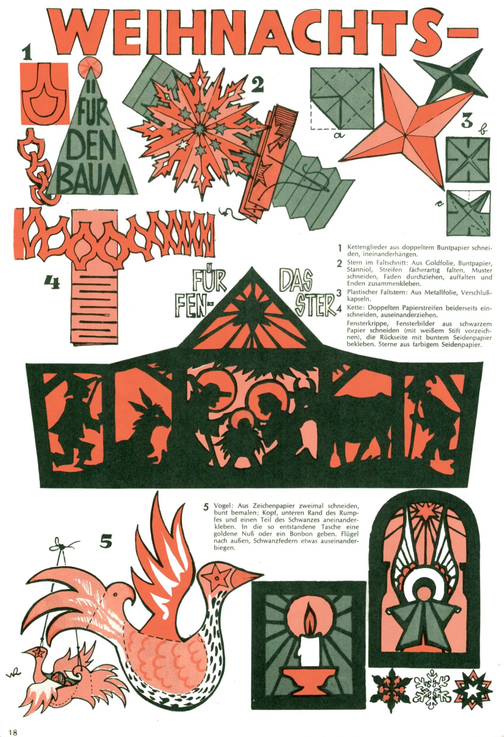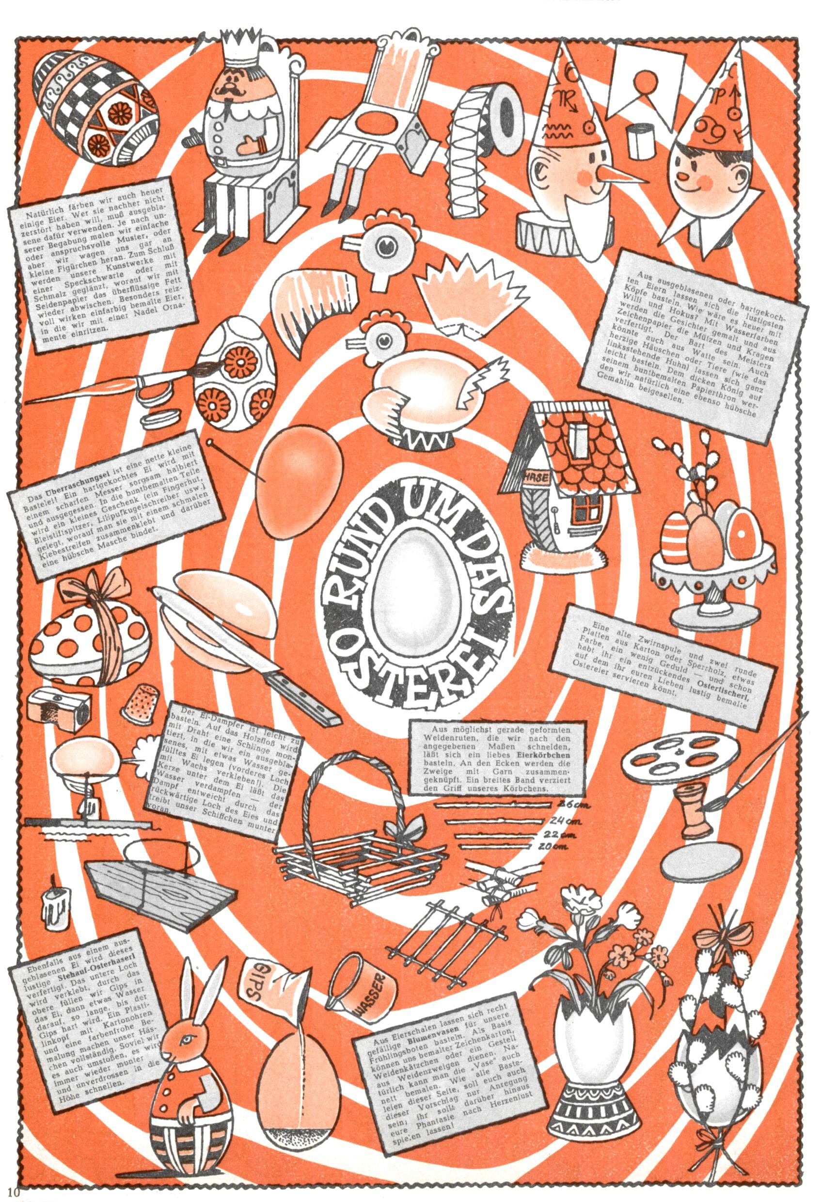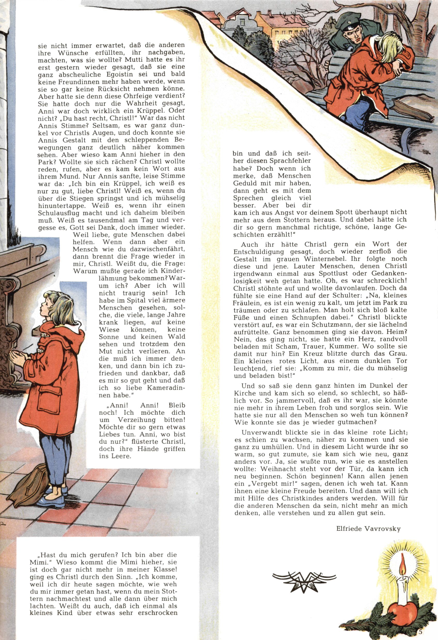 Die Wunderwelt im Festtagsgewand In den Sonderheften präsentierte sich die Wunderwelt wahrhaftig in Feiertagsstimmung. Mit wenigen Ausnahmen gab es pro Jahr drei Sonderhefte - zu Weihnachten bzw. im Advent, zu Ostern und in den Ferien im Sommer. Experimente mit Faschings- und Muttertagsheften hatten sich nicht bewährt. Selbst als es die Einzelhefte in der Krisensituation nach 1967 nicht mehr gab, wurde die Wunderwelt-Zeitung im Layout der Sonderhefte fortgesetzt: Zunächst mit 3 bis 5 und ab 1971 immerhin wieder mit 10-12 Heften pro Jahr. Die Weihnachts-, Oster- und Ferienhefte hatten naturgemäß verschiedene Schwerpunkte. Während im Sommer Spielen und Werken mit Material im Vordergrund stand, waren es zu Weihnachten Krippen und Adventhäuser; zu Ostern dann Erzählungen, Hasenstädte und Oster-Basteleien. Das bessere Papier der Sonderhefte erleichterte das Ausschneiden der insgesamt mehr als 1000 Papiermodelle erheblich. Die Sonderhefte waren vergleichsweise aufwändig gestaltet, aber auch ein wichtiges Zusatzgeschäft für die Zeitung. Die Kinder fieberten dem Erscheinungsdatum der jeweiligen Ausgabe nicht selten richtiggehend entgegen. Mit knapp 100 Seiten pro Jahr machten die Sonderhefte von der Menge her zwar nicht einmal ein Viertel aus, trugen aber zum Erscheinungsbild mindestens genauso viel bei wie die Standardhefte. Im Wesentlichen blieb das Layout der Sonderhefte über die Jahre hin unverändert. Mühselig wurde es, als man den Inhalt der Beiträge vorübergehend auf die Seiten gleichmäßig verteilte und die Kinder ermunterte, die Hefte in der Mitte zu zerschneiden. Die eine Hälfte enthielt dann etwa Erzählungen und Bastelvorschläge, der andere Teil der Zeitung Spielanleitungen. Zur übersichtlichkeit trugen diese Layoutversuche jedenfalls in keiner Weise bei und als besonderen Auswuchs gab es eine Zeitlang auf einer Seite oft mehrere Seitennummern, je nachdem, ob sich diese auf das Gesamtheft oder den herauszunehmenden und zu zerschneidenden Heftteil bezogen. Gegen Ende der 1950er Jahre kehrte man wieder zu einem ganzseitigen Layout zurück und Ideen wie ein Spiel-(Heft-im-)Heft gehörten der Vergangenheit an. In den Sonderheften experimentierte man dann noch ab Mitte der 1960er Jahre, als die Verkaufszahlen stark rückläufig waren, mit grundsätzlich neuen Darstellungsformen - weg vom Niedlich-Kitschigen und engagierte neue Grafikerinnen wie Gundi Groh und Hella Soyka. Den erhofften Erfolg brachte dies jedoch nicht mehr. |