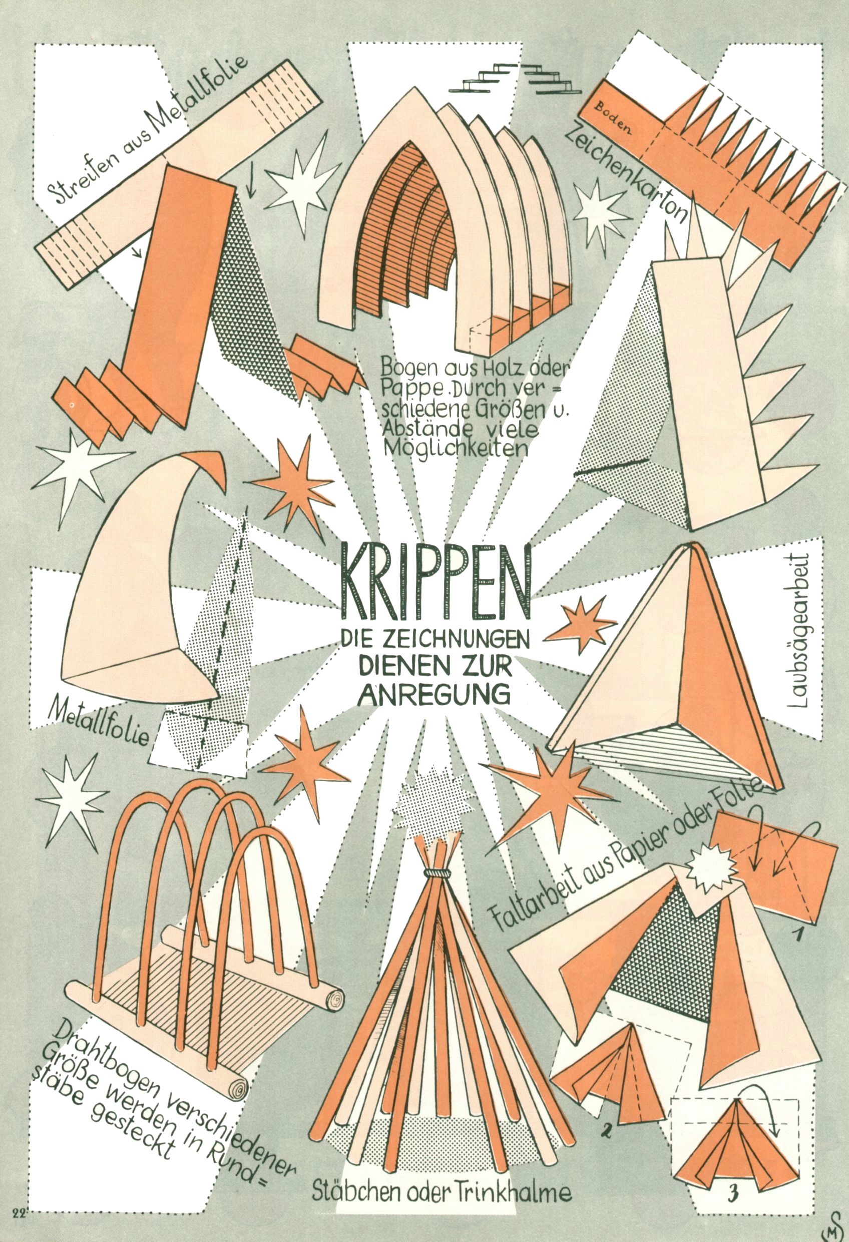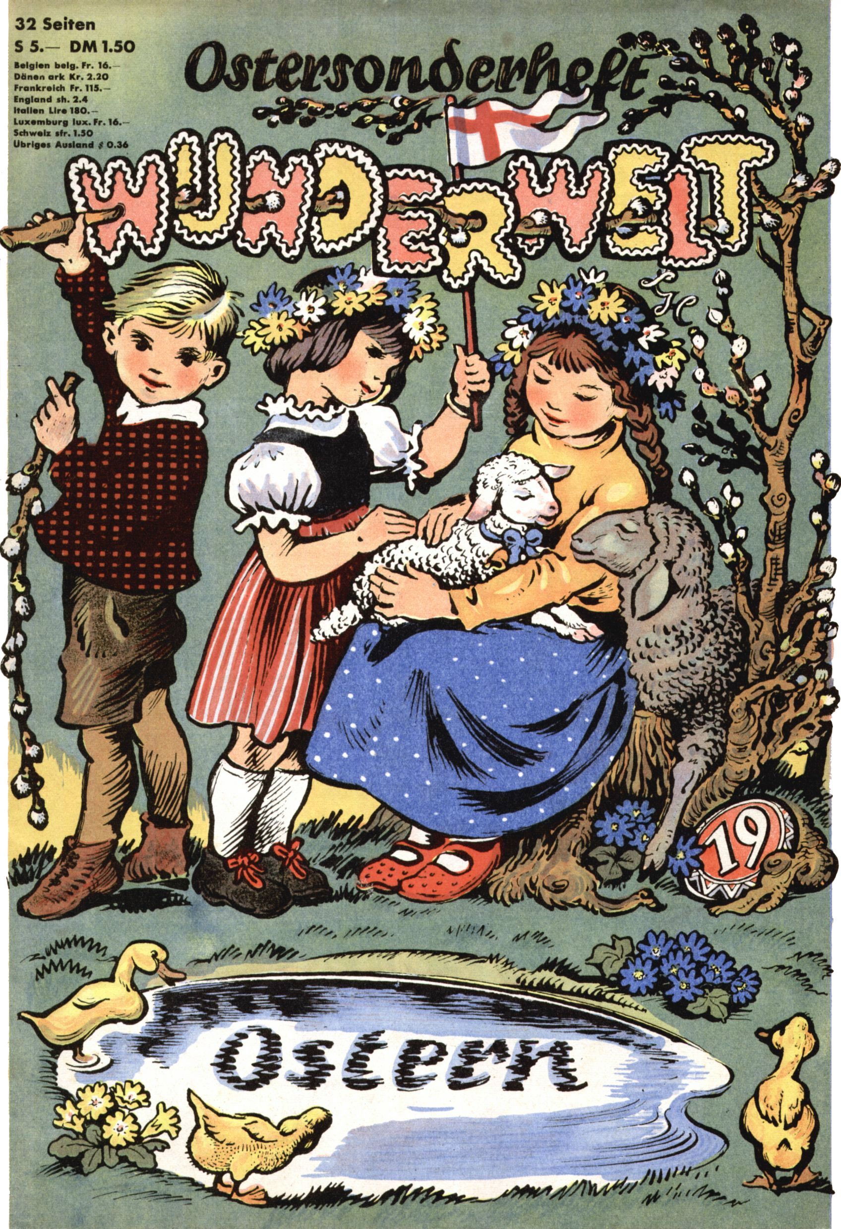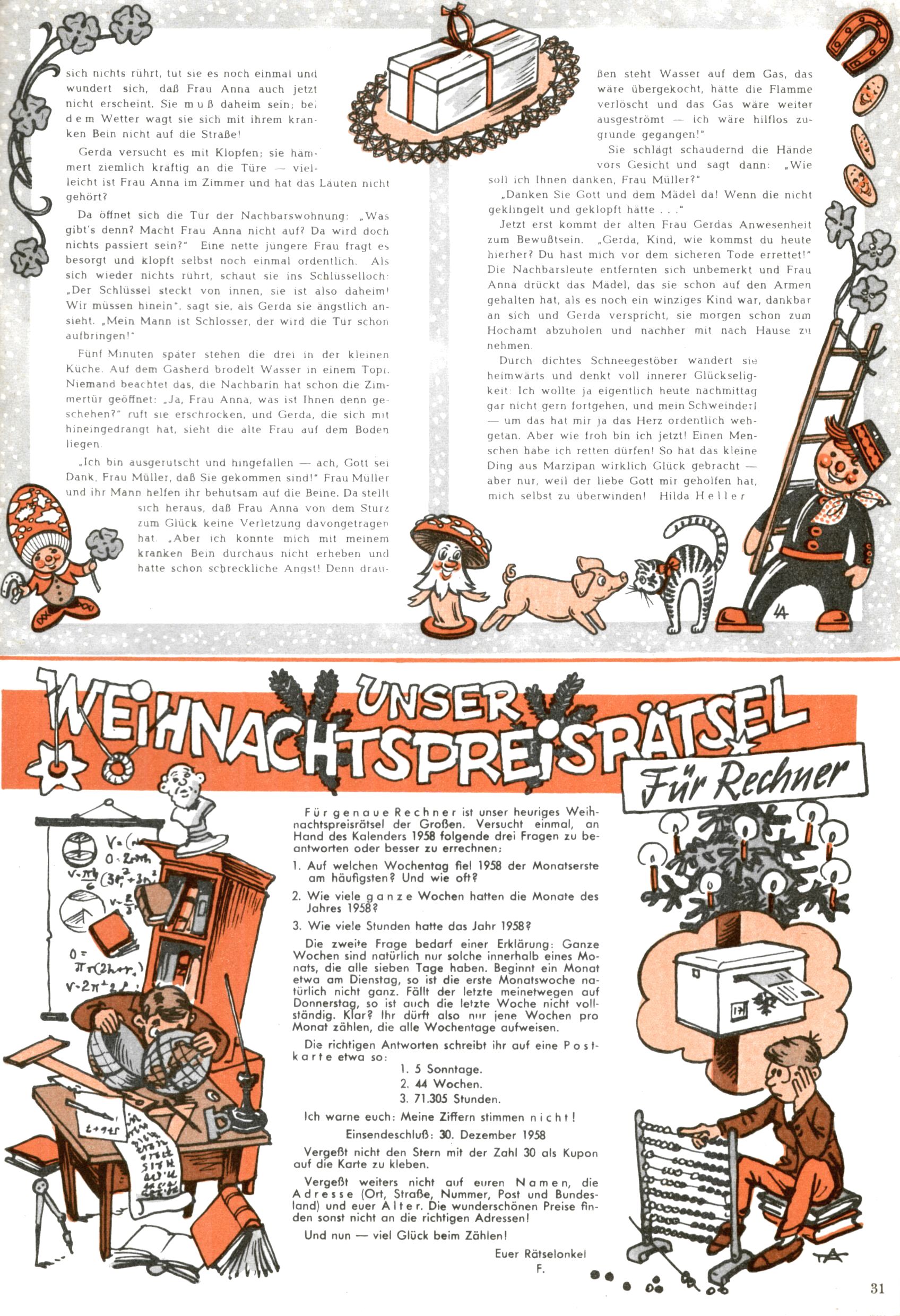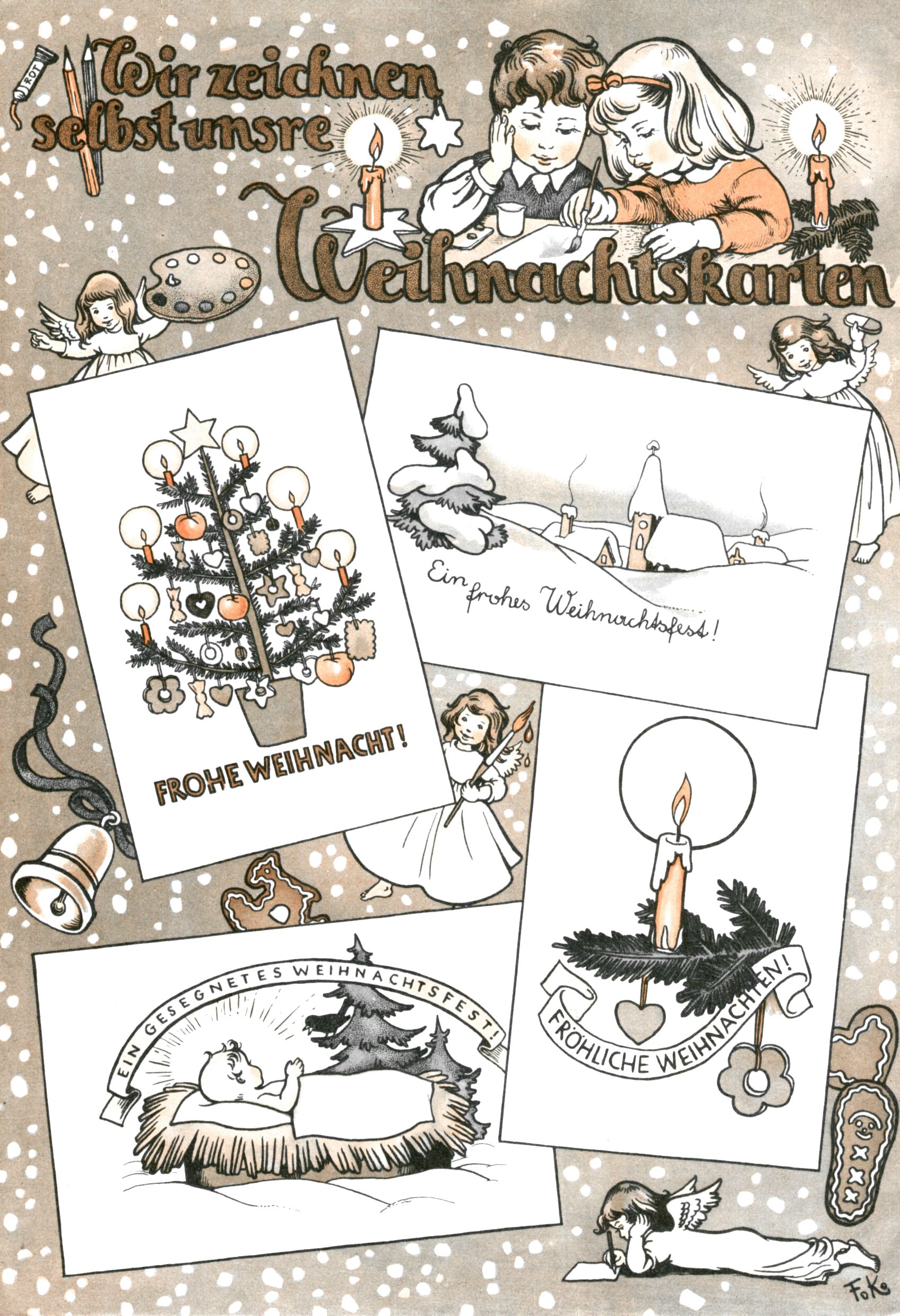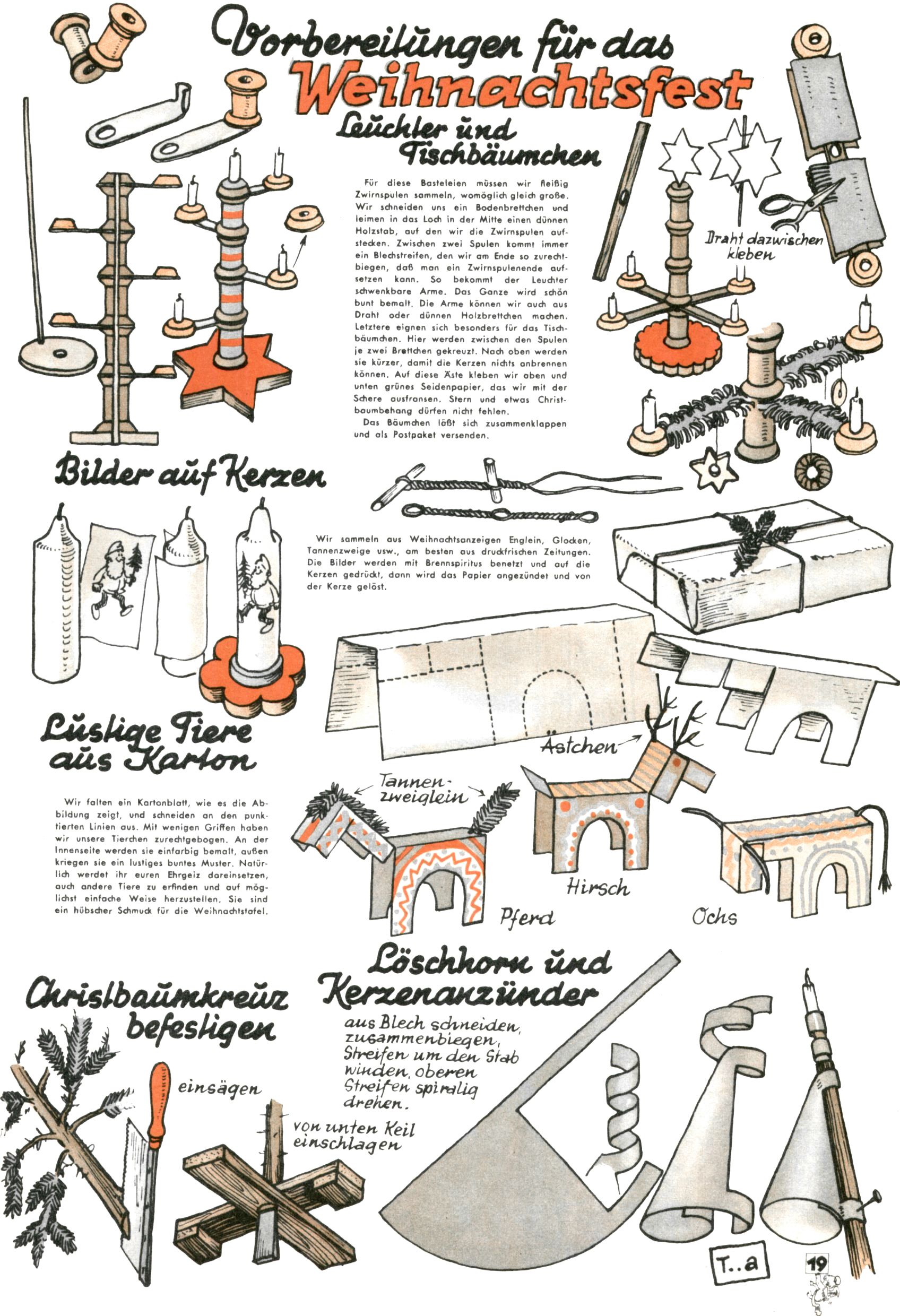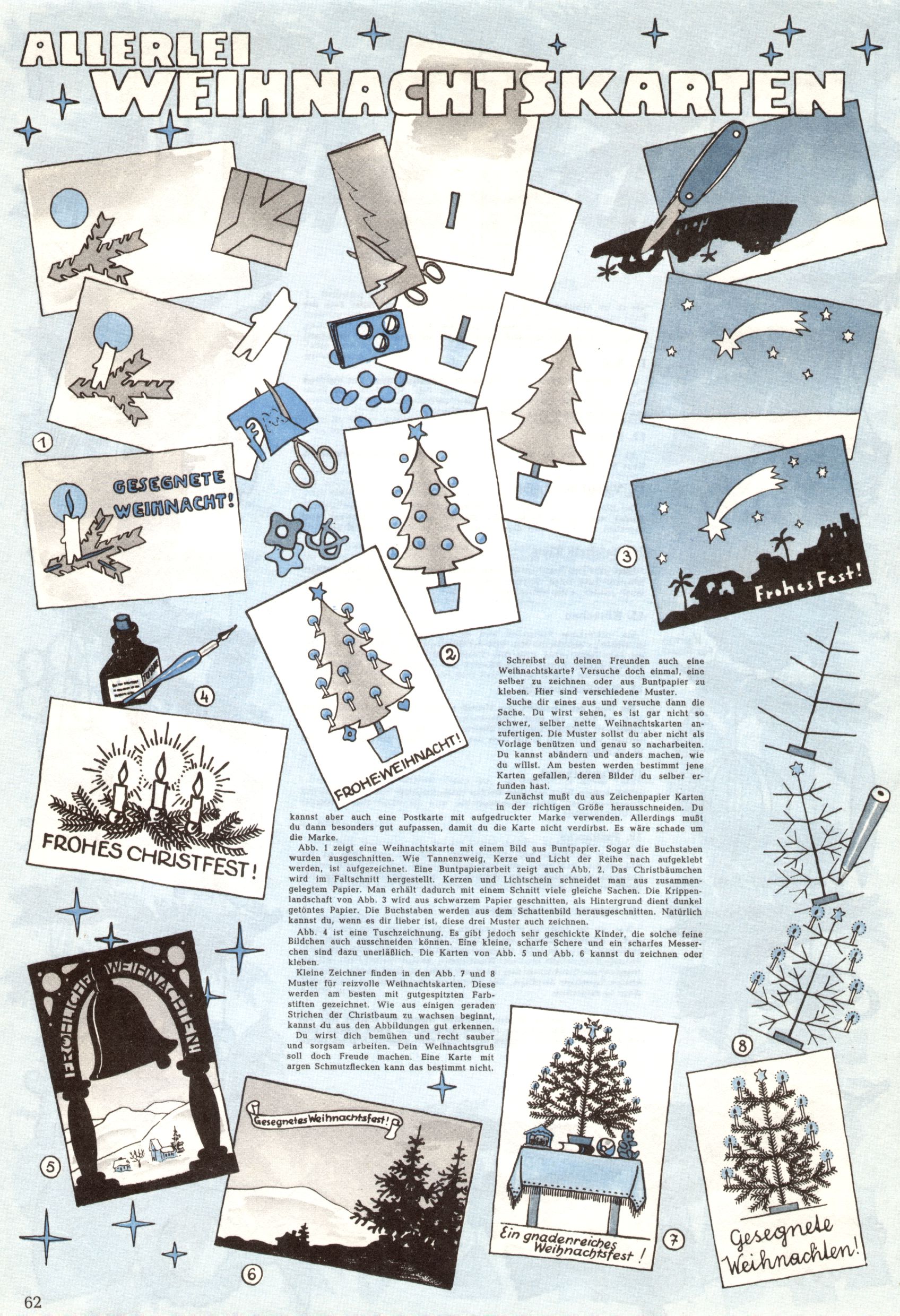 Die Wunderwelt im Festtagsgewand In den Sonderheften präsentierte sich die Wunderwelt wahrhaftig in Feiertagsstimmung. Mit wenigen Ausnahmen gab es pro Jahr drei Sonderhefte - zu Weihnachten bzw. im Advent, zu Ostern und in den Ferien im Sommer. Experimente mit Faschings- und Muttertagsheften hatten sich nicht bewährt. Selbst als es die Einzelhefte in der Krisensituation nach 1967 nicht mehr gab, wurde die Wunderwelt-Zeitung im Layout der Sonderhefte fortgesetzt: Zunächst mit 3 bis 5 und ab 1971 immerhin wieder mit 10-12 Heften pro Jahr. Die Weihnachts-, Oster- und Ferienhefte hatten naturgemäß verschiedene Schwerpunkte. Während im Sommer Spielen und Werken mit Material im Vordergrund stand, waren es zu Weihnachten Krippen und Adventhäuser; zu Ostern dann Erzählungen, Hasenstädte und Oster-Basteleien. Das bessere Papier der Sonderhefte erleichterte das Ausschneiden der insgesamt mehr als 1000 Papiermodelle erheblich. Die Sonderhefte waren vergleichsweise aufwändig gestaltet, aber auch ein wichtiges Zusatzgeschäft für die Zeitung. Die Kinder fieberten dem Erscheinungsdatum der jeweiligen Ausgabe nicht selten richtiggehend entgegen. Mit knapp 100 Seiten pro Jahr machten die Sonderhefte von der Menge her zwar nicht einmal ein Viertel aus, trugen aber zum Erscheinungsbild mindestens genauso viel bei wie die Standardhefte. Im Wesentlichen blieb das Layout der Sonderhefte über die Jahre hin unverändert. Mühselig wurde es, als man den Inhalt der Beiträge vorübergehend auf die Seiten gleichmäßig verteilte und die Kinder ermunterte, die Hefte in der Mitte zu zerschneiden. Die eine Hälfte enthielt dann etwa Erzählungen und Bastelvorschläge, der andere Teil der Zeitung Spielanleitungen. Zur übersichtlichkeit trugen diese Layoutversuche jedenfalls in keiner Weise bei und als besonderen Auswuchs gab es eine Zeitlang auf einer Seite oft mehrere Seitennummern, je nachdem, ob sich diese auf das Gesamtheft oder den herauszunehmenden und zu zerschneidenden Heftteil bezogen. Gegen Ende der 1950er Jahre kehrte man wieder zu einem ganzseitigen Layout zurück und Ideen wie ein Spiel-(Heft-im-)Heft gehörten der Vergangenheit an. In den Sonderheften experimentierte man dann noch ab Mitte der 1960er Jahre, als die Verkaufszahlen stark rückläufig waren, mit grundsätzlich neuen Darstellungsformen - weg vom Niedlich-Kitschigen und engagierte neue Grafikerinnen wie Gundi Groh und Hella Soyka. Den erhofften Erfolg brachte dies jedoch nicht mehr. |