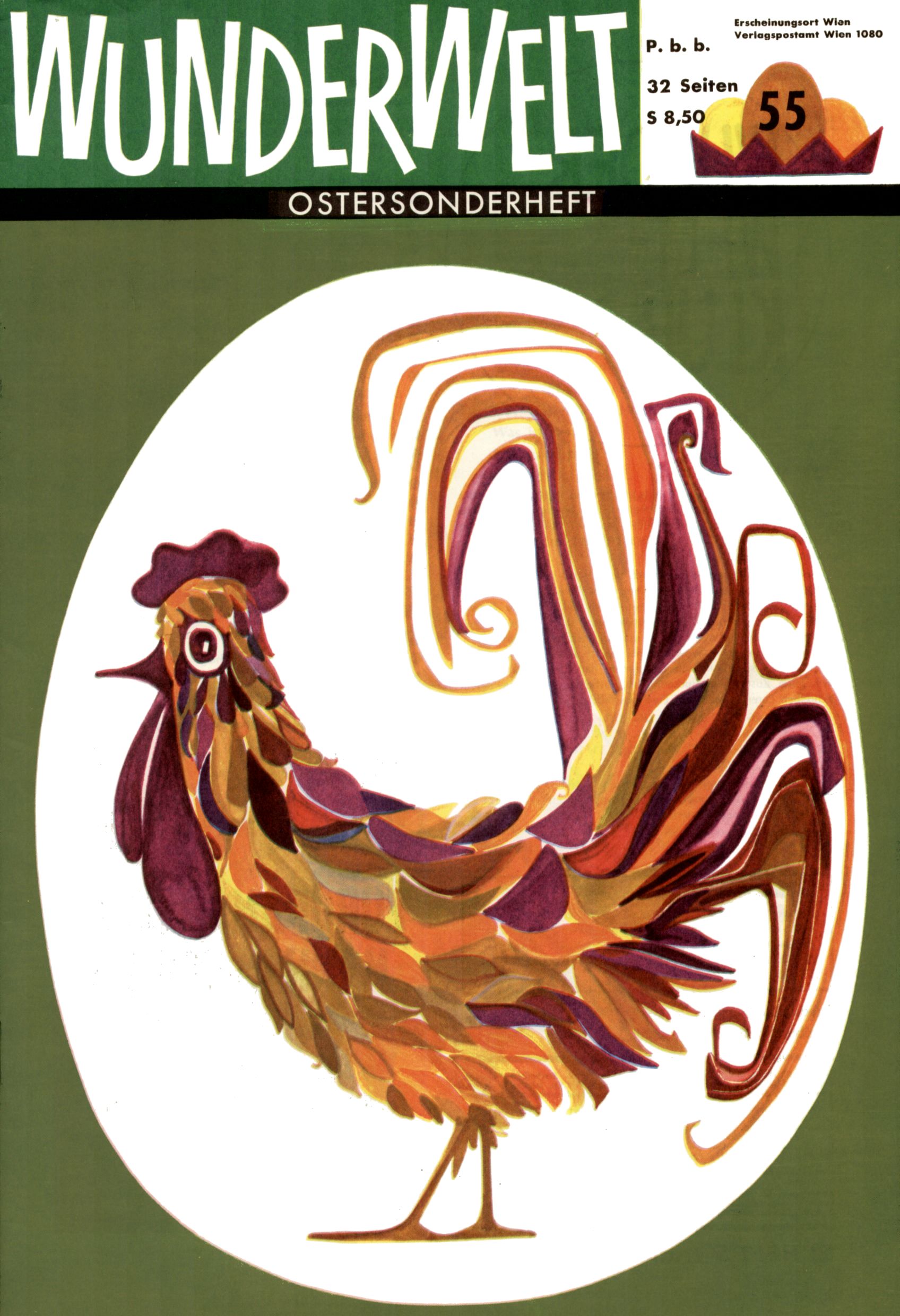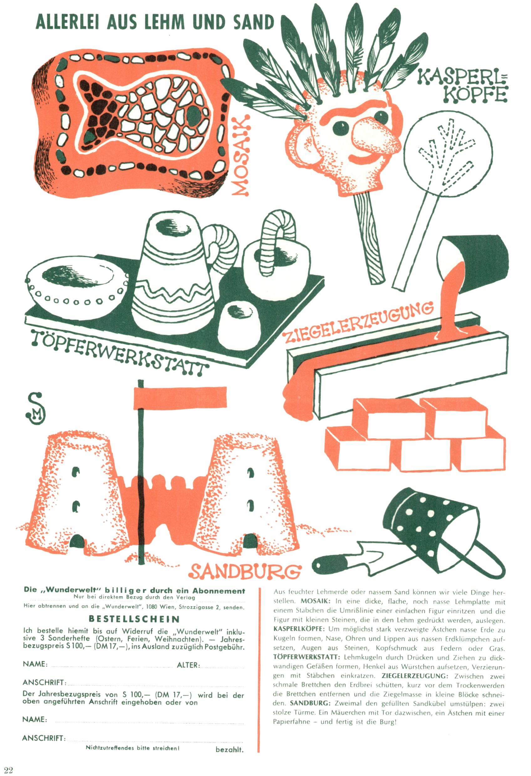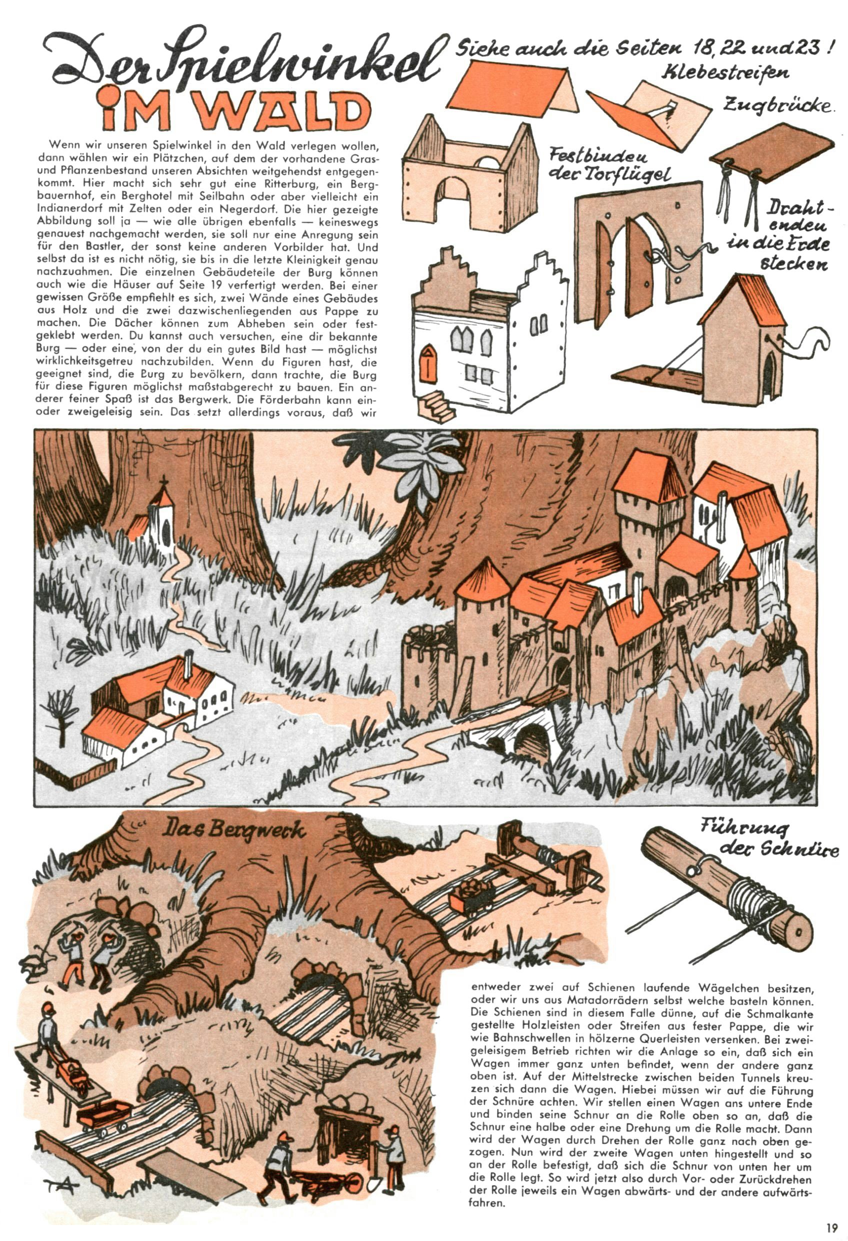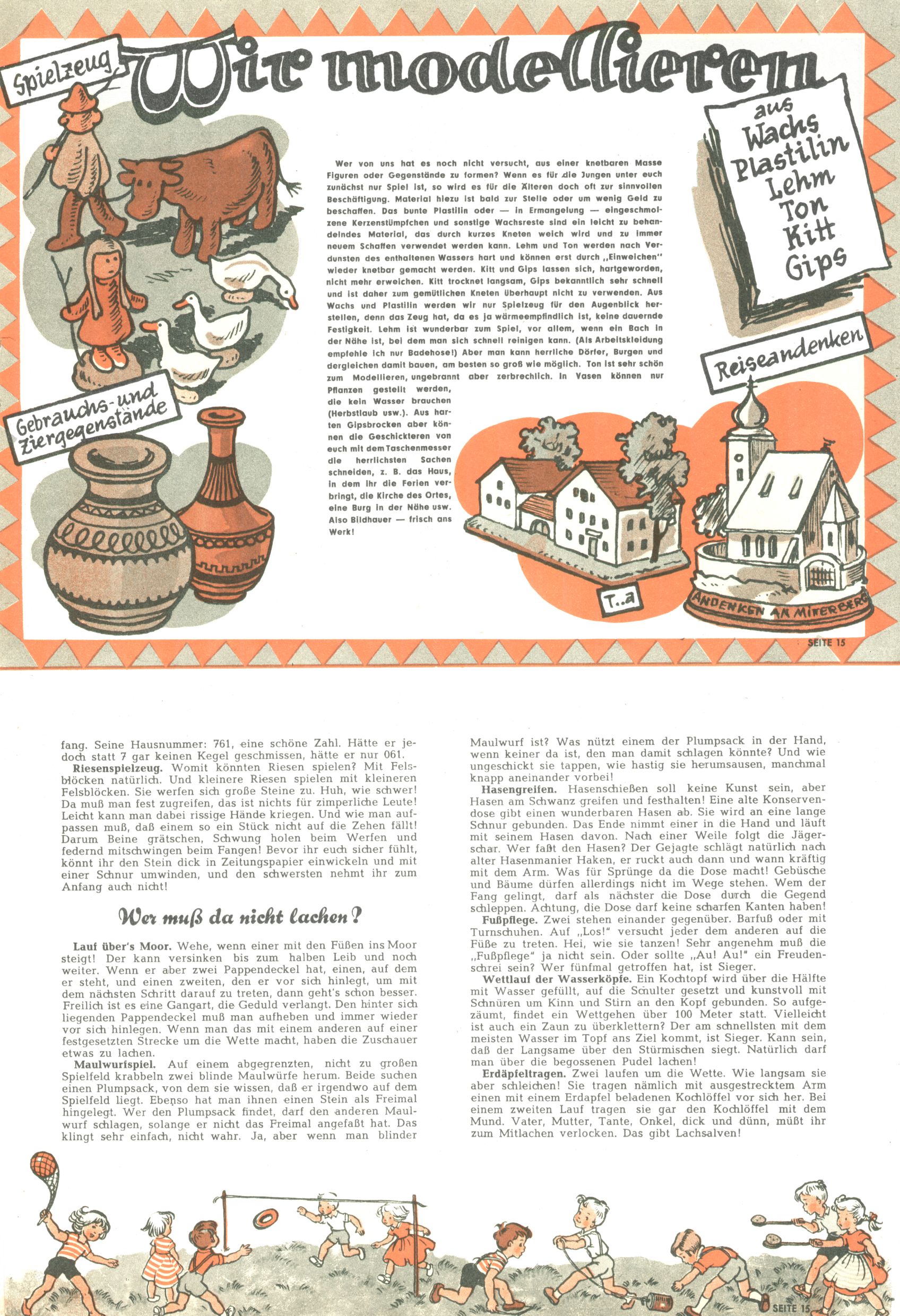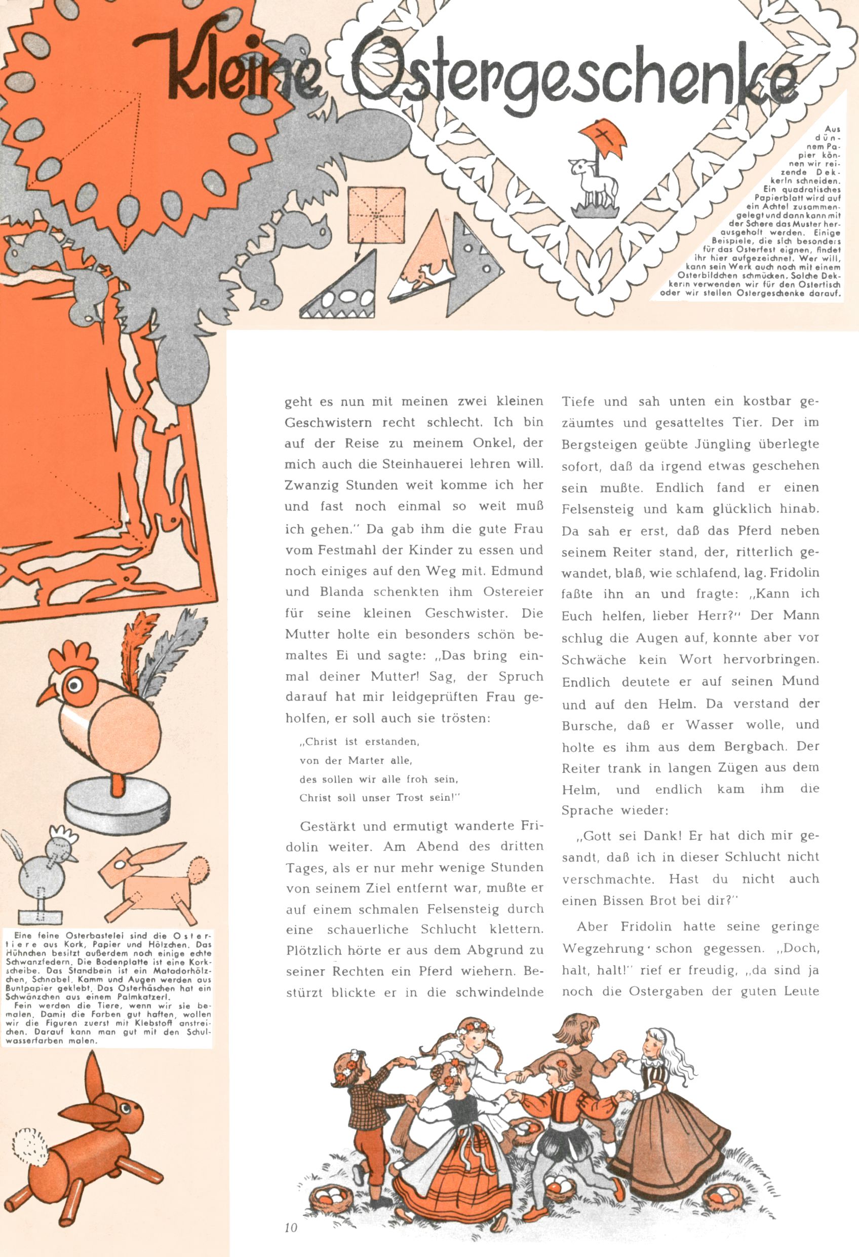 Die Wunderwelt im Festtagsgewand In den Sonderheften präsentierte sich die Wunderwelt wahrhaftig in Feiertagsstimmung. Mit wenigen Ausnahmen gab es pro Jahr drei Sonderhefte - zu Weihnachten bzw. im Advent, zu Ostern und in den Ferien im Sommer. Experimente mit Faschings- und Muttertagsheften hatten sich nicht bewährt. Selbst als es die Einzelhefte in der Krisensituation nach 1967 nicht mehr gab, wurde die Wunderwelt-Zeitung im Layout der Sonderhefte fortgesetzt: Zunächst mit 3 bis 5 und ab 1971 immerhin wieder mit 10-12 Heften pro Jahr. Die Weihnachts-, Oster- und Ferienhefte hatten naturgemäß verschiedene Schwerpunkte. Während im Sommer Spielen und Werken mit Material im Vordergrund stand, waren es zu Weihnachten Krippen und Adventhäuser; zu Ostern dann Erzählungen, Hasenstädte und Oster-Basteleien. Das bessere Papier der Sonderhefte erleichterte das Ausschneiden der insgesamt mehr als 1000 Papiermodelle erheblich. Die Sonderhefte waren vergleichsweise aufwändig gestaltet, aber auch ein wichtiges Zusatzgeschäft für die Zeitung. Die Kinder fieberten dem Erscheinungsdatum der jeweiligen Ausgabe nicht selten richtiggehend entgegen. Mit knapp 100 Seiten pro Jahr machten die Sonderhefte von der Menge her zwar nicht einmal ein Viertel aus, trugen aber zum Erscheinungsbild mindestens genauso viel bei wie die Standardhefte. Im Wesentlichen blieb das Layout der Sonderhefte über die Jahre hin unverändert. Mühselig wurde es, als man den Inhalt der Beiträge vorübergehend auf die Seiten gleichmäßig verteilte und die Kinder ermunterte, die Hefte in der Mitte zu zerschneiden. Die eine Hälfte enthielt dann etwa Erzählungen und Bastelvorschläge, der andere Teil der Zeitung Spielanleitungen. Zur übersichtlichkeit trugen diese Layoutversuche jedenfalls in keiner Weise bei und als besonderen Auswuchs gab es eine Zeitlang auf einer Seite oft mehrere Seitennummern, je nachdem, ob sich diese auf das Gesamtheft oder den herauszunehmenden und zu zerschneidenden Heftteil bezogen. Gegen Ende der 1950er Jahre kehrte man wieder zu einem ganzseitigen Layout zurück und Ideen wie ein Spiel-(Heft-im-)Heft gehörten der Vergangenheit an. In den Sonderheften experimentierte man dann noch ab Mitte der 1960er Jahre, als die Verkaufszahlen stark rückläufig waren, mit grundsätzlich neuen Darstellungsformen - weg vom Niedlich-Kitschigen und engagierte neue Grafikerinnen wie Gundi Groh und Hella Soyka. Den erhofften Erfolg brachte dies jedoch nicht mehr. |