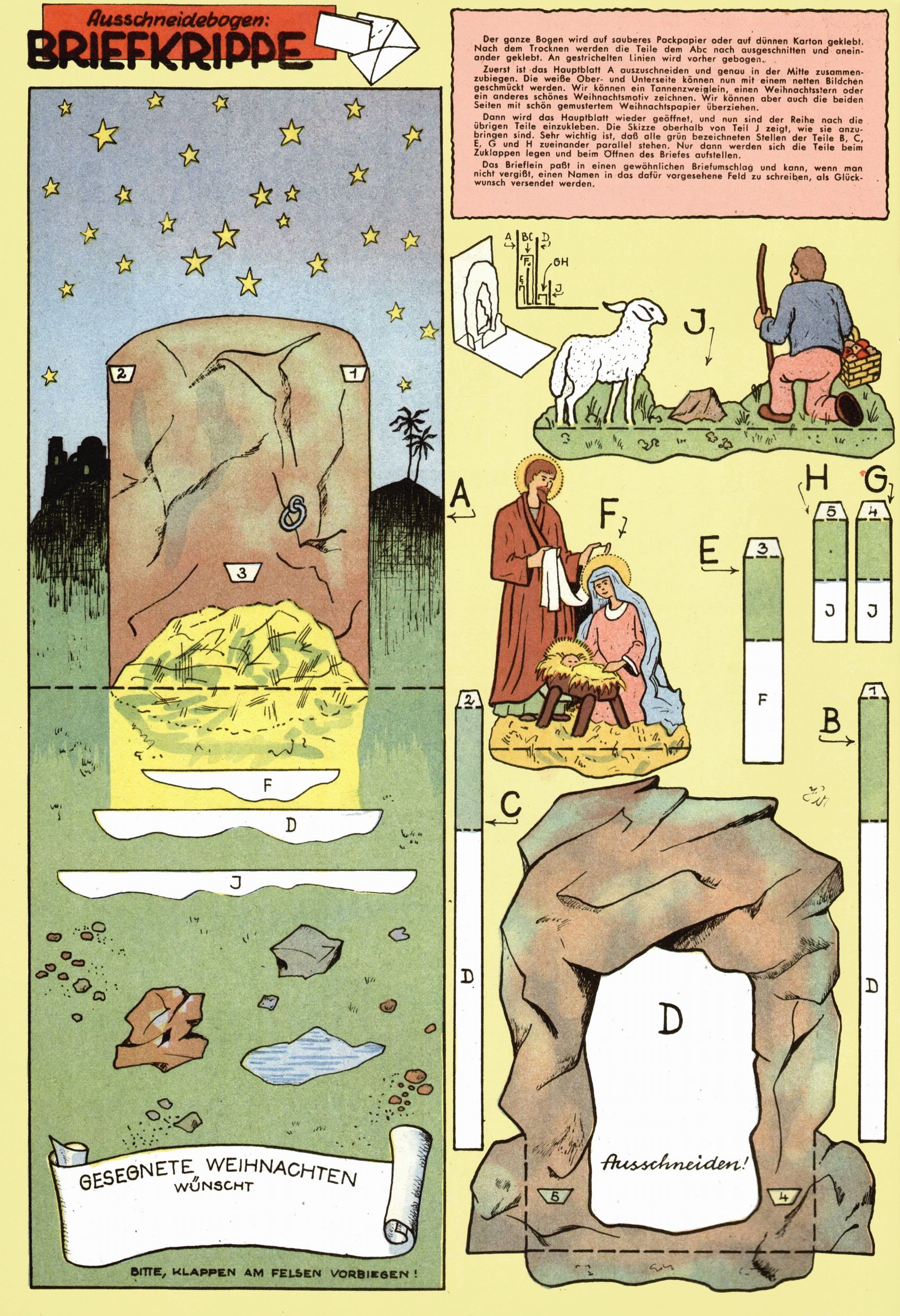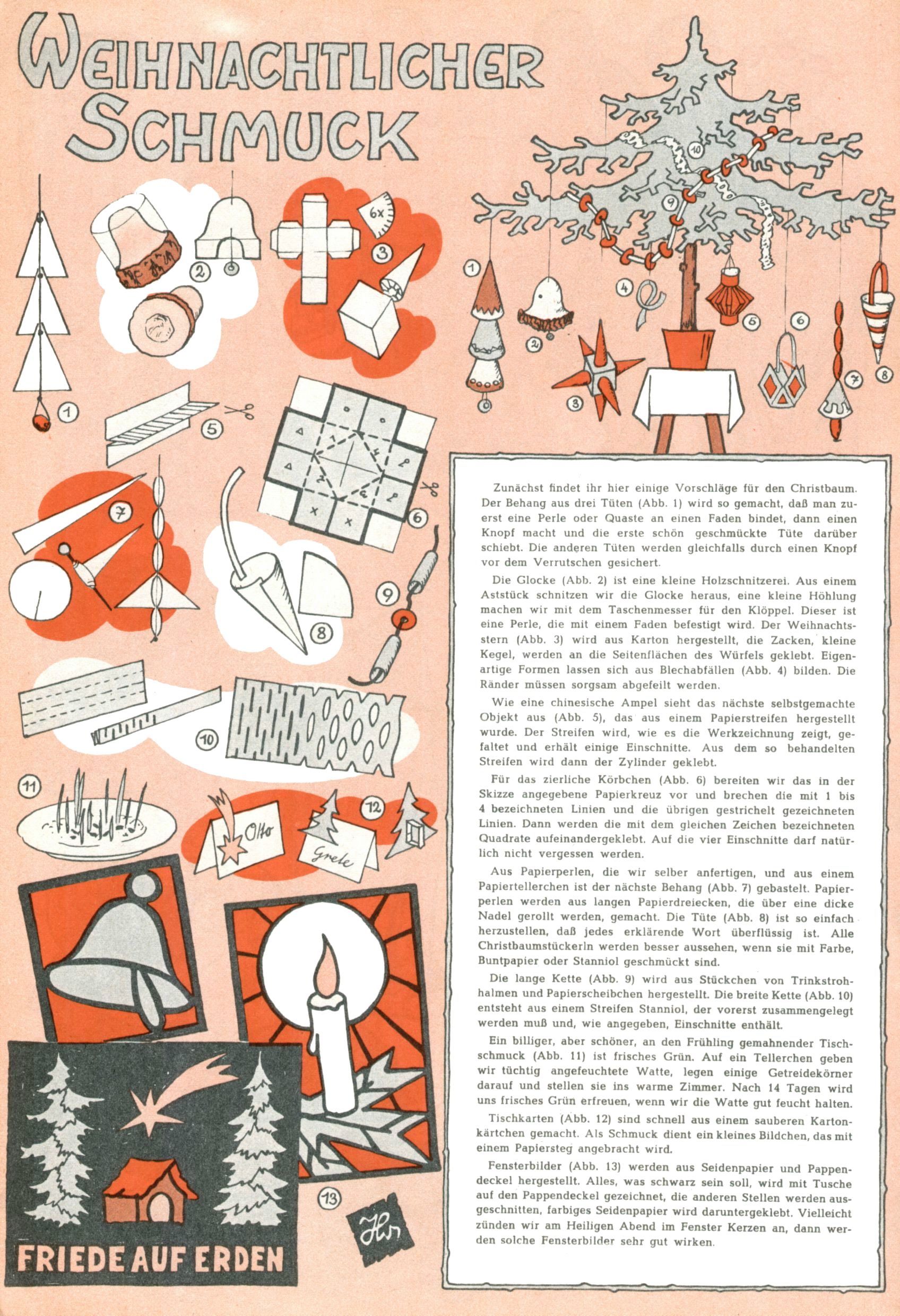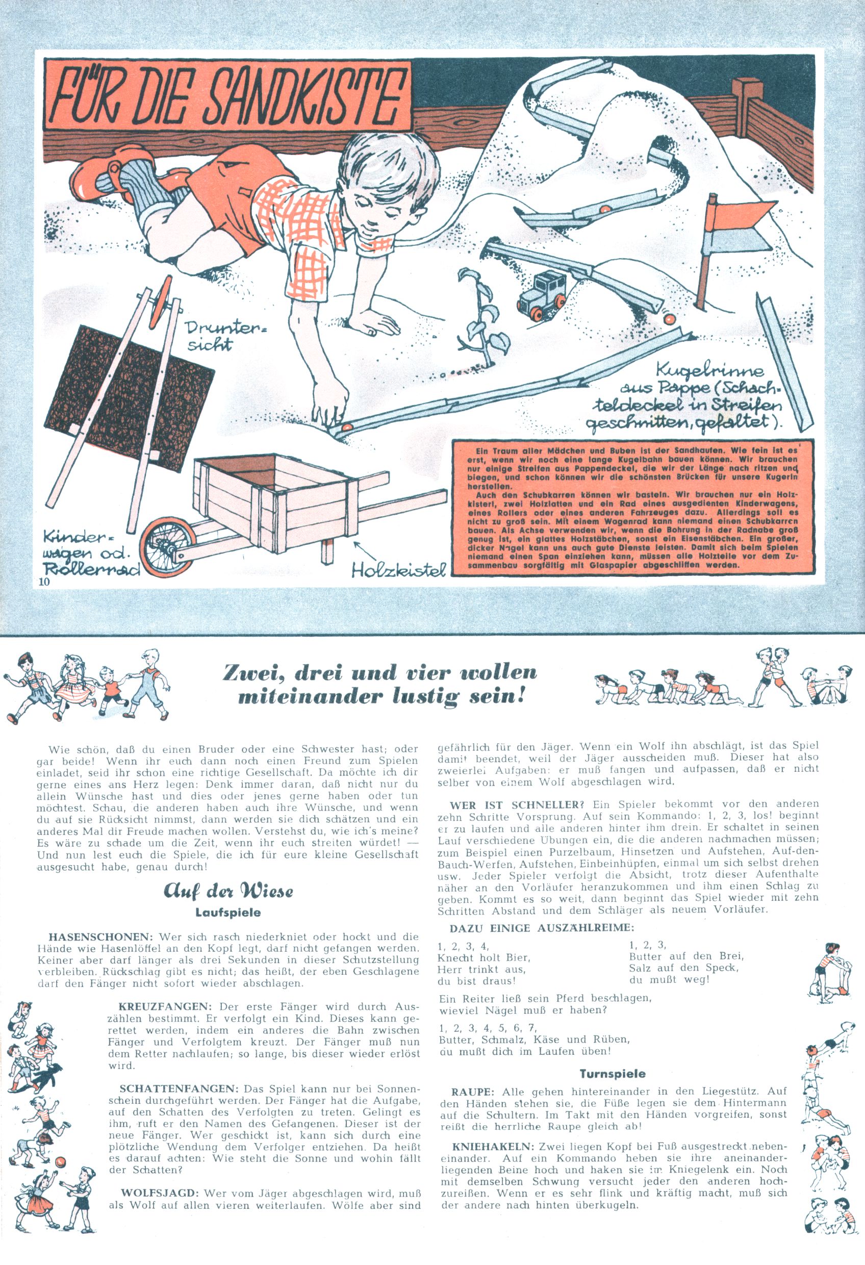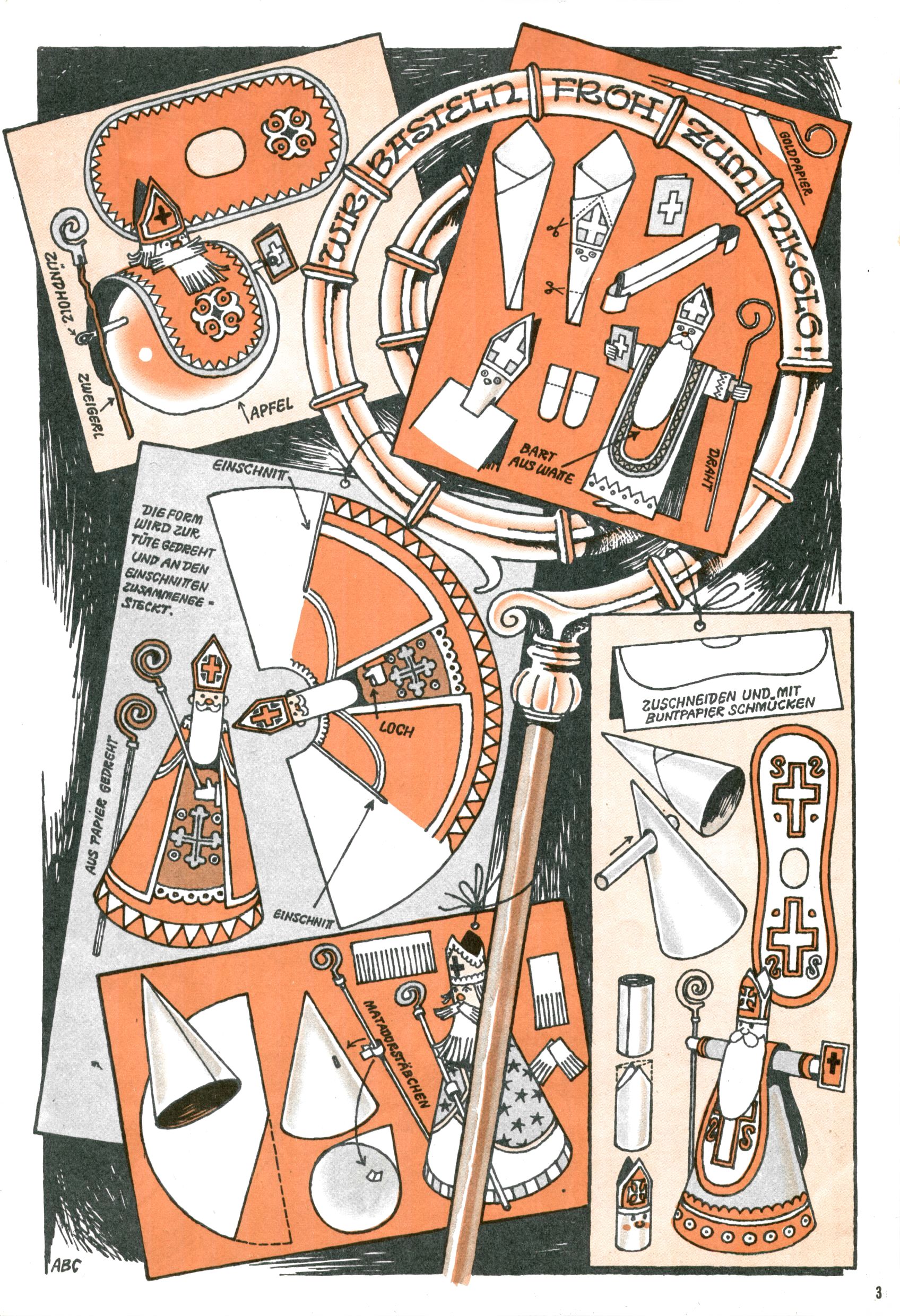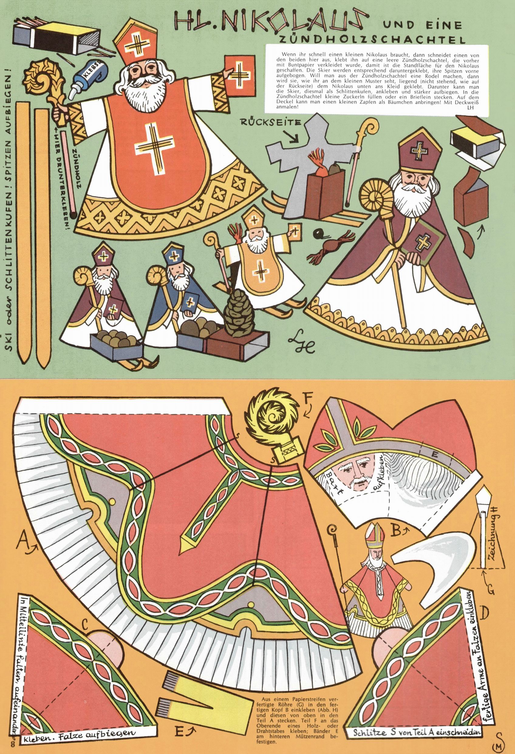 Die Wunderwelt im Festtagsgewand In den Sonderheften präsentierte sich die Wunderwelt wahrhaftig in Feiertagsstimmung. Mit wenigen Ausnahmen gab es pro Jahr drei Sonderhefte - zu Weihnachten bzw. im Advent, zu Ostern und in den Ferien im Sommer. Experimente mit Faschings- und Muttertagsheften hatten sich nicht bewährt. Selbst als es die Einzelhefte in der Krisensituation nach 1967 nicht mehr gab, wurde die Wunderwelt-Zeitung im Layout der Sonderhefte fortgesetzt: Zunächst mit 3 bis 5 und ab 1971 immerhin wieder mit 10-12 Heften pro Jahr. Die Weihnachts-, Oster- und Ferienhefte hatten naturgemäß verschiedene Schwerpunkte. Während im Sommer Spielen und Werken mit Material im Vordergrund stand, waren es zu Weihnachten Krippen und Adventhäuser; zu Ostern dann Erzählungen, Hasenstädte und Oster-Basteleien. Das bessere Papier der Sonderhefte erleichterte das Ausschneiden der insgesamt mehr als 1000 Papiermodelle erheblich. Die Sonderhefte waren vergleichsweise aufwändig gestaltet, aber auch ein wichtiges Zusatzgeschäft für die Zeitung. Die Kinder fieberten dem Erscheinungsdatum der jeweiligen Ausgabe nicht selten richtiggehend entgegen. Mit knapp 100 Seiten pro Jahr machten die Sonderhefte von der Menge her zwar nicht einmal ein Viertel aus, trugen aber zum Erscheinungsbild mindestens genauso viel bei wie die Standardhefte. Im Wesentlichen blieb das Layout der Sonderhefte über die Jahre hin unverändert. Mühselig wurde es, als man den Inhalt der Beiträge vorübergehend auf die Seiten gleichmäßig verteilte und die Kinder ermunterte, die Hefte in der Mitte zu zerschneiden. Die eine Hälfte enthielt dann etwa Erzählungen und Bastelvorschläge, der andere Teil der Zeitung Spielanleitungen. Zur übersichtlichkeit trugen diese Layoutversuche jedenfalls in keiner Weise bei und als besonderen Auswuchs gab es eine Zeitlang auf einer Seite oft mehrere Seitennummern, je nachdem, ob sich diese auf das Gesamtheft oder den herauszunehmenden und zu zerschneidenden Heftteil bezogen. Gegen Ende der 1950er Jahre kehrte man wieder zu einem ganzseitigen Layout zurück und Ideen wie ein Spiel-(Heft-im-)Heft gehörten der Vergangenheit an. In den Sonderheften experimentierte man dann noch ab Mitte der 1960er Jahre, als die Verkaufszahlen stark rückläufig waren, mit grundsätzlich neuen Darstellungsformen - weg vom Niedlich-Kitschigen und engagierte neue Grafikerinnen wie Gundi Groh und Hella Soyka. Den erhofften Erfolg brachte dies jedoch nicht mehr. |