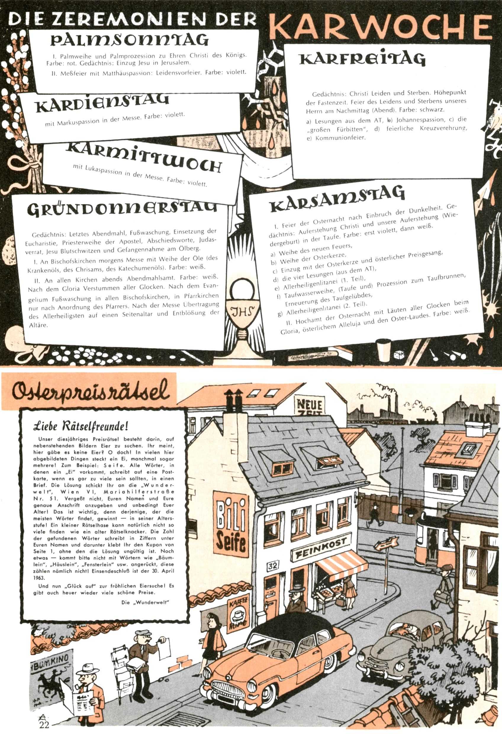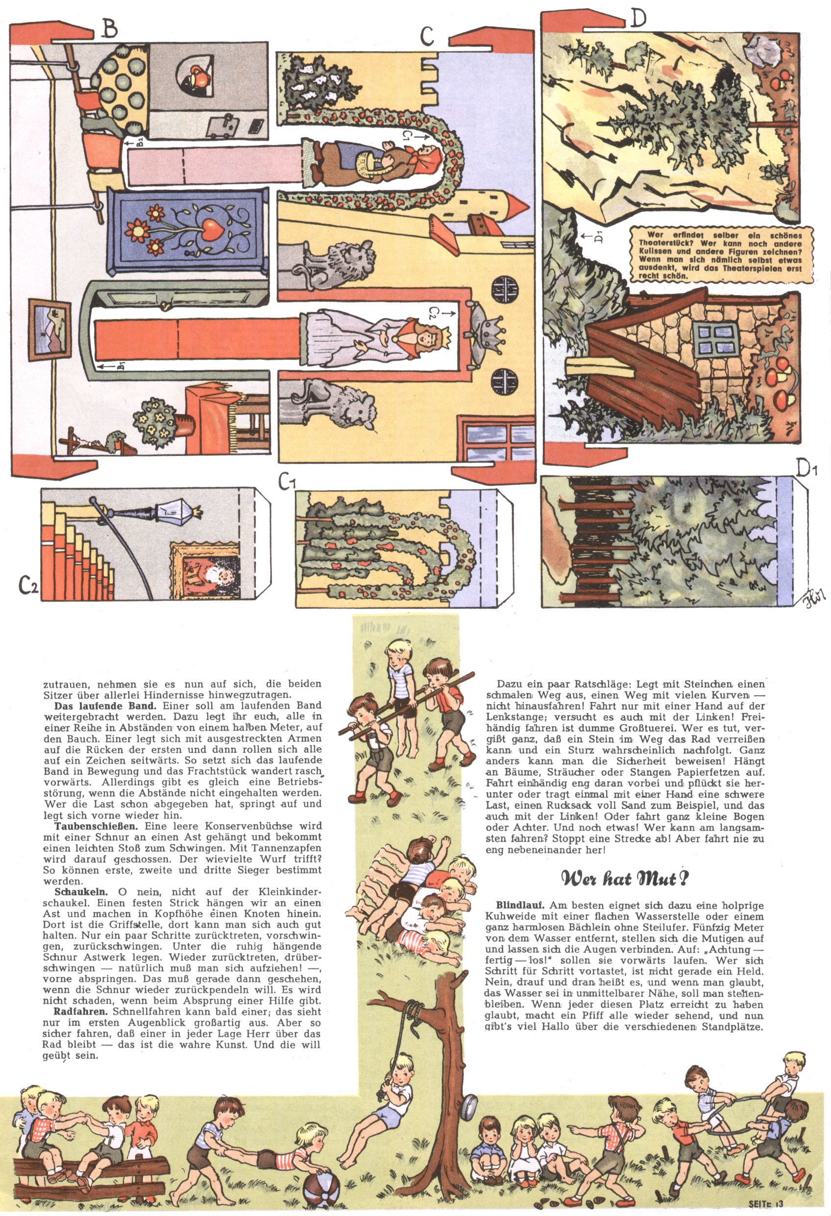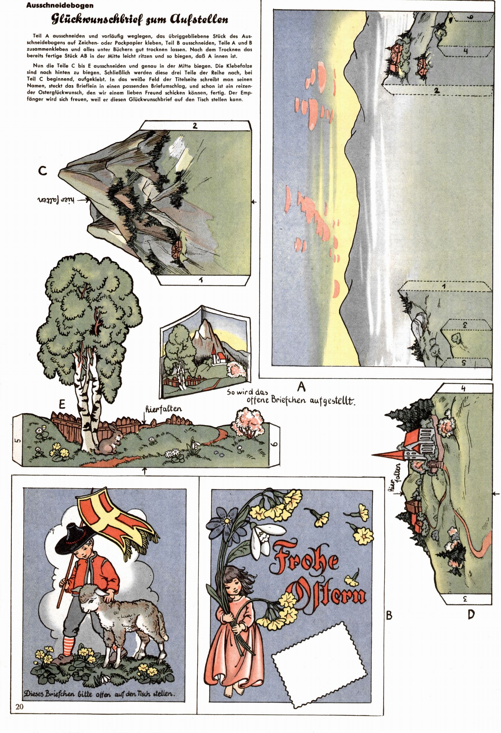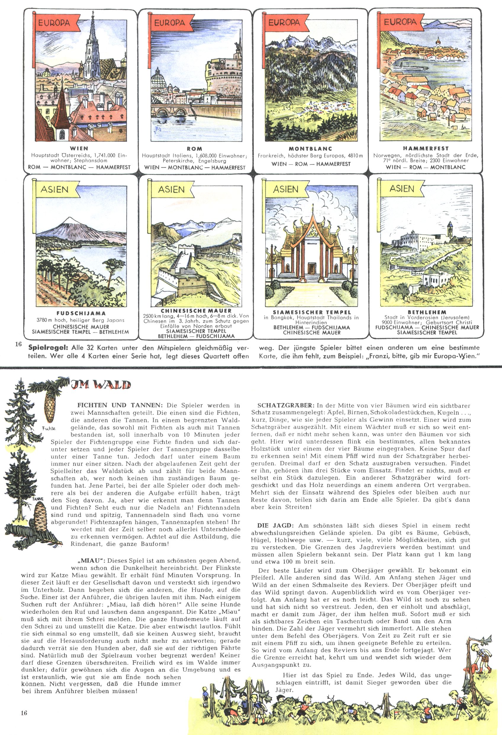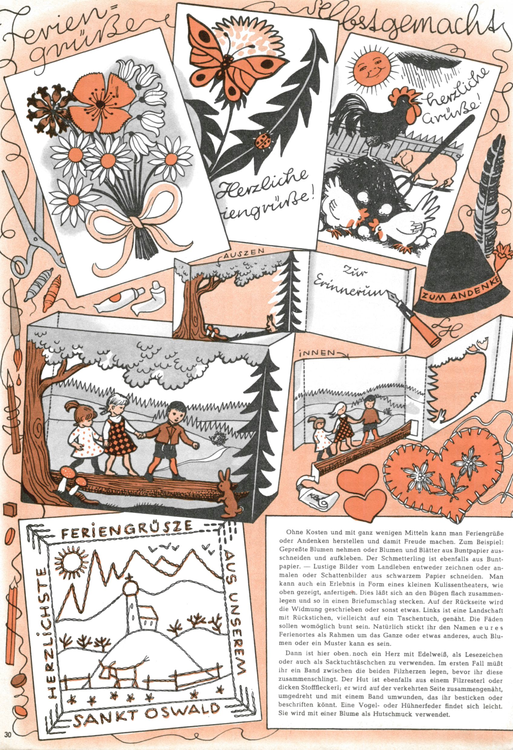 Die Wunderwelt im Festtagsgewand In den Sonderheften präsentierte sich die Wunderwelt wahrhaftig in Feiertagsstimmung. Mit wenigen Ausnahmen gab es pro Jahr drei Sonderhefte - zu Weihnachten bzw. im Advent, zu Ostern und in den Ferien im Sommer. Experimente mit Faschings- und Muttertagsheften hatten sich nicht bewährt. Selbst als es die Einzelhefte in der Krisensituation nach 1967 nicht mehr gab, wurde die Wunderwelt-Zeitung im Layout der Sonderhefte fortgesetzt: Zunächst mit 3 bis 5 und ab 1971 immerhin wieder mit 10-12 Heften pro Jahr. Die Weihnachts-, Oster- und Ferienhefte hatten naturgemäß verschiedene Schwerpunkte. Während im Sommer Spielen und Werken mit Material im Vordergrund stand, waren es zu Weihnachten Krippen und Adventhäuser; zu Ostern dann Erzählungen, Hasenstädte und Oster-Basteleien. Das bessere Papier der Sonderhefte erleichterte das Ausschneiden der insgesamt mehr als 1000 Papiermodelle erheblich. Die Sonderhefte waren vergleichsweise aufwändig gestaltet, aber auch ein wichtiges Zusatzgeschäft für die Zeitung. Die Kinder fieberten dem Erscheinungsdatum der jeweiligen Ausgabe nicht selten richtiggehend entgegen. Mit knapp 100 Seiten pro Jahr machten die Sonderhefte von der Menge her zwar nicht einmal ein Viertel aus, trugen aber zum Erscheinungsbild mindestens genauso viel bei wie die Standardhefte. Im Wesentlichen blieb das Layout der Sonderhefte über die Jahre hin unverändert. Mühselig wurde es, als man den Inhalt der Beiträge vorübergehend auf die Seiten gleichmäßig verteilte und die Kinder ermunterte, die Hefte in der Mitte zu zerschneiden. Die eine Hälfte enthielt dann etwa Erzählungen und Bastelvorschläge, der andere Teil der Zeitung Spielanleitungen. Zur übersichtlichkeit trugen diese Layoutversuche jedenfalls in keiner Weise bei und als besonderen Auswuchs gab es eine Zeitlang auf einer Seite oft mehrere Seitennummern, je nachdem, ob sich diese auf das Gesamtheft oder den herauszunehmenden und zu zerschneidenden Heftteil bezogen. Gegen Ende der 1950er Jahre kehrte man wieder zu einem ganzseitigen Layout zurück und Ideen wie ein Spiel-(Heft-im-)Heft gehörten der Vergangenheit an. In den Sonderheften experimentierte man dann noch ab Mitte der 1960er Jahre, als die Verkaufszahlen stark rückläufig waren, mit grundsätzlich neuen Darstellungsformen - weg vom Niedlich-Kitschigen und engagierte neue Grafikerinnen wie Gundi Groh und Hella Soyka. Den erhofften Erfolg brachte dies jedoch nicht mehr. |
