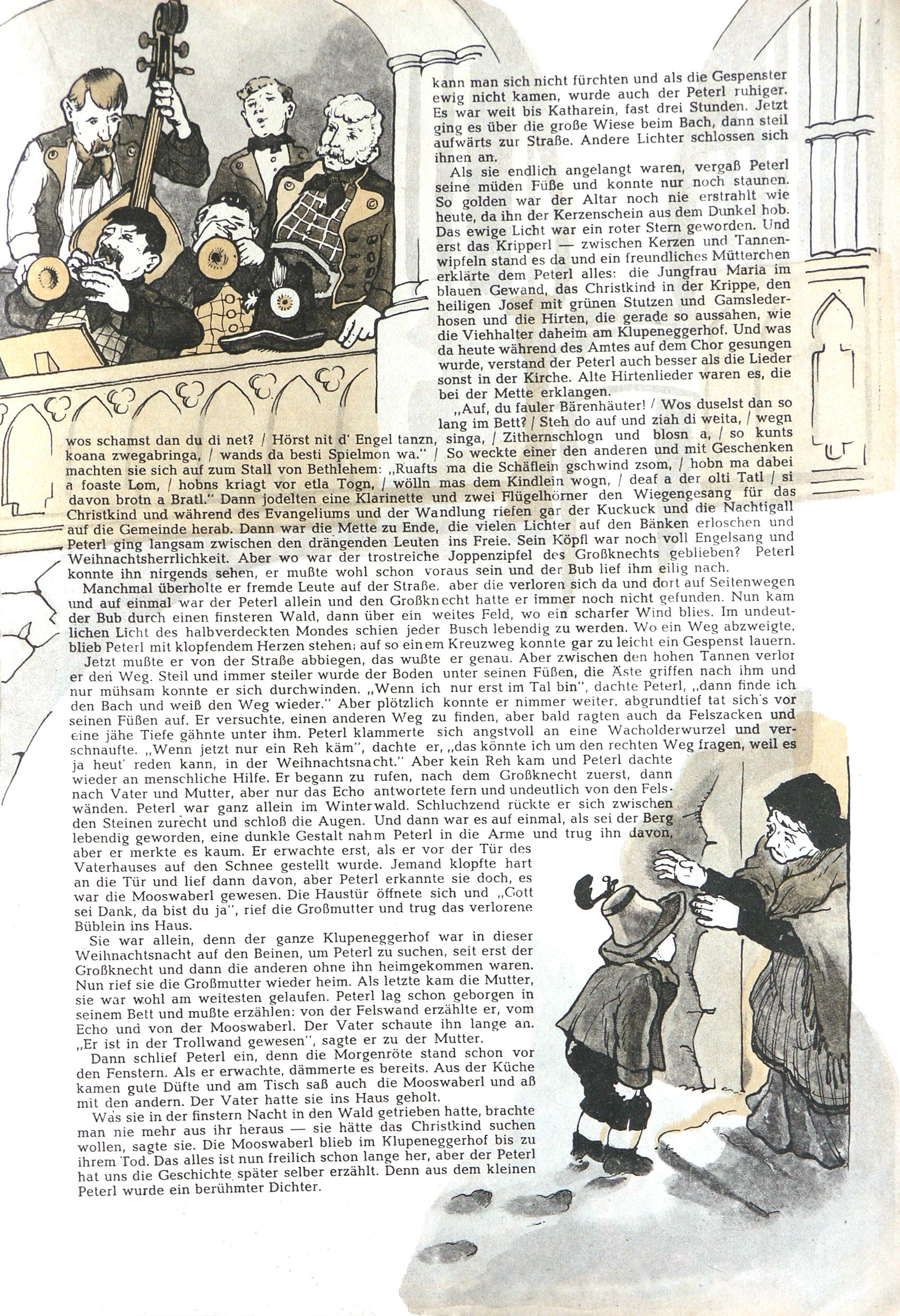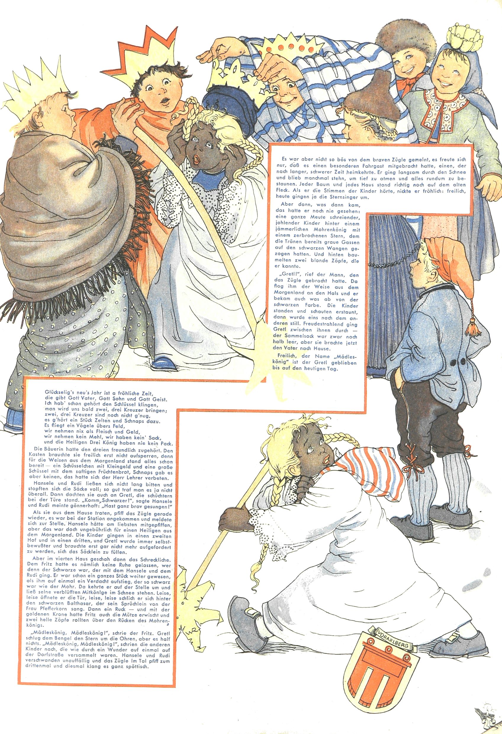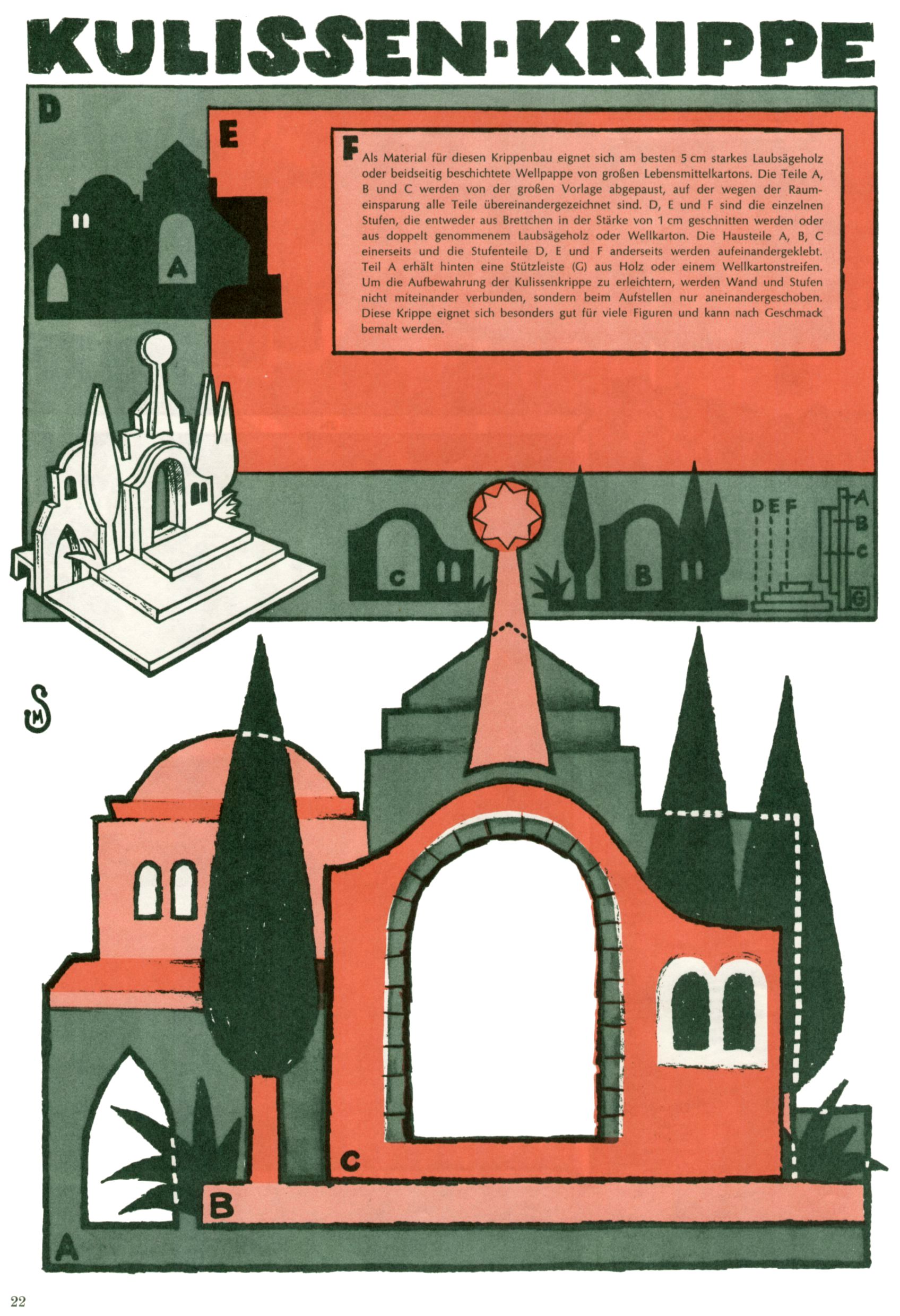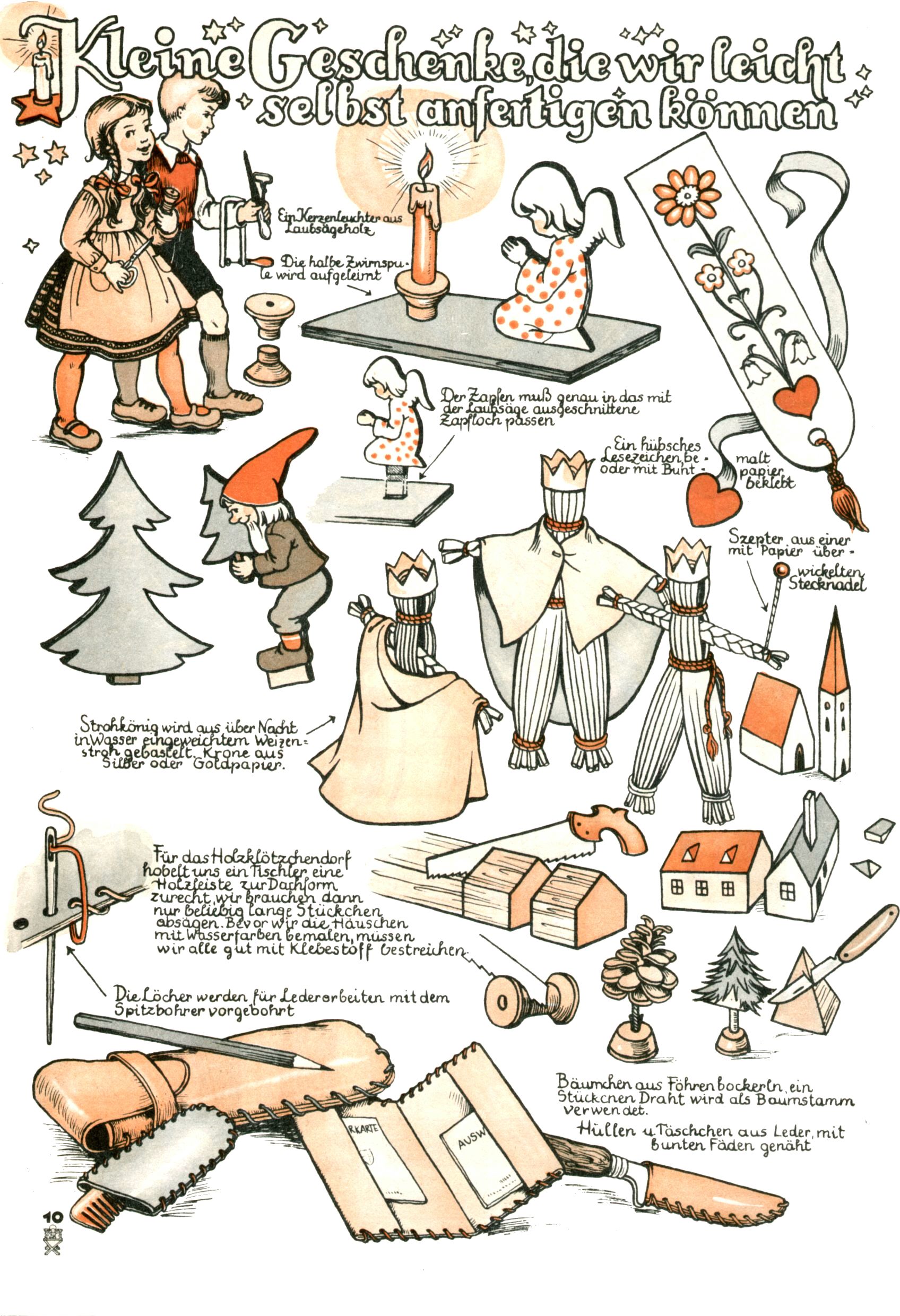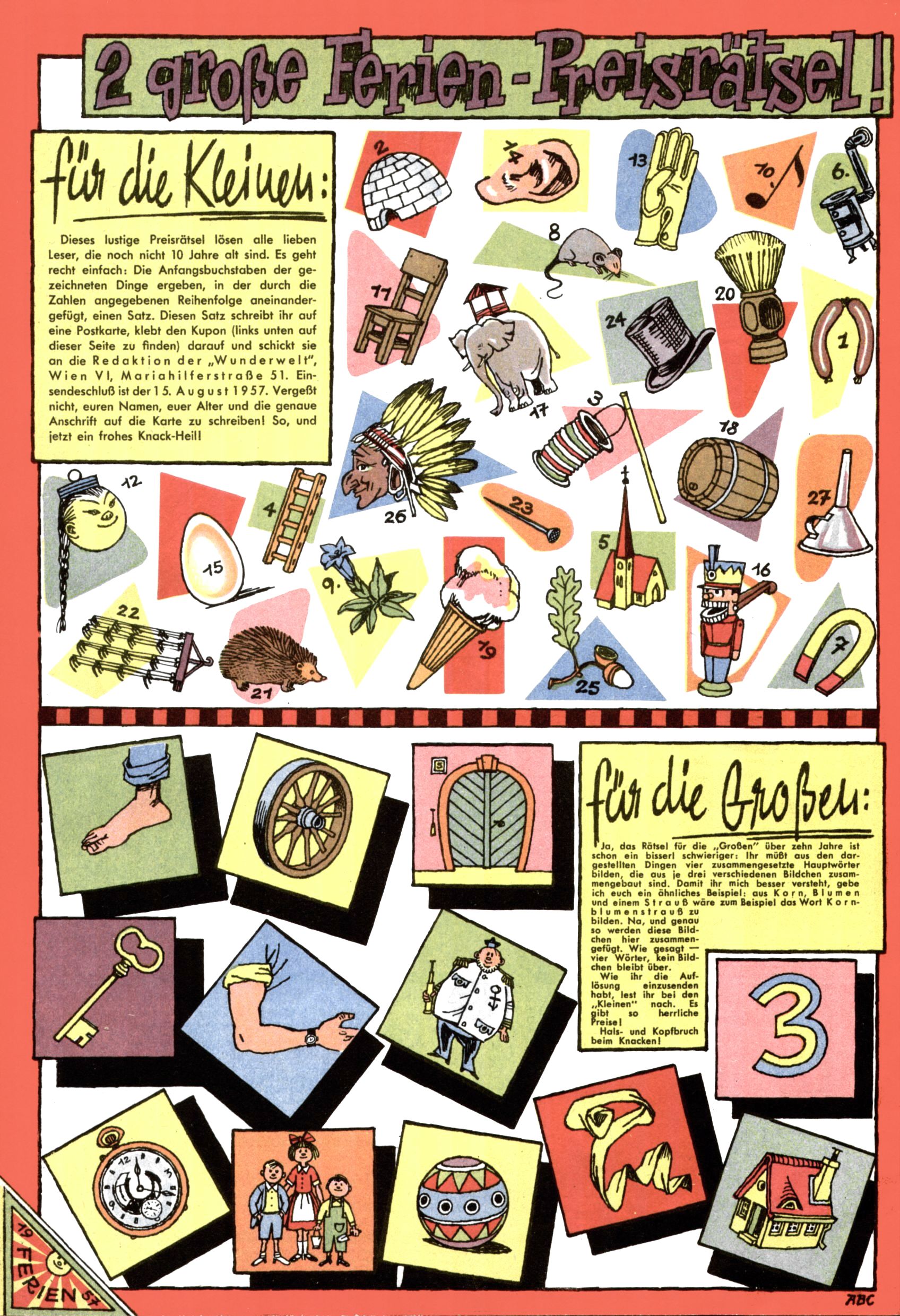Die Wunderwelt im Festtagsgewand In den Sonderheften präsentierte sich die Wunderwelt wahrhaftig in Feiertagsstimmung. Mit wenigen Ausnahmen gab es pro Jahr drei Sonderhefte - zu Weihnachten bzw. im Advent, zu Ostern und in den Ferien im Sommer. Experimente mit Faschings- und Muttertagsheften hatten sich nicht bewährt. Selbst als es die Einzelhefte in der Krisensituation nach 1967 nicht mehr gab, wurde die Wunderwelt-Zeitung im Layout der Sonderhefte fortgesetzt: Zunächst mit 3 bis 5 und ab 1971 immerhin wieder mit 10-12 Heften pro Jahr. Die Weihnachts-, Oster- und Ferienhefte hatten naturgemäß verschiedene Schwerpunkte. Während im Sommer Spielen und Werken mit Material im Vordergrund stand, waren es zu Weihnachten Krippen und Adventhäuser; zu Ostern dann Erzählungen, Hasenstädte und Oster-Basteleien. Das bessere Papier der Sonderhefte erleichterte das Ausschneiden der insgesamt mehr als 1000 Papiermodelle erheblich. Die Sonderhefte waren vergleichsweise aufwändig gestaltet, aber auch ein wichtiges Zusatzgeschäft für die Zeitung. Die Kinder fieberten dem Erscheinungsdatum der jeweiligen Ausgabe nicht selten richtiggehend entgegen. Mit knapp 100 Seiten pro Jahr machten die Sonderhefte von der Menge her zwar nicht einmal ein Viertel aus, trugen aber zum Erscheinungsbild mindestens genauso viel bei wie die Standardhefte. Im Wesentlichen blieb das Layout der Sonderhefte über die Jahre hin unverändert. Mühselig wurde es, als man den Inhalt der Beiträge vorübergehend auf die Seiten gleichmäßig verteilte und die Kinder ermunterte, die Hefte in der Mitte zu zerschneiden. Die eine Hälfte enthielt dann etwa Erzählungen und Bastelvorschläge, der andere Teil der Zeitung Spielanleitungen. Zur übersichtlichkeit trugen diese Layoutversuche jedenfalls in keiner Weise bei und als besonderen Auswuchs gab es eine Zeitlang auf einer Seite oft mehrere Seitennummern, je nachdem, ob sich diese auf das Gesamtheft oder den herauszunehmenden und zu zerschneidenden Heftteil bezogen. Gegen Ende der 1950er Jahre kehrte man wieder zu einem ganzseitigen Layout zurück und Ideen wie ein Spiel-(Heft-im-)Heft gehörten der Vergangenheit an. In den Sonderheften experimentierte man dann noch ab Mitte der 1960er Jahre, als die Verkaufszahlen stark rückläufig waren, mit grundsätzlich neuen Darstellungsformen - weg vom Niedlich-Kitschigen und engagierte neue Grafikerinnen wie Gundi Groh und Hella Soyka. Den erhofften Erfolg brachte dies jedoch nicht mehr. |