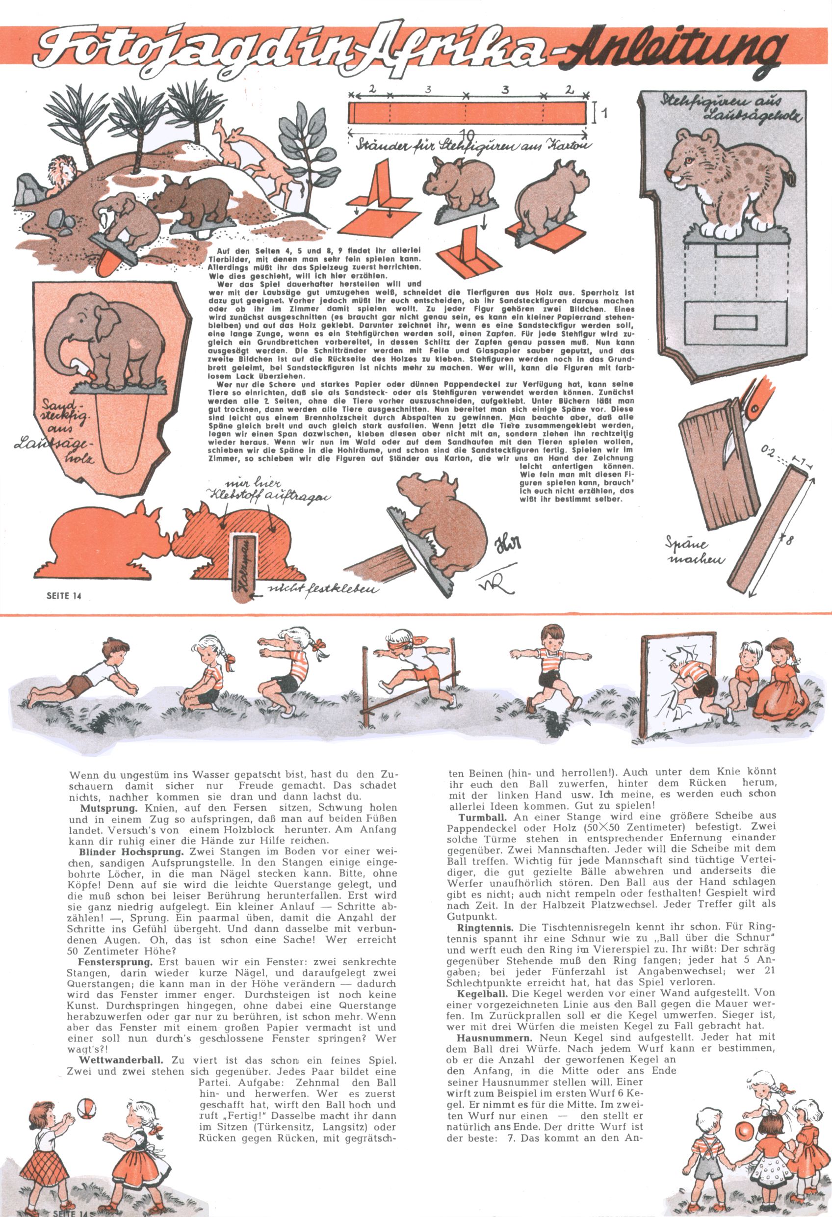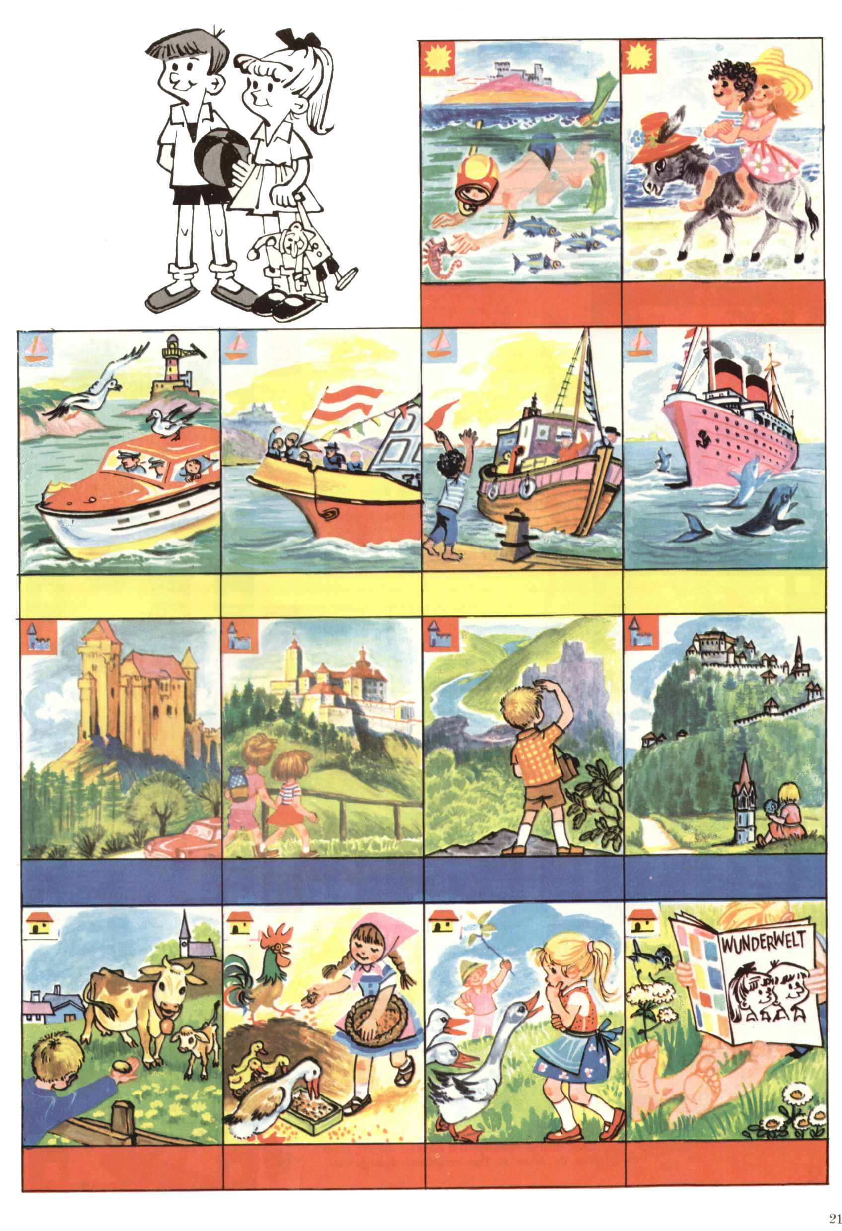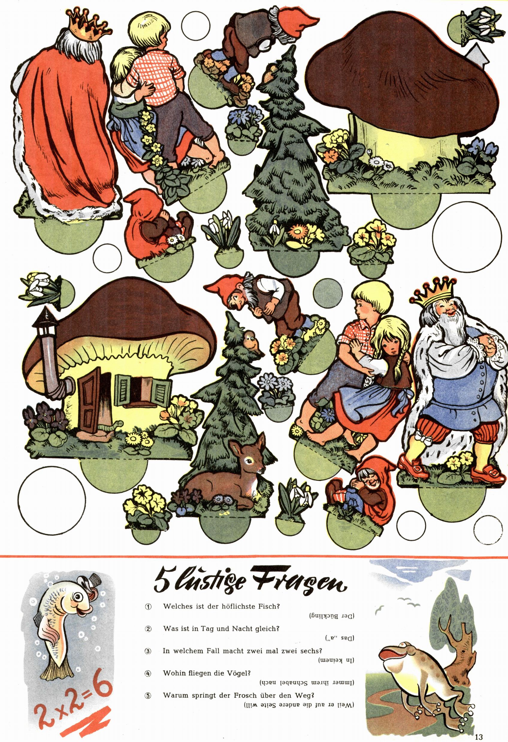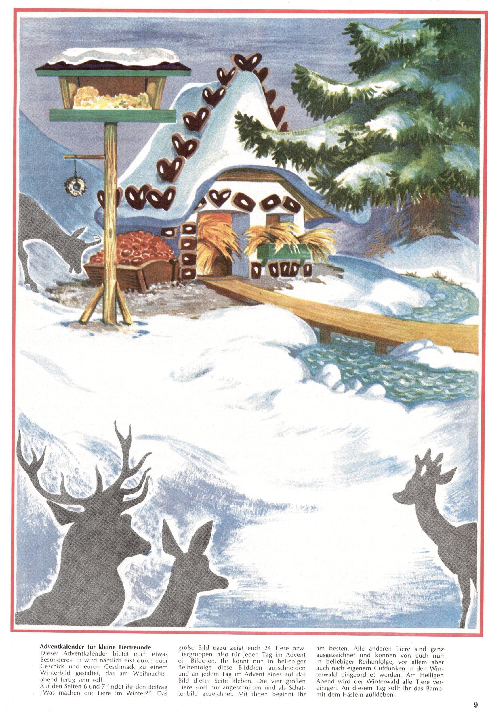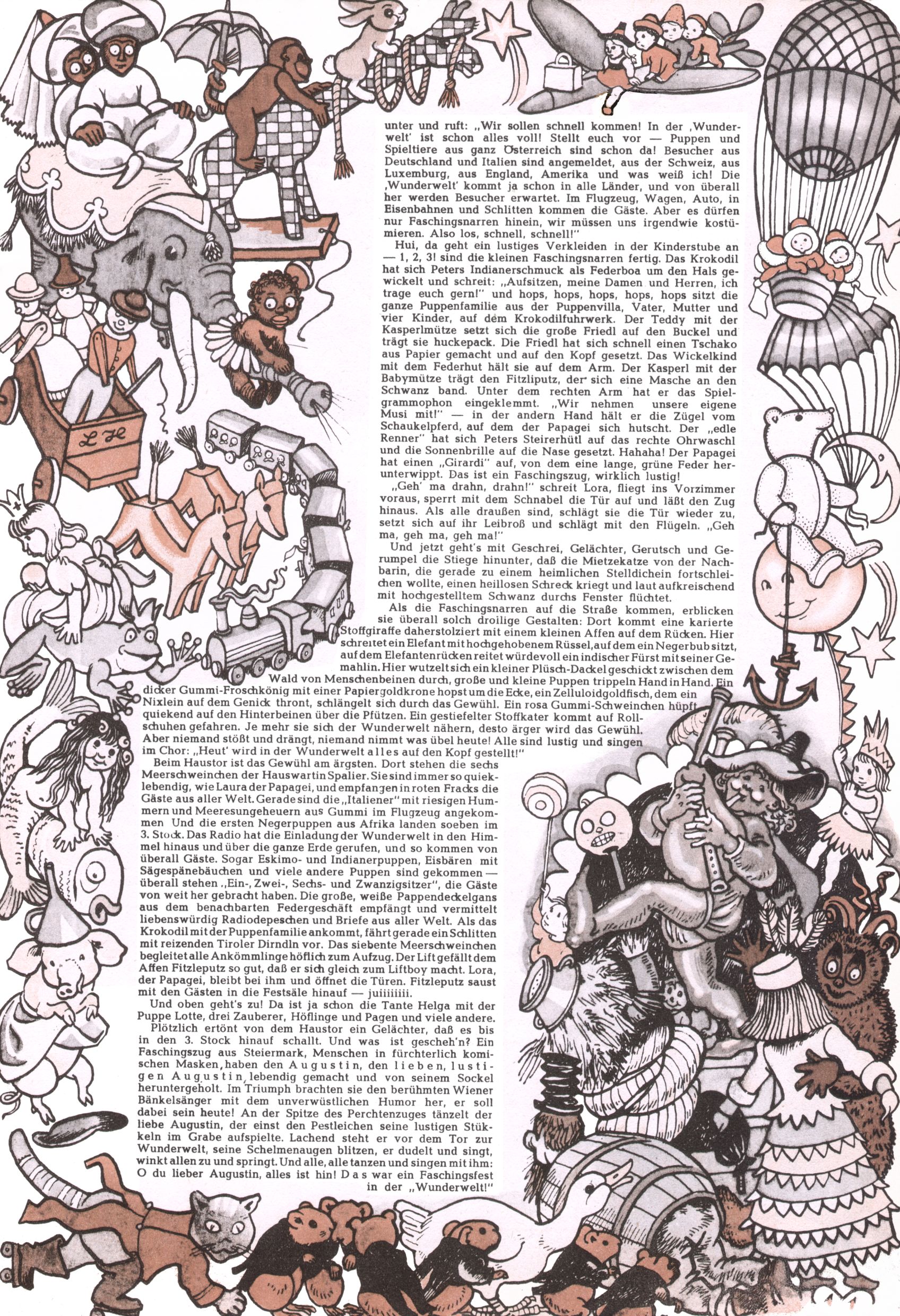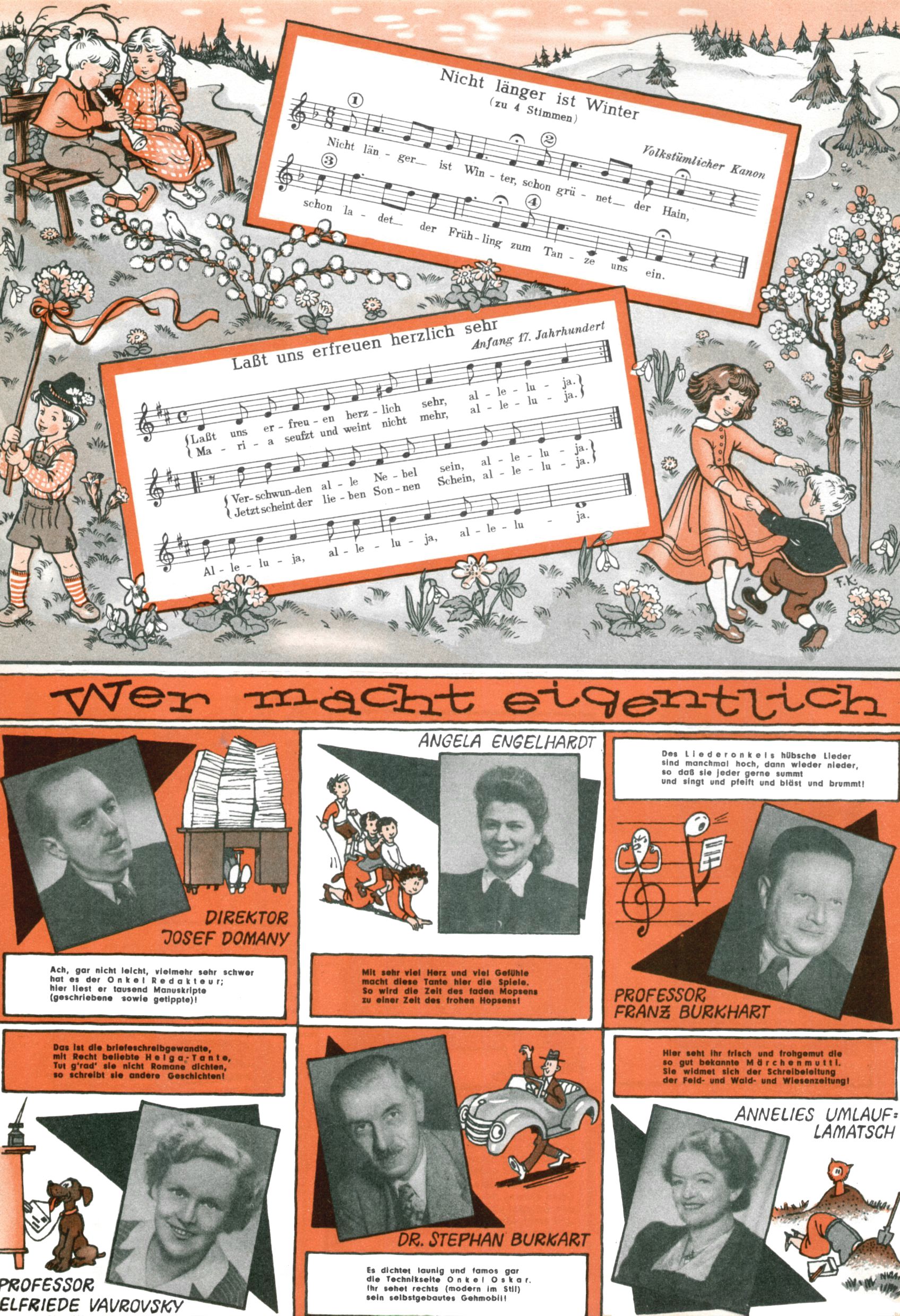 Die Wunderwelt im Festtagsgewand In den Sonderheften präsentierte sich die Wunderwelt wahrhaftig in Feiertagsstimmung. Mit wenigen Ausnahmen gab es pro Jahr drei Sonderhefte - zu Weihnachten bzw. im Advent, zu Ostern und in den Ferien im Sommer. Experimente mit Faschings- und Muttertagsheften hatten sich nicht bewährt. Selbst als es die Einzelhefte in der Krisensituation nach 1967 nicht mehr gab, wurde die Wunderwelt-Zeitung im Layout der Sonderhefte fortgesetzt: Zunächst mit 3 bis 5 und ab 1971 immerhin wieder mit 10-12 Heften pro Jahr. Die Weihnachts-, Oster- und Ferienhefte hatten naturgemäß verschiedene Schwerpunkte. Während im Sommer Spielen und Werken mit Material im Vordergrund stand, waren es zu Weihnachten Krippen und Adventhäuser; zu Ostern dann Erzählungen, Hasenstädte und Oster-Basteleien. Das bessere Papier der Sonderhefte erleichterte das Ausschneiden der insgesamt mehr als 1000 Papiermodelle erheblich. Die Sonderhefte waren vergleichsweise aufwändig gestaltet, aber auch ein wichtiges Zusatzgeschäft für die Zeitung. Die Kinder fieberten dem Erscheinungsdatum der jeweiligen Ausgabe nicht selten richtiggehend entgegen. Mit knapp 100 Seiten pro Jahr machten die Sonderhefte von der Menge her zwar nicht einmal ein Viertel aus, trugen aber zum Erscheinungsbild mindestens genauso viel bei wie die Standardhefte. Im Wesentlichen blieb das Layout der Sonderhefte über die Jahre hin unverändert. Mühselig wurde es, als man den Inhalt der Beiträge vorübergehend auf die Seiten gleichmäßig verteilte und die Kinder ermunterte, die Hefte in der Mitte zu zerschneiden. Die eine Hälfte enthielt dann etwa Erzählungen und Bastelvorschläge, der andere Teil der Zeitung Spielanleitungen. Zur übersichtlichkeit trugen diese Layoutversuche jedenfalls in keiner Weise bei und als besonderen Auswuchs gab es eine Zeitlang auf einer Seite oft mehrere Seitennummern, je nachdem, ob sich diese auf das Gesamtheft oder den herauszunehmenden und zu zerschneidenden Heftteil bezogen. Gegen Ende der 1950er Jahre kehrte man wieder zu einem ganzseitigen Layout zurück und Ideen wie ein Spiel-(Heft-im-)Heft gehörten der Vergangenheit an. In den Sonderheften experimentierte man dann noch ab Mitte der 1960er Jahre, als die Verkaufszahlen stark rückläufig waren, mit grundsätzlich neuen Darstellungsformen - weg vom Niedlich-Kitschigen und engagierte neue Grafikerinnen wie Gundi Groh und Hella Soyka. Den erhofften Erfolg brachte dies jedoch nicht mehr. |